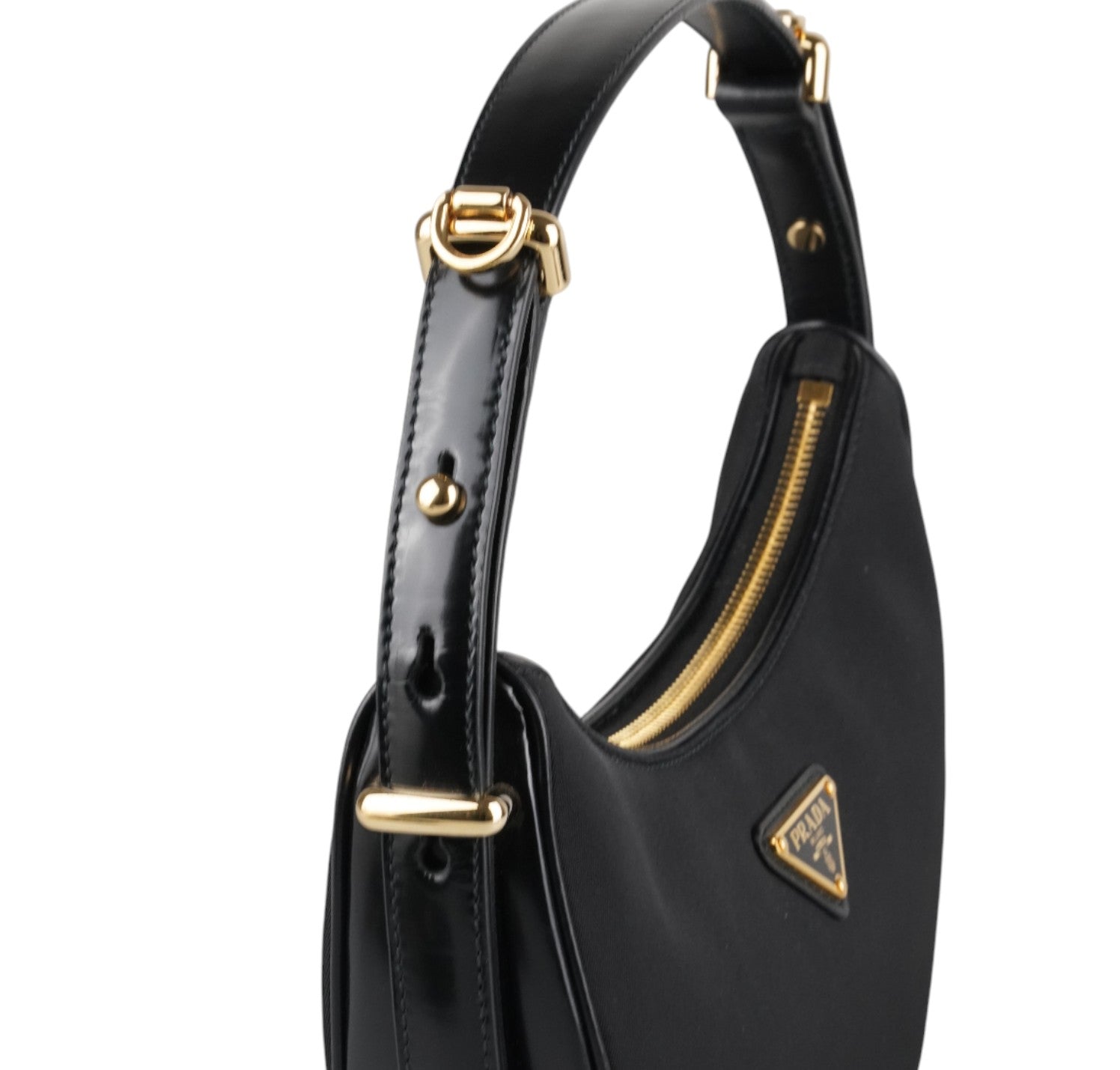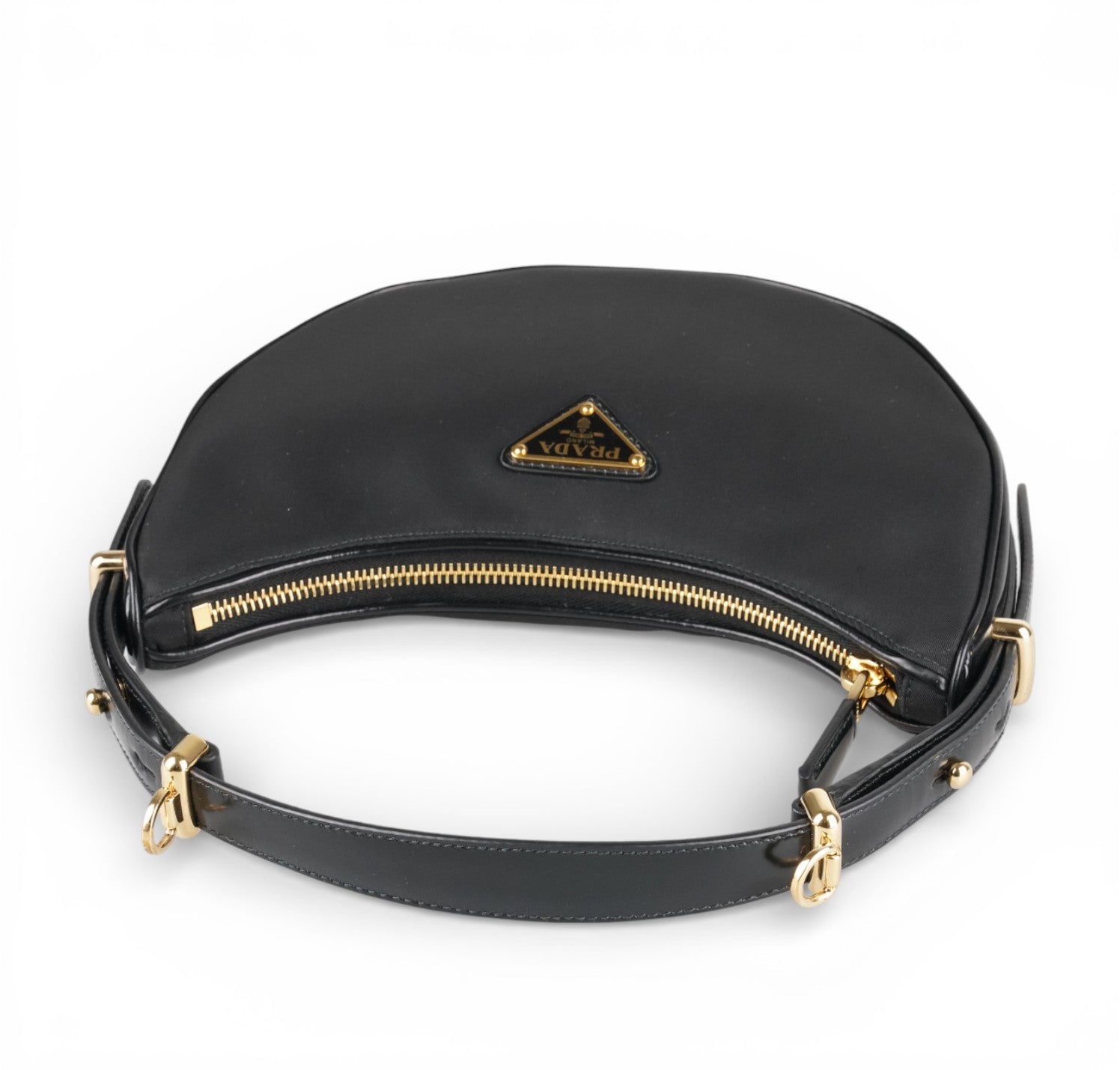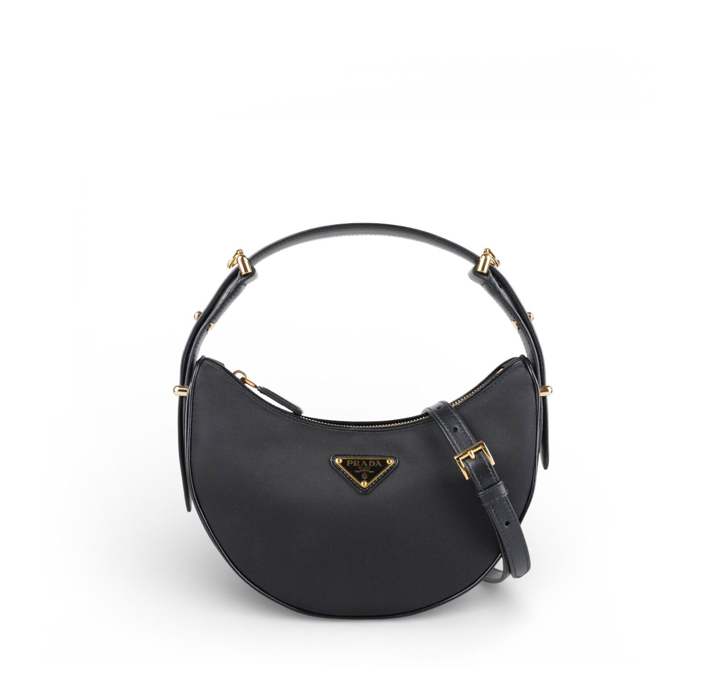 Prada Arqué, realizzata in Nylon e Pelle Nera, caratterizzata da silhouette curva con base rinforzata. Dettagli in metallo color oro, targhetta triangolare smaltata con logo frontale e chiusura superiore con zip. Manico rigido per portabilità a mano o a spalla e tracolla removibile/regolabile per utilizzo crossbody. Interno foderato, compatto ma funzionale, perfetto per contenere l’essenziale quotidiano (smartphone, portacarte, portafogli compatto, chiavi e piccoli accessori). Pari al nuovo, potrebbe presentare micro segni di stoccaggio.