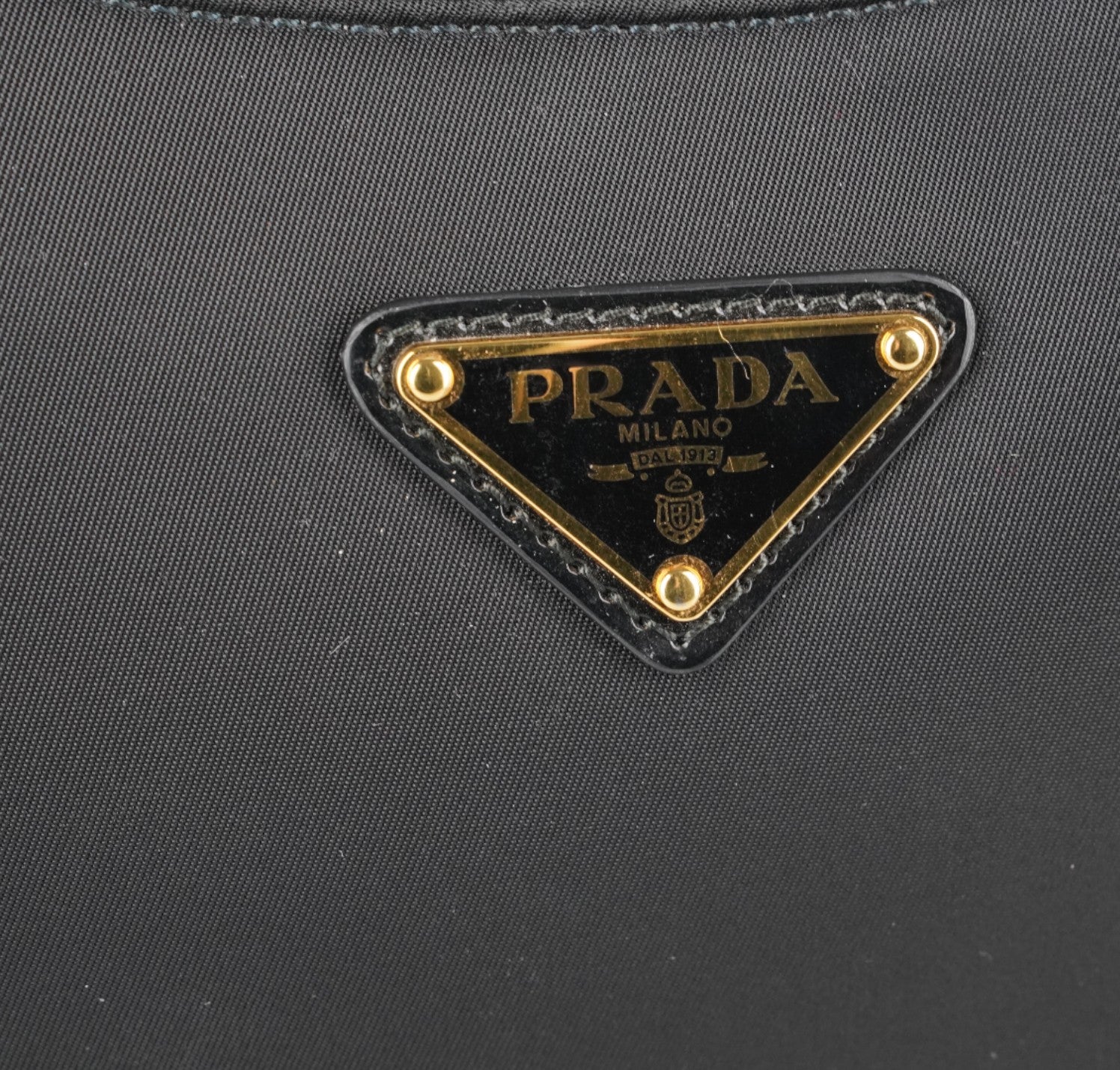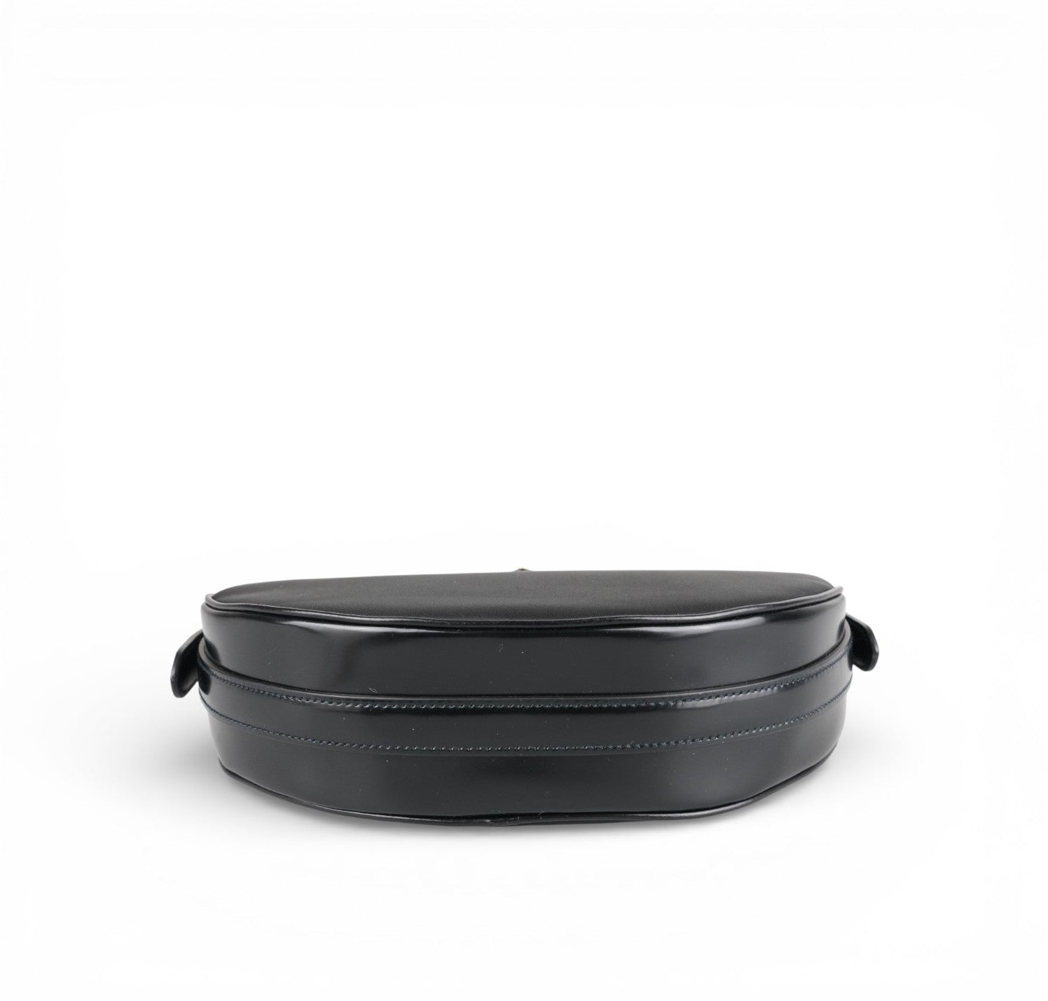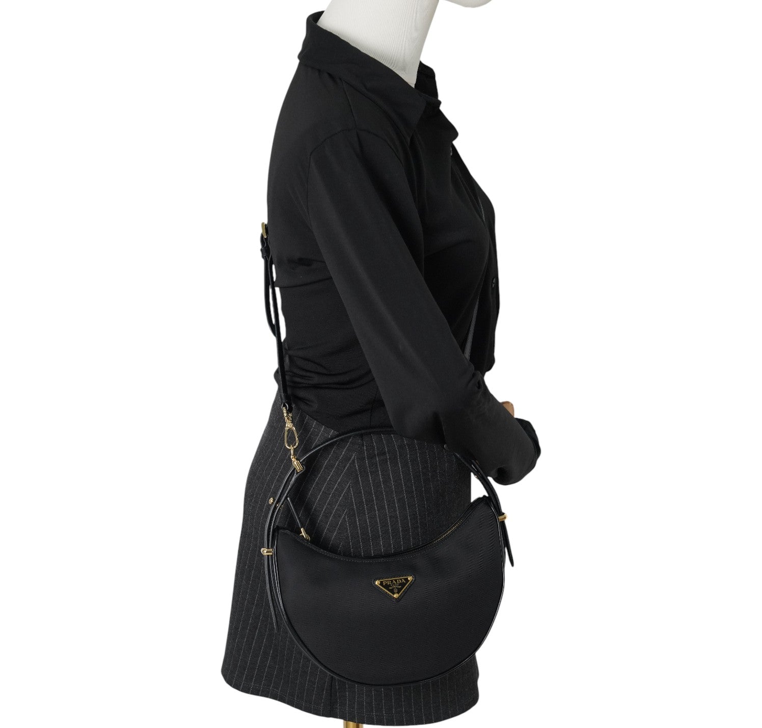 Prada Arqué, realizzata in Nylon e Pelle Nera, caratterizzata da silhouette curva con base rinforzata. Dettagli in metallo color oro, targhetta triangolare smaltata con logo frontale e chiusura superiore con zip. Manico rigido per portabilità a mano o a spalla e tracolla removibile/regolabile per utilizzo crossbody. Interno foderato, compatto ma funzionale, perfetto per contenere l’essenziale quotidiano (smartphone, portacarte, portafogli compatto, chiavi e piccoli accessori). Pari al nuovo, potrebbe presentare micro segni di stoccaggio.