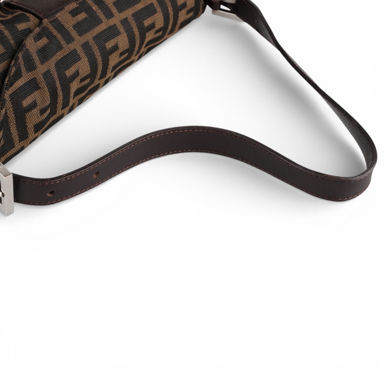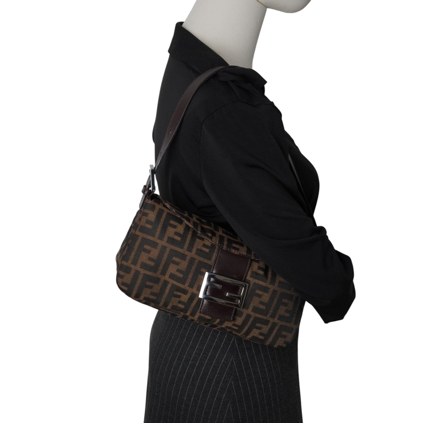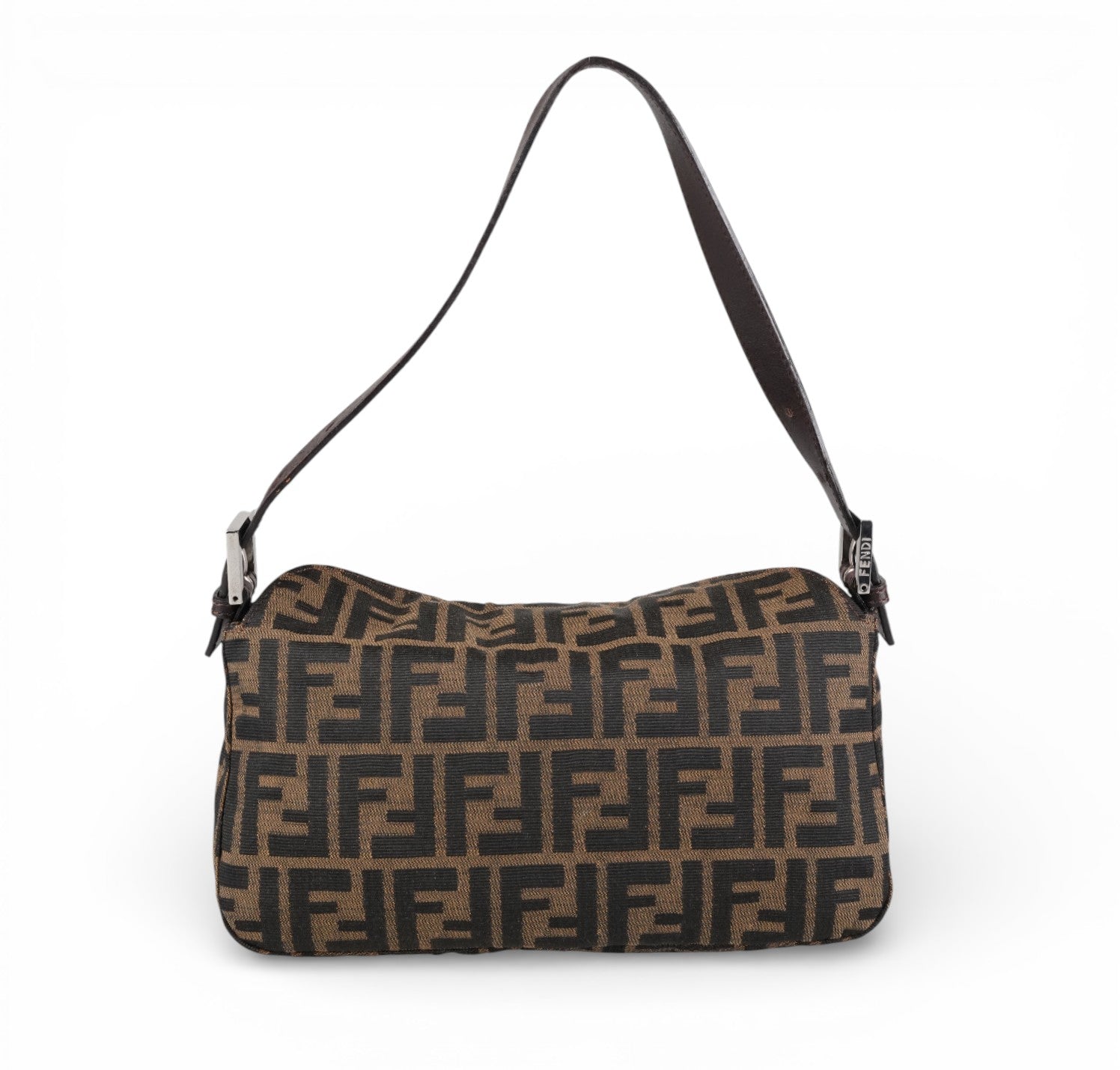 Fendi bag, Baguette Double Flap model, made of Zucchino Canvas. Brown Leather finishes. Silver hardware. Fabric-lined interior, zip pocket. Magnetic closure embellished with FF logo. Equipped with an adjustable top handle for carrying on the shoulder or by hand. Micro scratches on the hardware. Light signs of use, scratches on the leather. Slight storage odor.