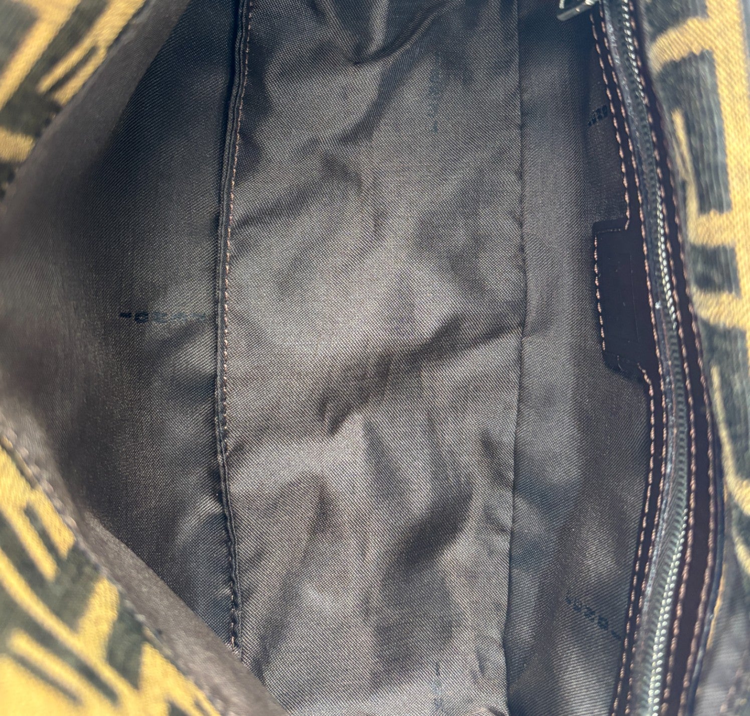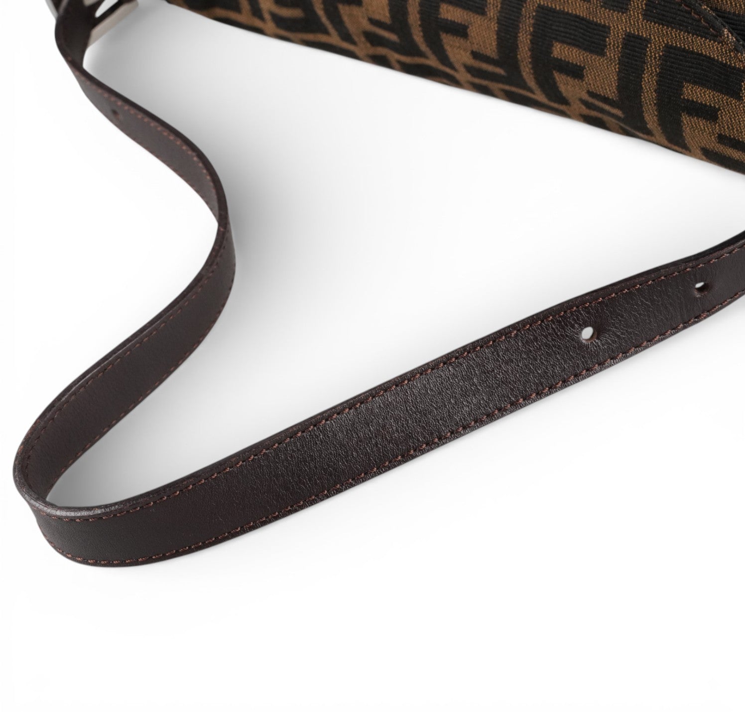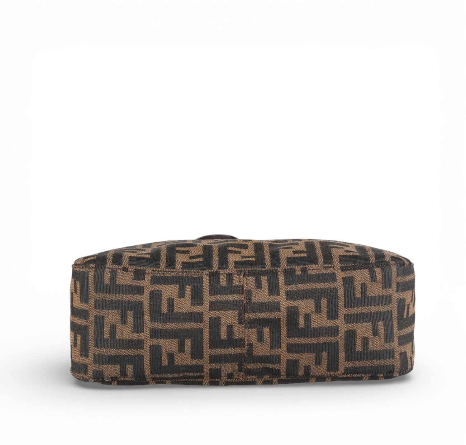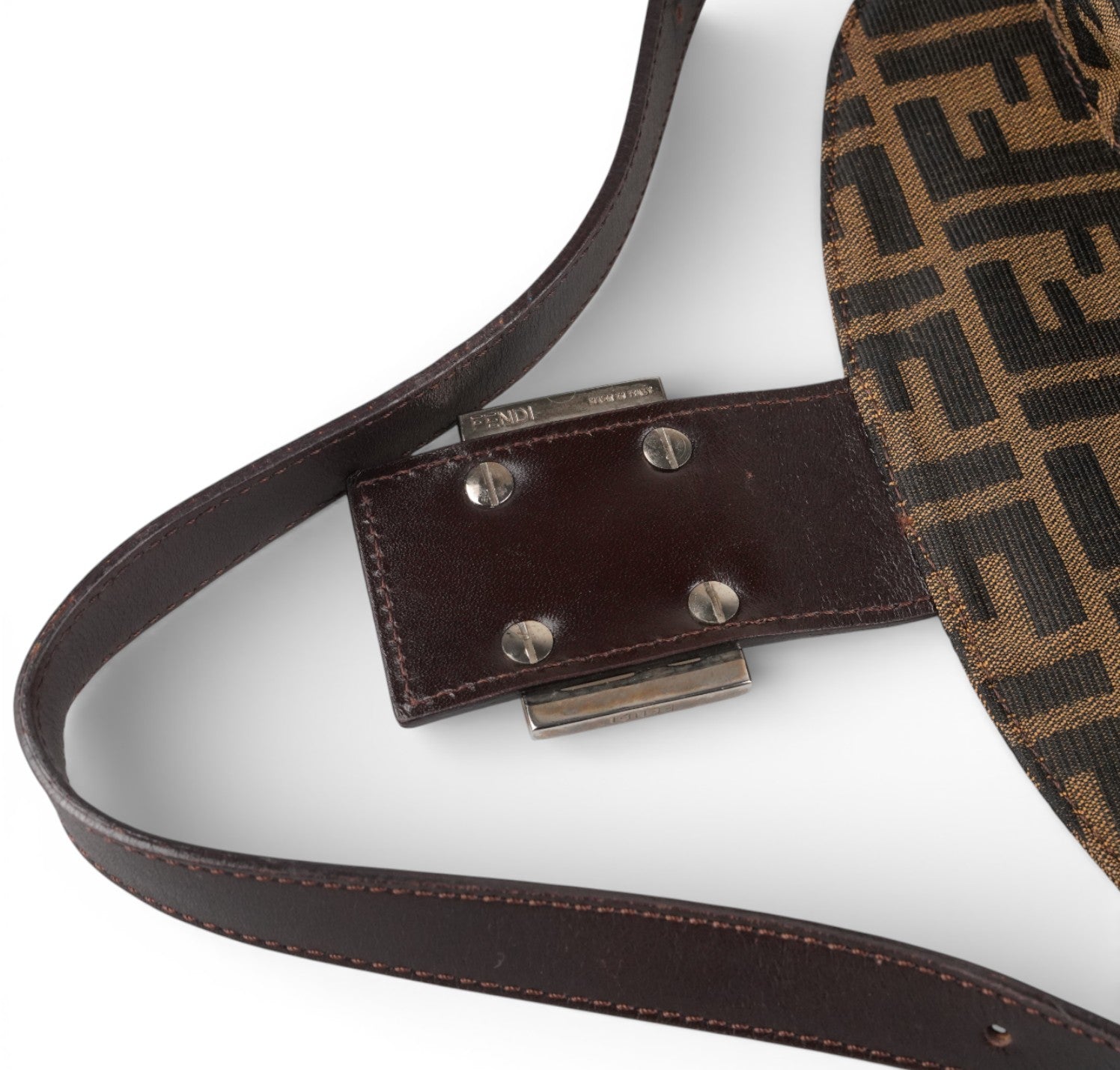 Fendi bag, Baguette Double Flap model, made of Zucchino Canvas. Brown Leather finishes. Silver hardware. Fabric-lined interior, zip pocket. Magnetic closure embellished with FF logo. Equipped with an adjustable top handle for carrying on the shoulder or by hand. Micro scratches on the hardware. Light signs of use, scratches on the leather. Slight storage odor.