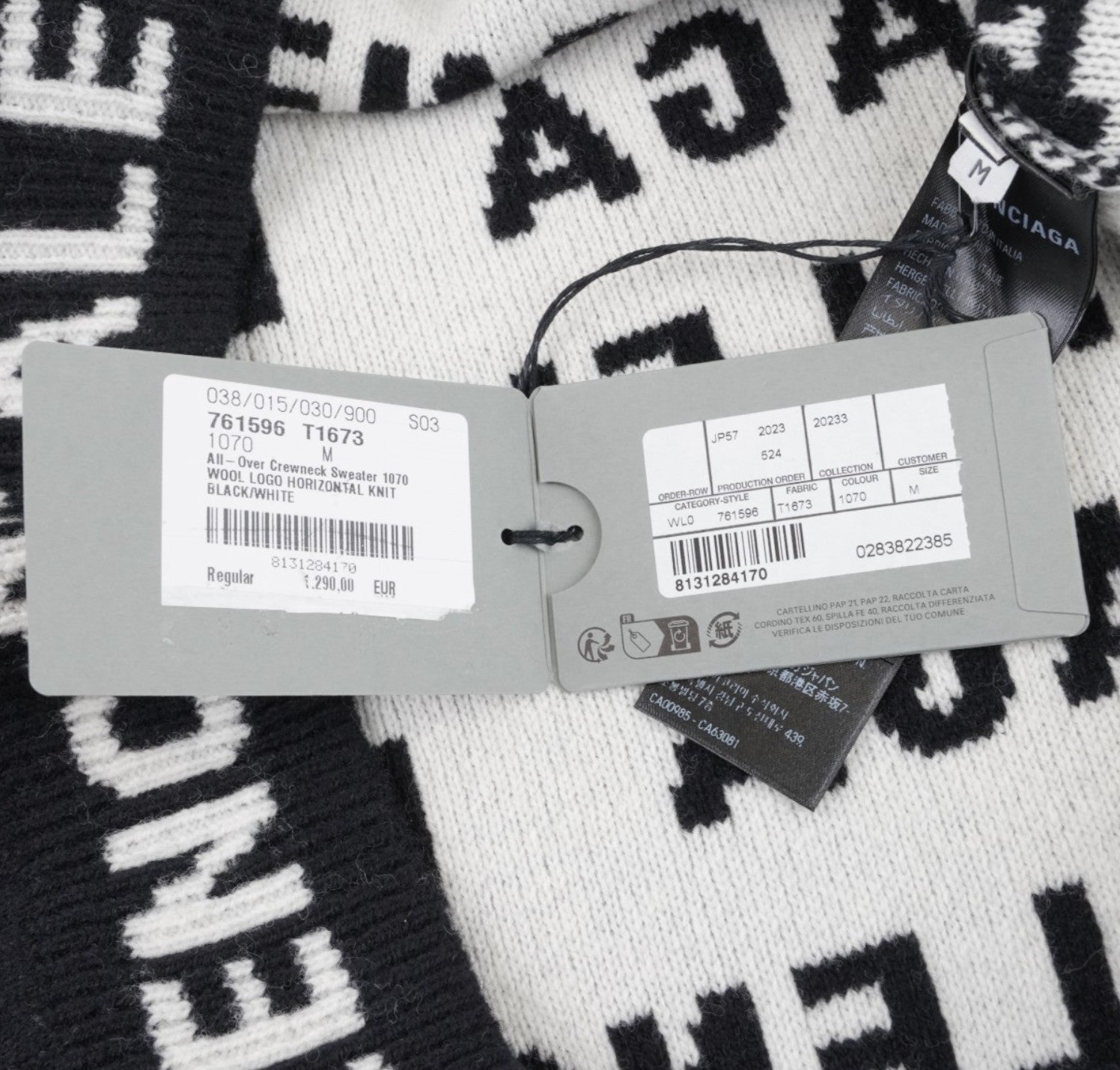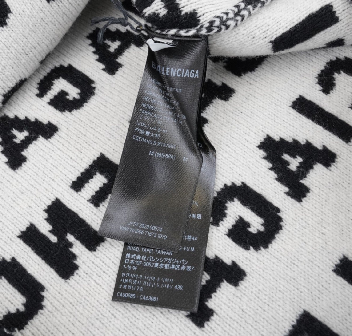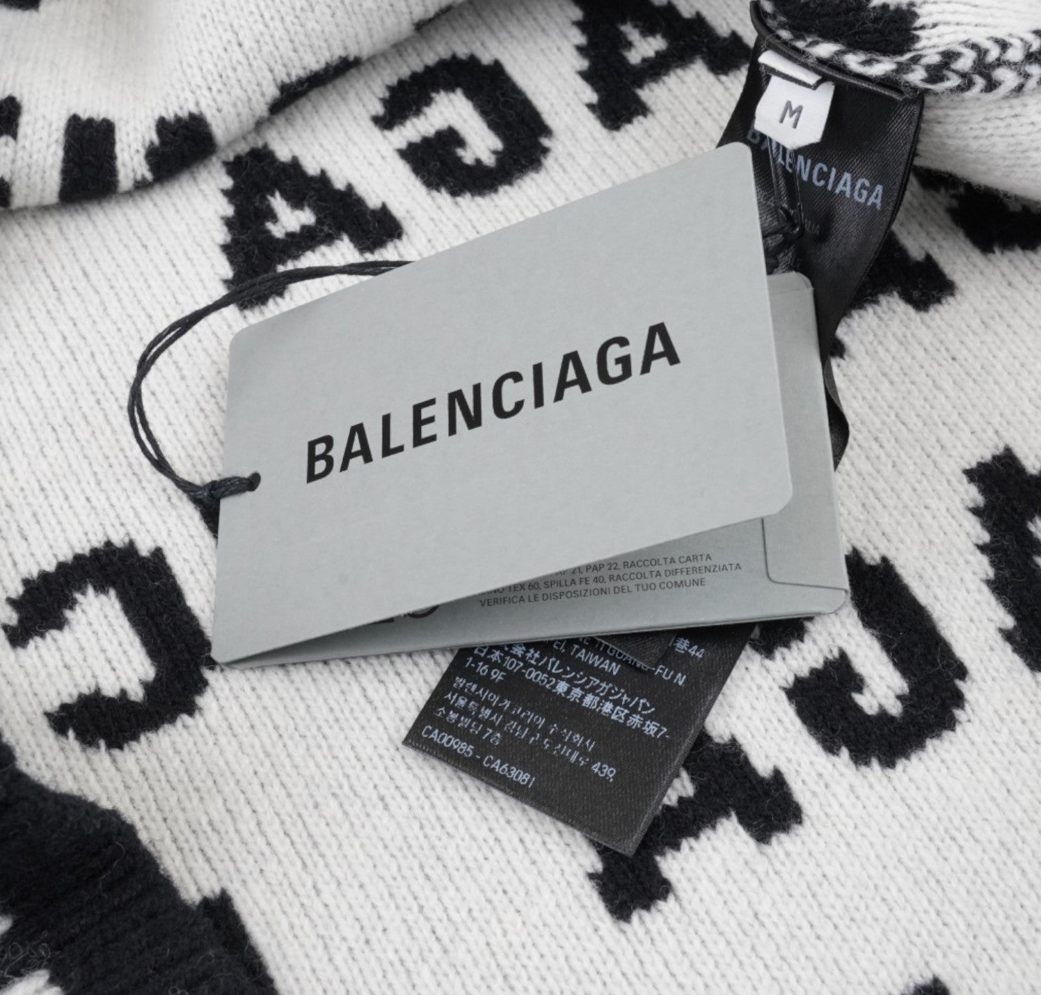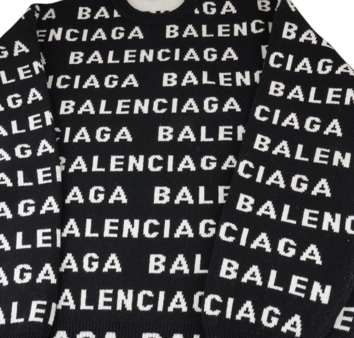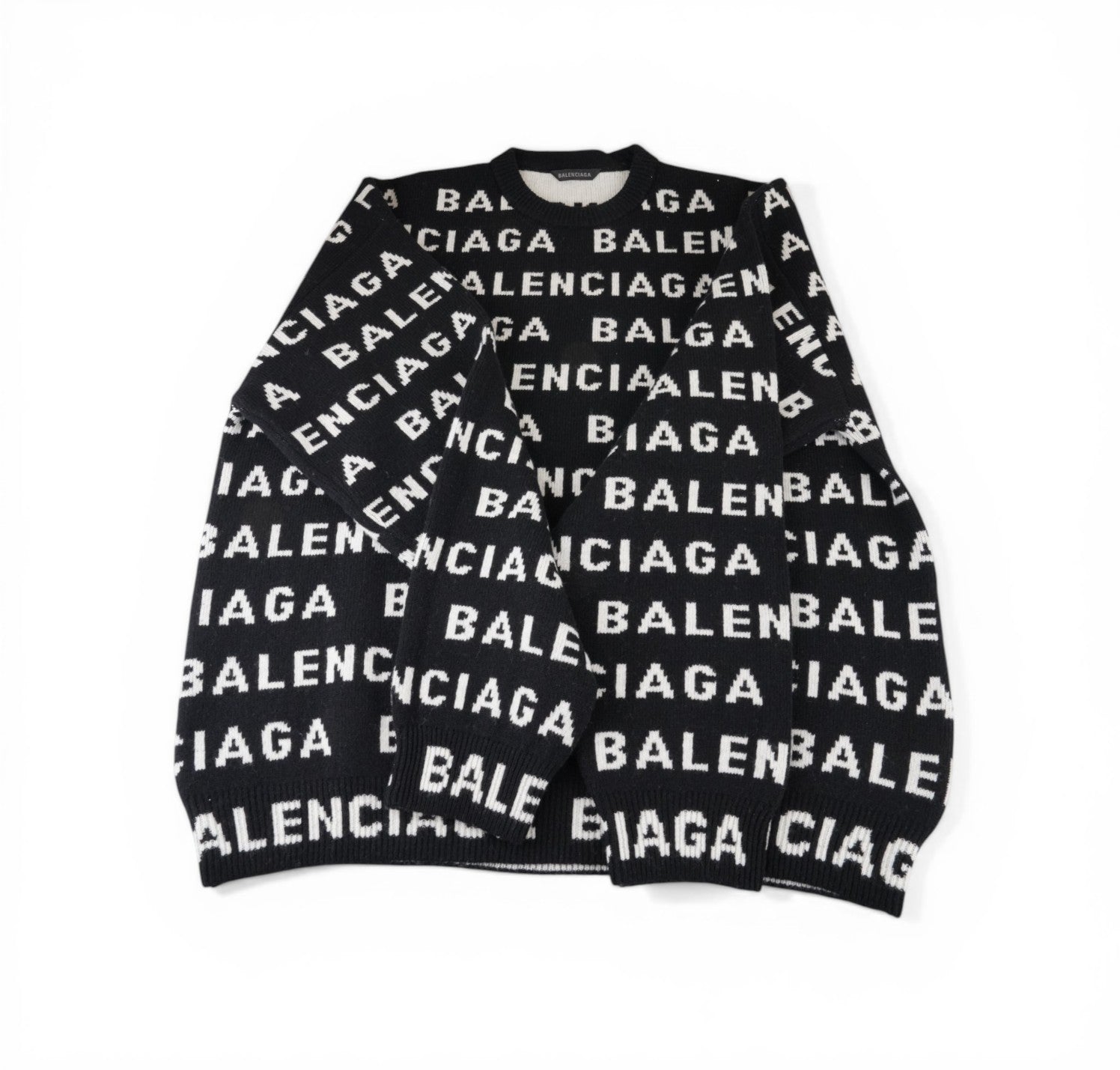 Maglione Balenciaga, modello All-Over Logo Crewneck, realizzato in Lana Nera con lettering Balenciaga bianco a contrasto. Collo, polsini e fondo a costine. Interno in maglia morbida. Taglia M (veste lievemente over). Condizioni pari al nuovo, completo di etichette originali. Retail €1.290.