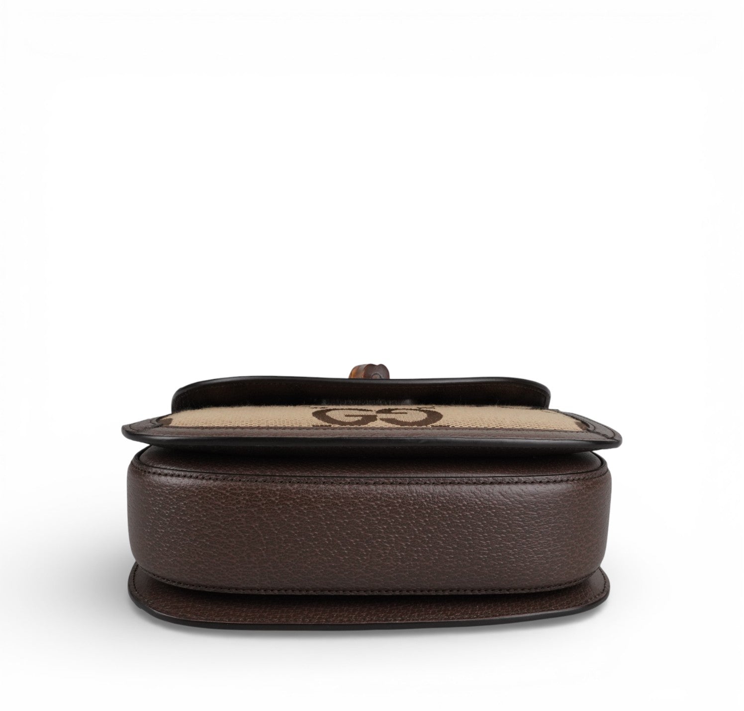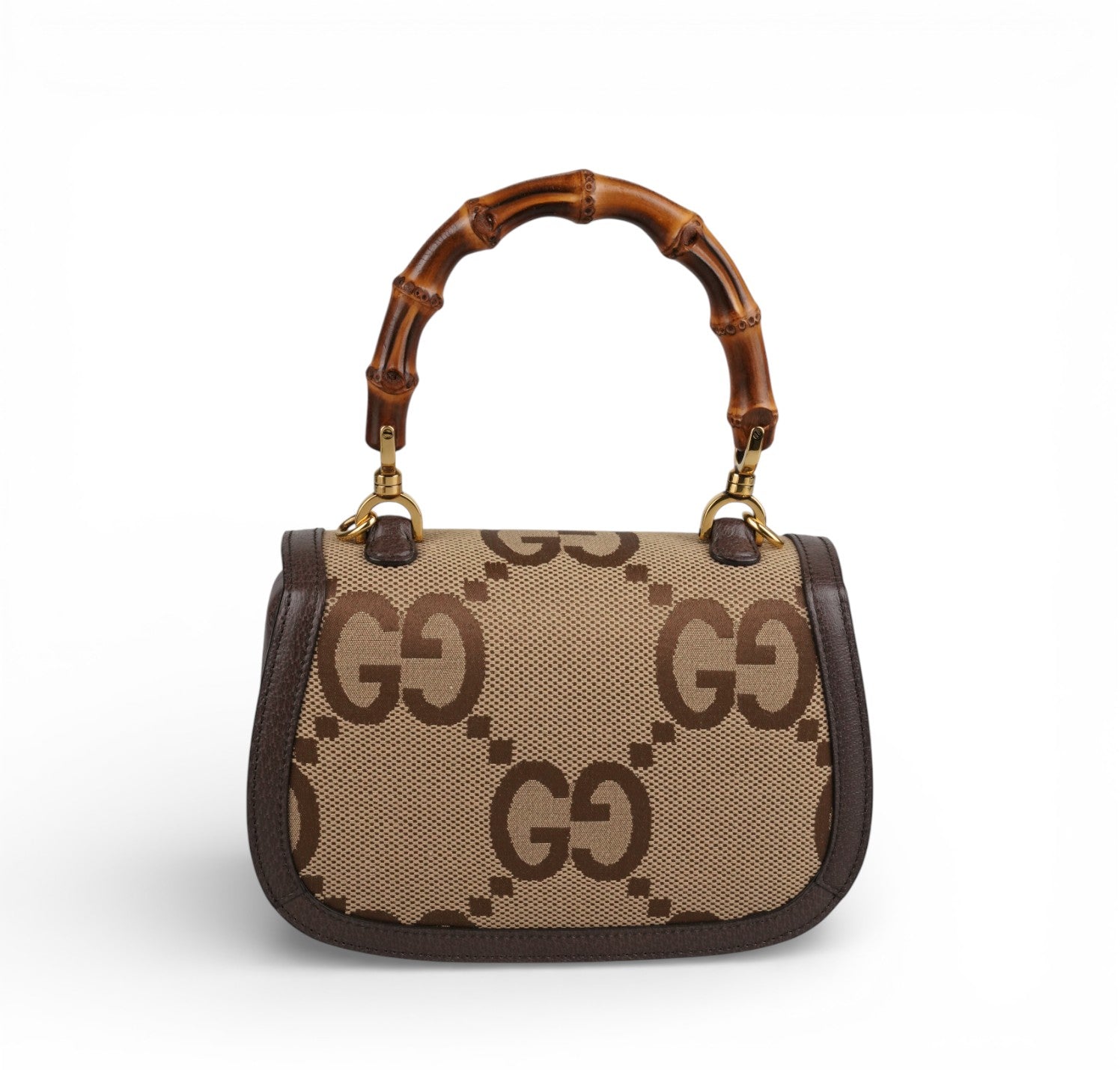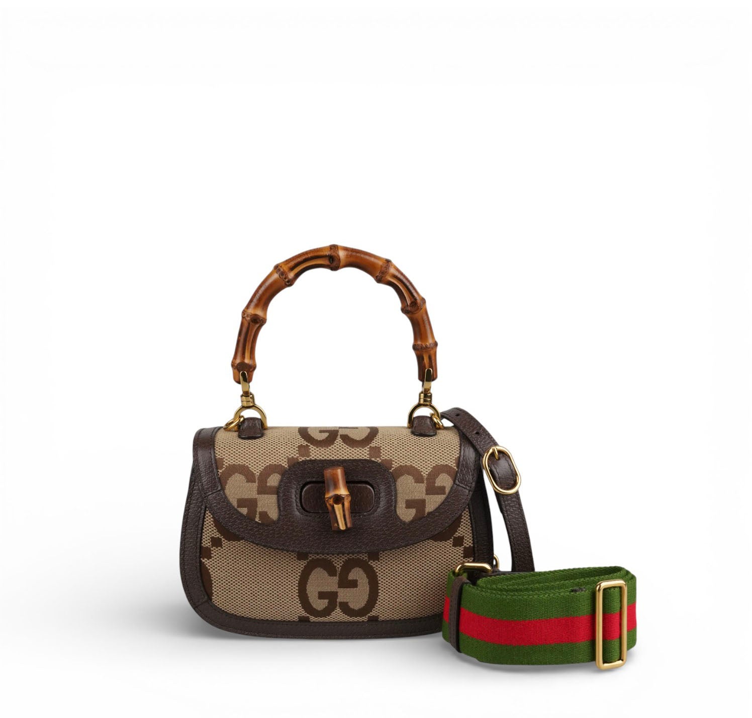 Gucci bag, Bamboo 1947 Mini model, made of Ivory Monogram GG Jumbo Canvas with tone-on-tone leather trim. Top handle and flap closure with Bamboo detail. Equipped with a double shoulder strap, one in Blue and Red Web Fabric and a thin one in Leather. Fabric-lined interior with a single compartment and flat pockets. In like-new condition, with slightly perceptible micro signs of storage, under the flap.