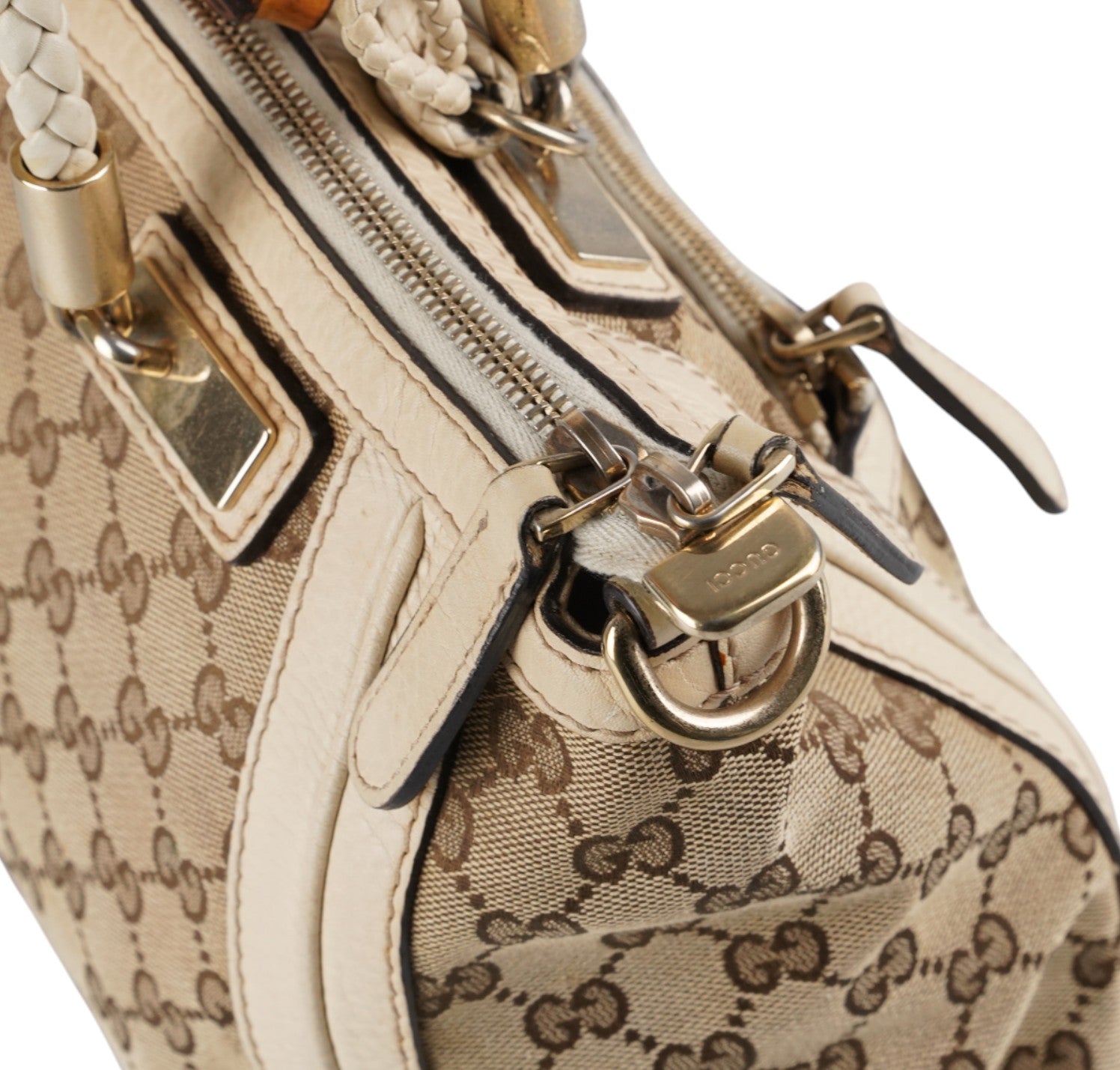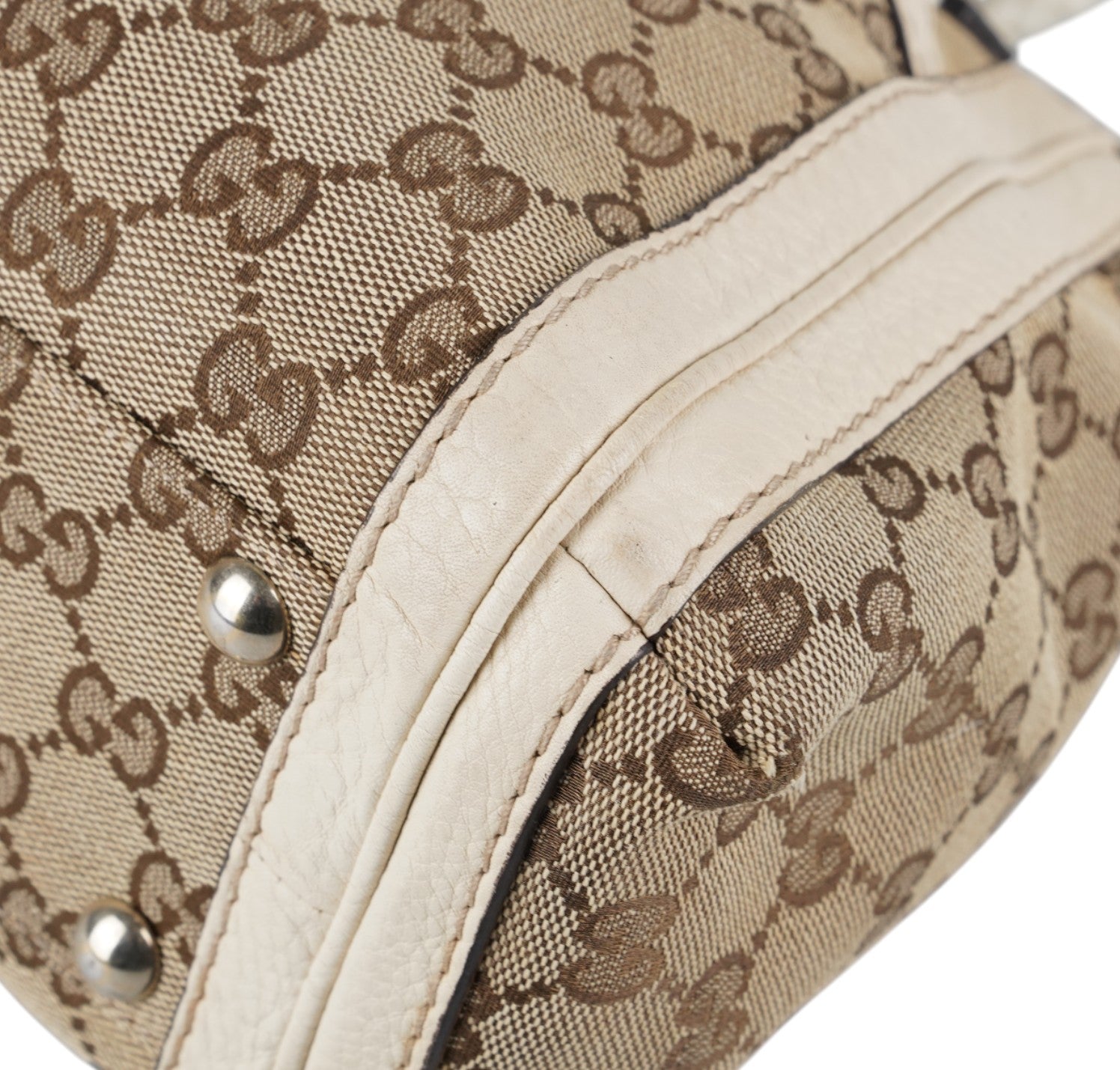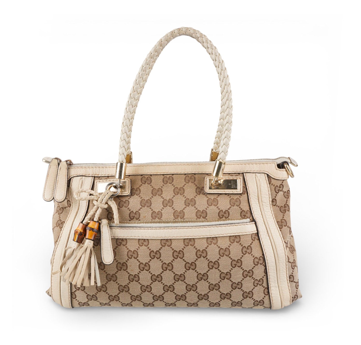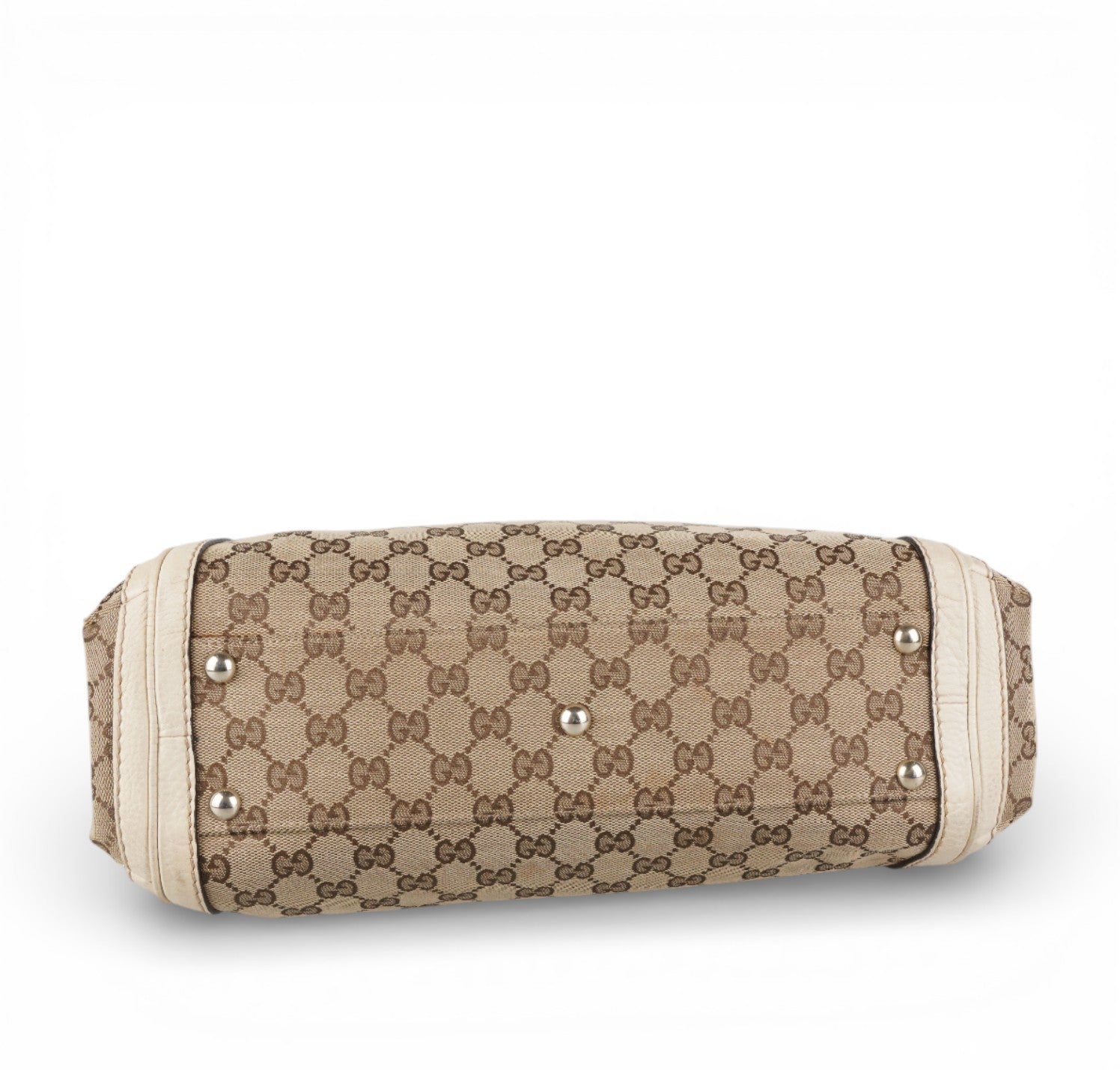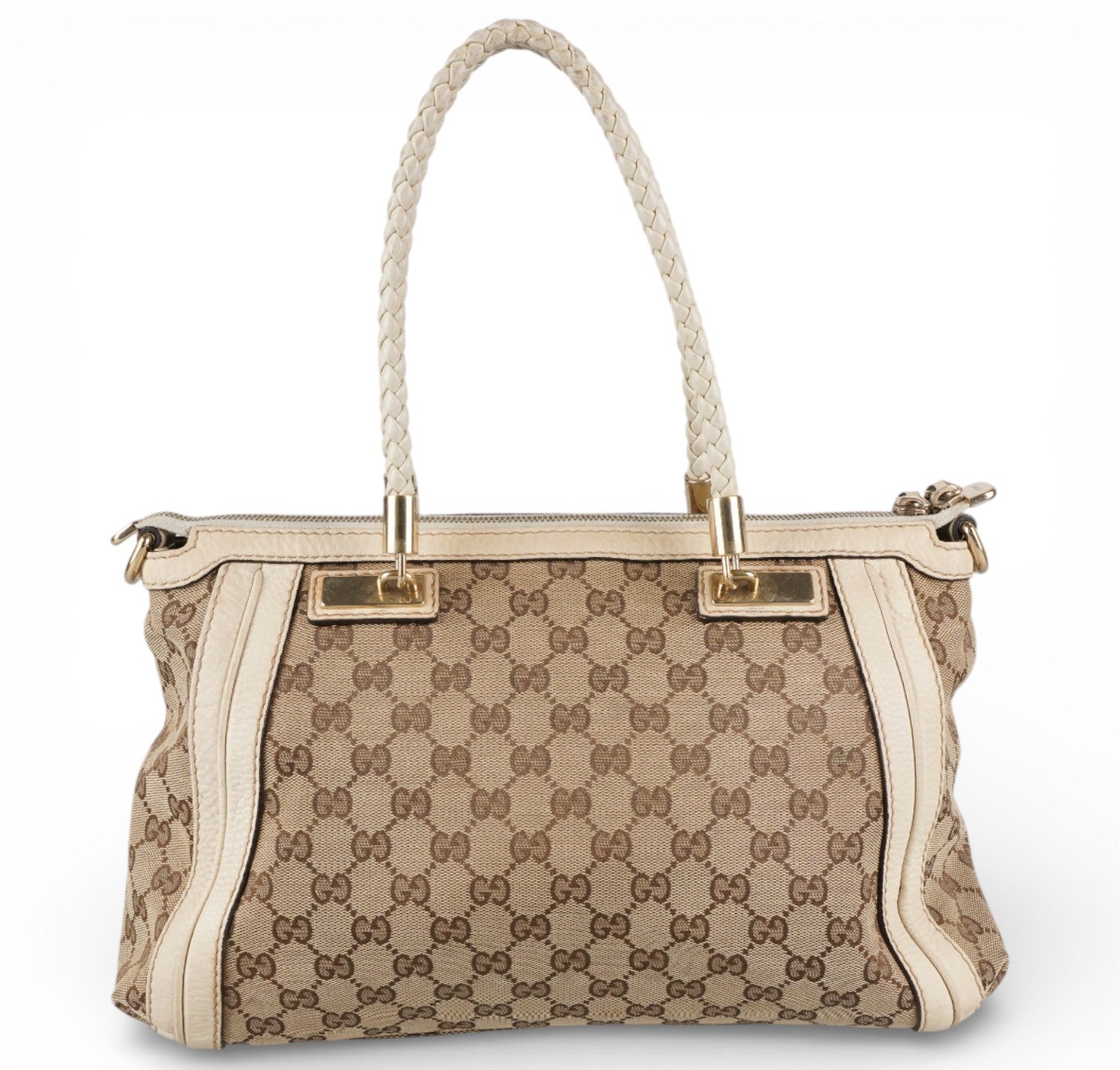 Borsa Gucci, modello Bella, realizzata in tela GG Monogram beige/ebano, impreziosita da profili in pelle color Avorio. Capiente e pratica, ideale per l’uso quotidiano o come borsa da lavoro. Munita di manici superiori intrecciati per portabilità a spalla o a mano. Chiusura superiore con zip. Interno ampio in tessuto. In buono stato generale. Presenta aloni diffusi sul tessuto, parti in pelle leggermente scolorite e metalleria con lievi scoloriture e segni del tempo.