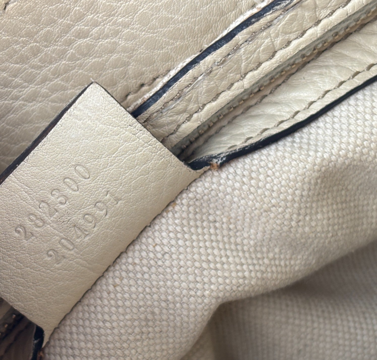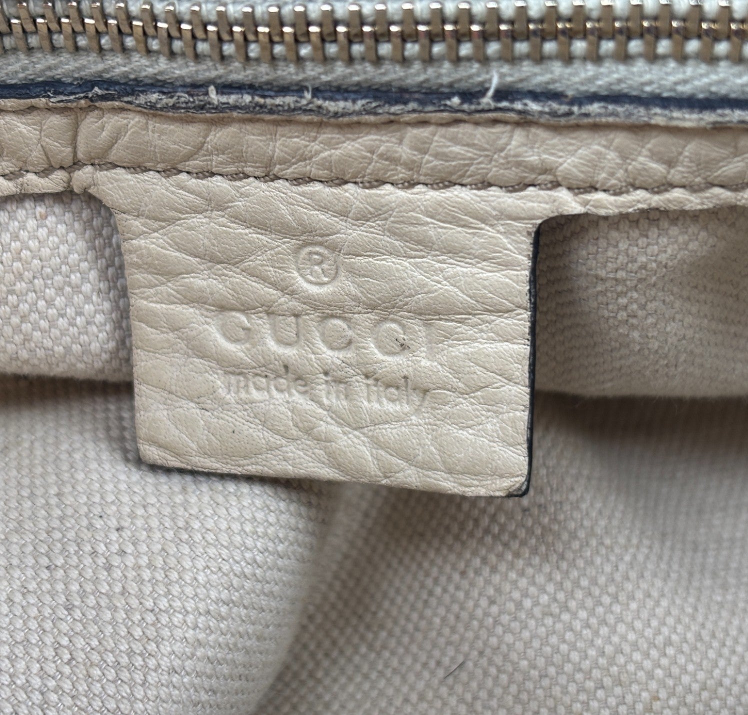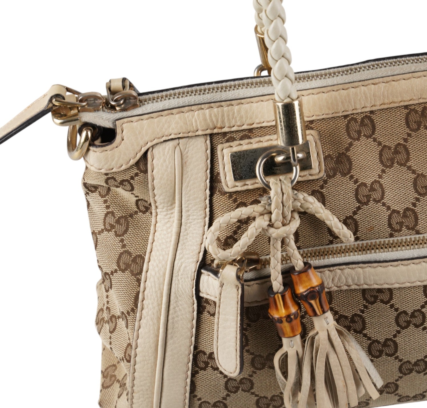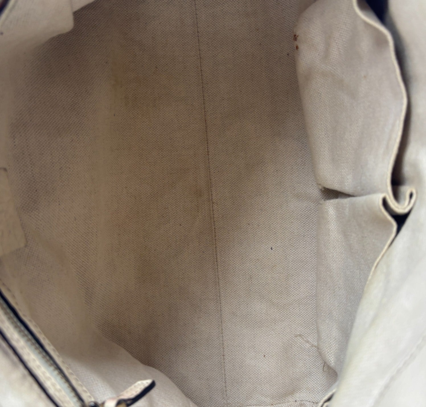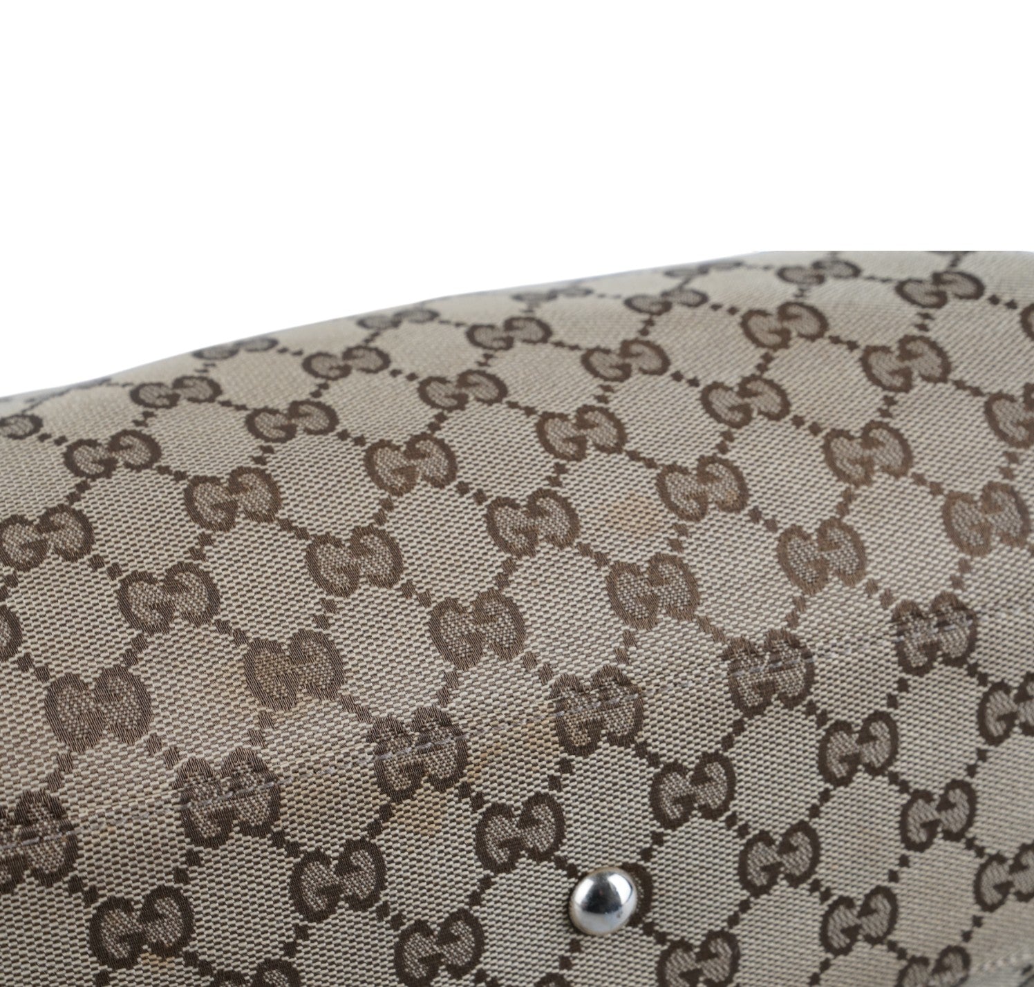 Borsa Gucci, modello Bella, realizzata in tela GG Monogram beige/ebano, impreziosita da profili in pelle color Avorio. Capiente e pratica, ideale per l’uso quotidiano o come borsa da lavoro. Munita di manici superiori intrecciati per portabilità a spalla o a mano. Chiusura superiore con zip. Interno ampio in tessuto. In buono stato generale. Presenta aloni diffusi sul tessuto, parti in pelle leggermente scolorite e metalleria con lievi scoloriture e segni del tempo.