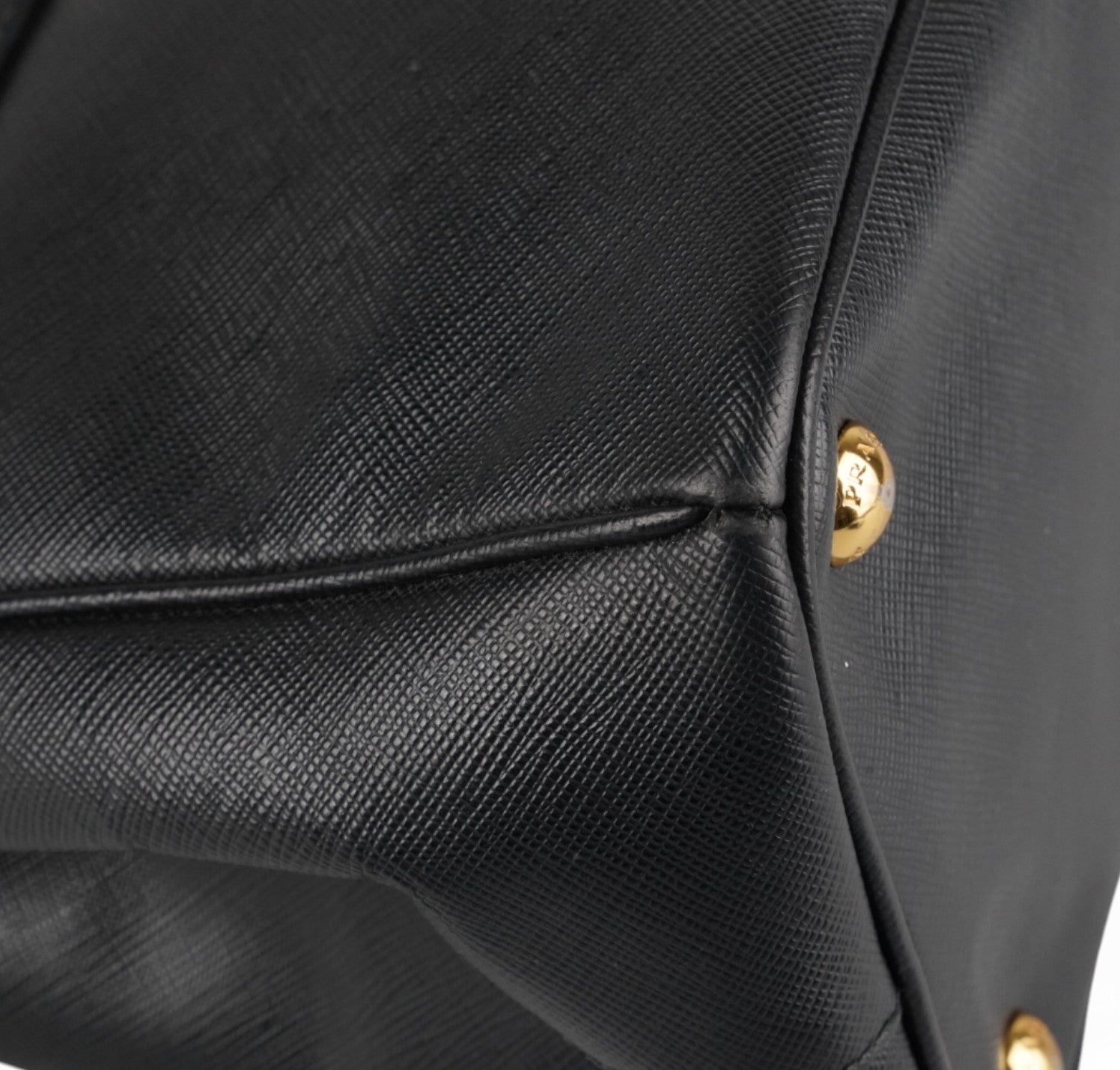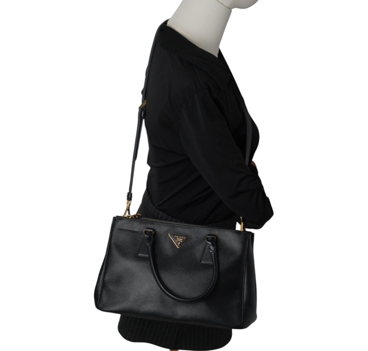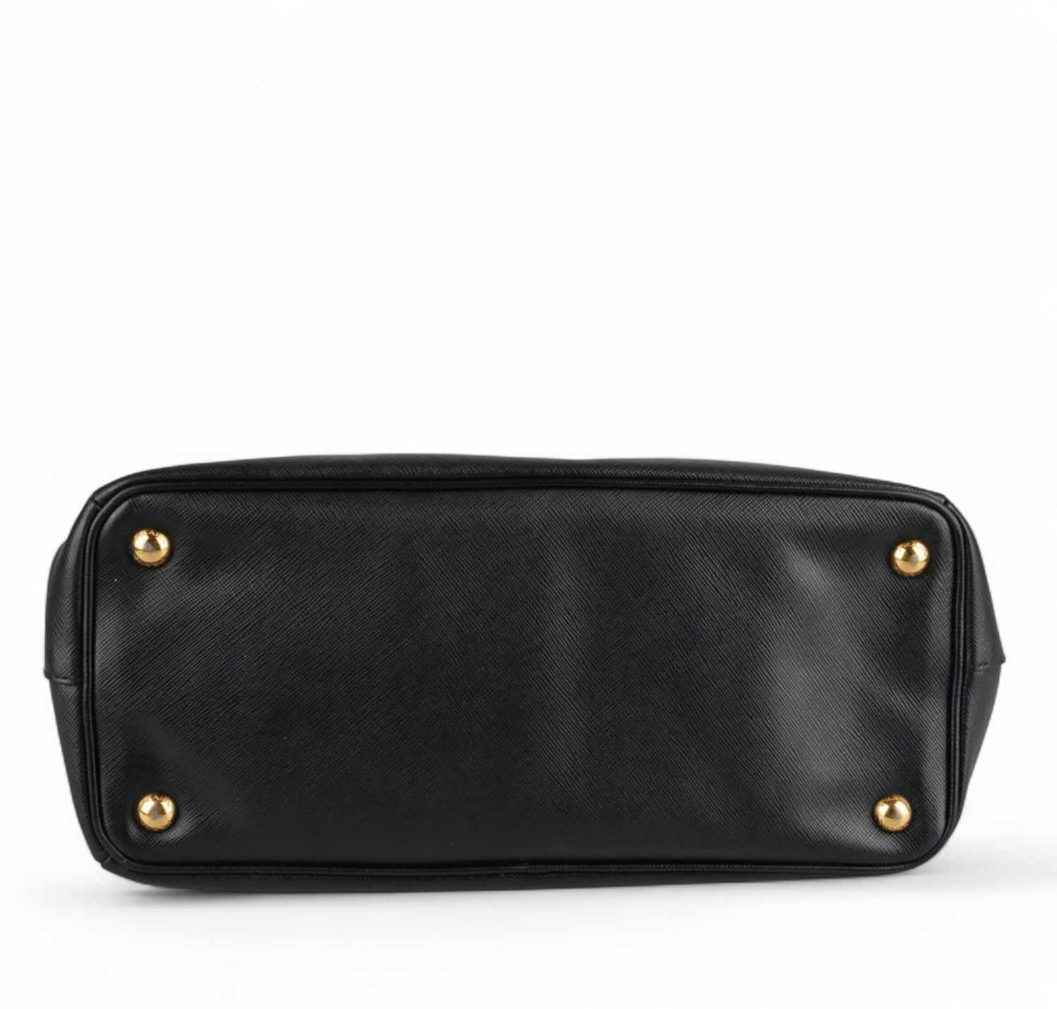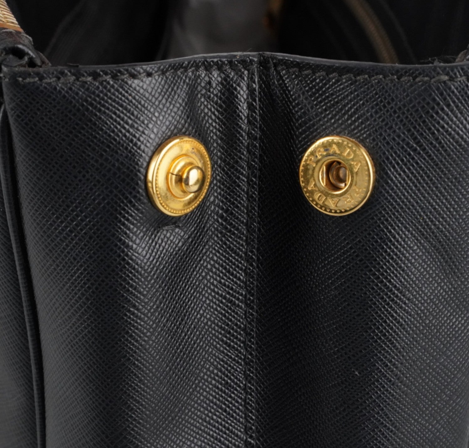 Prada bag, Galleria model, Medium size (currently replaced as Large by the fashion house), made of black Saffiano leather. Gold-colored hardware. Internally lined in logo fabric, with leather details and external pockets with zip closure. Side buttons to increase or decrease the internal capacity. Removable front key ring. Equipped with a removable and adjustable shoulder strap. Slight signs of aging overall. Slight signs of aging on the hardware, sealing wax, leather.