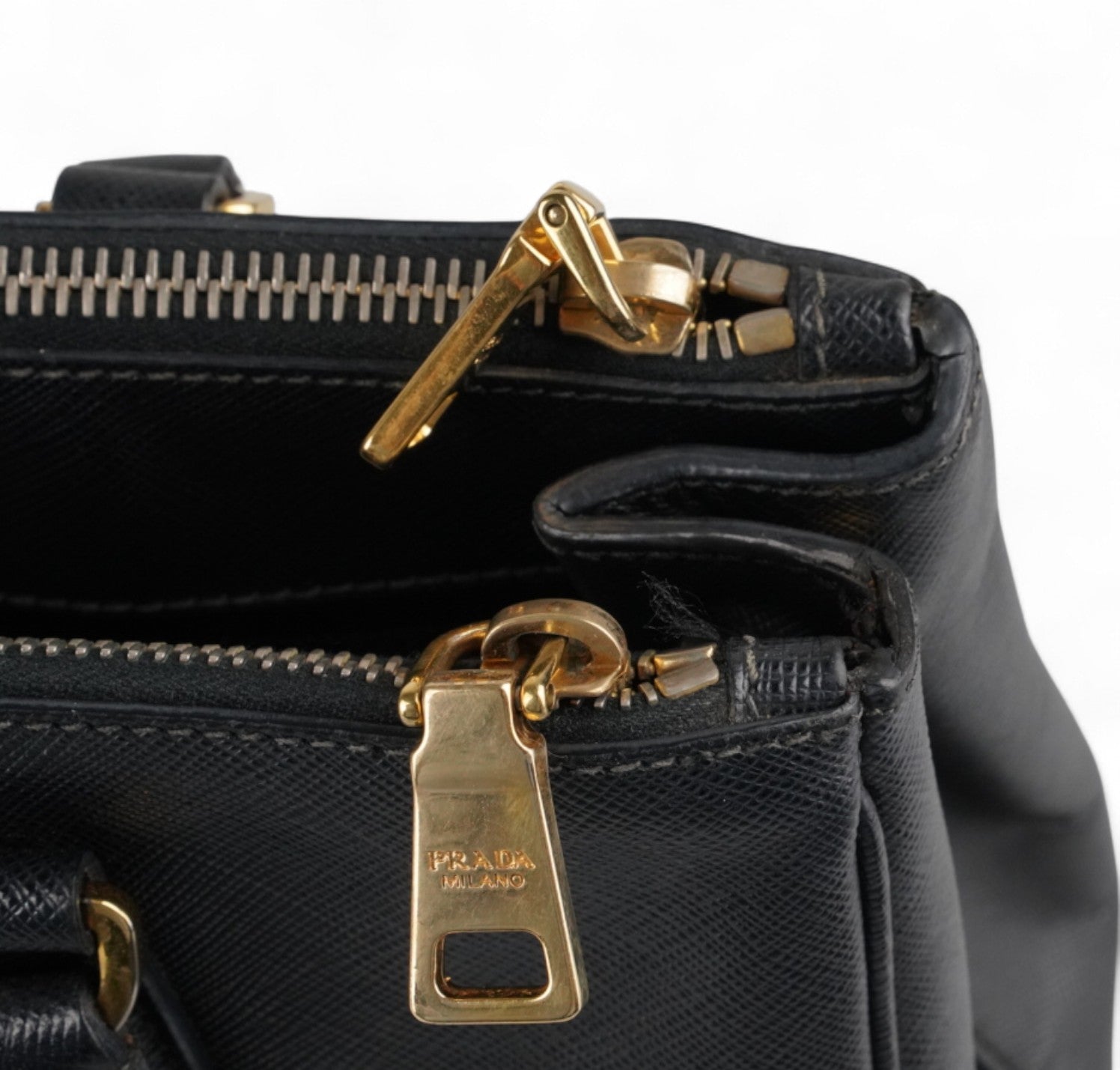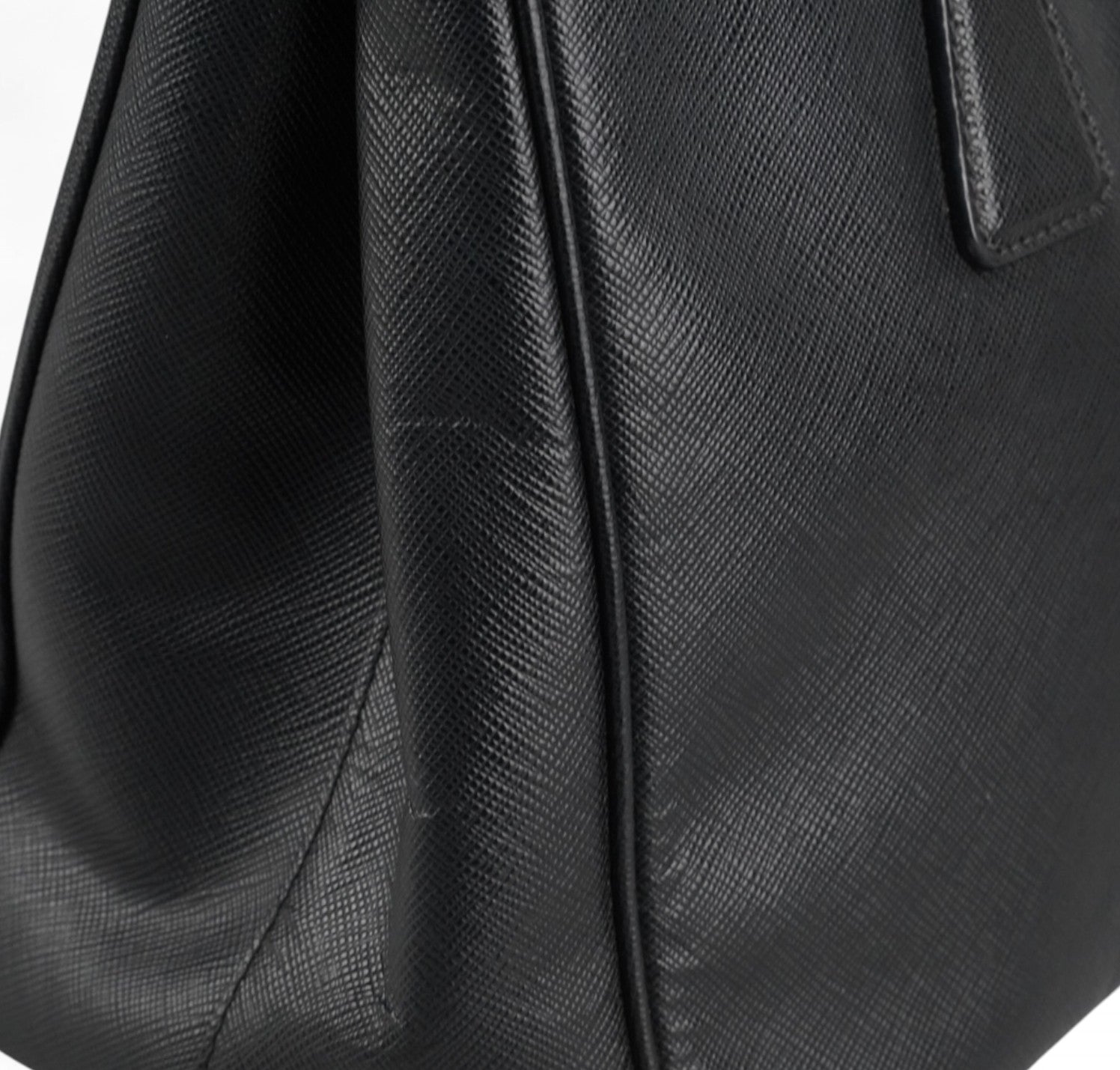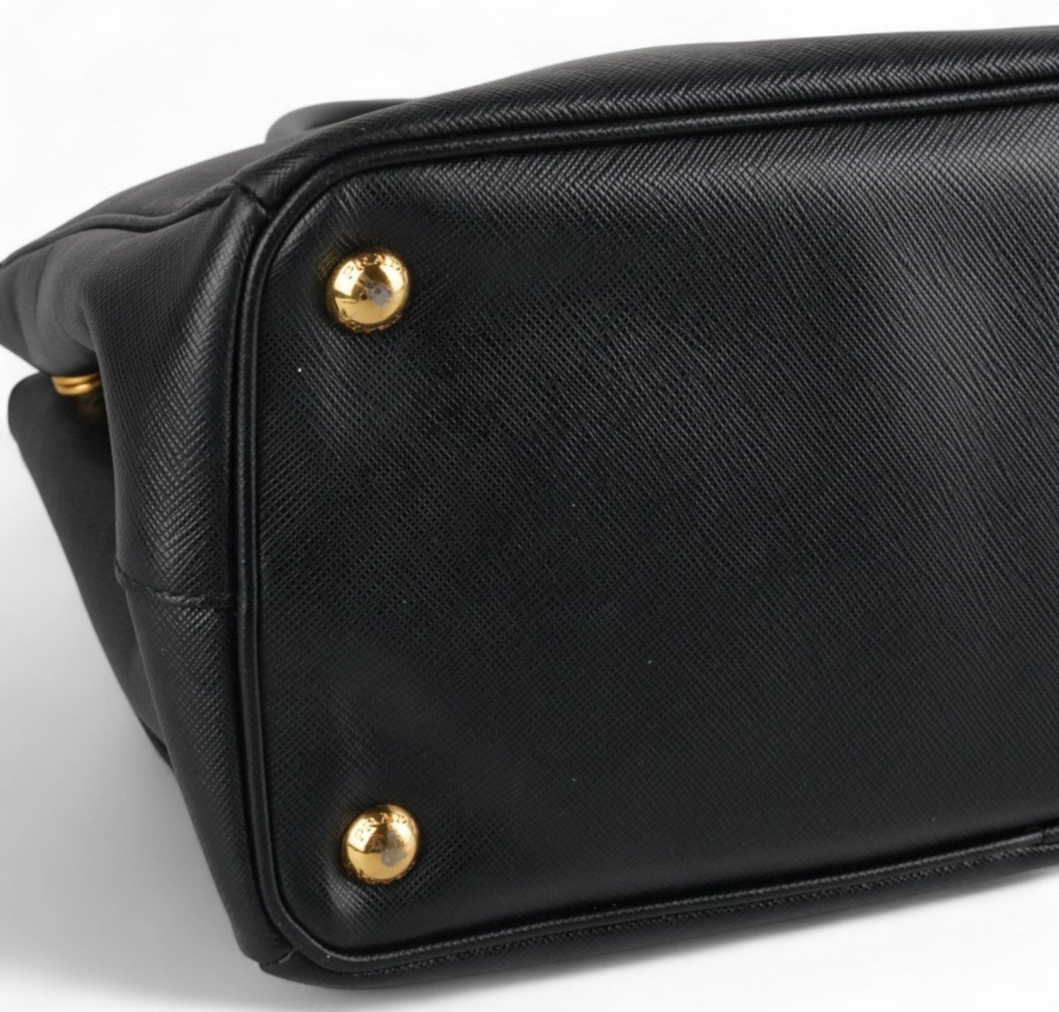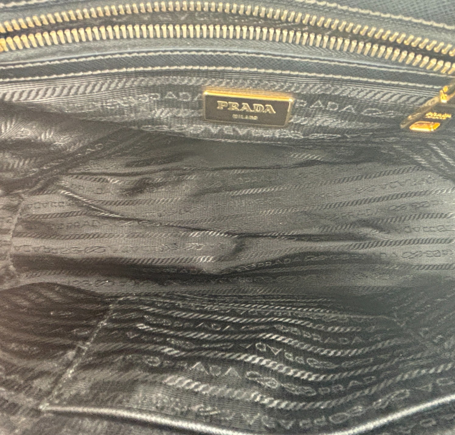 Prada bag, Galleria model, Medium size (currently replaced as Large by the fashion house), made of black Saffiano leather. Gold-colored hardware. Internally lined in logo fabric, with leather details and external pockets with zip closure. Side buttons to increase or decrease the internal capacity. Removable front key ring. Equipped with a removable and adjustable shoulder strap. Slight signs of aging overall. Slight signs of aging on the hardware, sealing wax, leather.