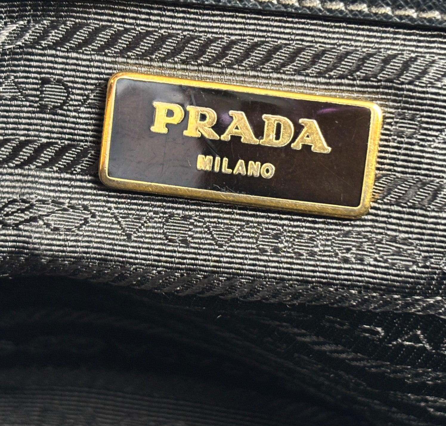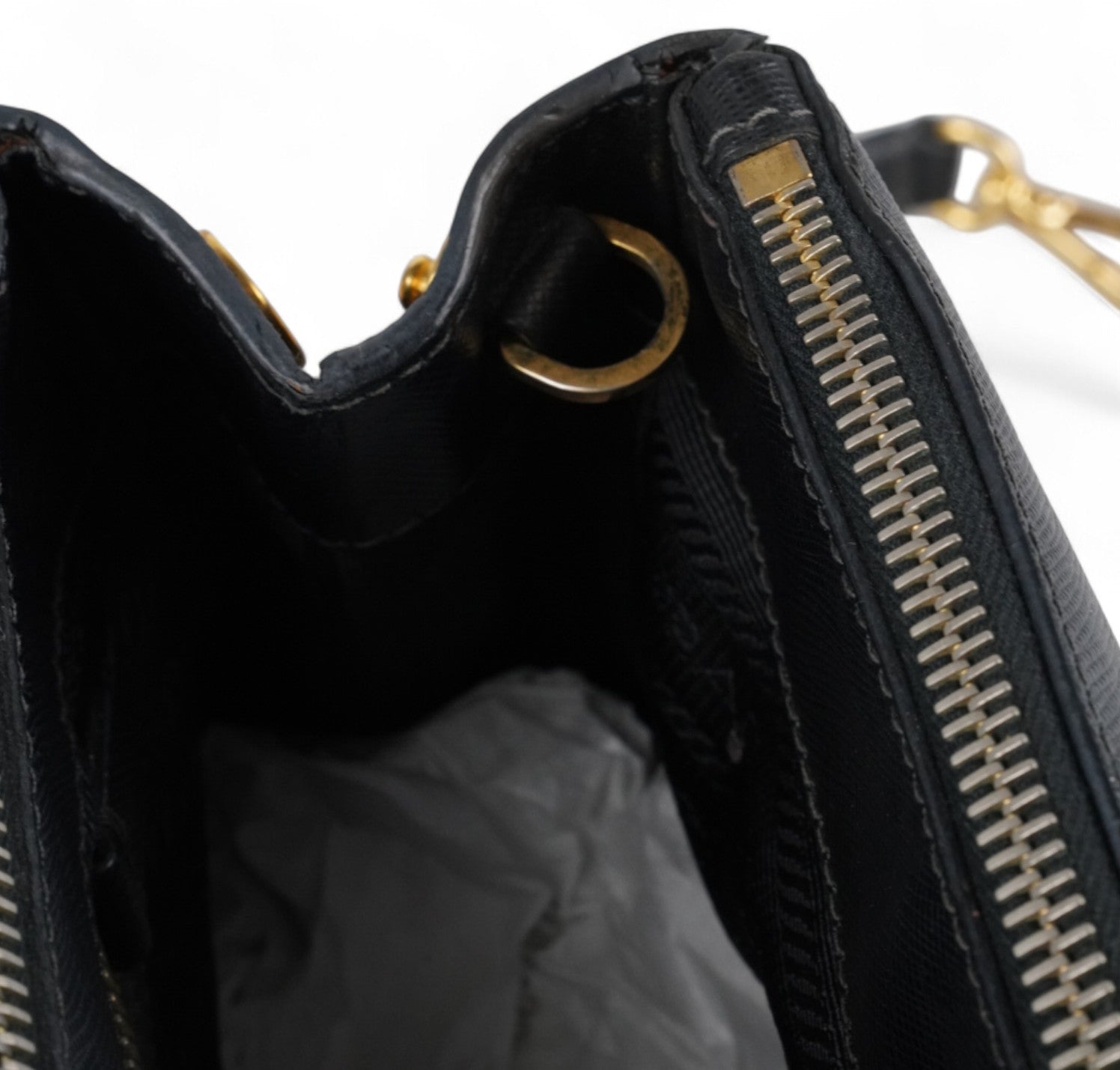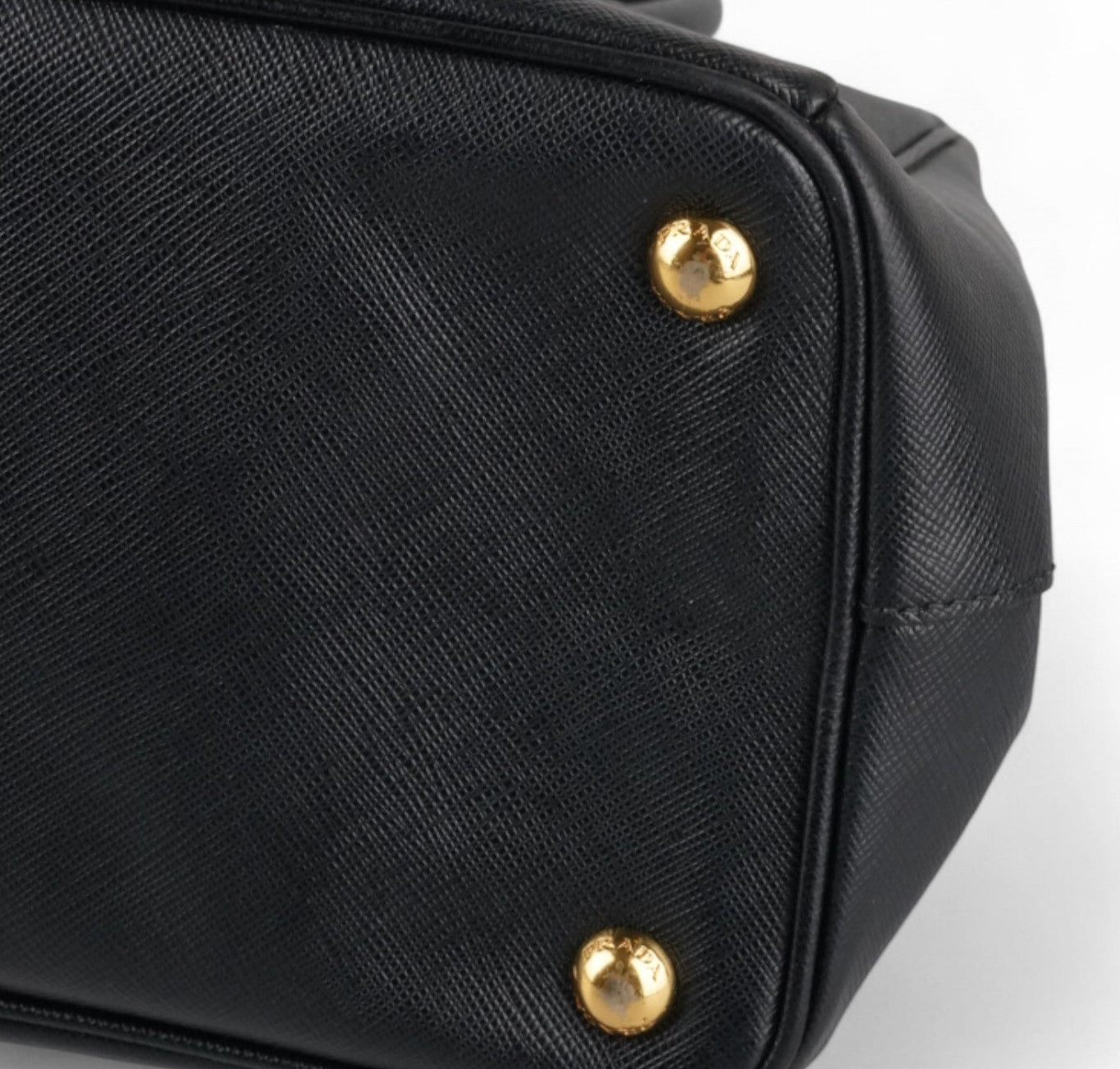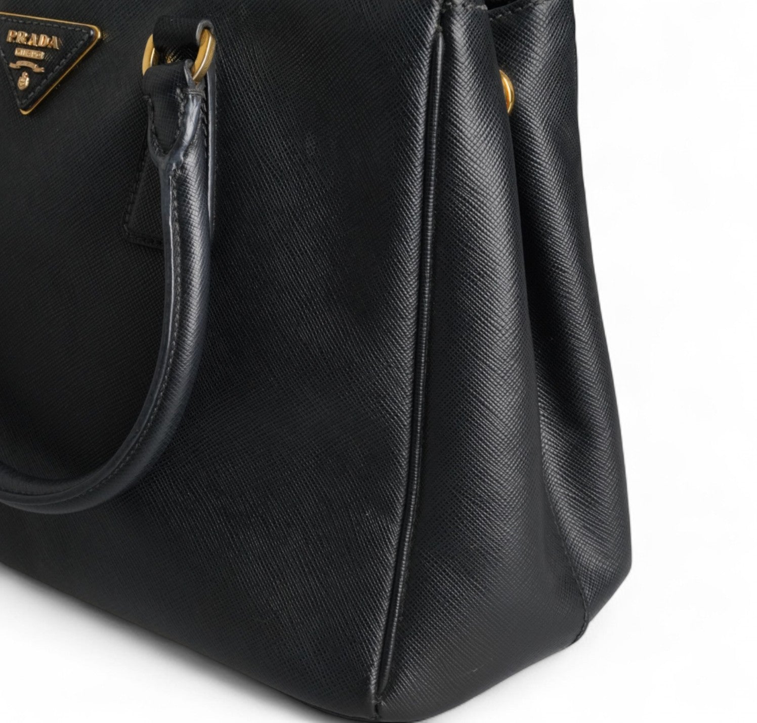 Prada bag, Galleria model, Medium size (currently replaced as Large by the fashion house), made of black Saffiano leather. Gold-colored hardware. Internally lined in logo fabric, with leather details and external pockets with zip closure. Side buttons to increase or decrease the internal capacity. Removable front key ring. Equipped with a removable and adjustable shoulder strap. Slight signs of aging overall. Slight signs of aging on the hardware, sealing wax, leather.