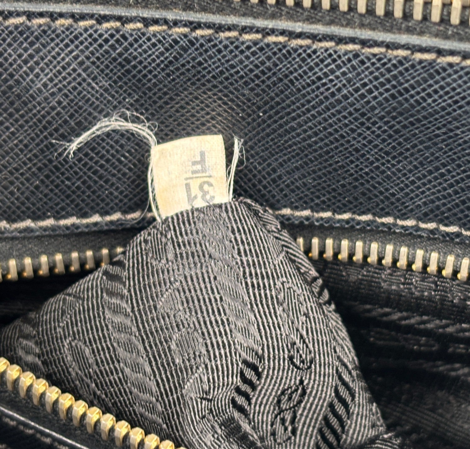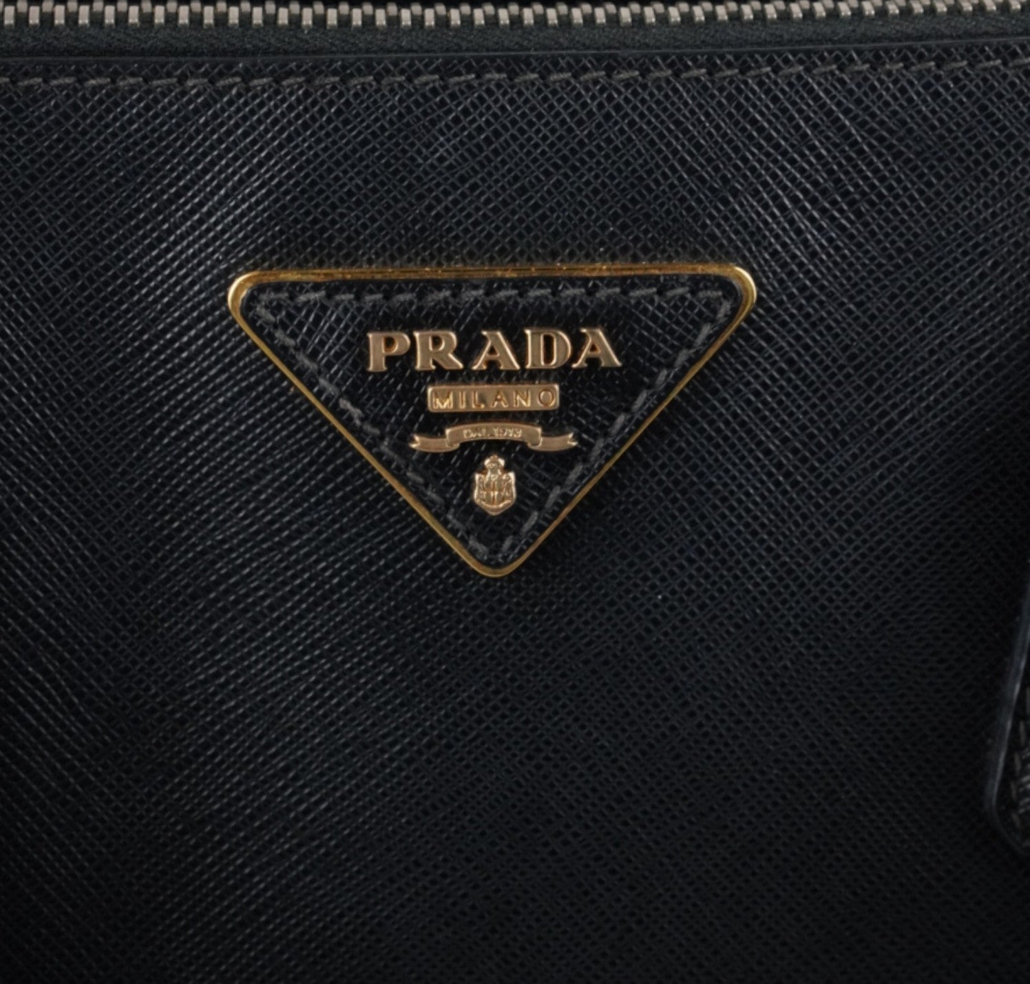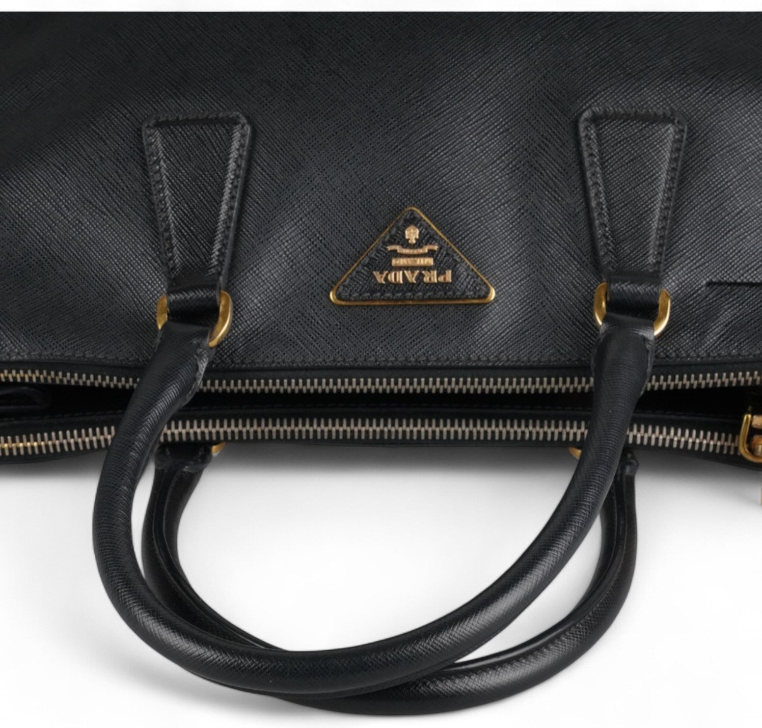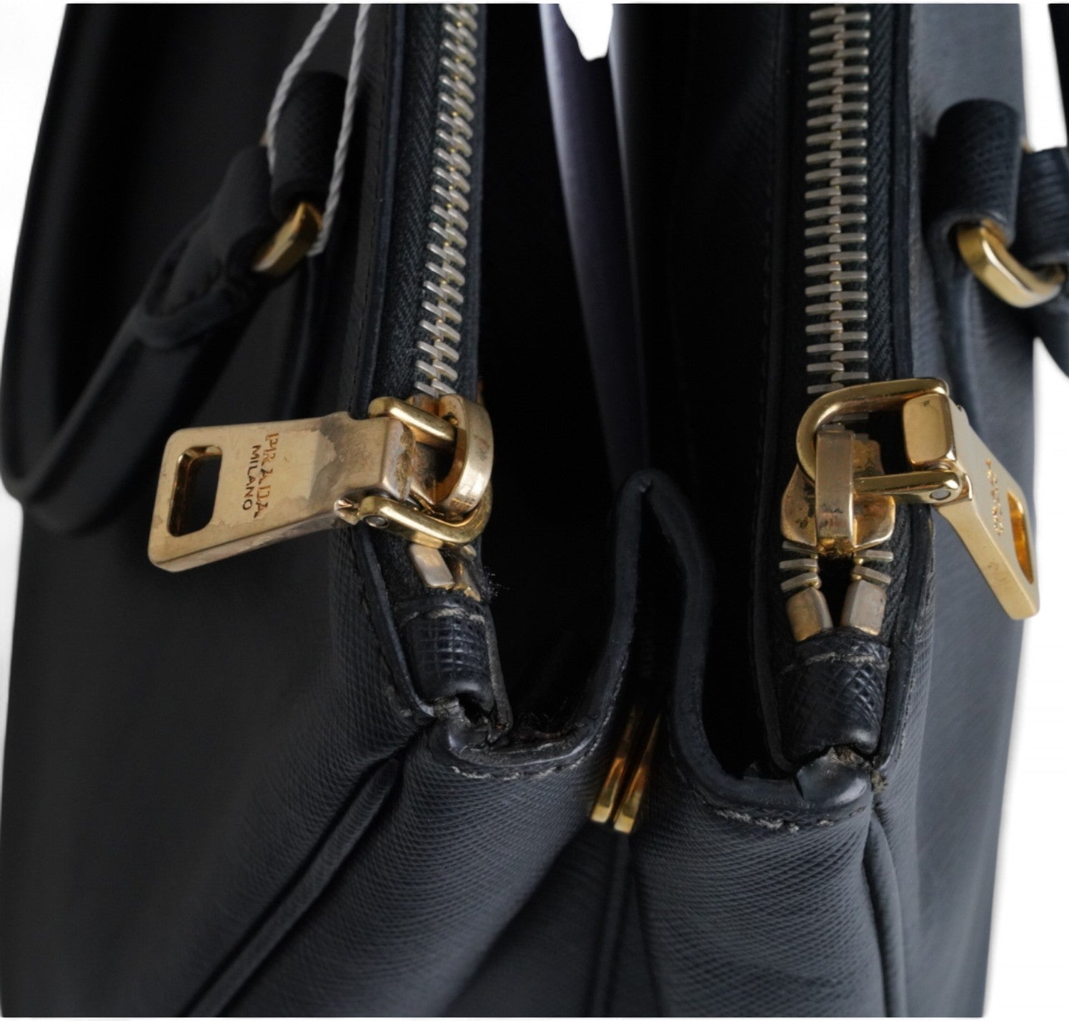 Prada bag, Galleria model, Medium size (currently replaced as Large by the fashion house), made of black Saffiano leather. Gold-colored hardware. Internally lined in logo fabric, with leather details and external pockets with zip closure. Side buttons to increase or decrease the internal capacity. Removable front key ring. Equipped with a removable and adjustable shoulder strap. Slight signs of aging overall. Slight signs of aging on the hardware, sealing wax, leather.