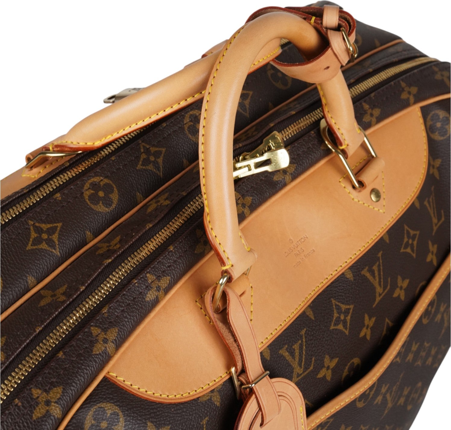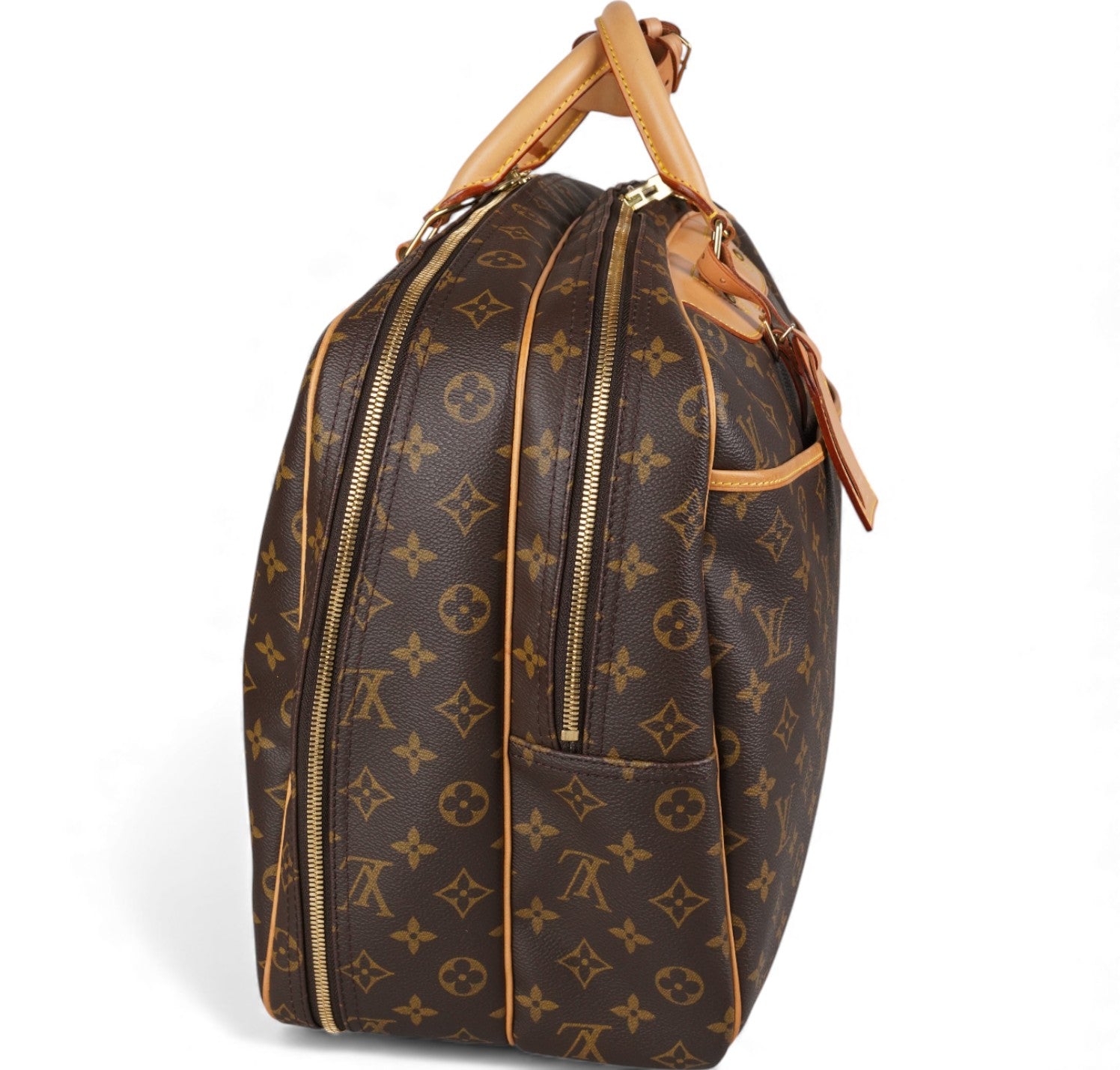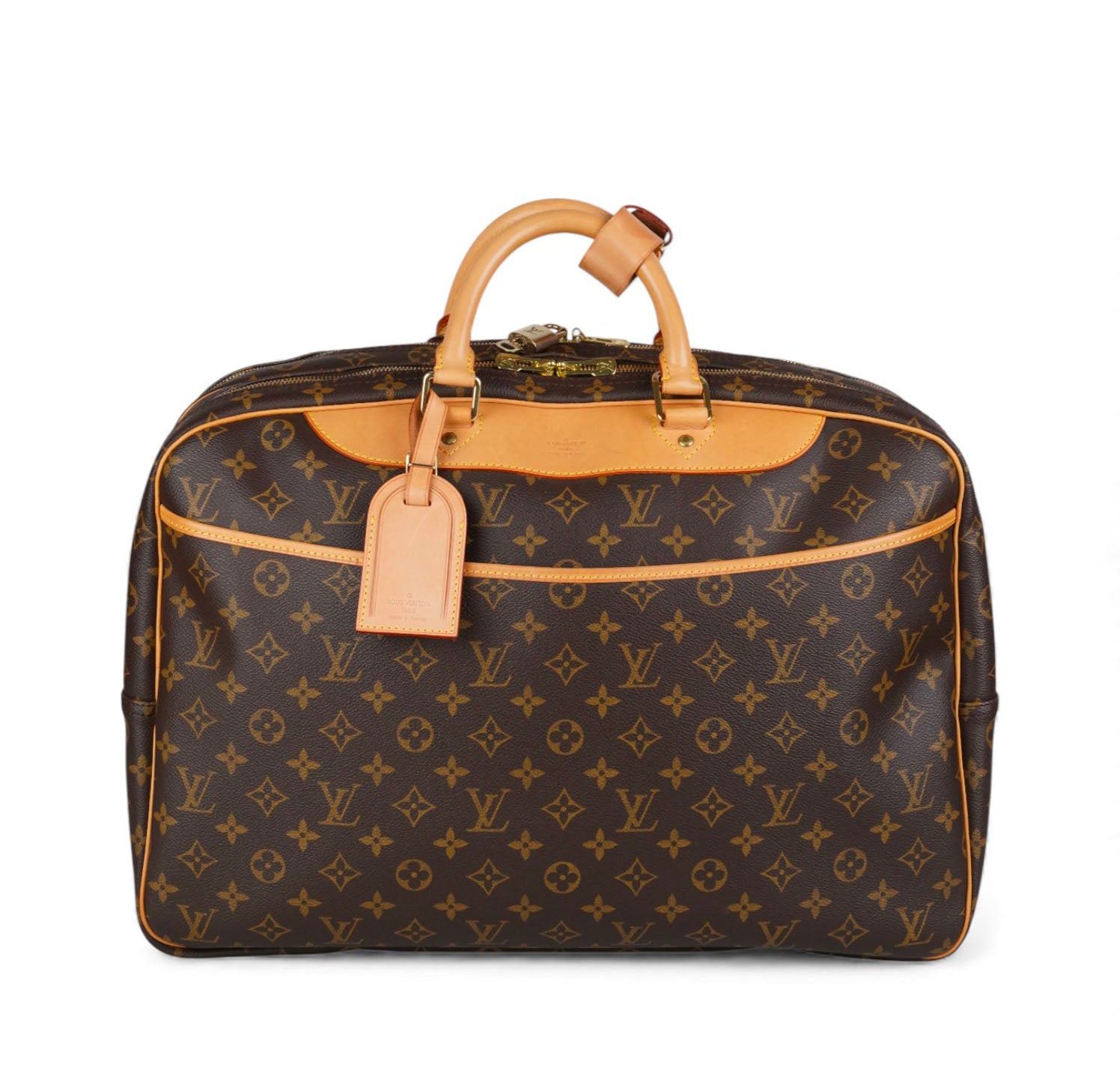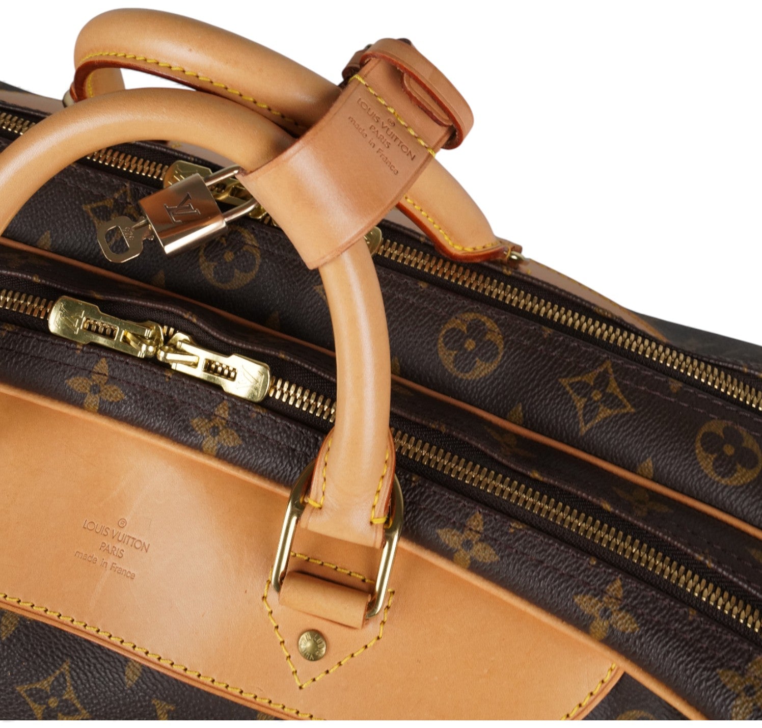 Valigia Louis Vuitton, modello Alizé 24H, realizzata in Tela Monogram con finiture in vacchetta naturale e metalleria color Oro. Dotata di doppi manici, chiusura con zip a doppio cursore e lucchetto con chiavi. Interno foderato in tessuto beige con tasche piatte e ampio spazio. Ideale come borsa da weekend o bagaglio a mano. Da portare a mano o braccio. Munita di Name Tag e Ferma Manici. Condizioni ottime, con lievi segni di utilizzo su pelle, micro graffi metalleria, pelle. Lievi segni del tempo generali.