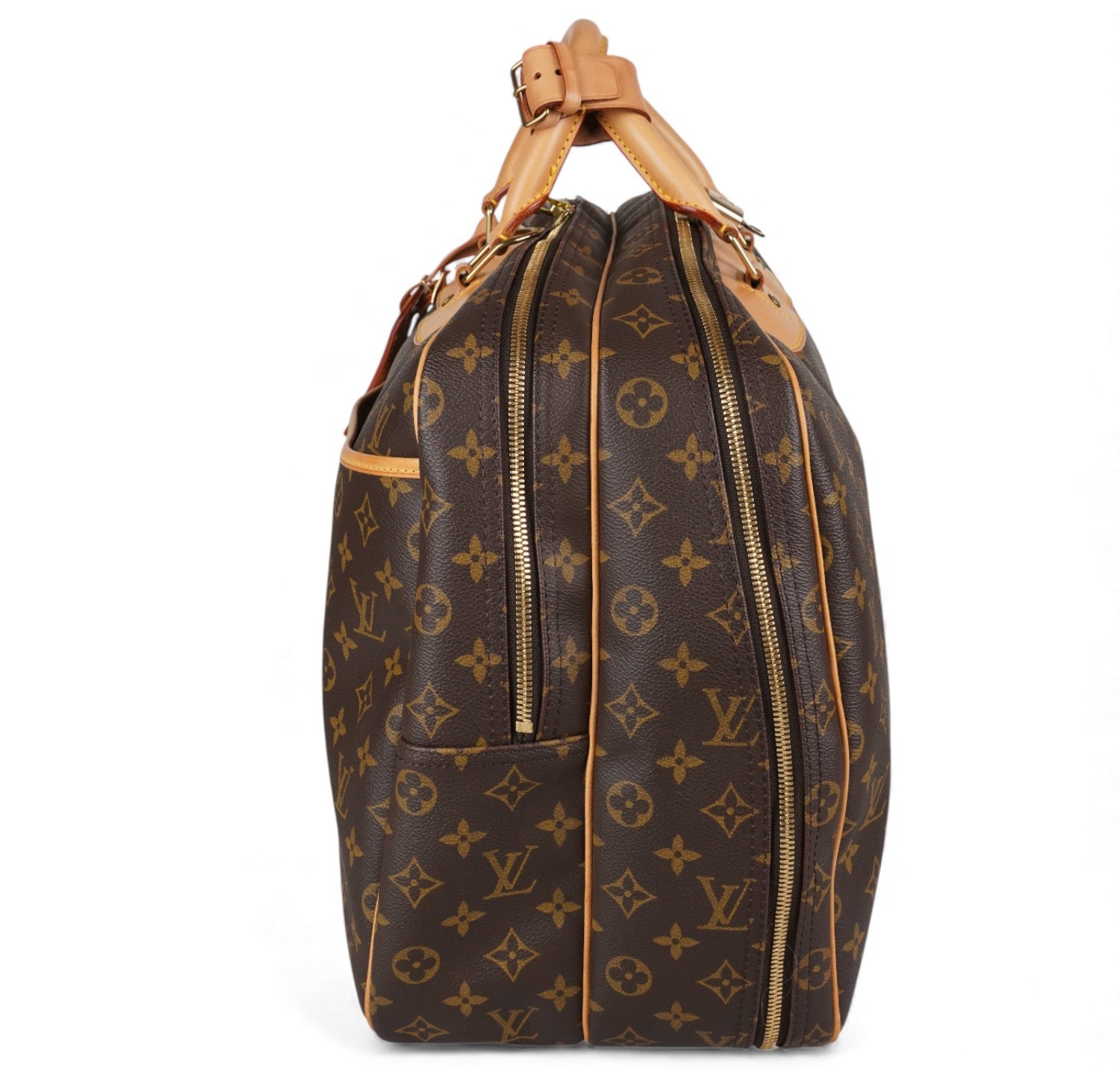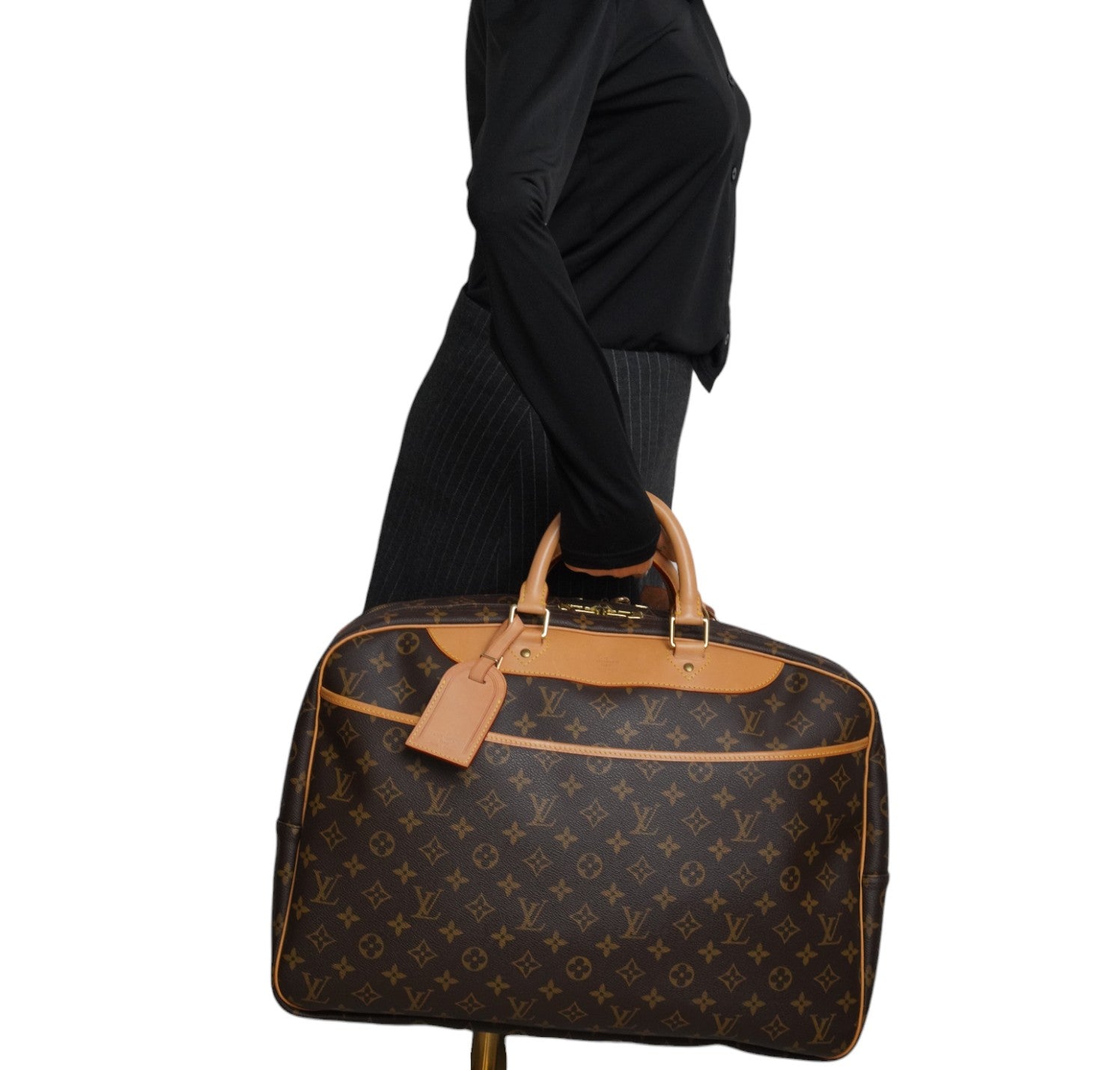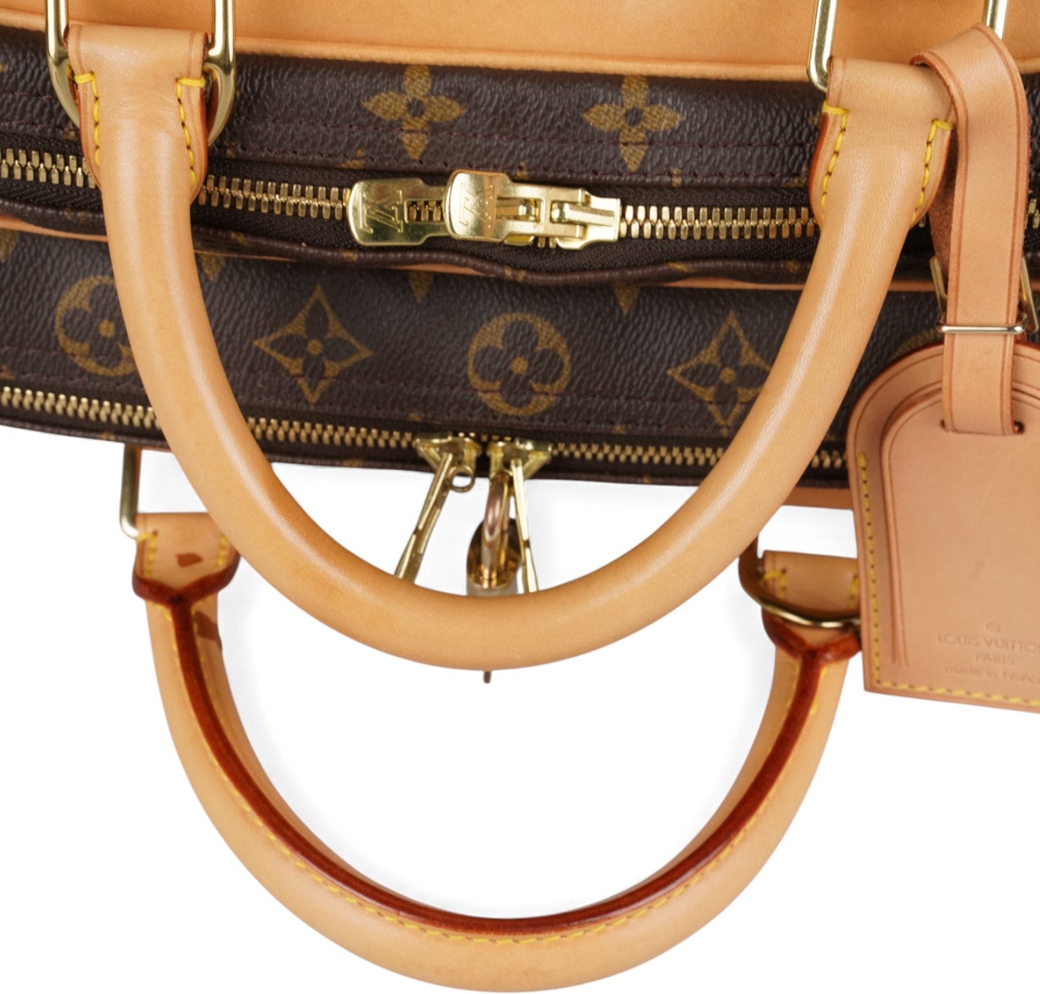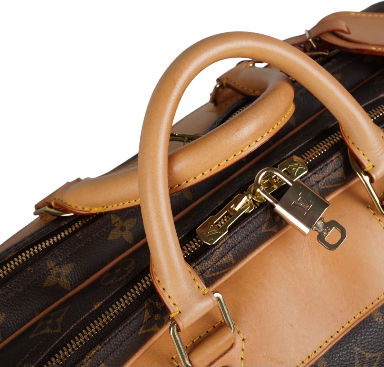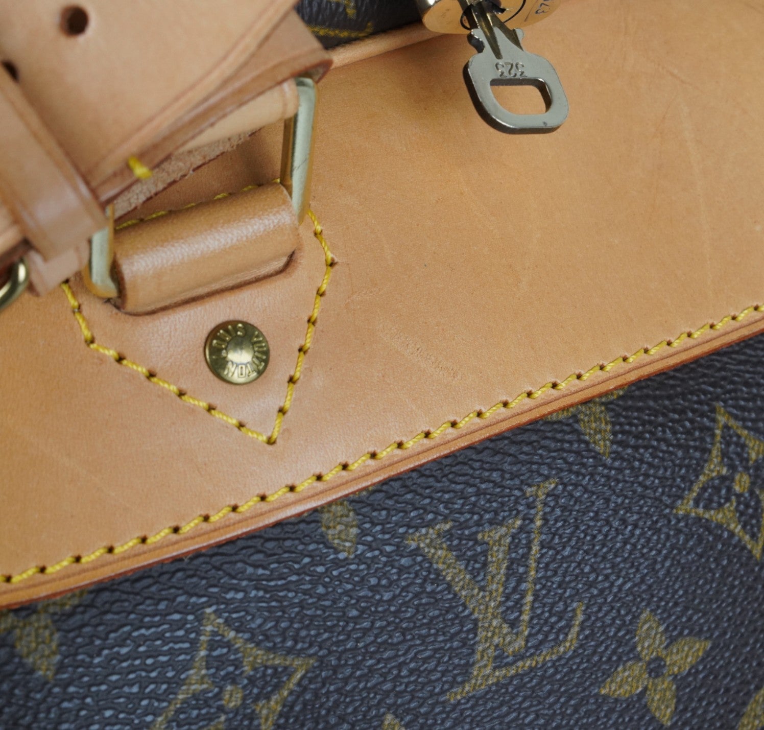 Valigia Louis Vuitton, modello Alizé 24H, realizzata in Tela Monogram con finiture in vacchetta naturale e metalleria color Oro. Dotata di doppi manici, chiusura con zip a doppio cursore e lucchetto con chiavi. Interno foderato in tessuto beige con tasche piatte e ampio spazio. Ideale come borsa da weekend o bagaglio a mano. Da portare a mano o braccio. Munita di Name Tag e Ferma Manici. Condizioni ottime, con lievi segni di utilizzo su pelle, micro graffi metalleria, pelle. Lievi segni del tempo generali.