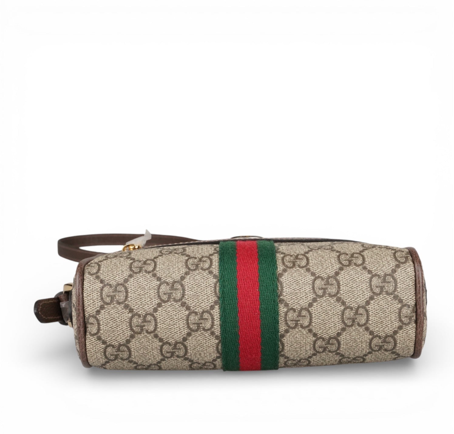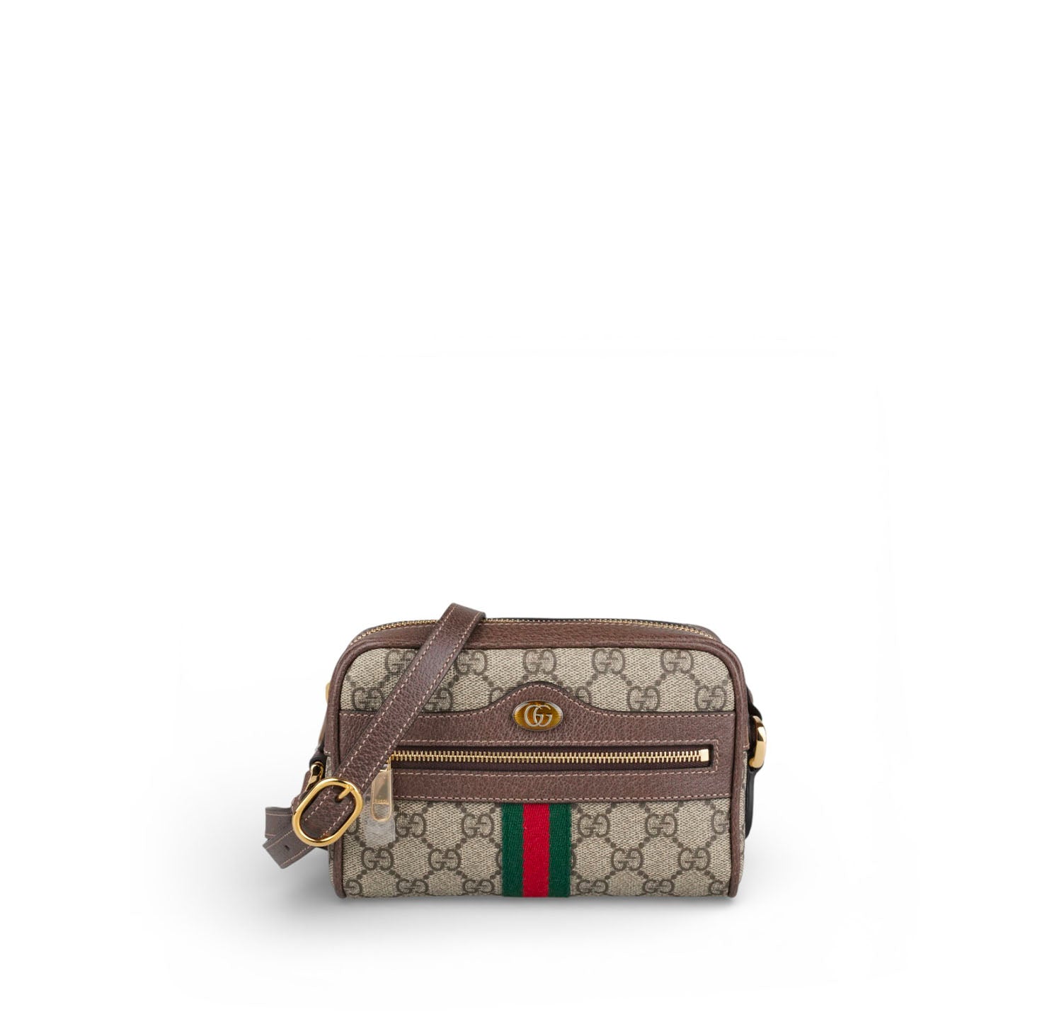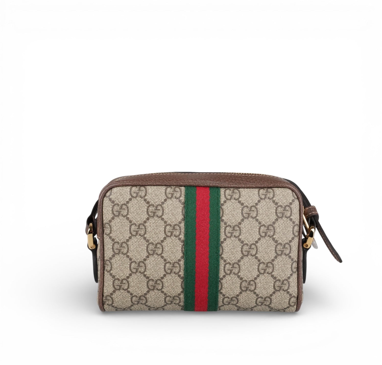 Borsa Gucci, modello Ophidia, misura mini, realizzata in tela GG Supreme beige/ebano con finiture in pelle marrone e iconico nastro Web verde e rosso posizionato centralmente nella parte inferiore e logo Doppia G ovale. Pratica tasca frontale con cerniera. Dotata di tracolla regolabile in pelle per una portabilità a spalla o crossbody. Chiusura superiore con zip. L'interno è foderato in microfibra effetto scamosciato color beige con piccola tasca e gancio portachiavi/multifunzione interno. Pari al nuovo, mai indossata. Potrebbero essere presenti minimi segni di stoccaggio.