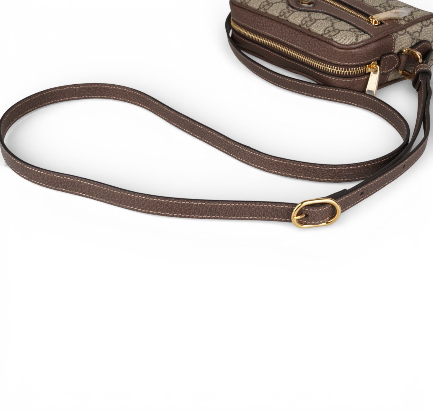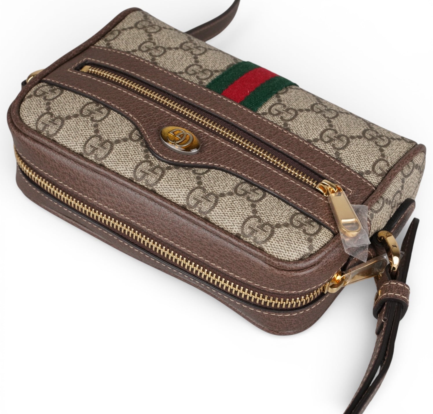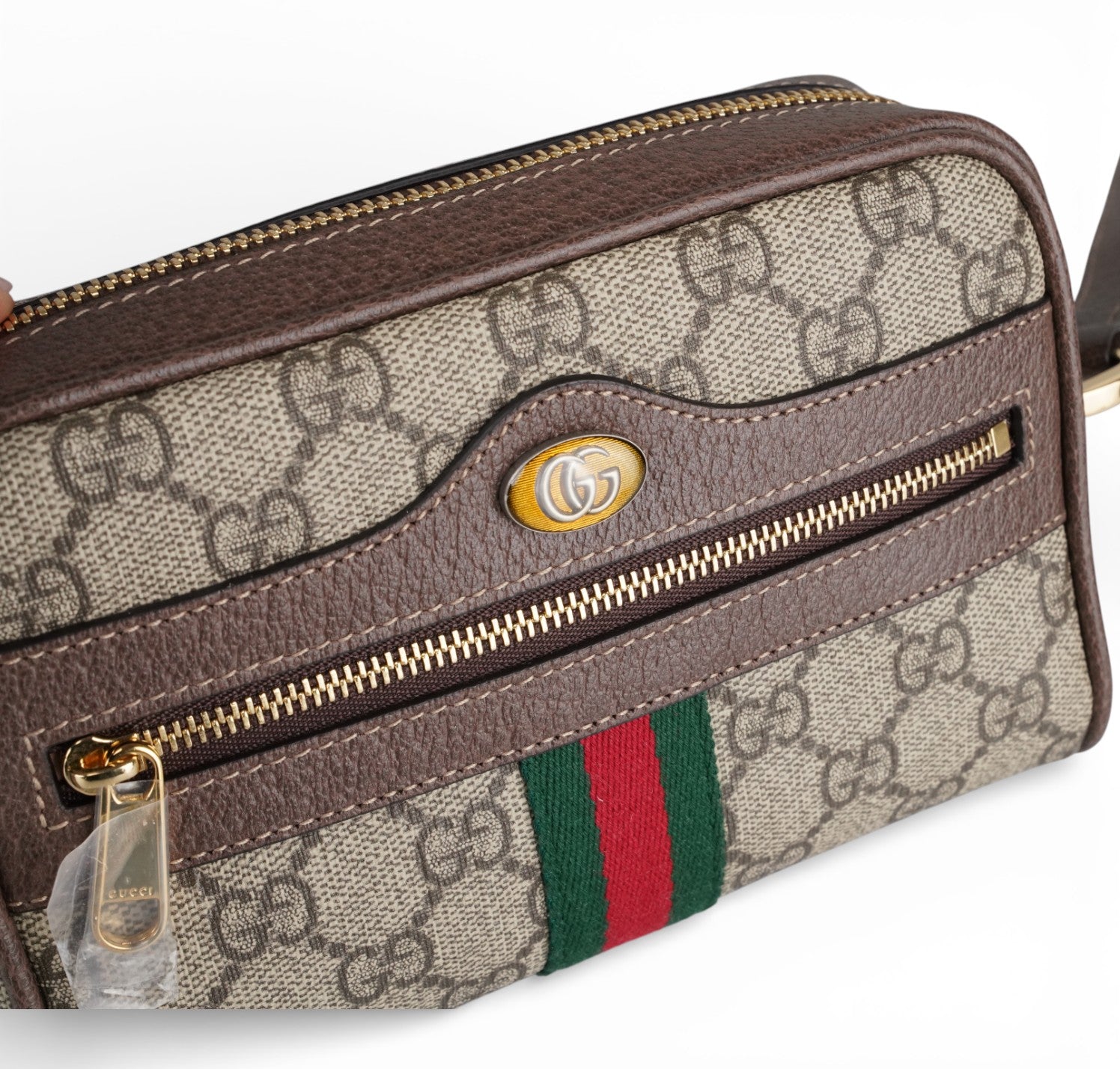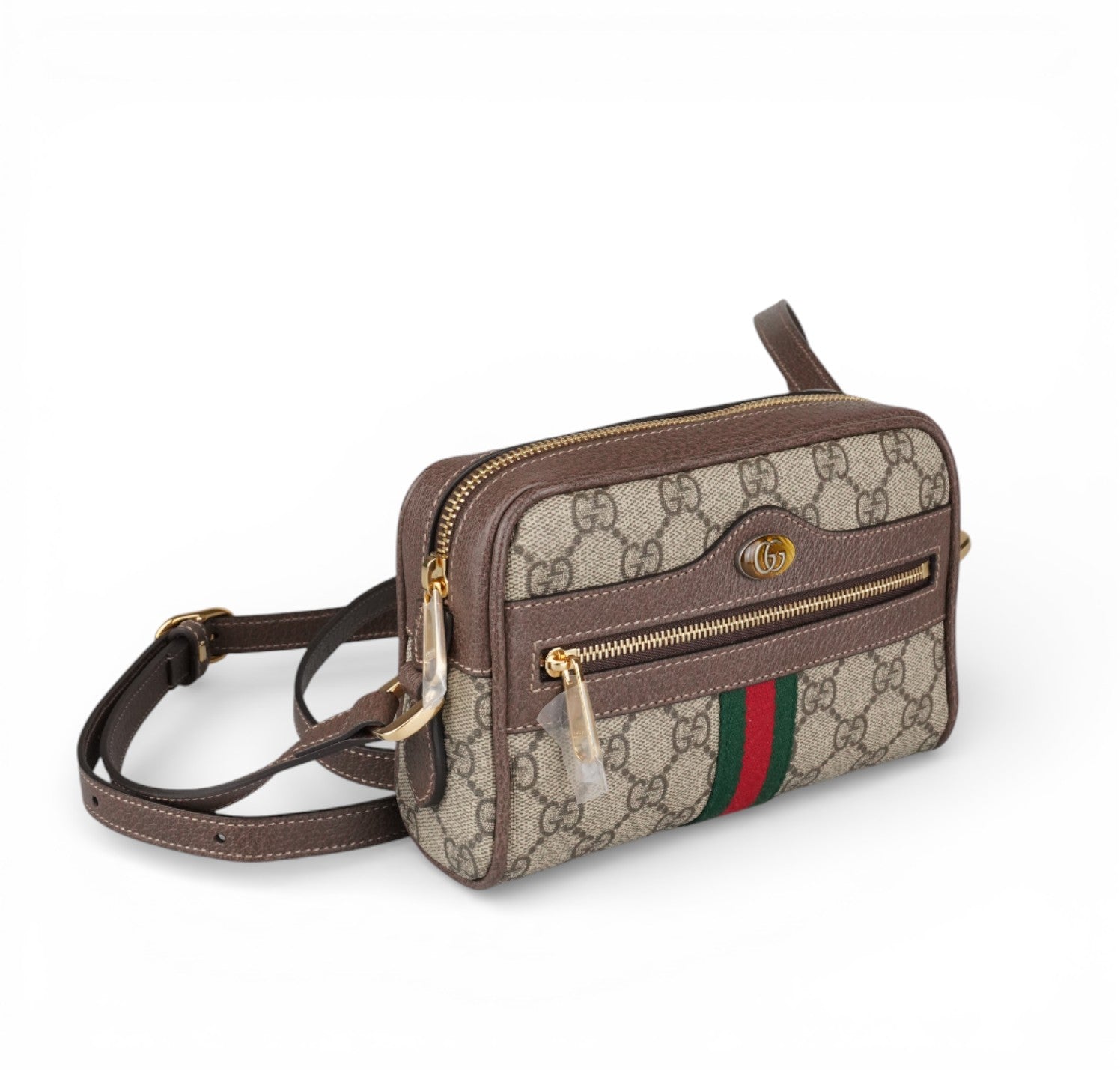 Borsa Gucci, modello Ophidia, misura mini, realizzata in tela GG Supreme beige/ebano con finiture in pelle marrone e iconico nastro Web verde e rosso posizionato centralmente nella parte inferiore e logo Doppia G ovale. Pratica tasca frontale con cerniera. Dotata di tracolla regolabile in pelle per una portabilità a spalla o crossbody. Chiusura superiore con zip. L'interno è foderato in microfibra effetto scamosciato color beige con piccola tasca e gancio portachiavi/multifunzione interno. Pari al nuovo, mai indossata. Potrebbero essere presenti minimi segni di stoccaggio.