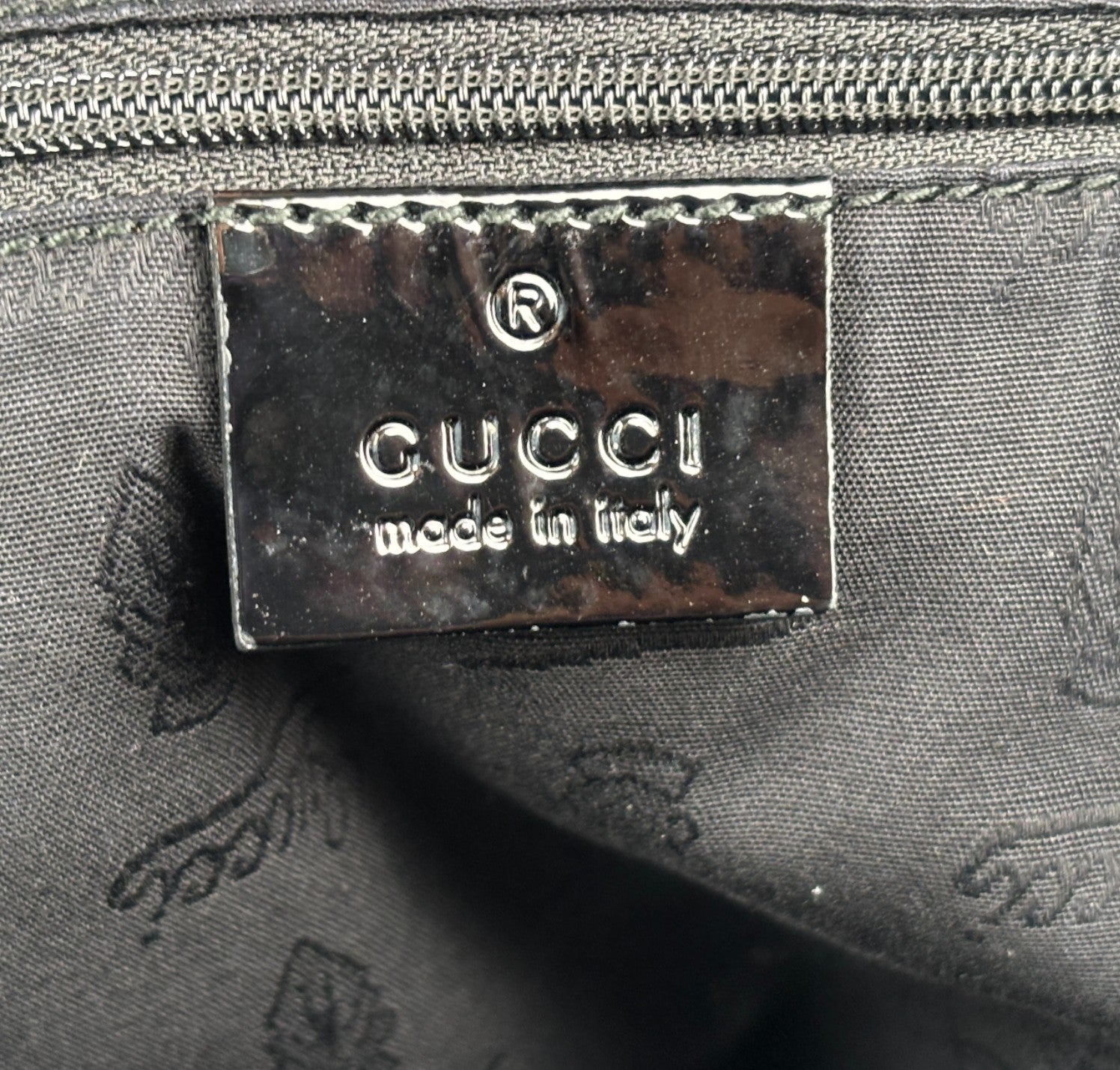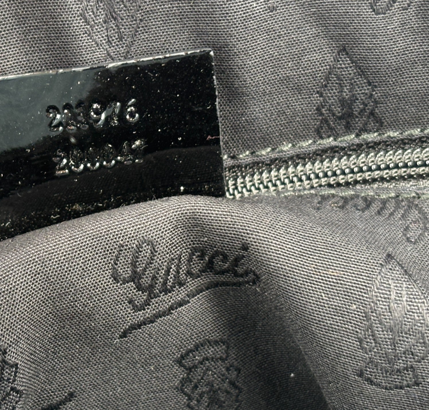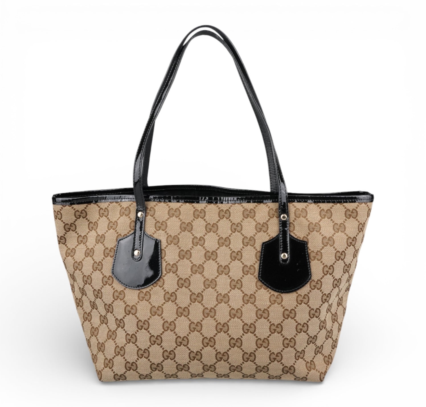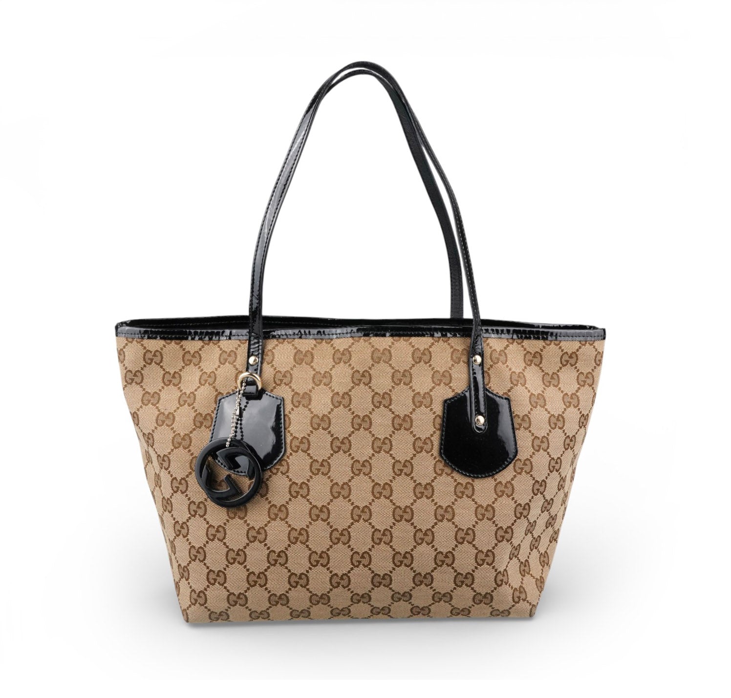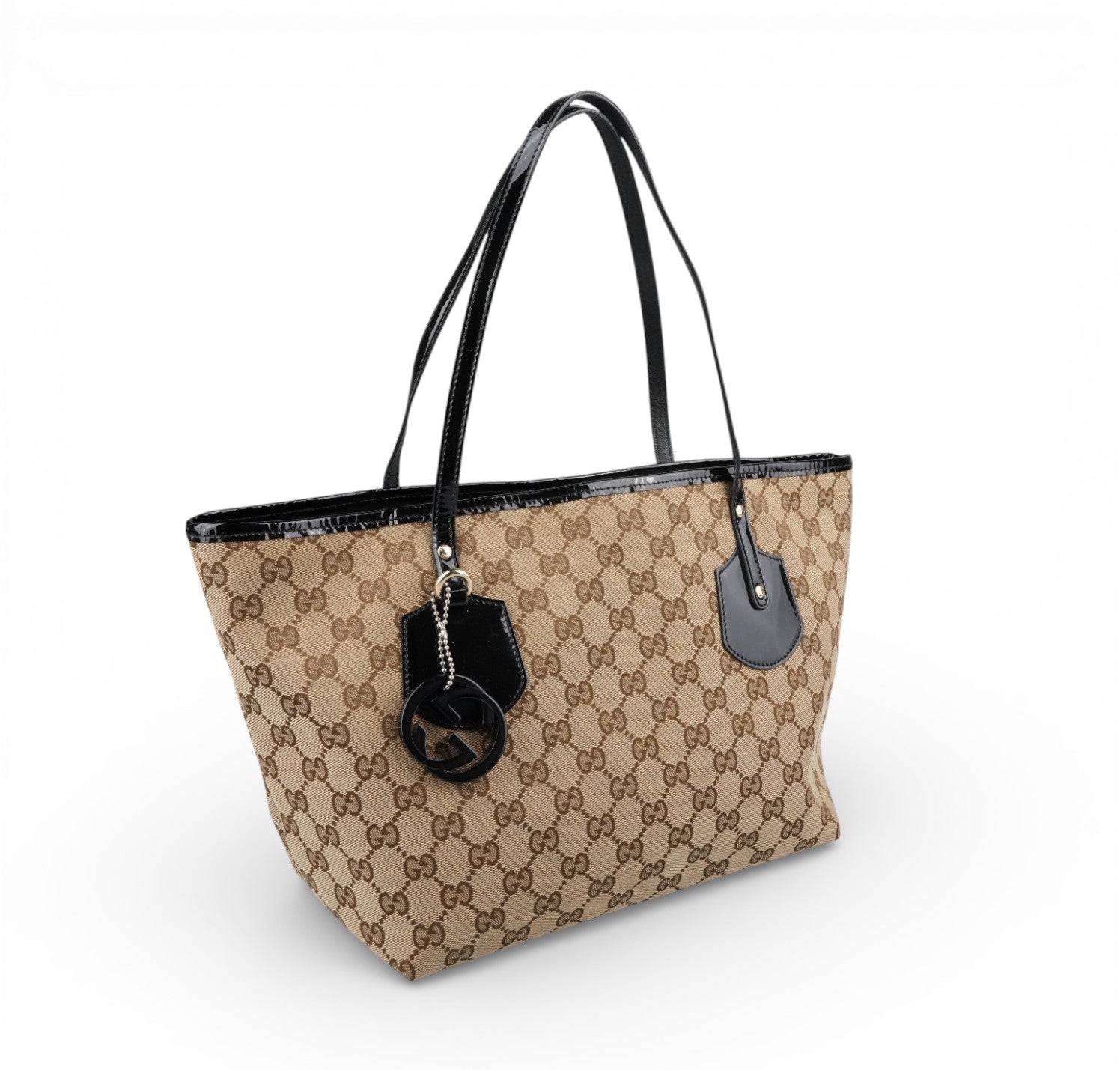 Borsa Gucci, modello GG Interlocking Charm, realizzata in Tela Beige GG Monogram, finiture in vernice nera. Finiture metalliche in oro. Munita di ampi manici superiori per il trasporto a spalla. Interno foderato in tessuto logato, tasca con zip. Arricchita da Charm Logo Interlocking, amovibile. Lievi segni del tempo generali, normali segni su pelle, tela e metalleria.