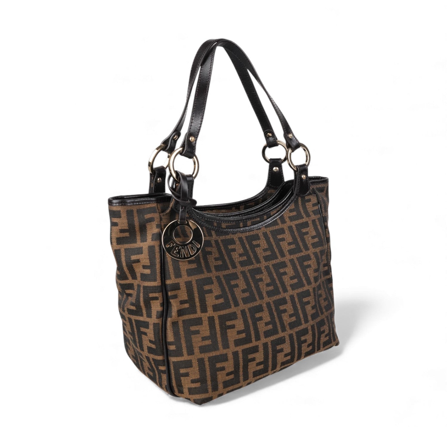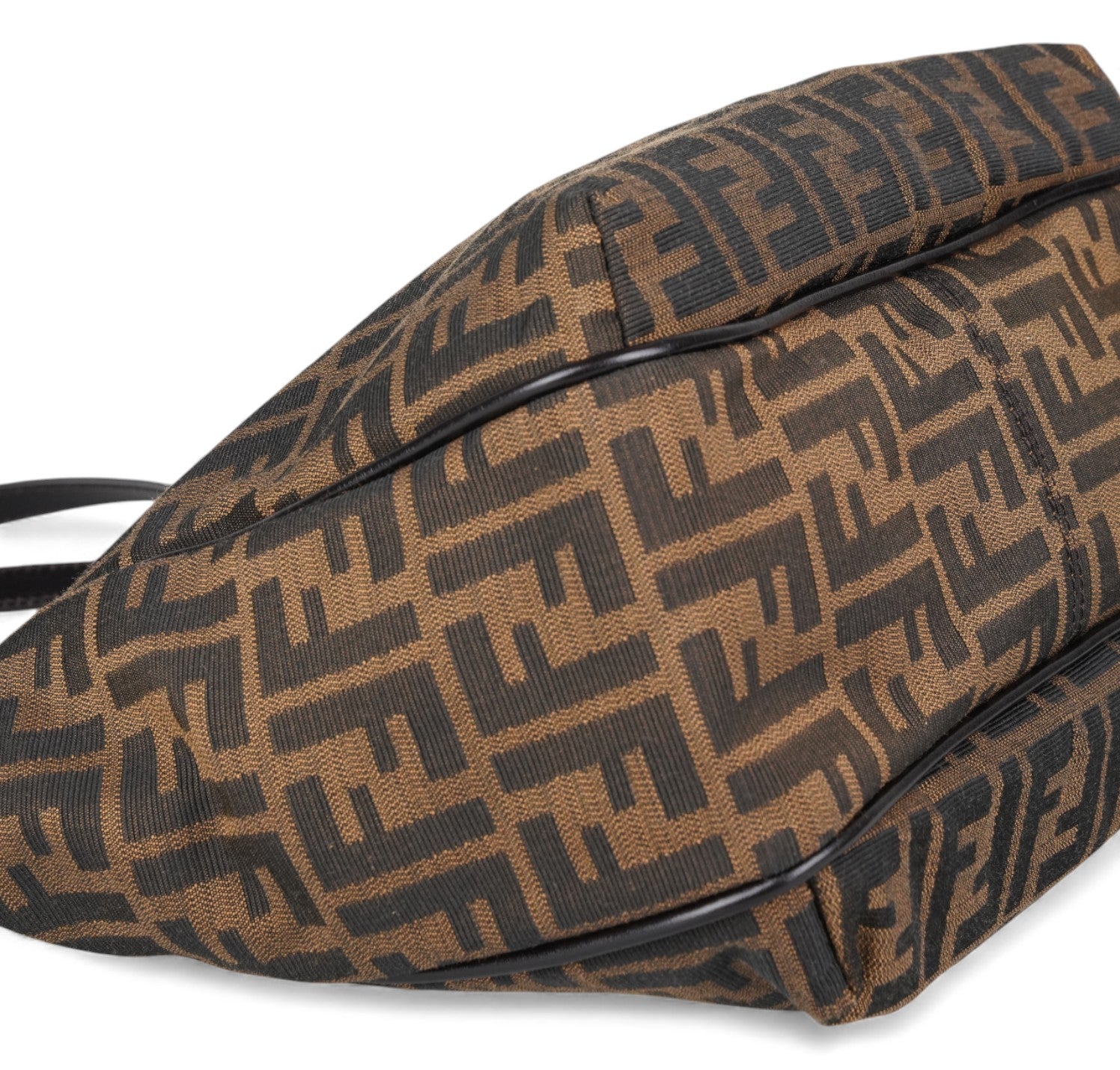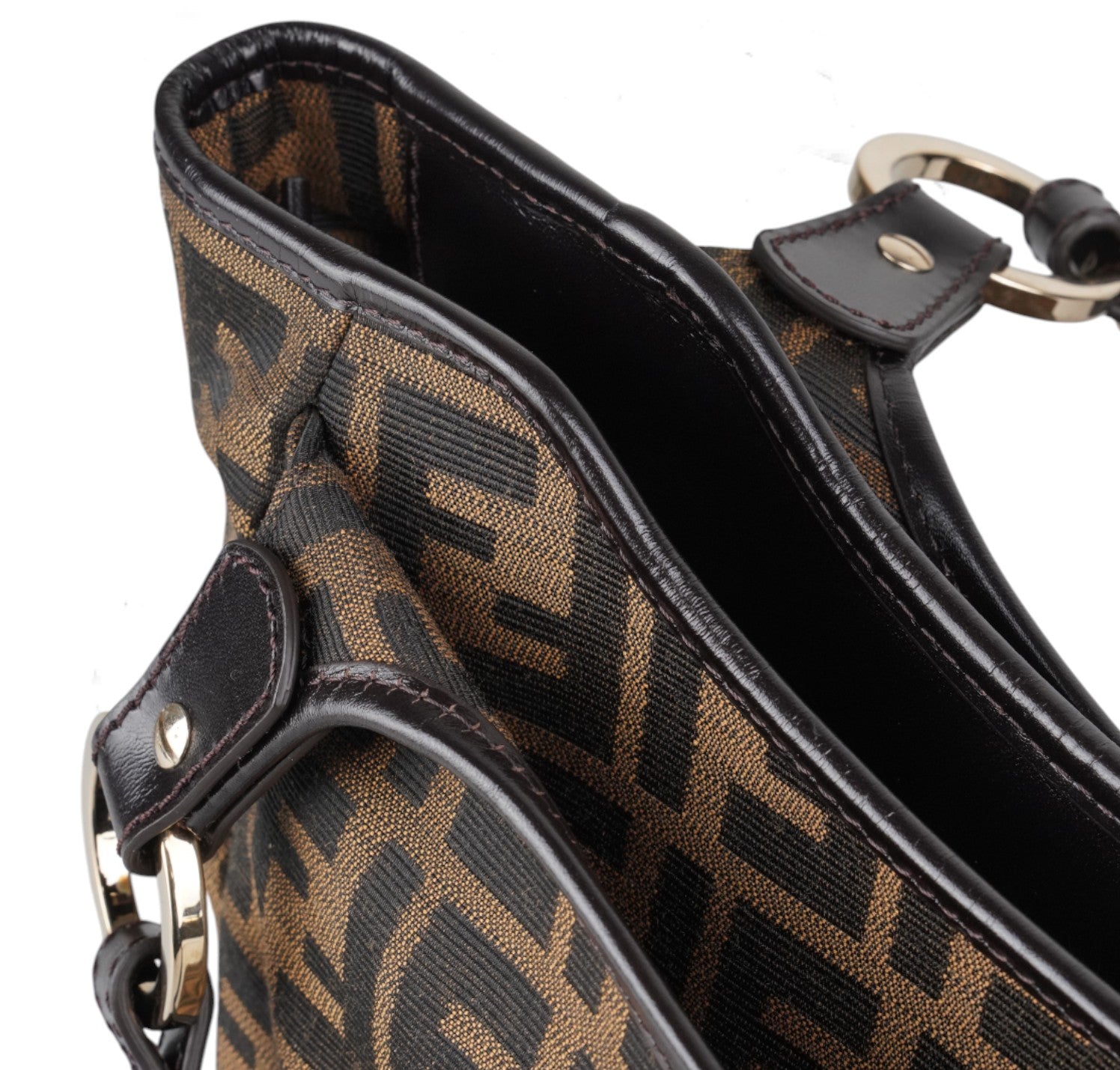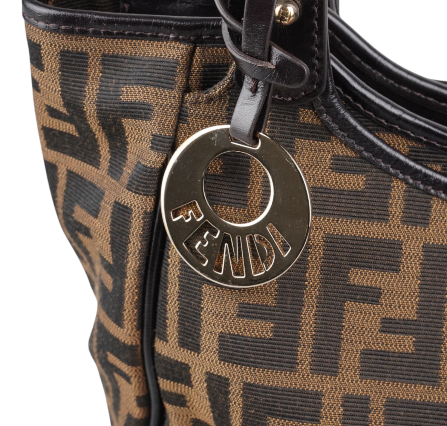 Fendi Chef bag made of Brown Zucca Canvas. Brown Leather finishing. Gold-colored hardware. Equipped with removable Fendi Charm. Interior lined in fabric in shades of ochre yellow, with contrasting logo and leather details, small applied pocket. Upper leather handles for carrying on the shoulder. Light general signs of aging on leather and metal parts.