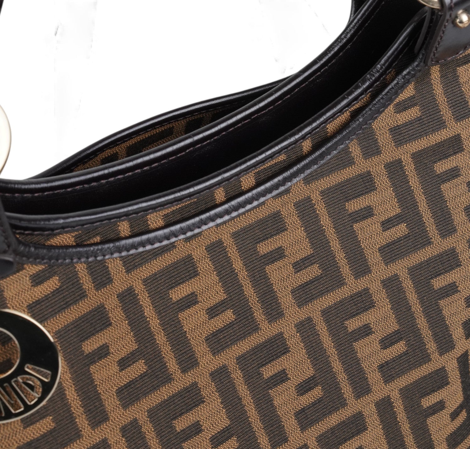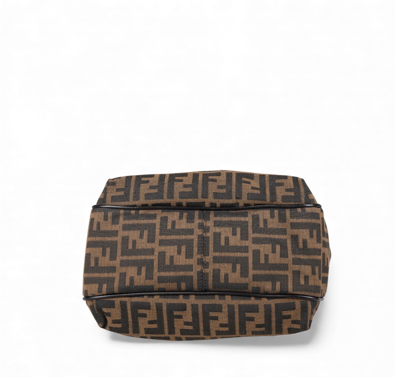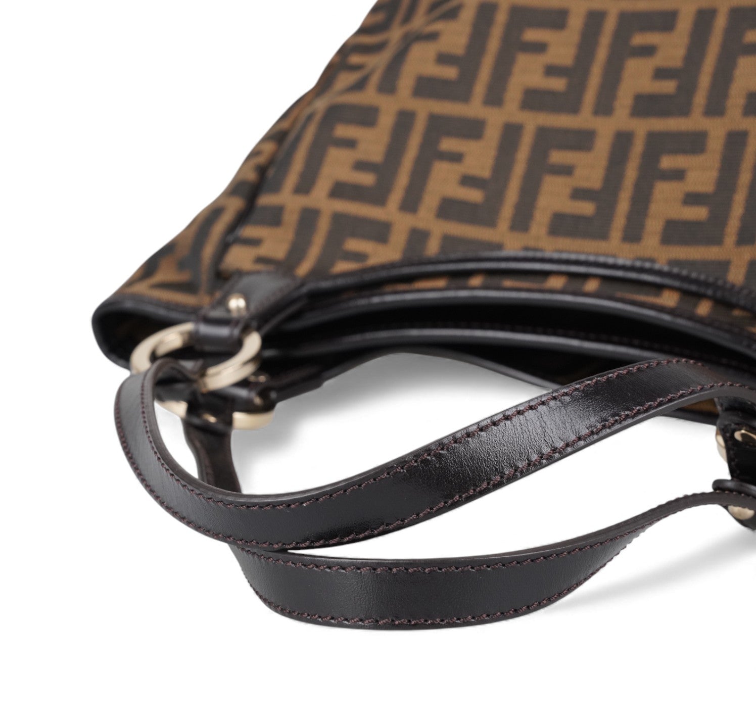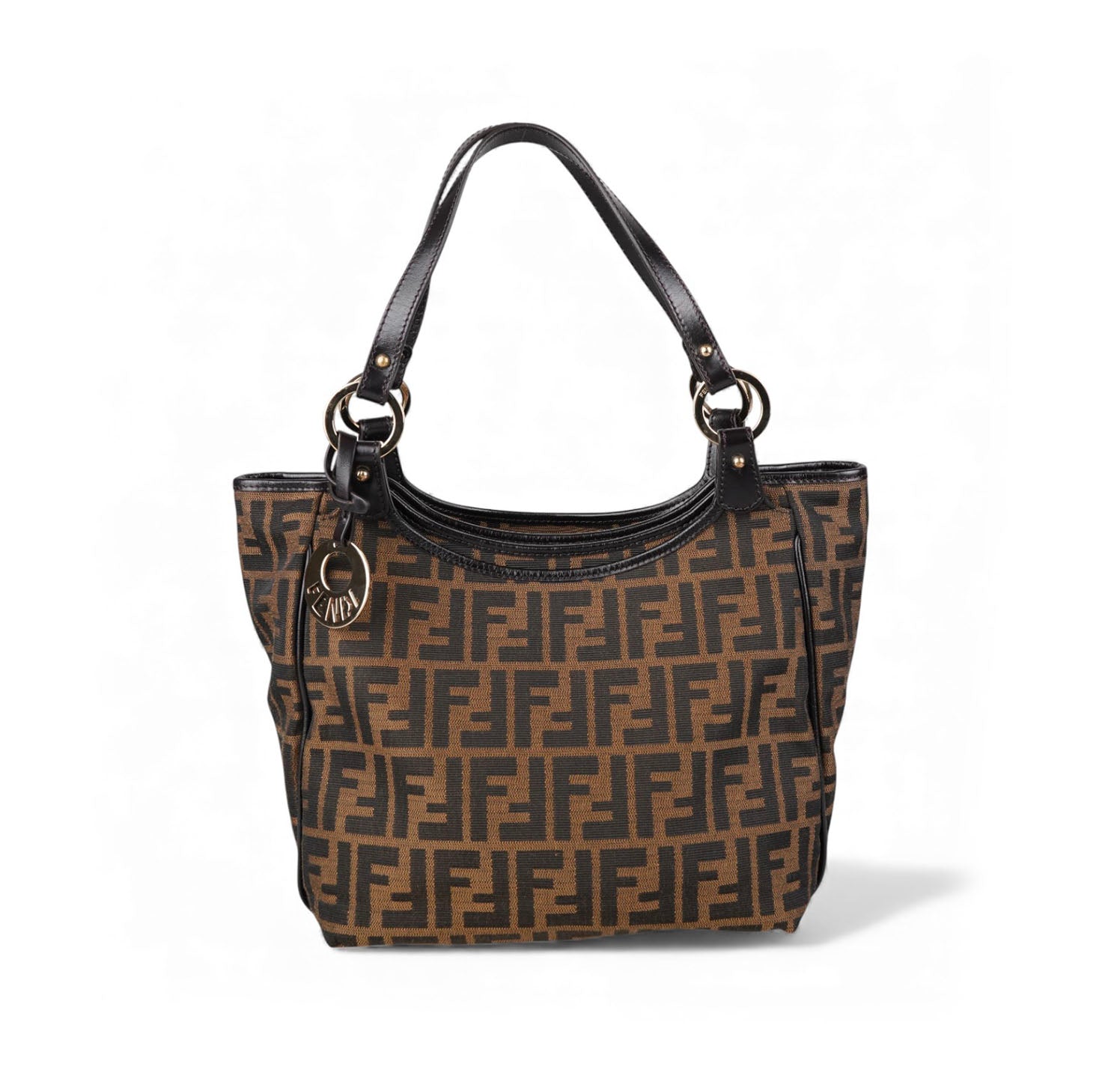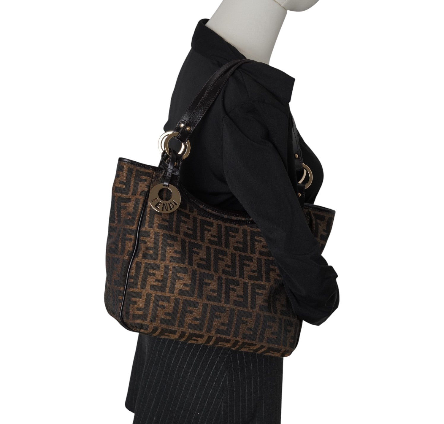 Fendi Chef bag made of Brown Zucca Canvas. Brown Leather finishing. Gold-colored hardware. Equipped with removable Fendi Charm. Interior lined in fabric in shades of ochre yellow, with contrasting logo and leather details, small applied pocket. Upper leather handles for carrying on the shoulder. Light general signs of aging on leather and metal parts.
