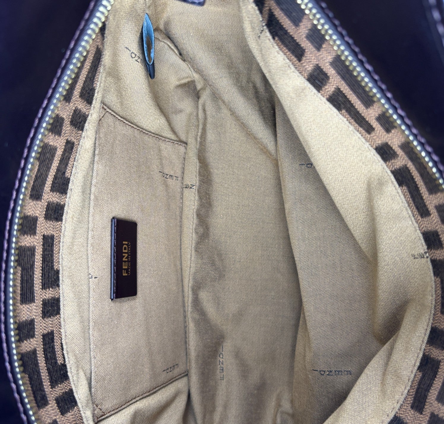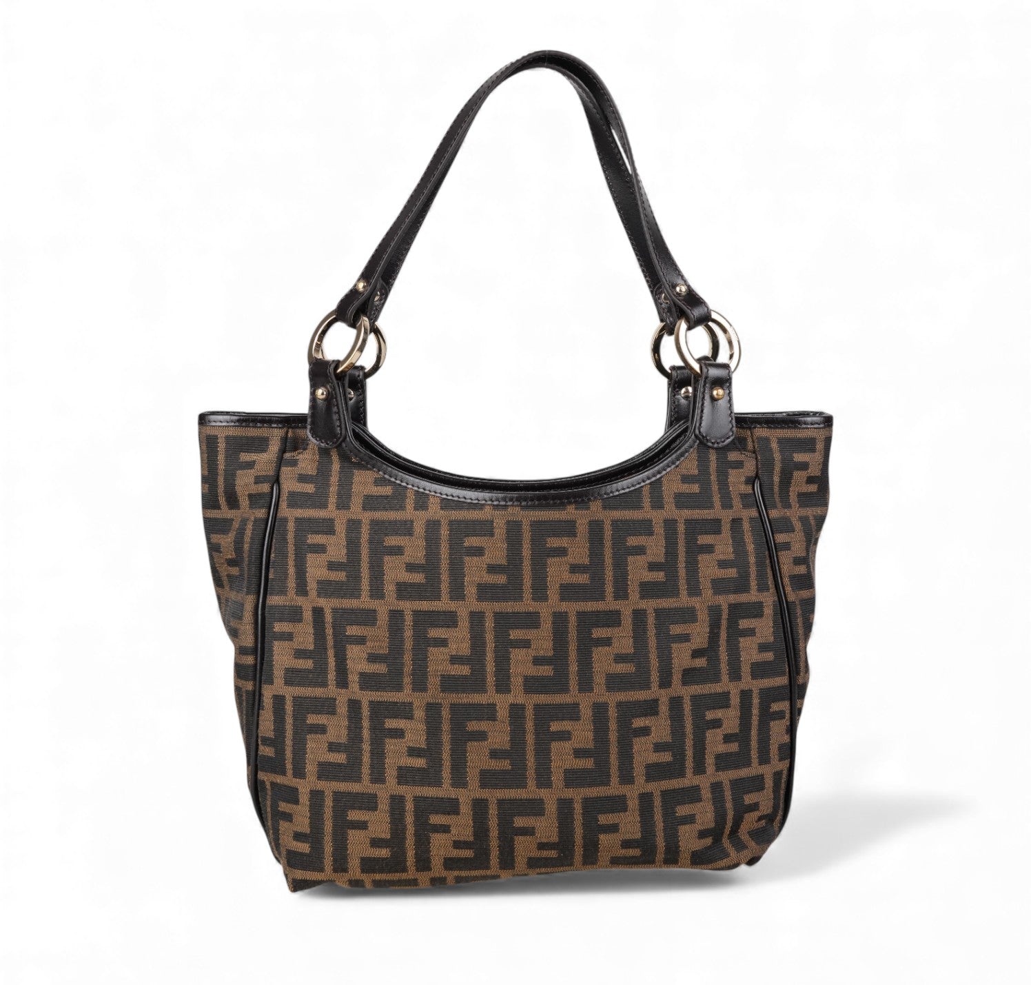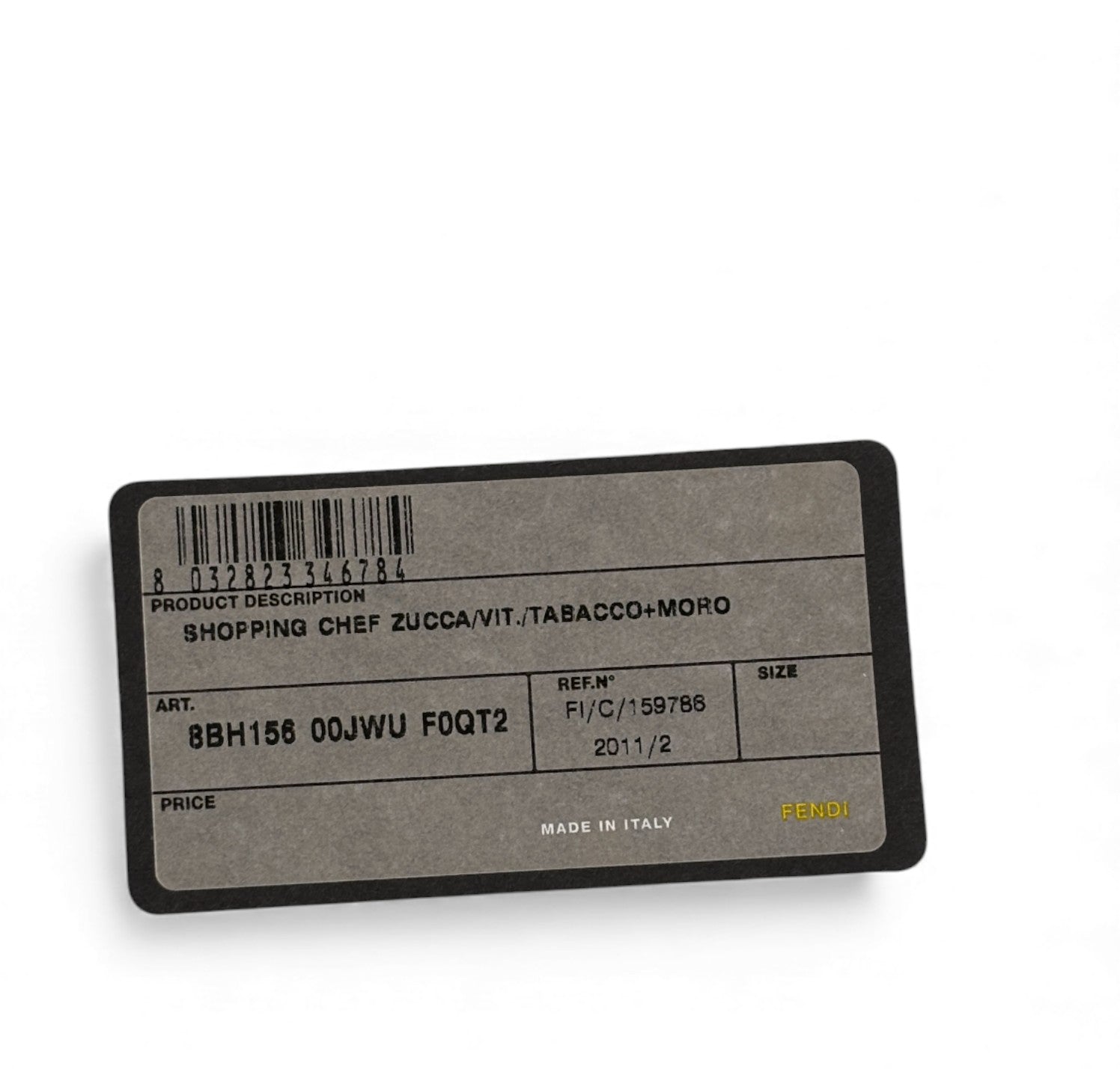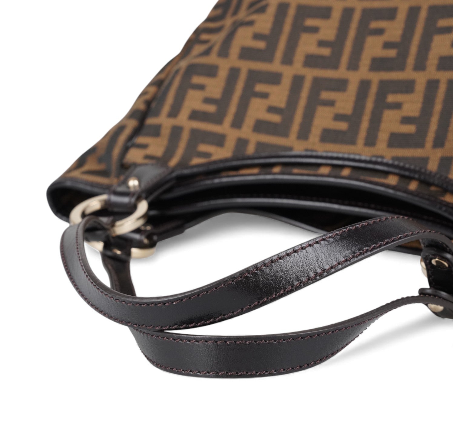 Fendi Chef bag made of Brown Zucca Canvas. Brown Leather finishing. Gold-colored hardware. Equipped with removable Fendi Charm. Interior lined in fabric in shades of ochre yellow, with contrasting logo and leather details, small applied pocket. Upper leather handles for carrying on the shoulder. Light general signs of aging on leather and metal parts.