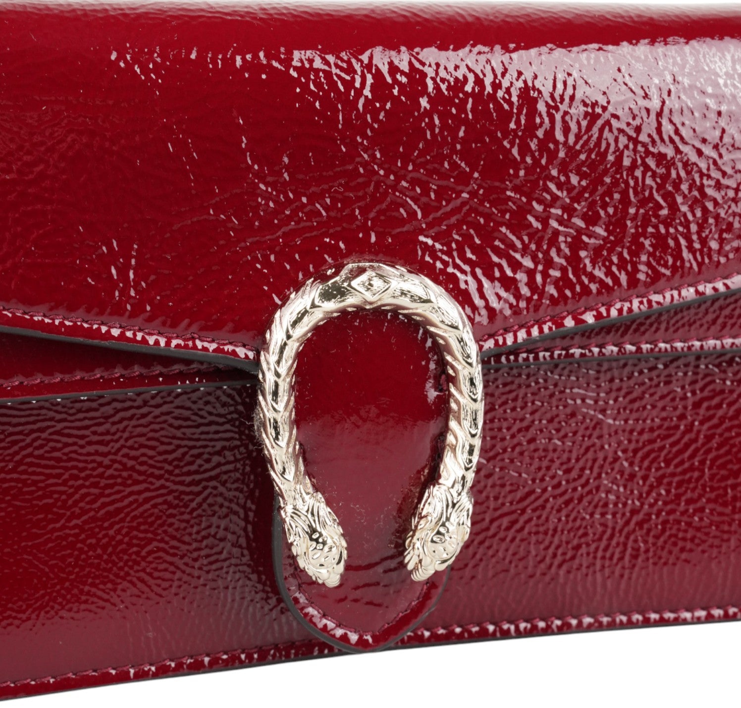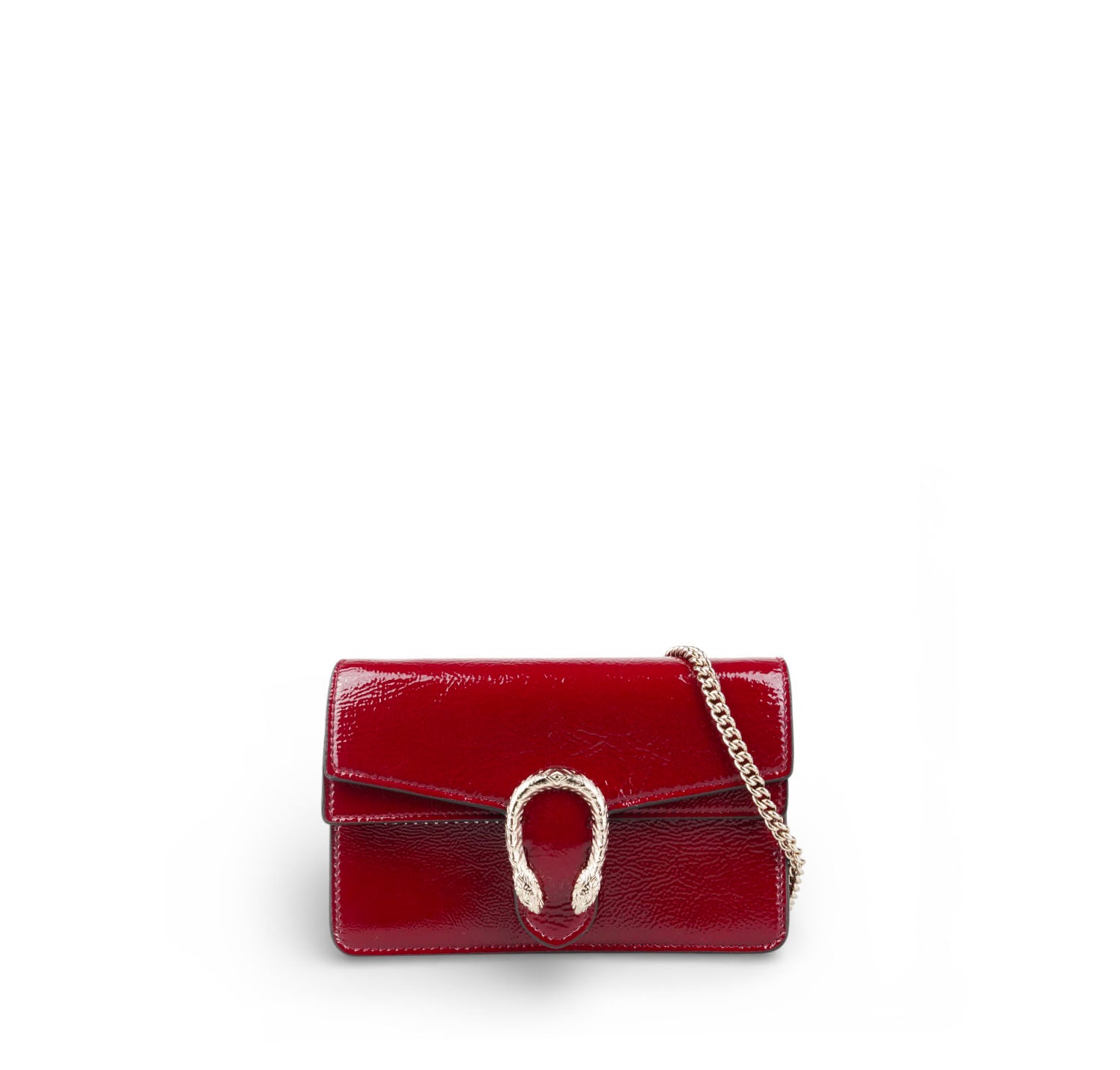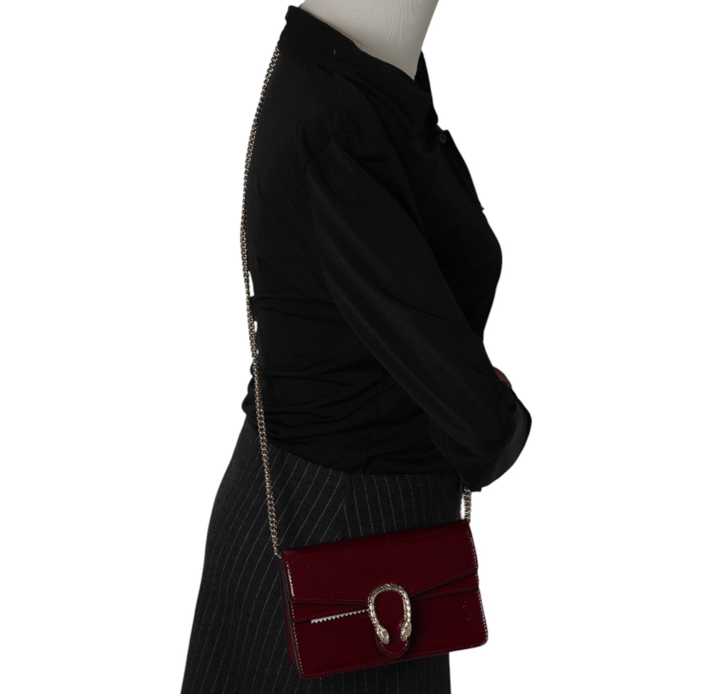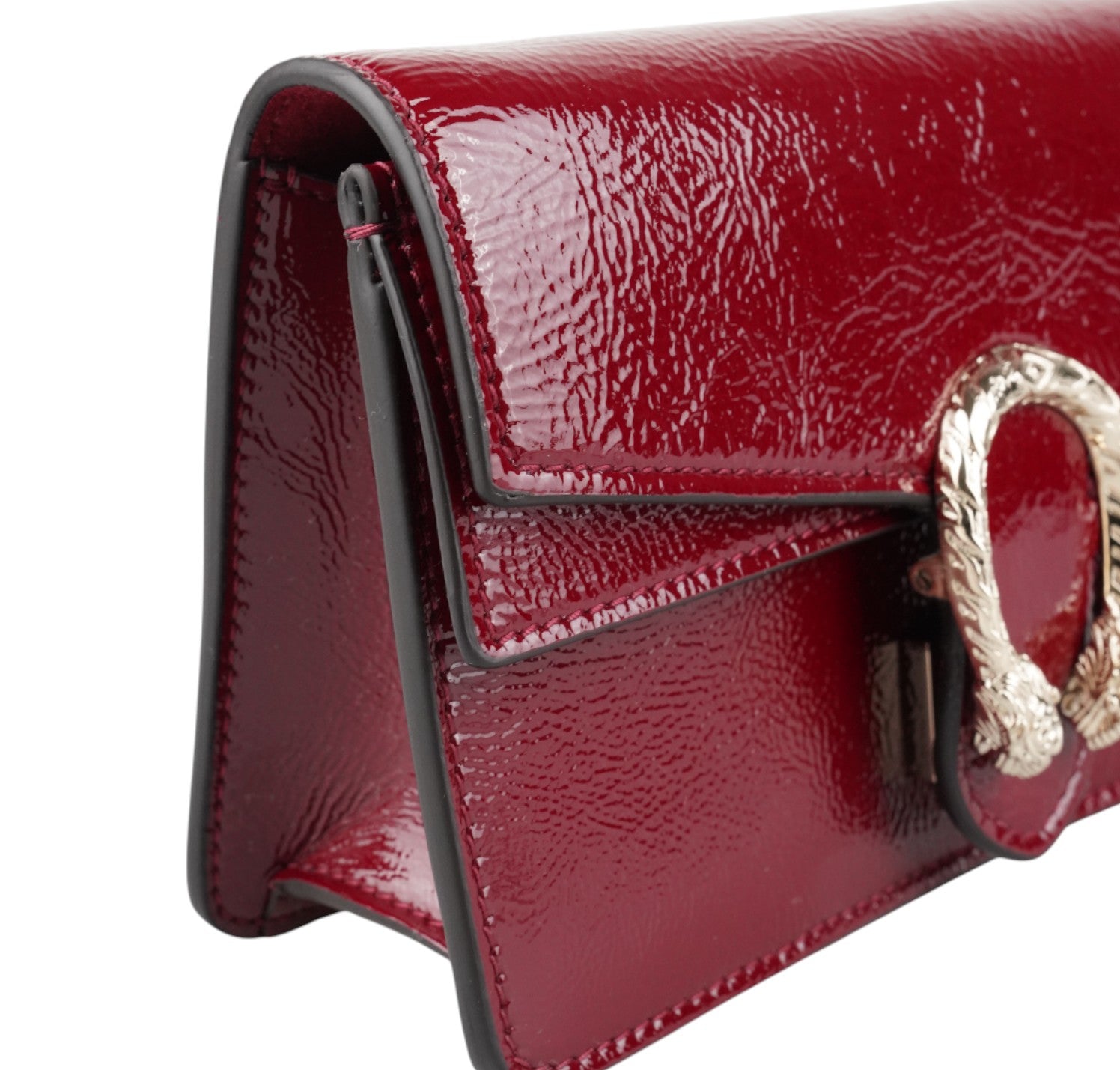 Borsa Gucci, modello Dionysus, misura Mini, realizzata in Pelle Bordeaux effetto lucido, con iconica chiusura ad incastro con testa di tigre in metallo color Champagne e catena per portarla a spalla o crossbody. Design compatto ma capiente, ideale sia per il giorno che per la sera. Interno foderato in tessuto scamosciato. Condizioni pari al nuovo. Potrebbe presentare minimi segni di stoccaggio.