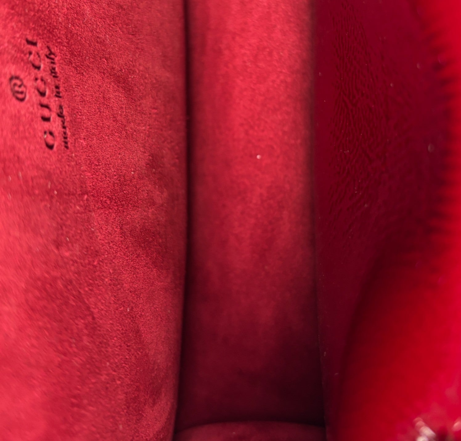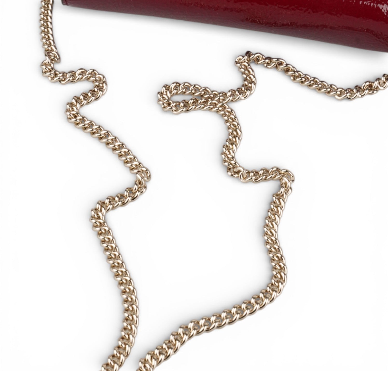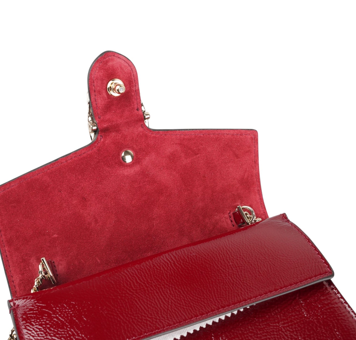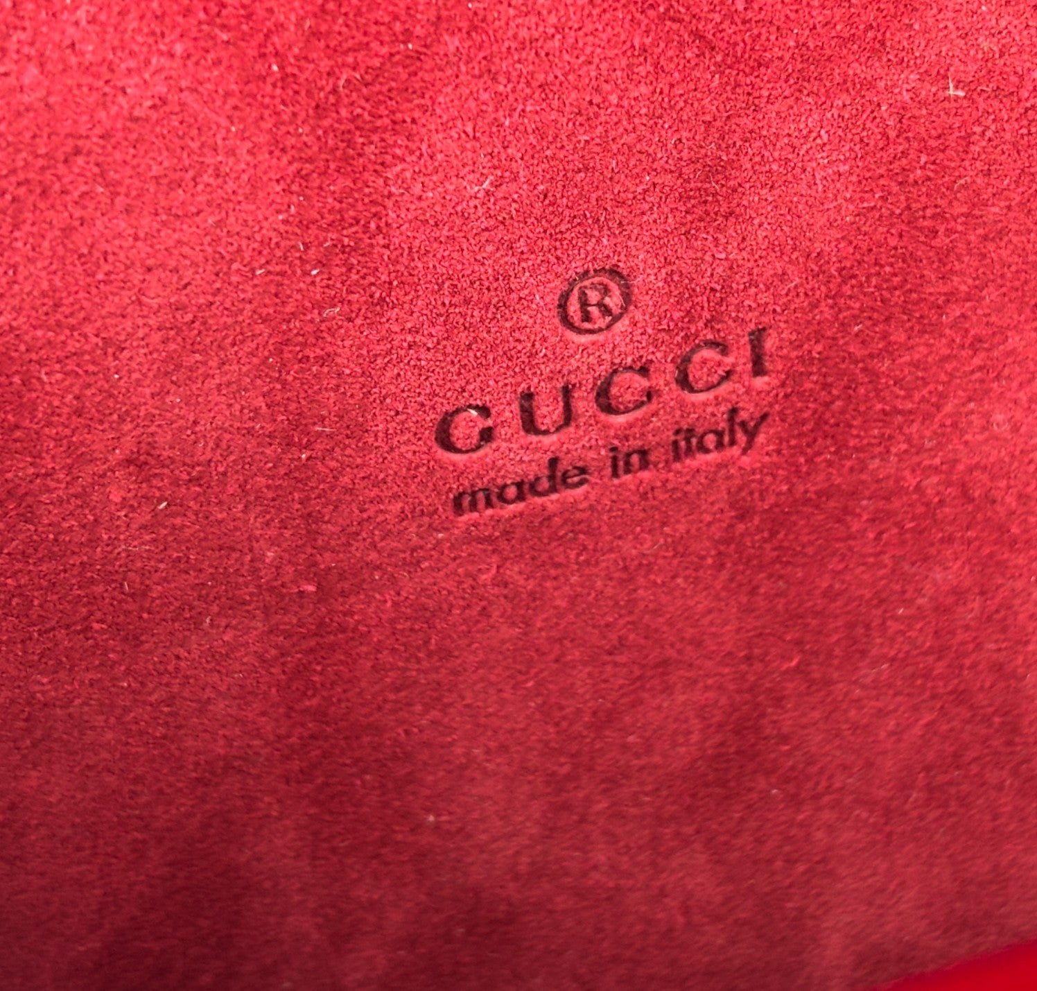 Borsa Gucci, modello Dionysus, misura Mini, realizzata in Pelle Bordeaux effetto lucido, con iconica chiusura ad incastro con testa di tigre in metallo color Champagne e catena per portarla a spalla o crossbody. Design compatto ma capiente, ideale sia per il giorno che per la sera. Interno foderato in tessuto scamosciato. Condizioni pari al nuovo. Potrebbe presentare minimi segni di stoccaggio.