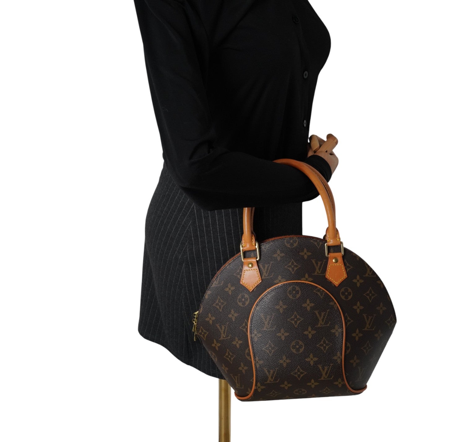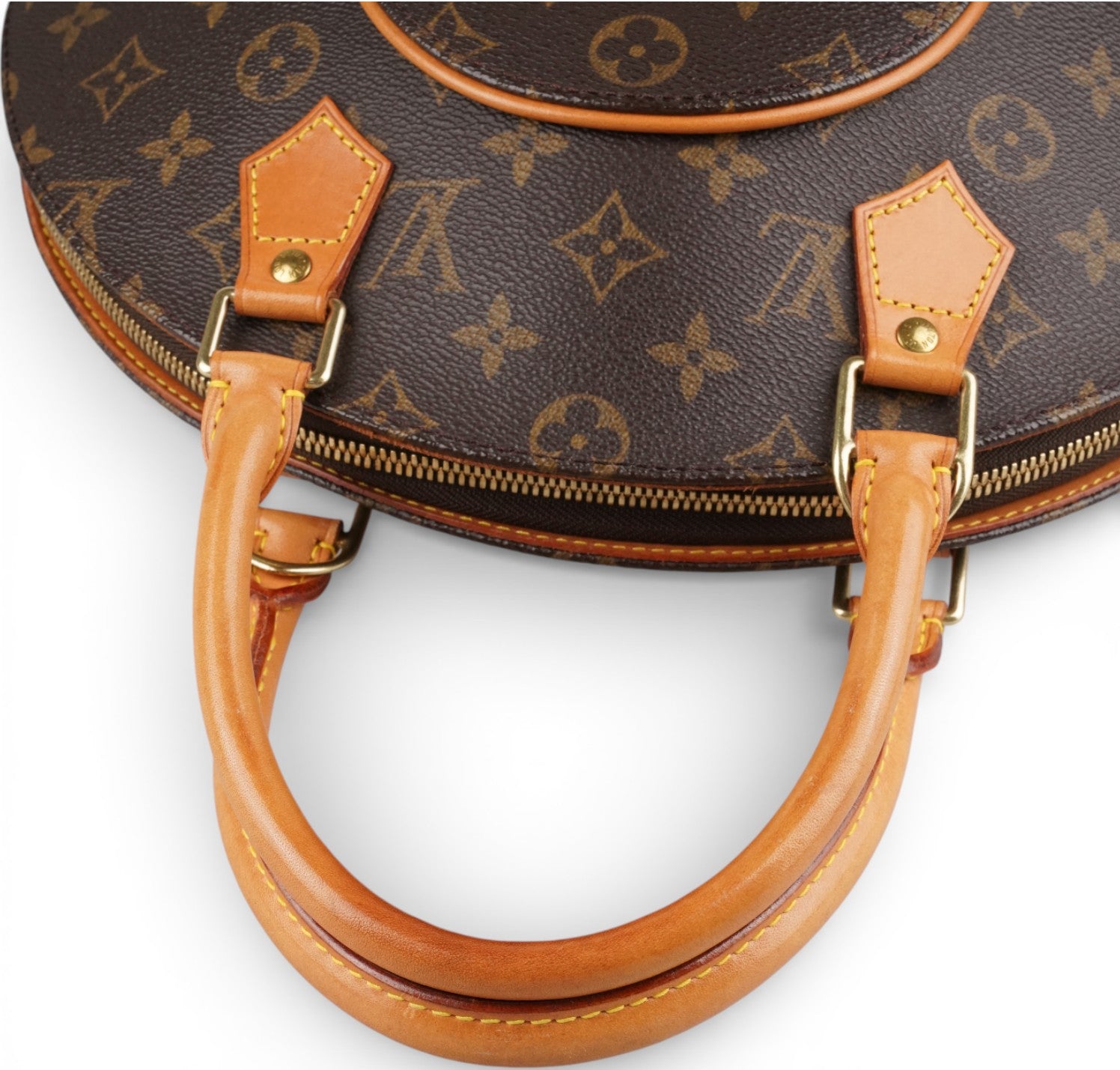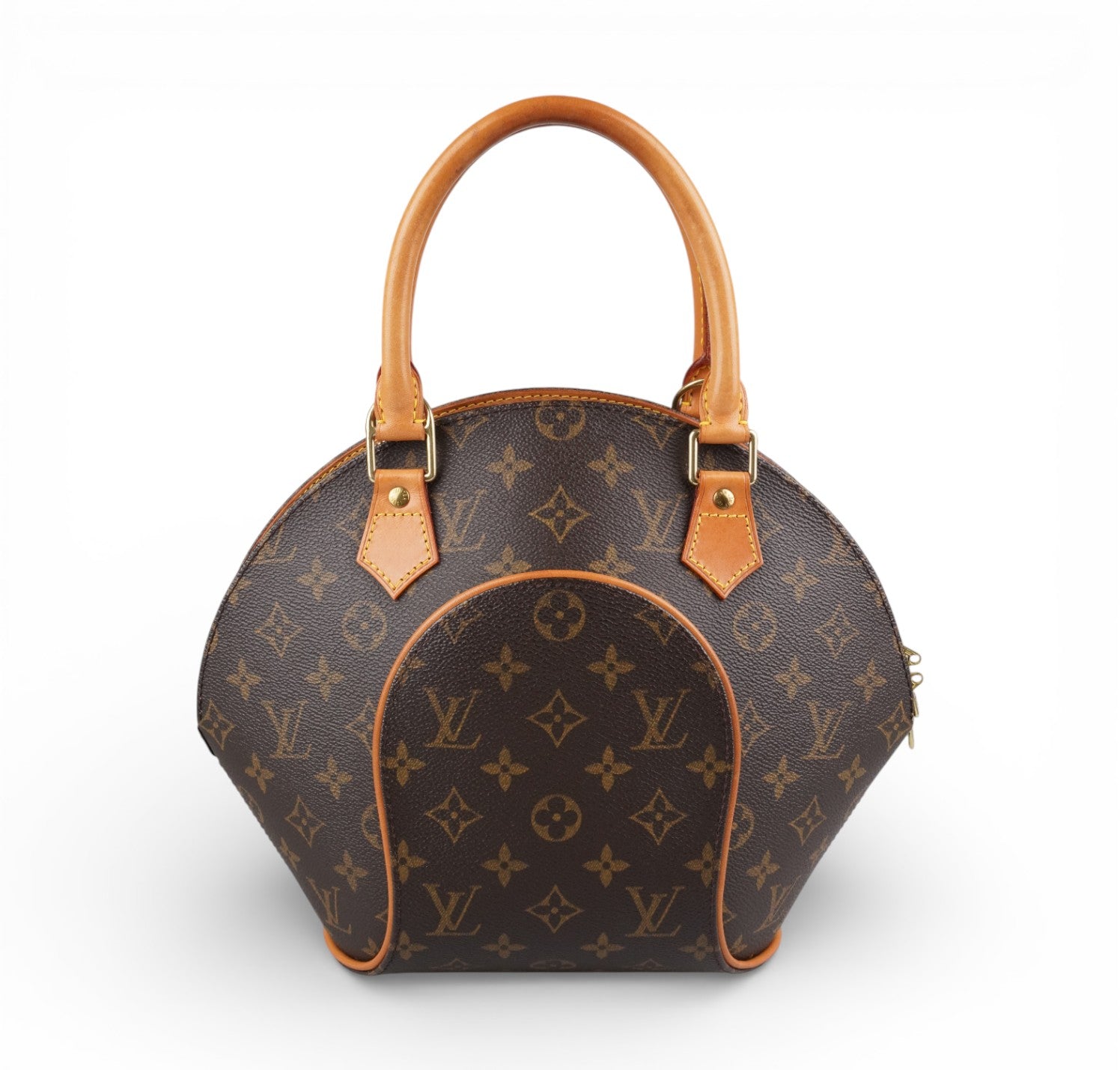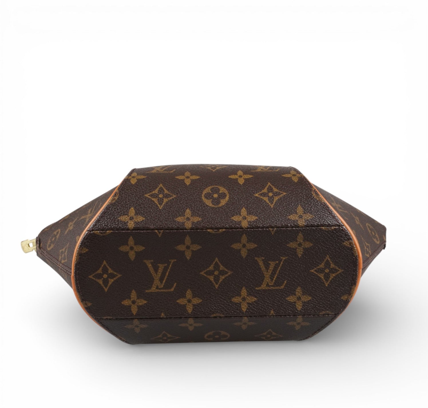 Louis Vuitton bag, Ellipse model, size PM, made in the iconic Monogram Canvas. Honey-colored natural cowhide trim. Gold-colored metal hardware. Brown fabric-lined interior, patch pocket. Double-slider zip top closure. Wide top handles for comfortable carrying. Distinctive silhouette, with narrow base and characteristic geometric folds. Light general signs of use and stains on cowhide. Normal signs of use on hardware.