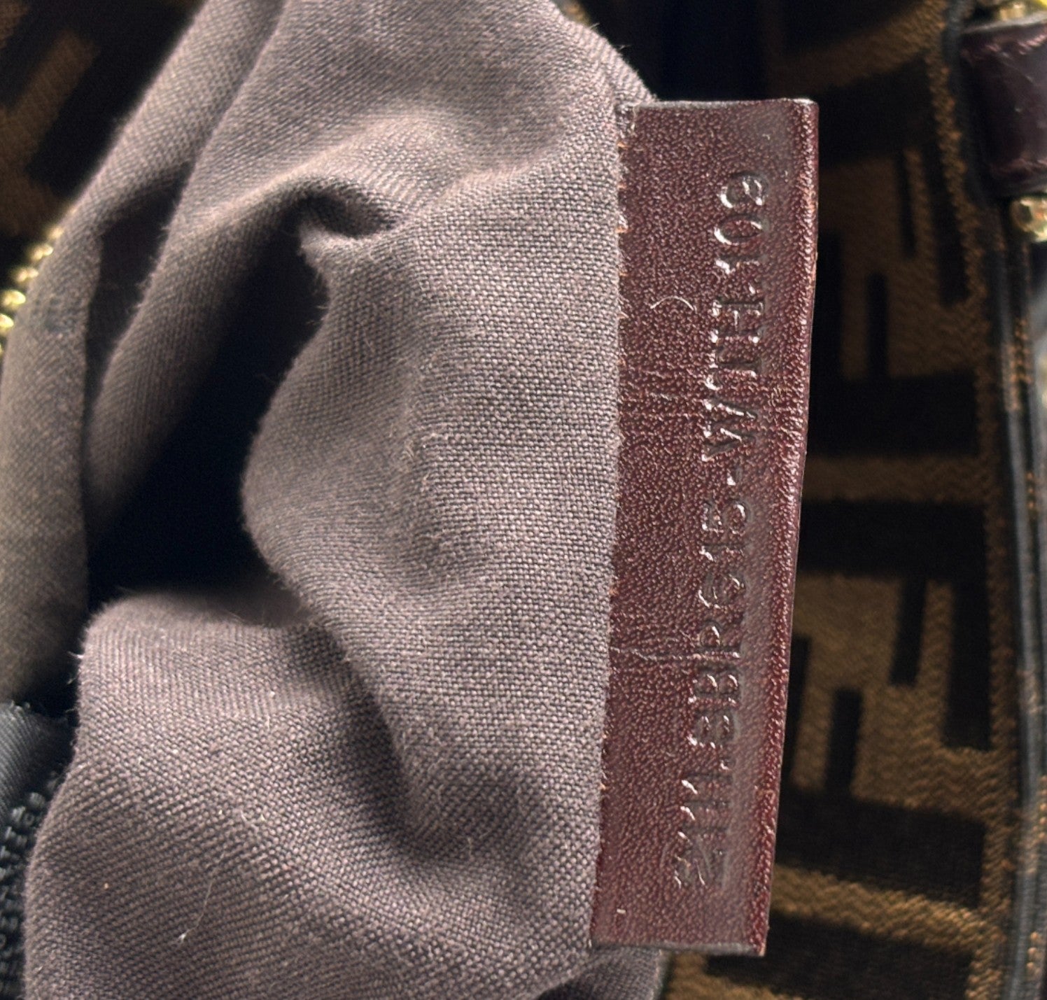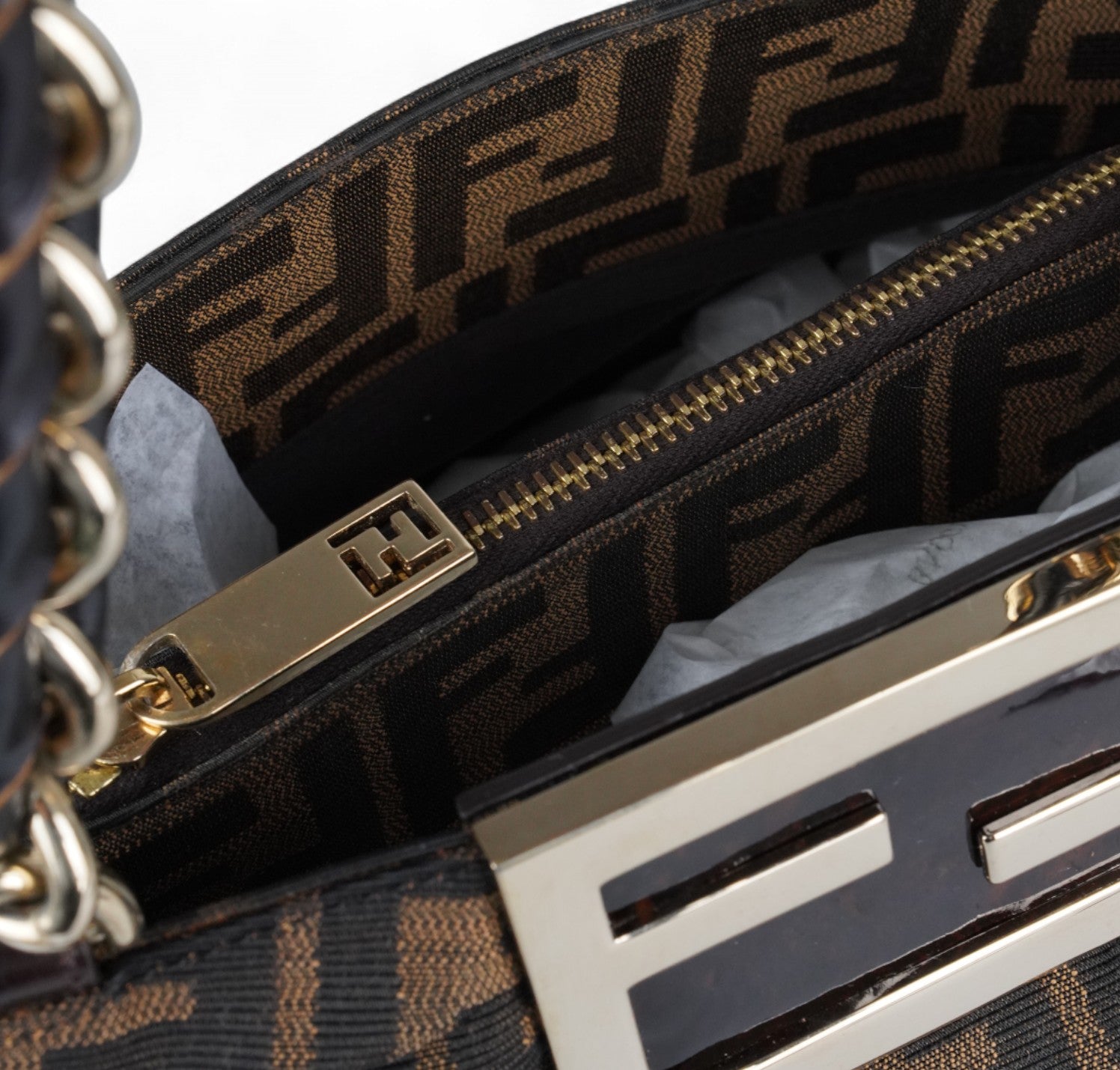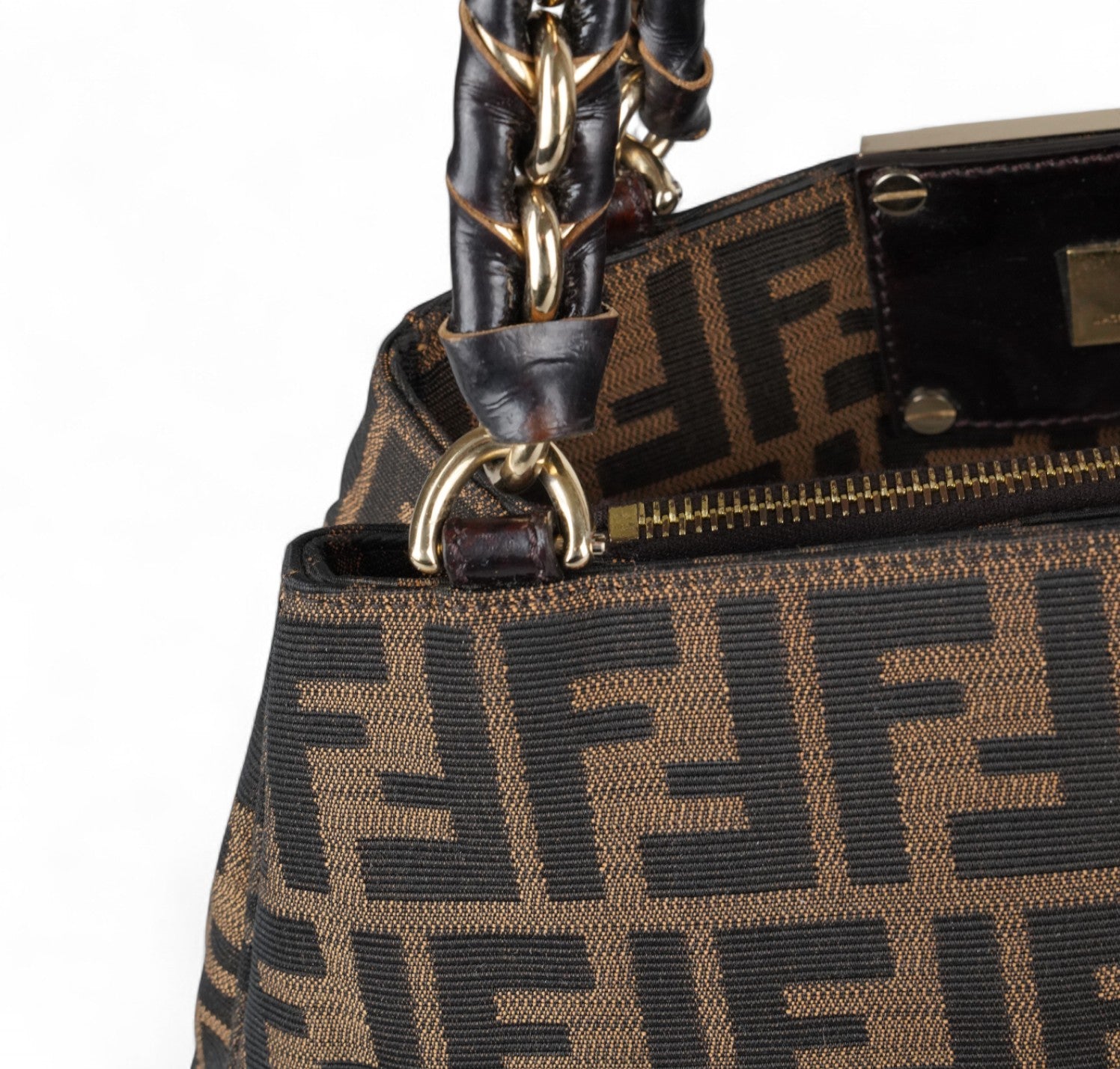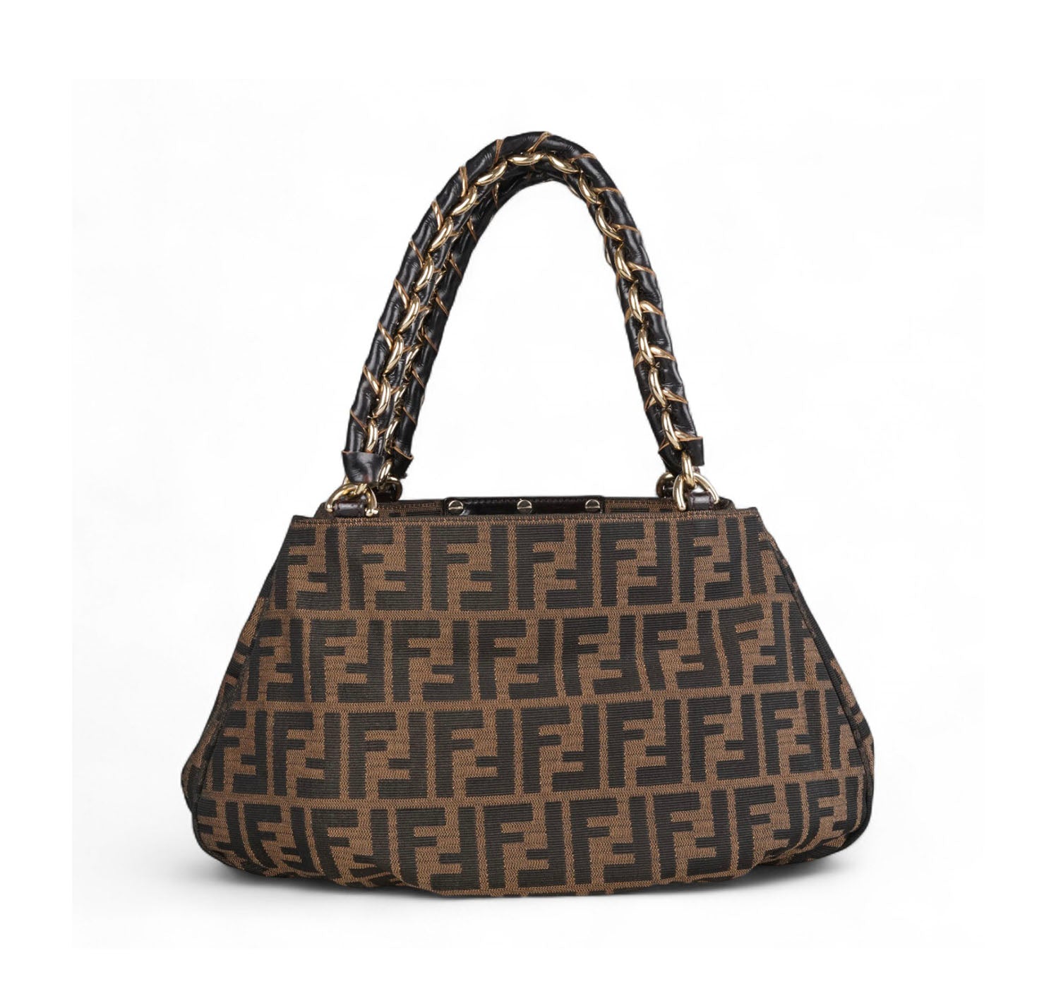 Borsa Fendi, modello Mia, realizzata in Tela Zucca Marrone. Finiture in Pelle Lucida Marrone. Parti metalliche color Oro. Munita di manici superiori in pelle e catena per l'utilizzo a spalla, mano o braccio. Interno foderato in Tessuto suddiviso in due scomparti da una tasca con cerniera. Impreziosita da Maxi Logo Metallico FF frontale. Presenti lievi e minimi segni del tempo come micro graffi su pelle e metalleria.