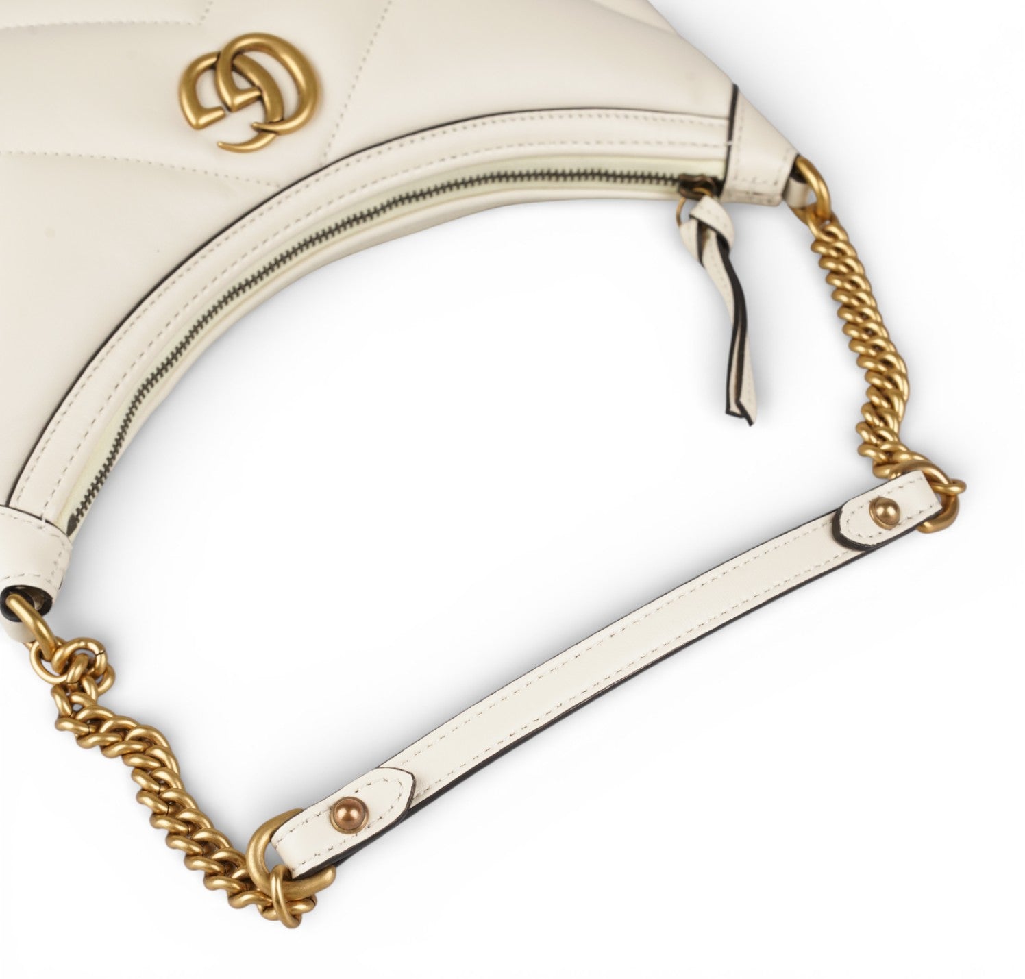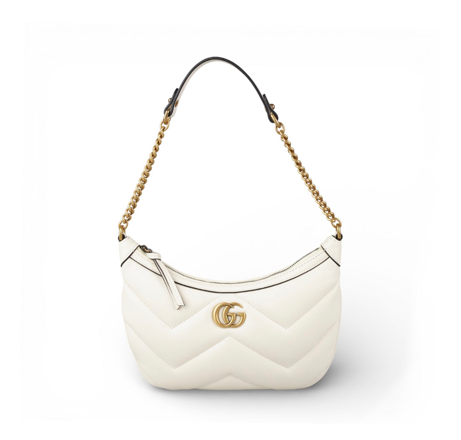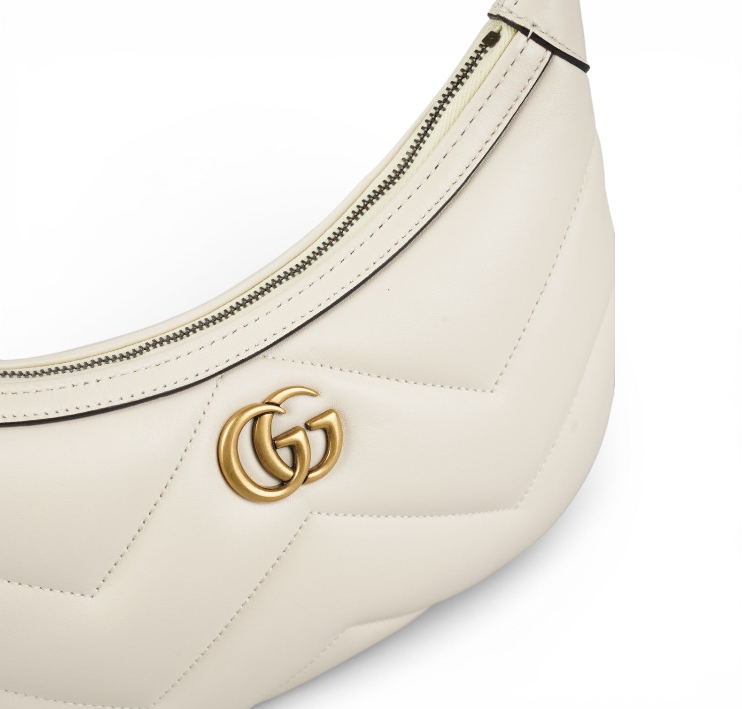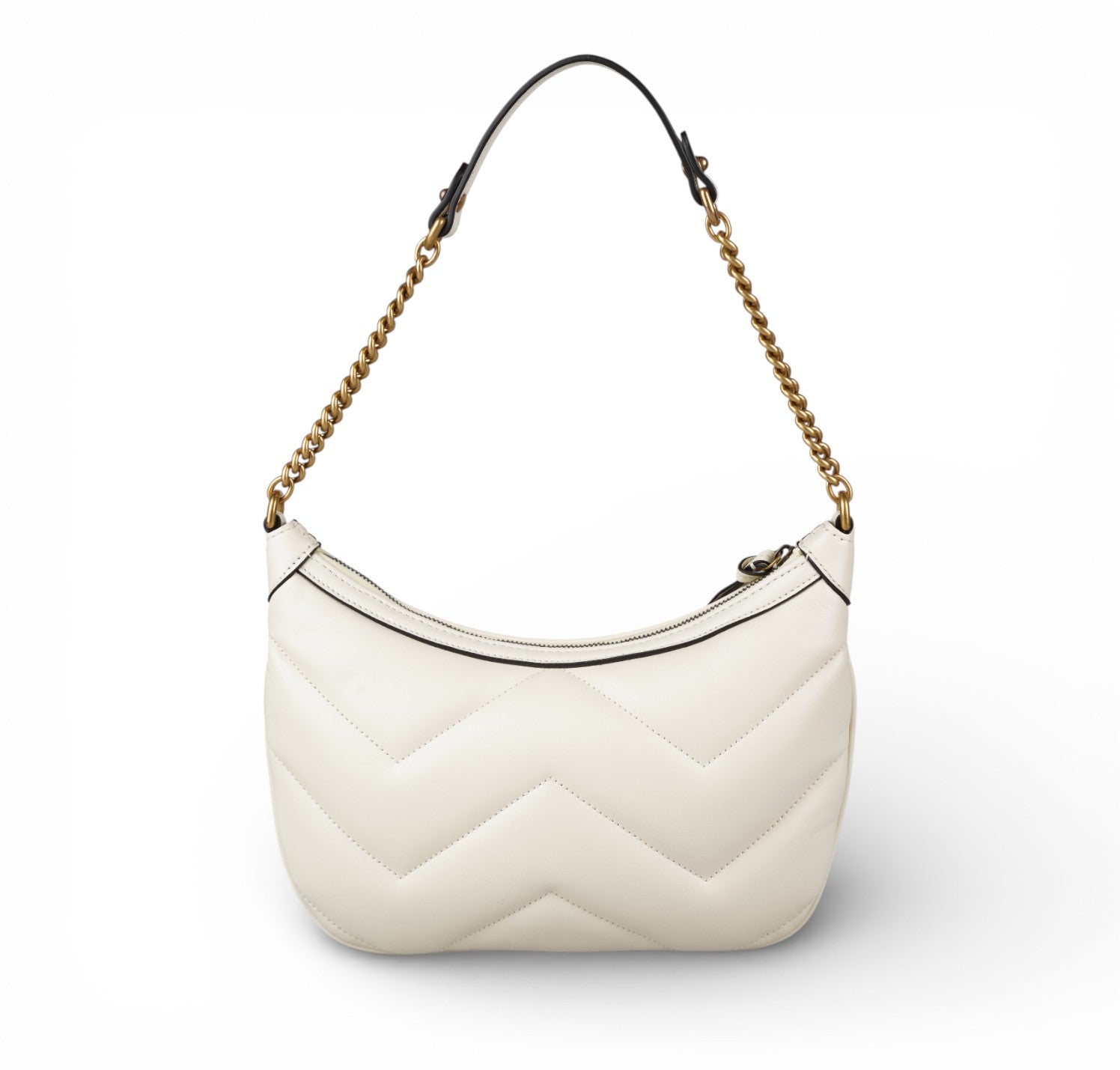 Borsa Gucci, modello GG Marmont Mini Hobo, realizzata pelle bianca con iconica lavorazione matelassé a chevron e logo GG frontale in metallo color oro. Dotata di chiusura con zip e interno in tessuto chiaro. Ideale per l’uso quotidiano ma perfetta anche per look più eleganti o serali. Manico superiore in catena con inserto in pelle, per un comfort maggiore. Pari al nuovo, potrebbe presentare micro segni di stoccaggio.