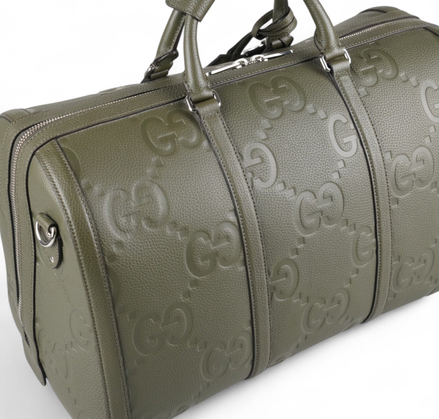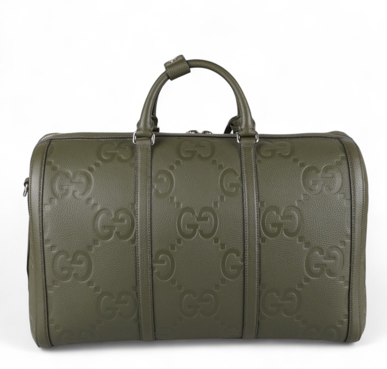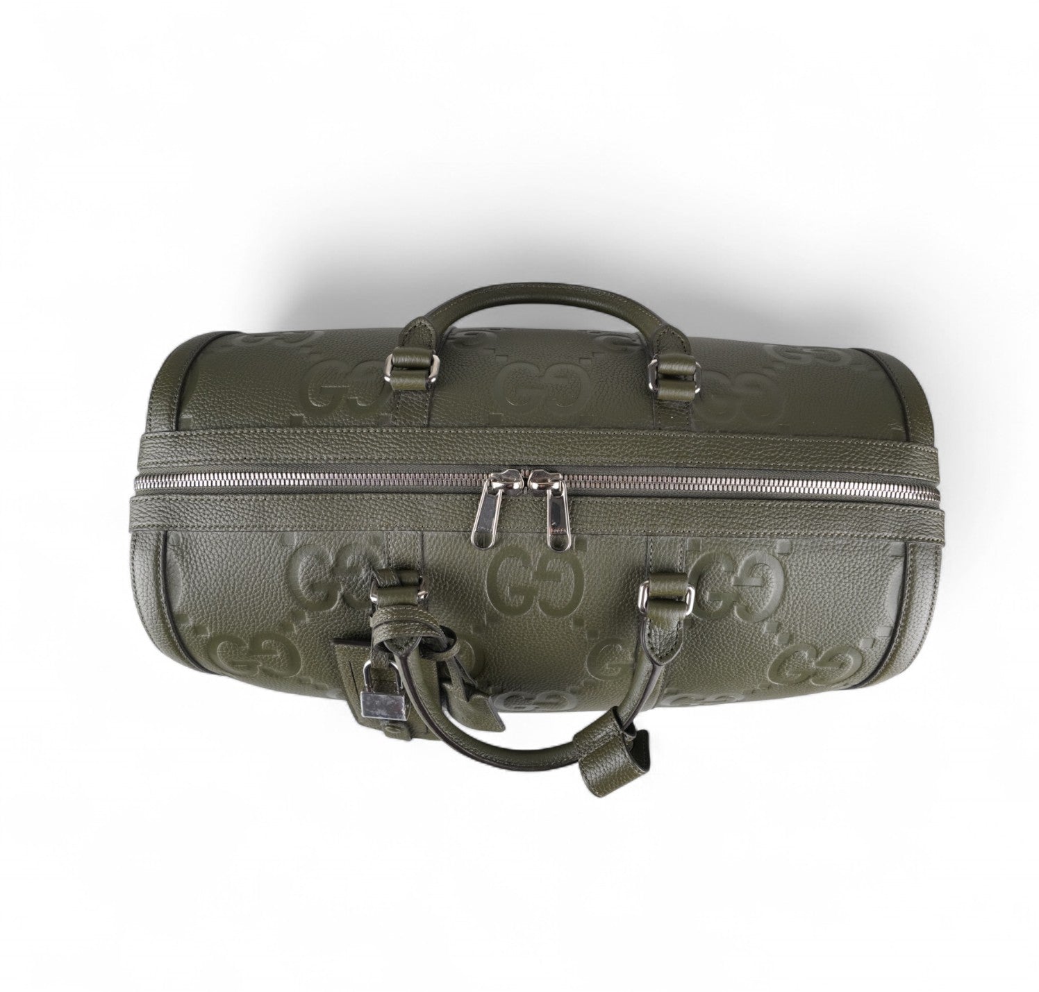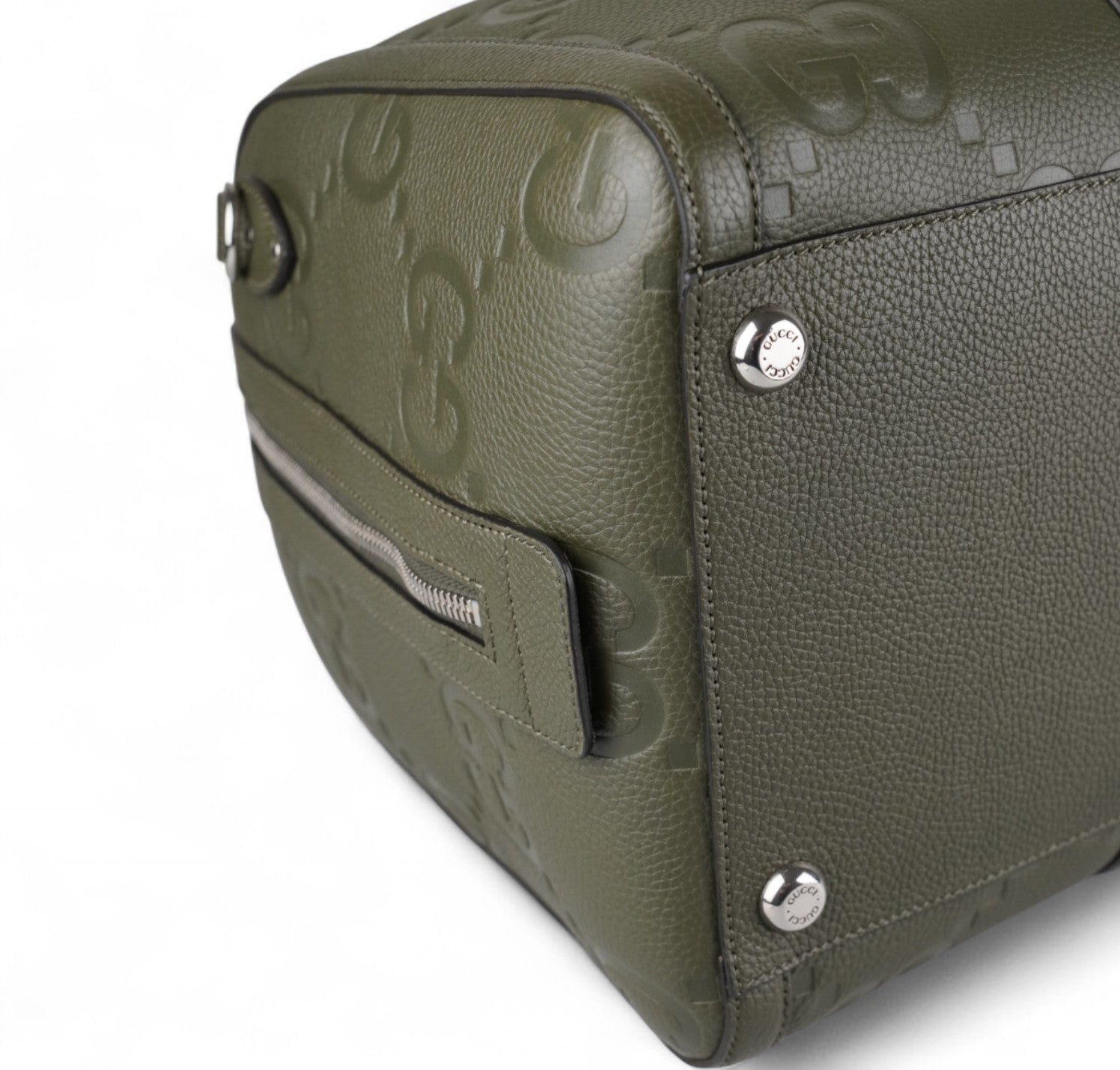 Borsone Gucci, linea GG Jumbo, realizzato in pelle Verde Oliva con iconico motivo GG maxi impresso. Doppio manico superiore e tracolla removibile e regolabile in tessuto tono su tono con dettagli in pelle per una portabilità versatile a mano o a spalla. Chiusura a zip con doppio cursore. Finiture in metallo Argento. Dotato di lucchetto e targhetta portanome coordinata. Interno spazioso foderato in tessuto. Condizioni pari al nuovo, potrebbe presentare micro segni di stoccaggio.
