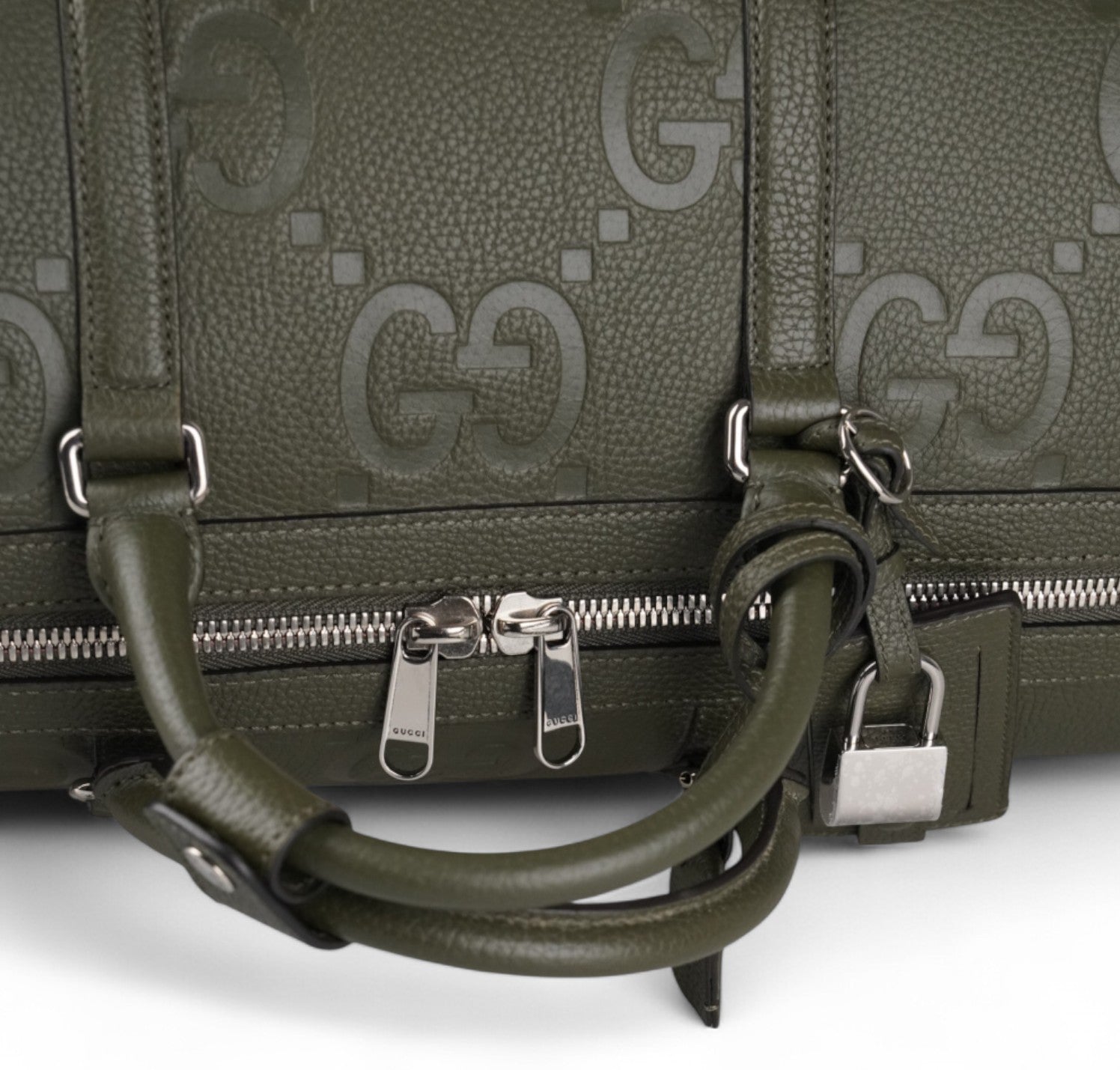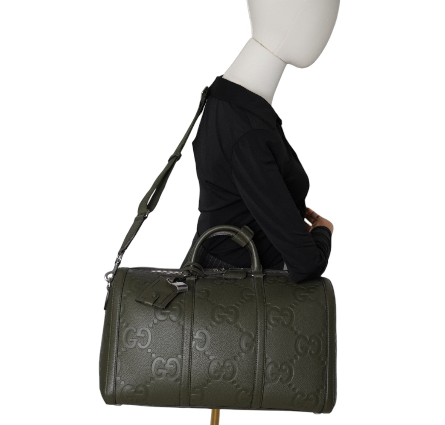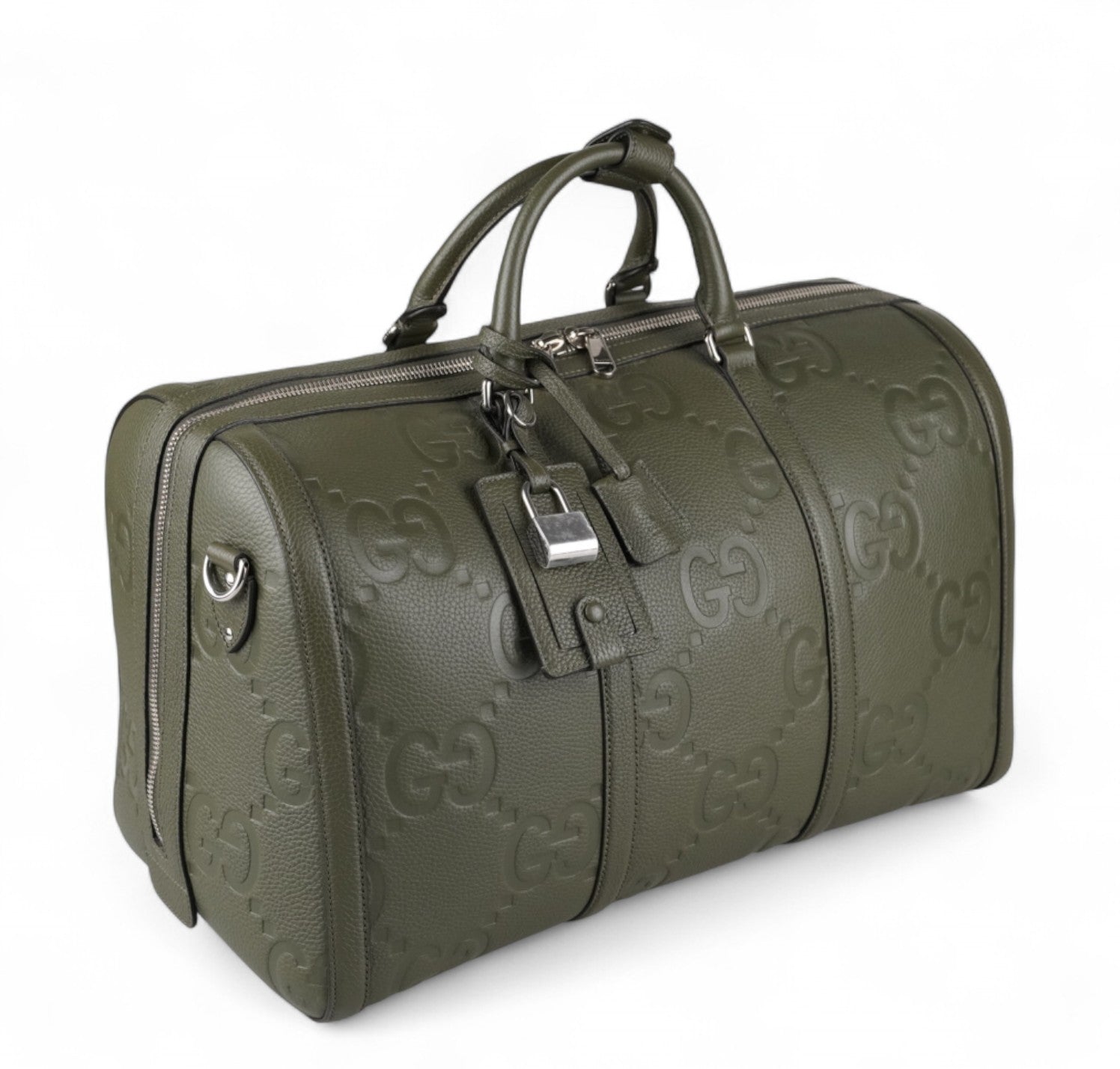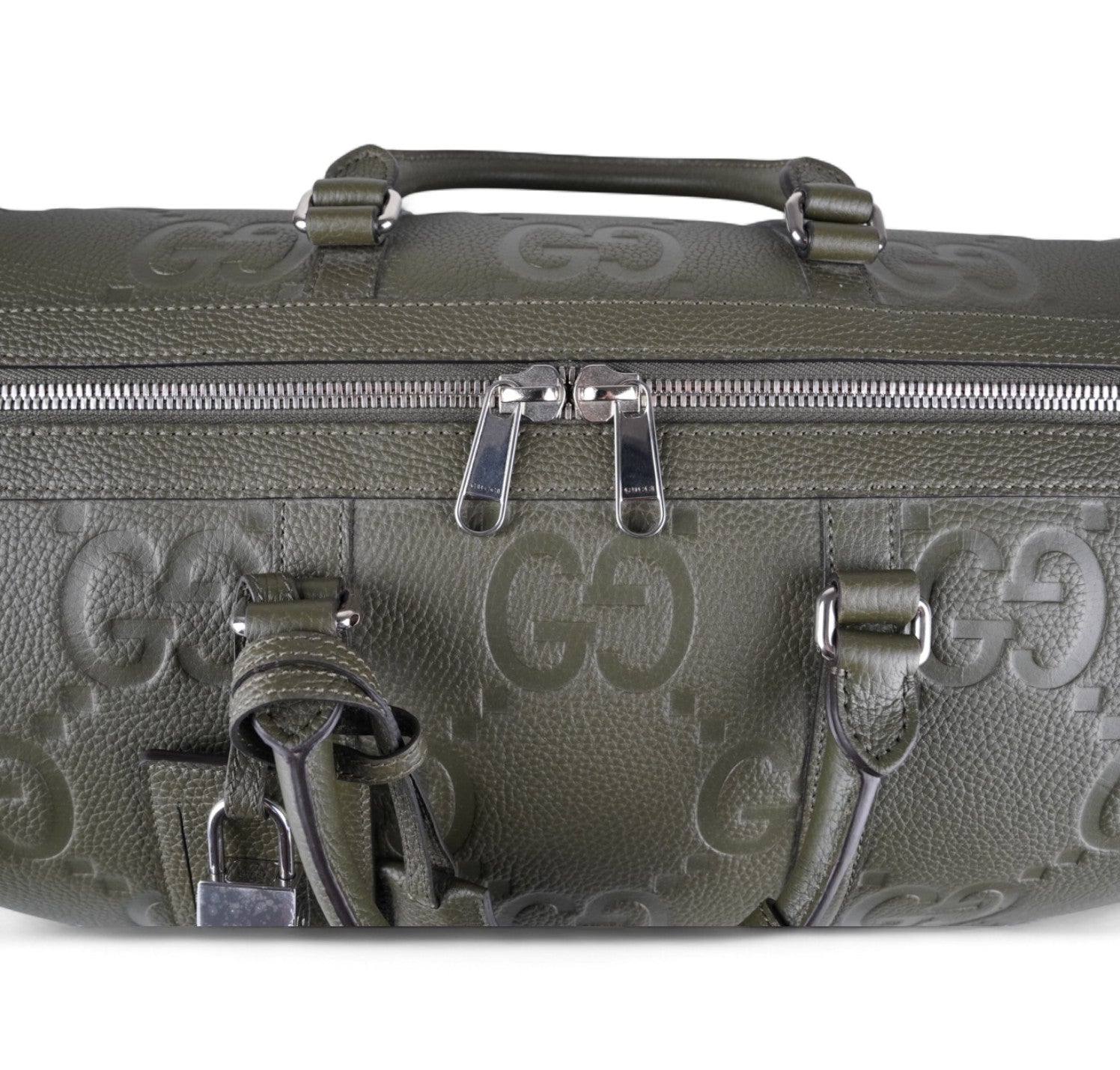 Borsone Gucci, linea GG Jumbo, realizzato in pelle Verde Oliva con iconico motivo GG maxi impresso. Doppio manico superiore e tracolla removibile e regolabile in tessuto tono su tono con dettagli in pelle per una portabilità versatile a mano o a spalla. Chiusura a zip con doppio cursore. Finiture in metallo Argento. Dotato di lucchetto e targhetta portanome coordinata. Interno spazioso foderato in tessuto. Condizioni pari al nuovo, potrebbe presentare micro segni di stoccaggio.
