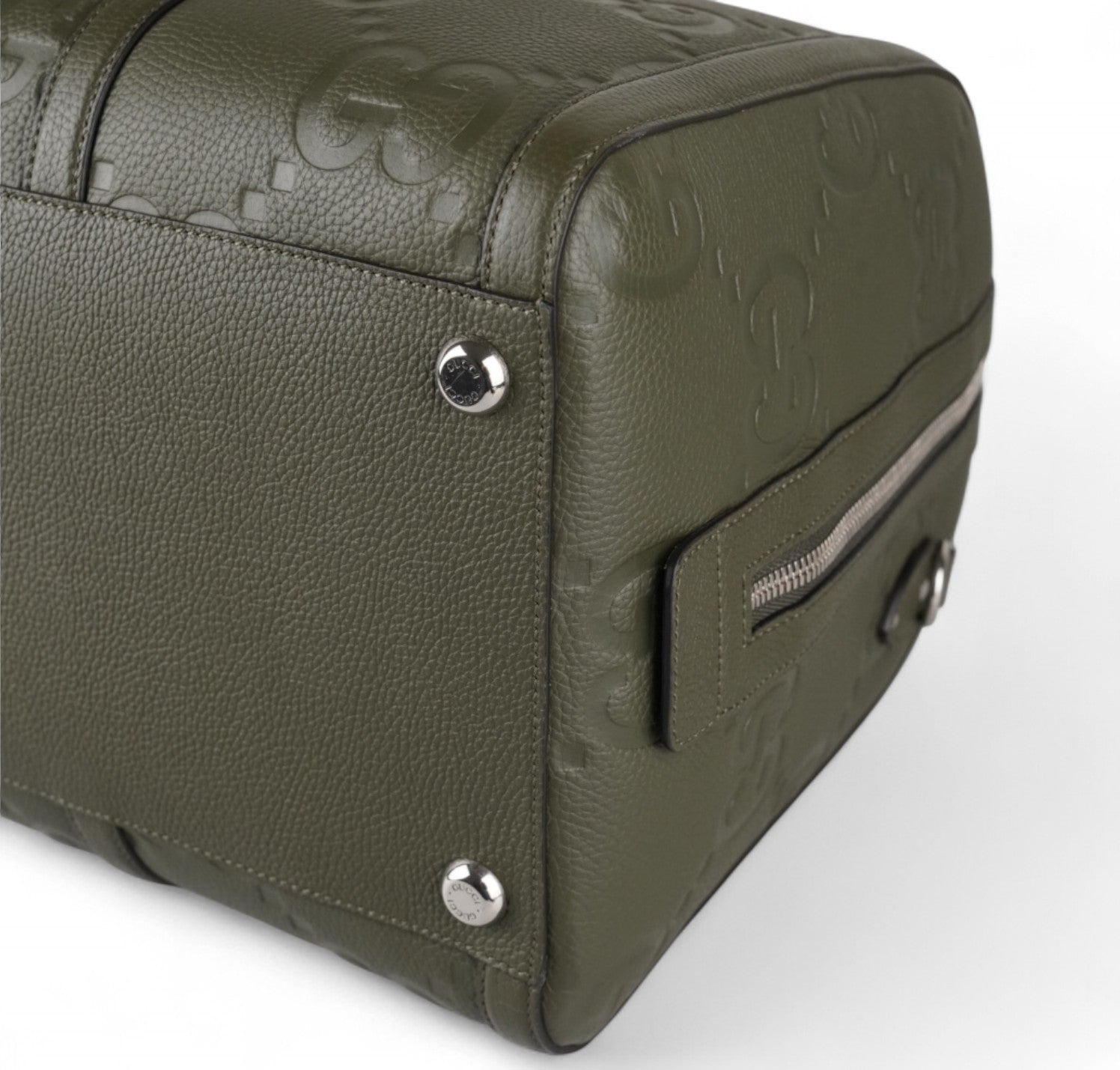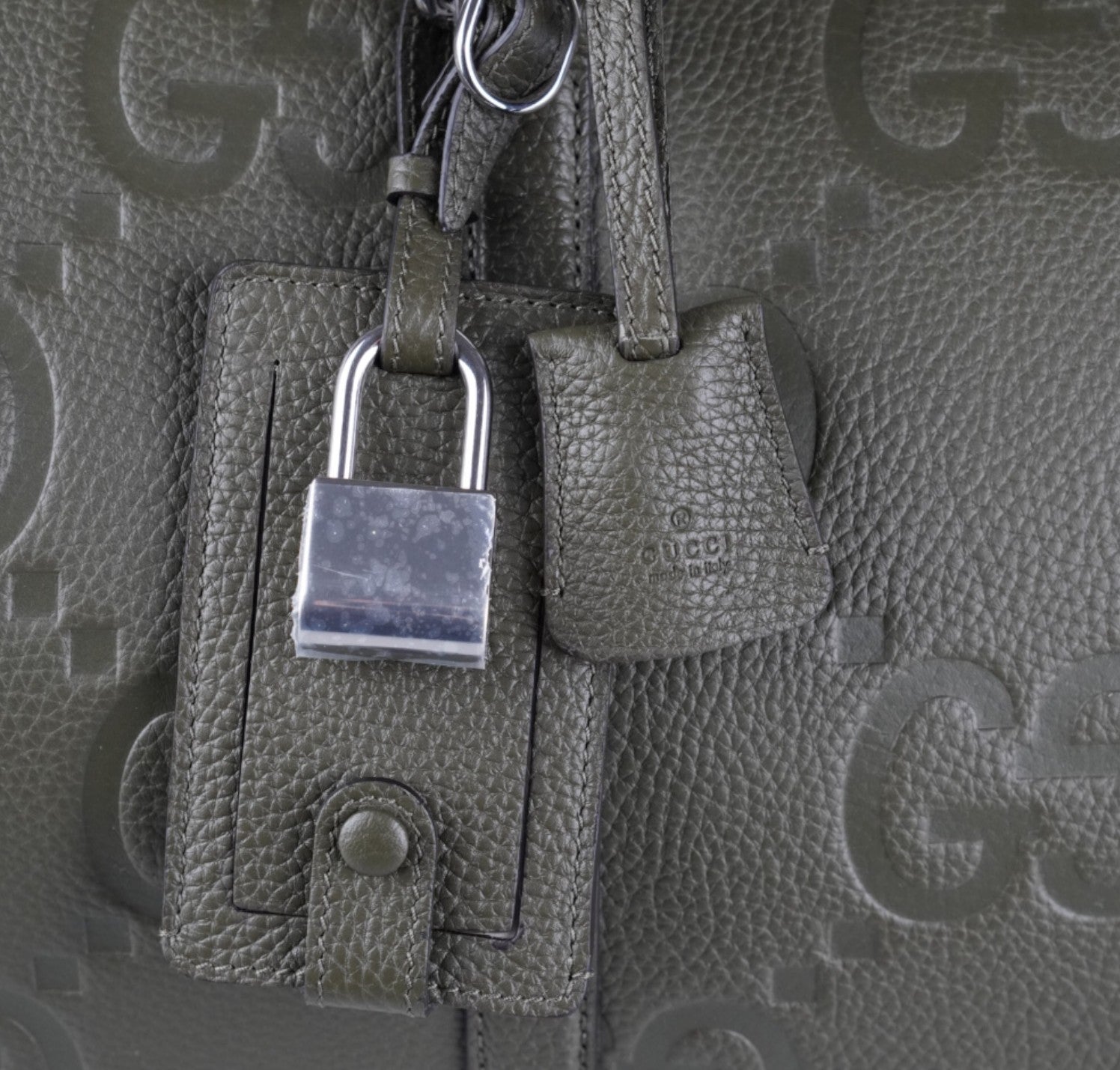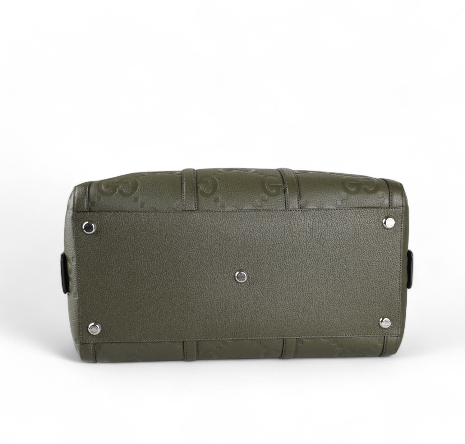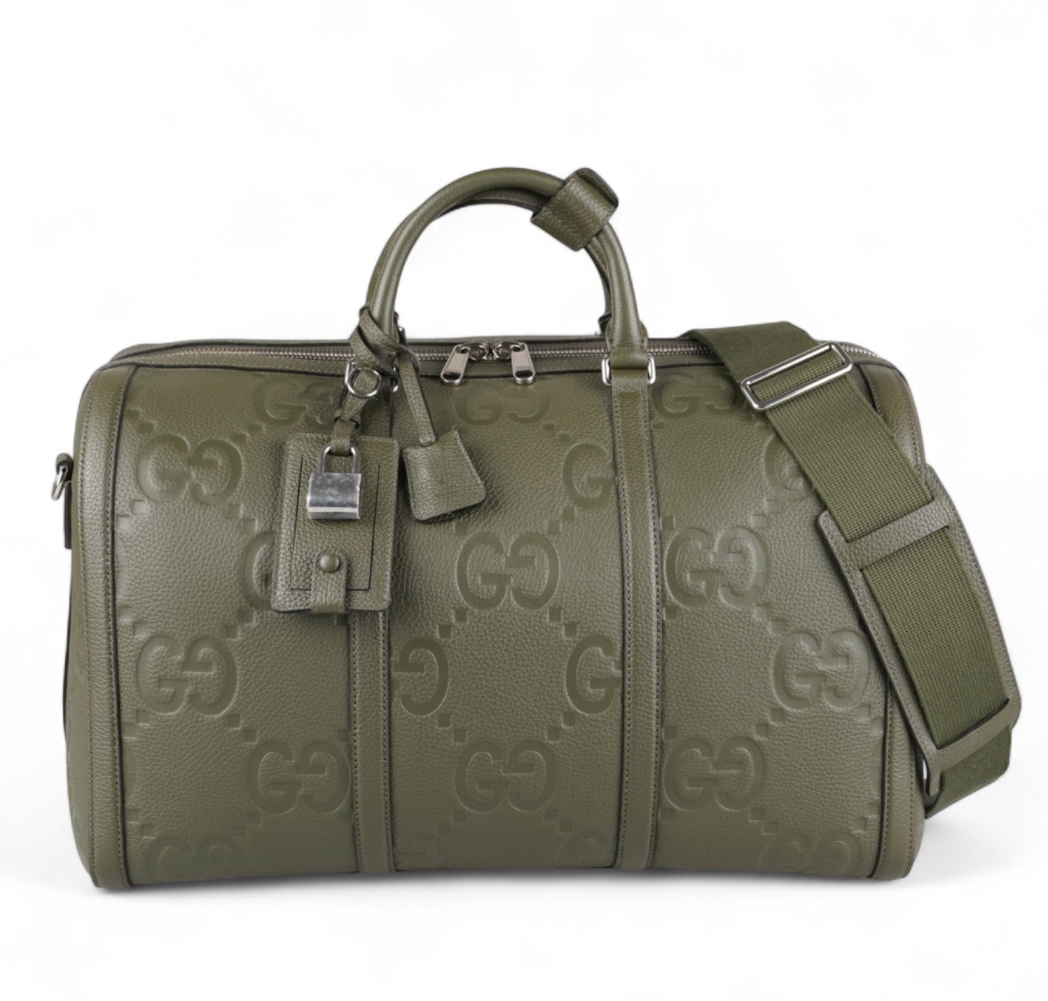 Borsone Gucci, linea GG Jumbo, realizzato in pelle Verde Oliva con iconico motivo GG maxi impresso. Doppio manico superiore e tracolla removibile e regolabile in tessuto tono su tono con dettagli in pelle per una portabilità versatile a mano o a spalla. Chiusura a zip con doppio cursore. Finiture in metallo Argento. Dotato di lucchetto e targhetta portanome coordinata. Interno spazioso foderato in tessuto. Condizioni pari al nuovo, potrebbe presentare micro segni di stoccaggio.