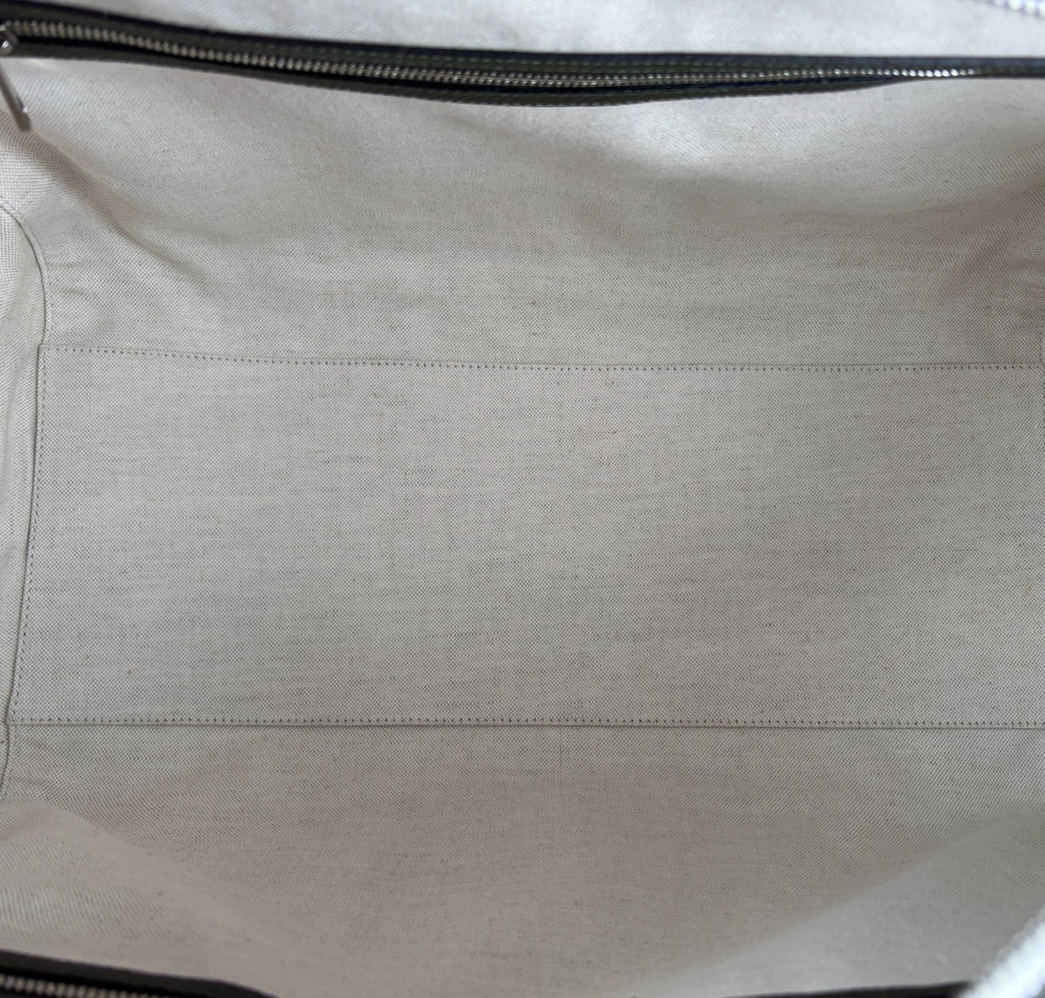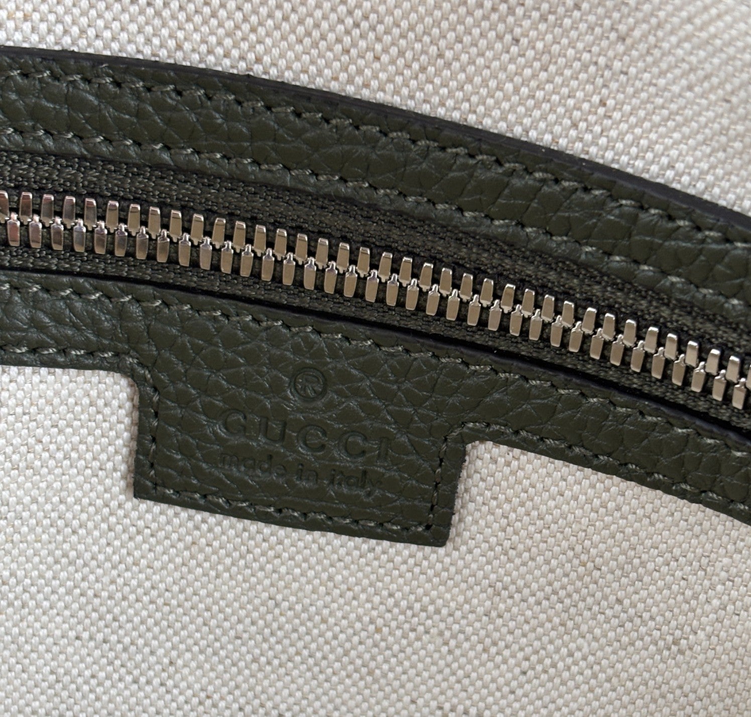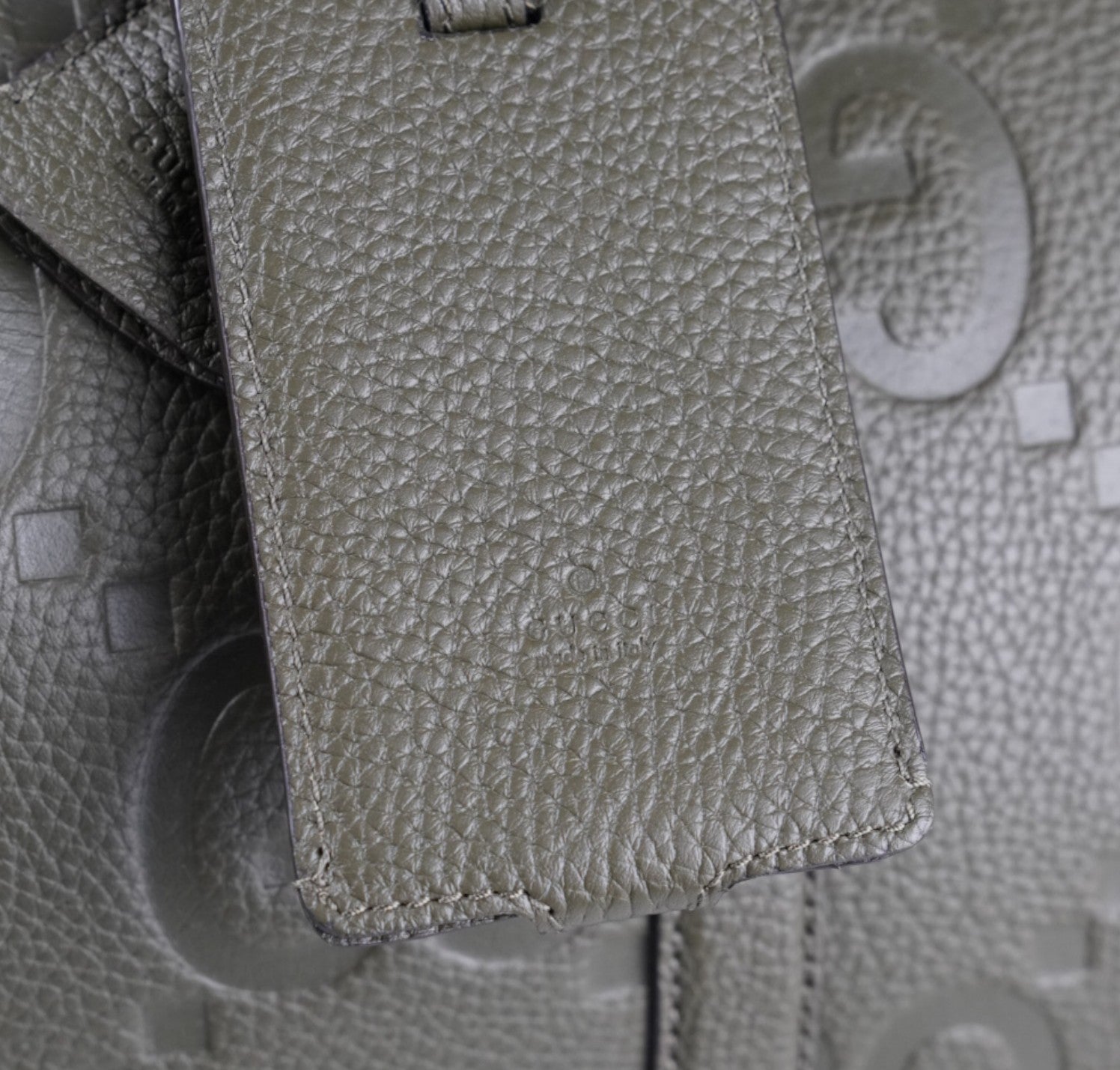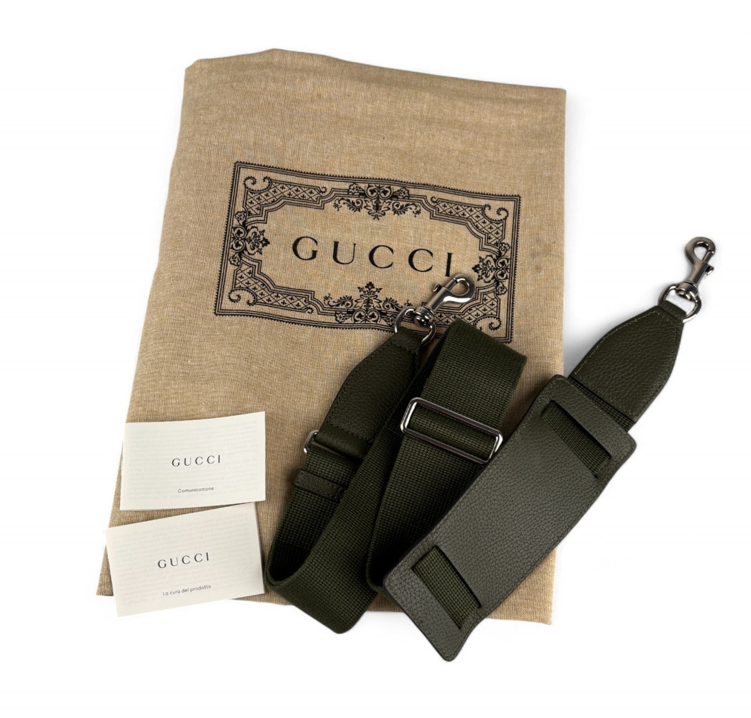Borsone Gucci, linea GG Jumbo, realizzato in pelle Verde Oliva con iconico motivo GG maxi impresso. Doppio manico superiore e tracolla removibile e regolabile in tessuto tono su tono con dettagli in pelle per una portabilità versatile a mano o a spalla. Chiusura a zip con doppio cursore. Finiture in metallo Argento. Dotato di lucchetto e targhetta portanome coordinata. Interno spazioso foderato in tessuto. Condizioni pari al nuovo, potrebbe presentare micro segni di stoccaggio.