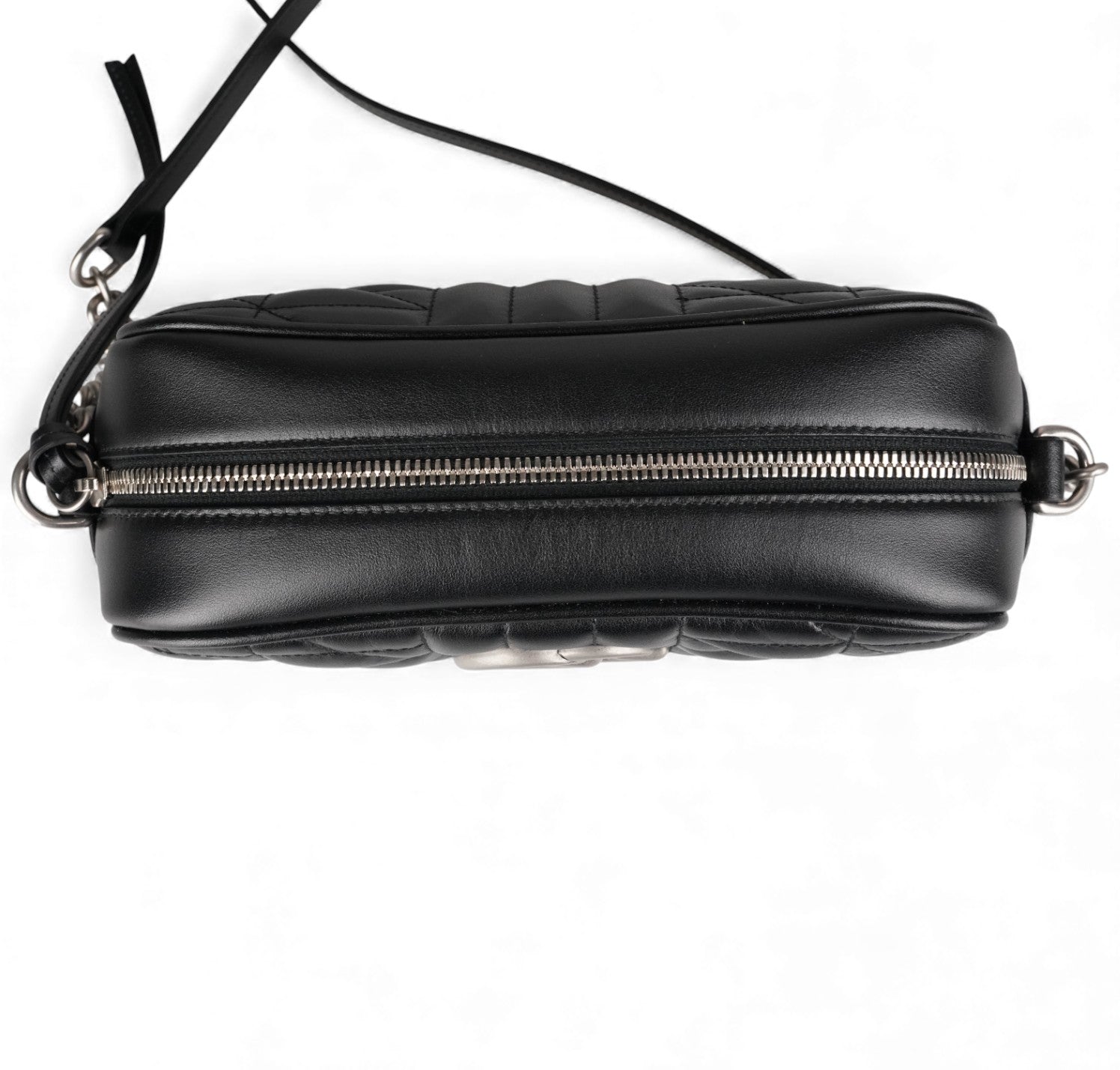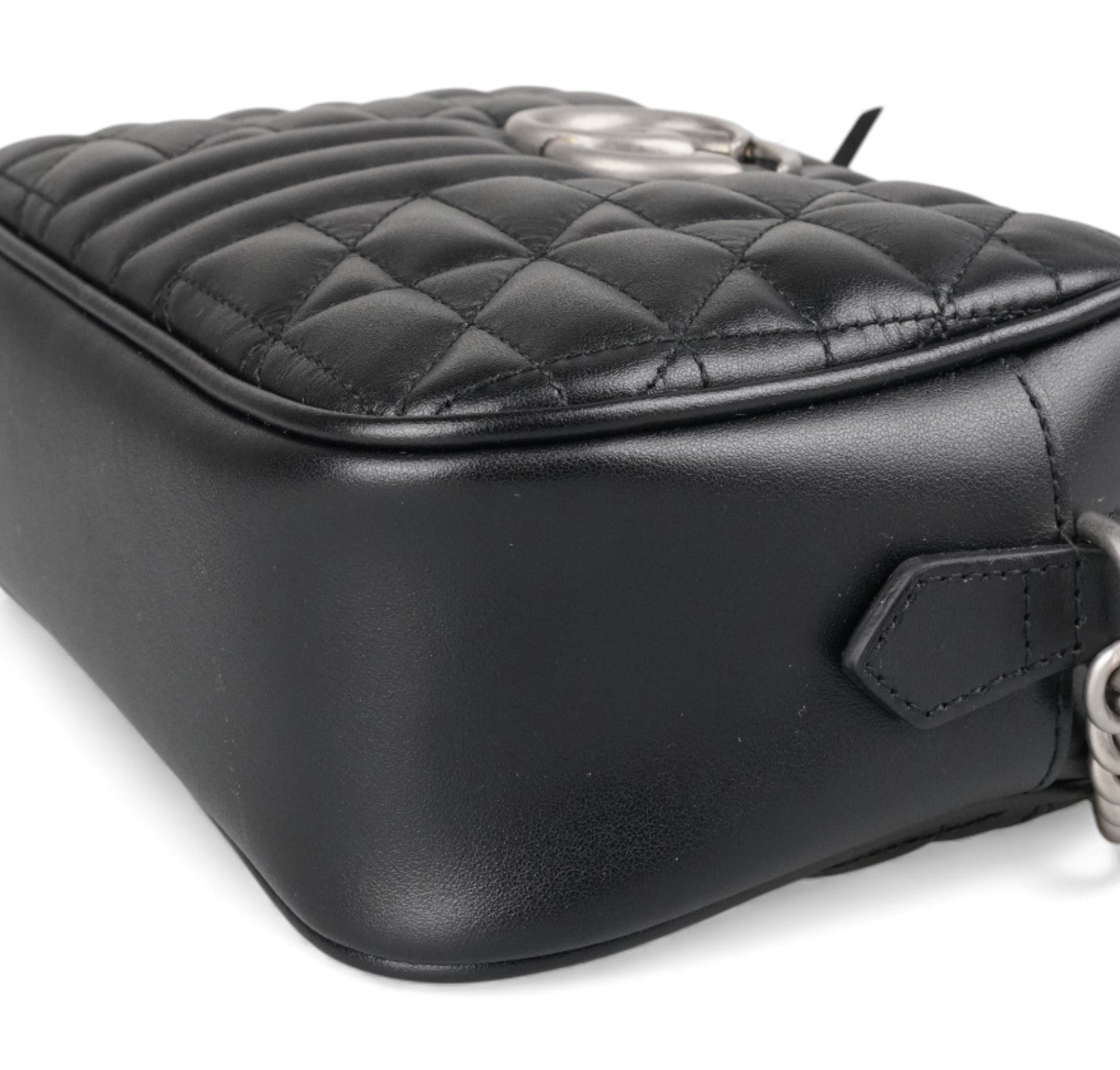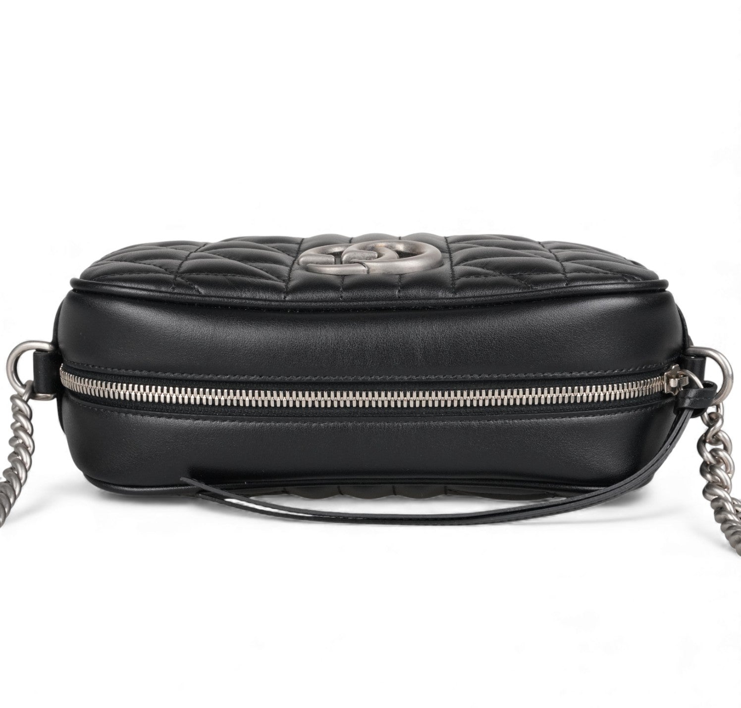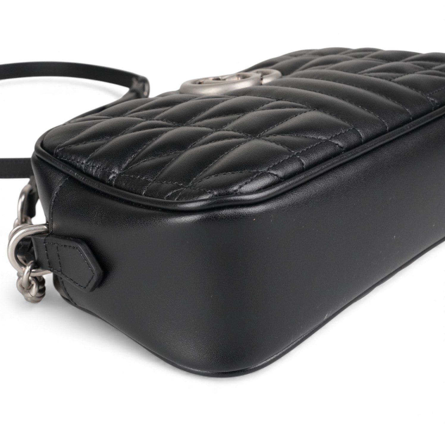 Borsa Gucci, modello GG Marmont Aria Camera Bag, realizzata in Pelle Trapuntata Nera e parti metalliche in Argento effetto anticato. Chiusura esterna con zip. La tracolla superiore ne consente l'utilizzo a spalla o crossbody. Interno foderato in tessuto chiaro, munito di tasca piatta laterale. Impreziosita da iconico logo del designer frontale. Condizioni pari al nuovo, potrebbe presentare micro segni di stoccaggio.