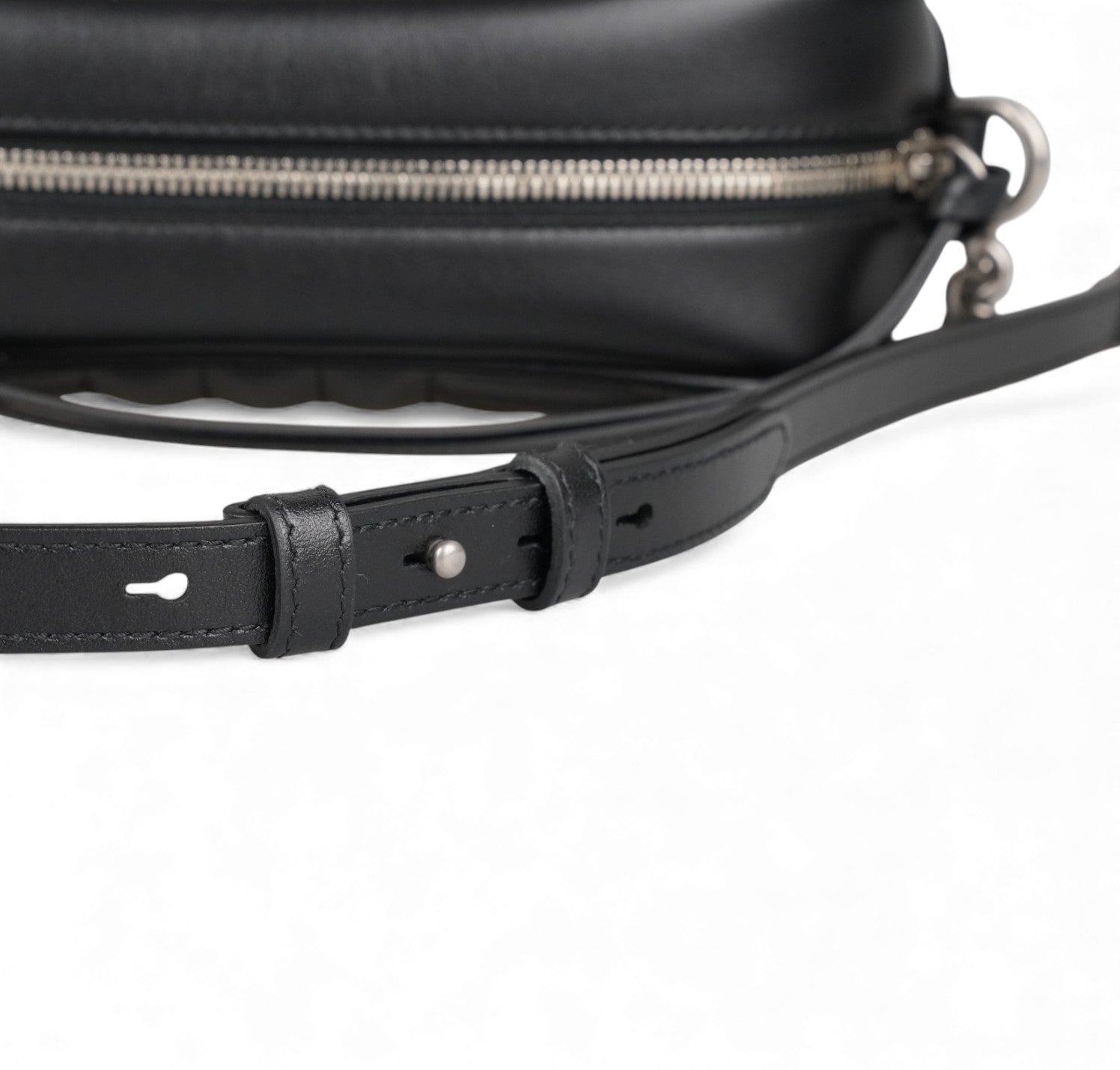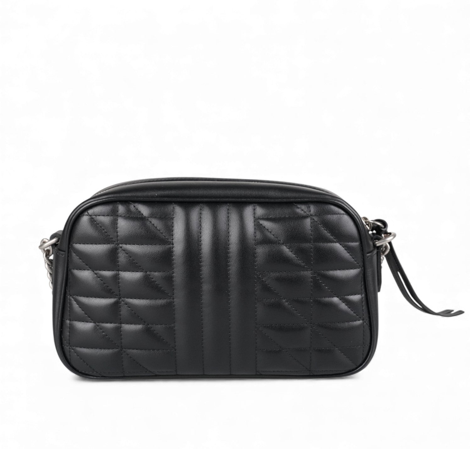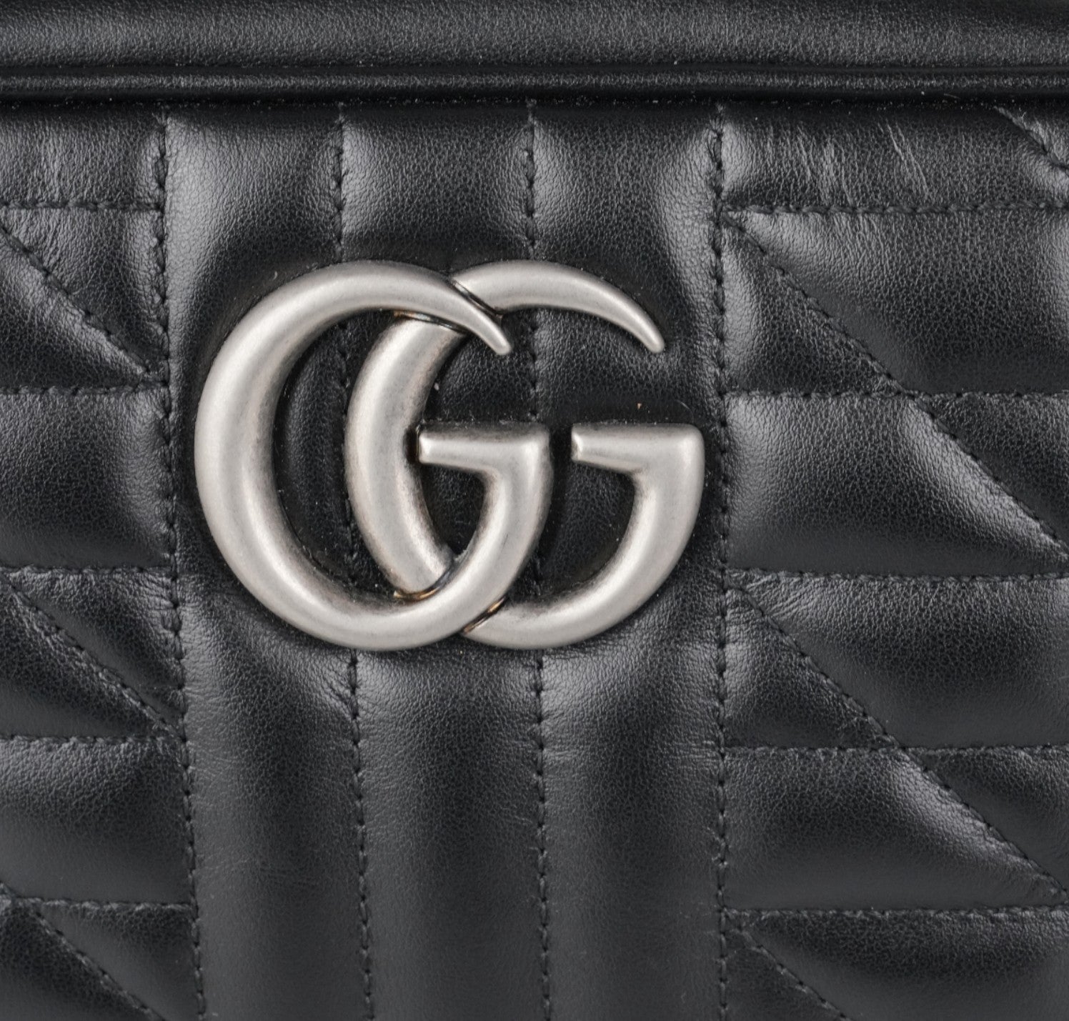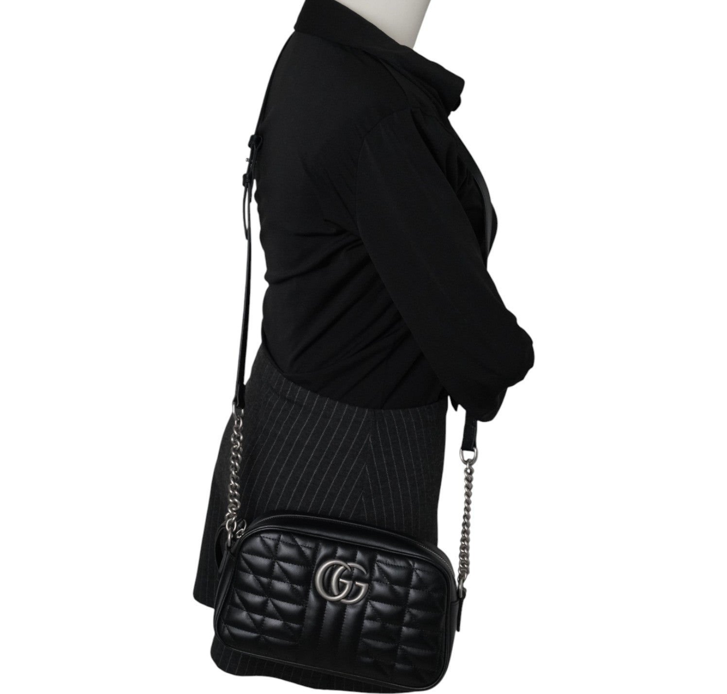 Borsa Gucci, modello GG Marmont Aria Camera Bag, realizzata in Pelle Trapuntata Nera e parti metalliche in Argento effetto anticato. Chiusura esterna con zip. La tracolla superiore ne consente l'utilizzo a spalla o crossbody. Interno foderato in tessuto chiaro, munito di tasca piatta laterale. Impreziosita da iconico logo del designer frontale. Condizioni pari al nuovo, potrebbe presentare micro segni di stoccaggio.