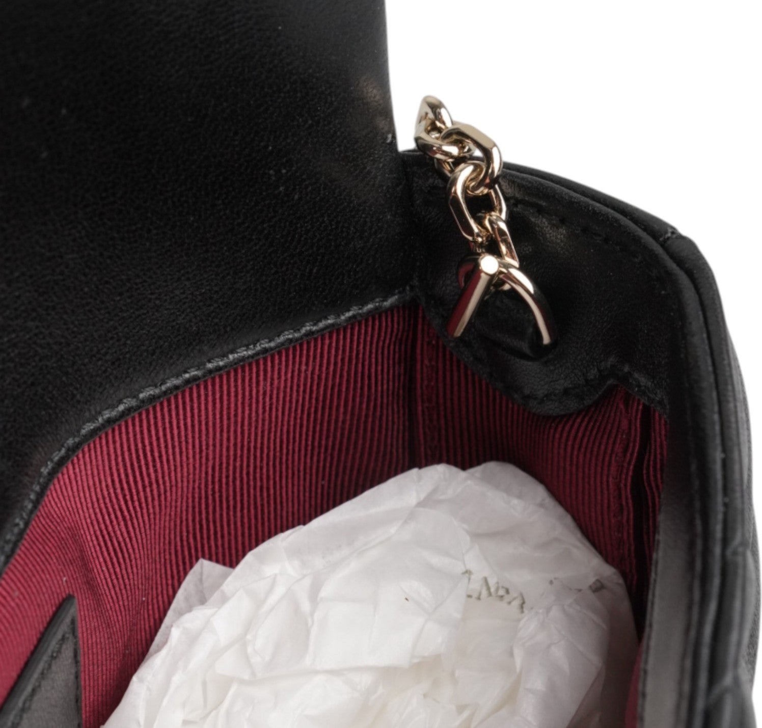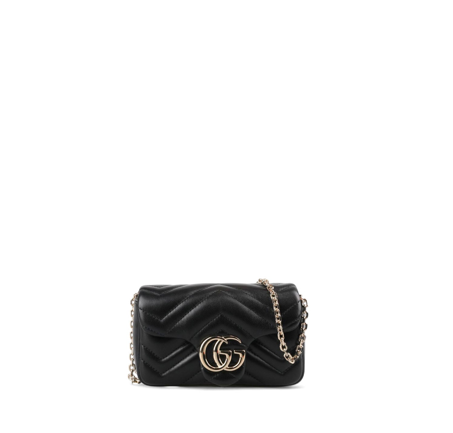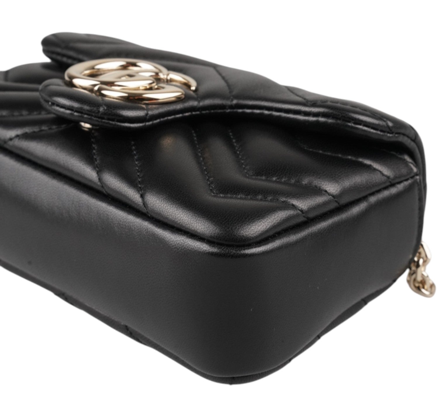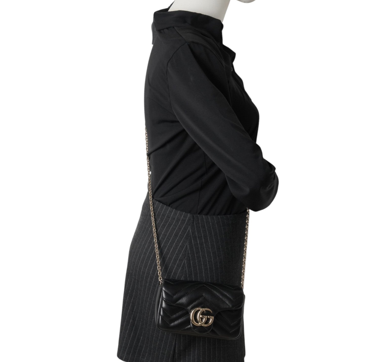Borsa Gucci, modello Marmont, misura Mini, nuova collezione, realizzata in Pelle Nera. Finiture metalliche Oro chiaro. Chiusura magnetica automatica con pattina, impreziosita da logo GG. Munita di tracolla in catena amovibile per l'uso a spalla, crossbody o come pochette a mano. Interno foderato in tessuto Borgogna. Piccola ma capiente, riesce a contenere anche un cellulare (es. iPhone Pro), e altri piccoli oggetti necessari. Condizioni pari al nuovo, inutilizzata ma potrebbero essere presenti micro segni di stoccaggio.