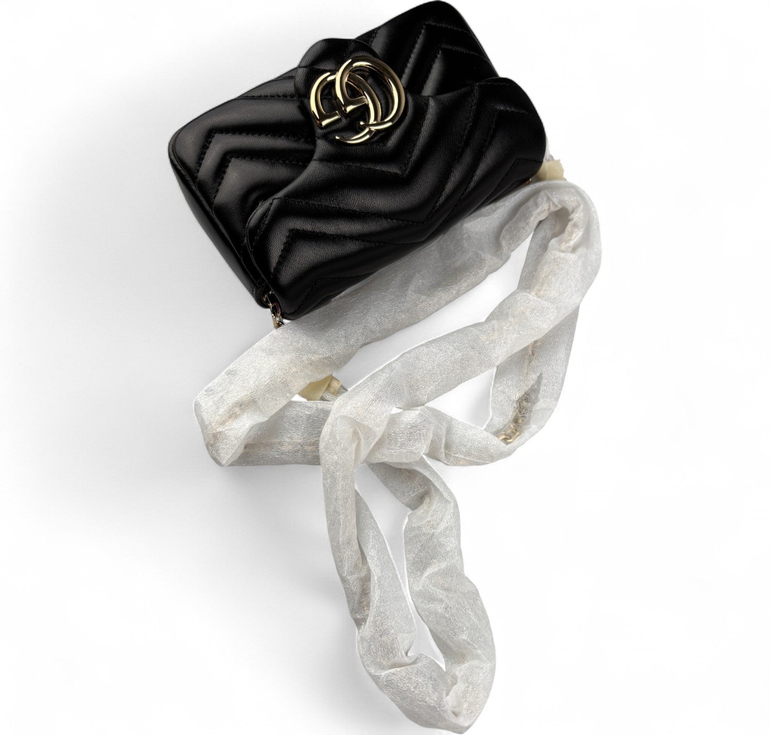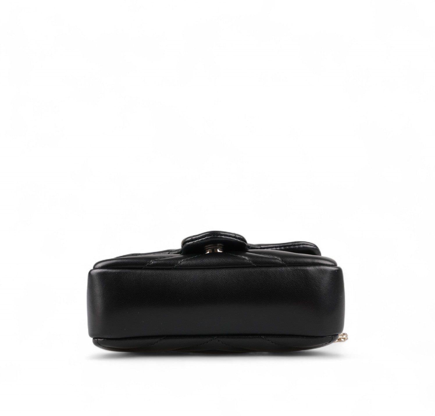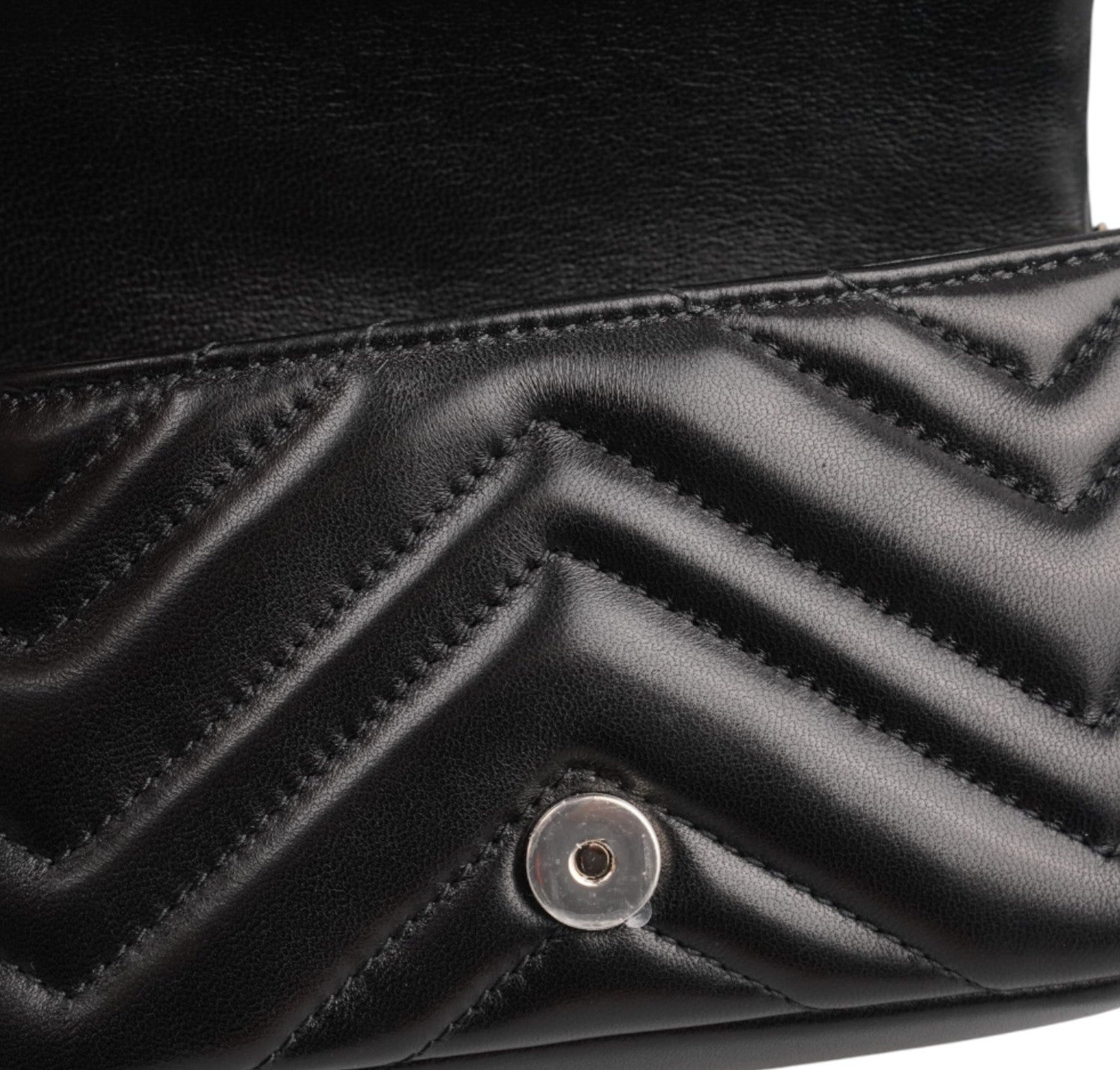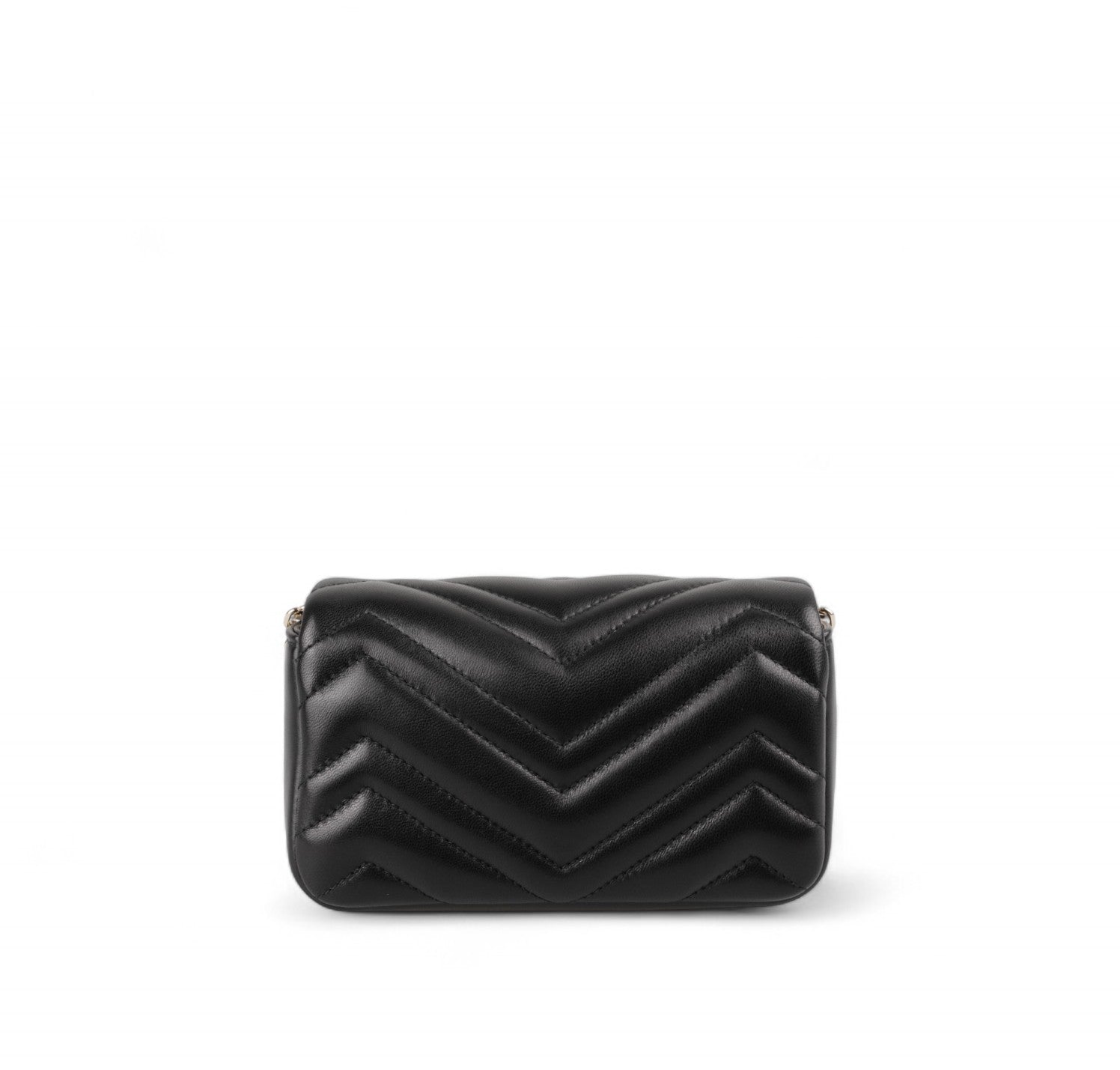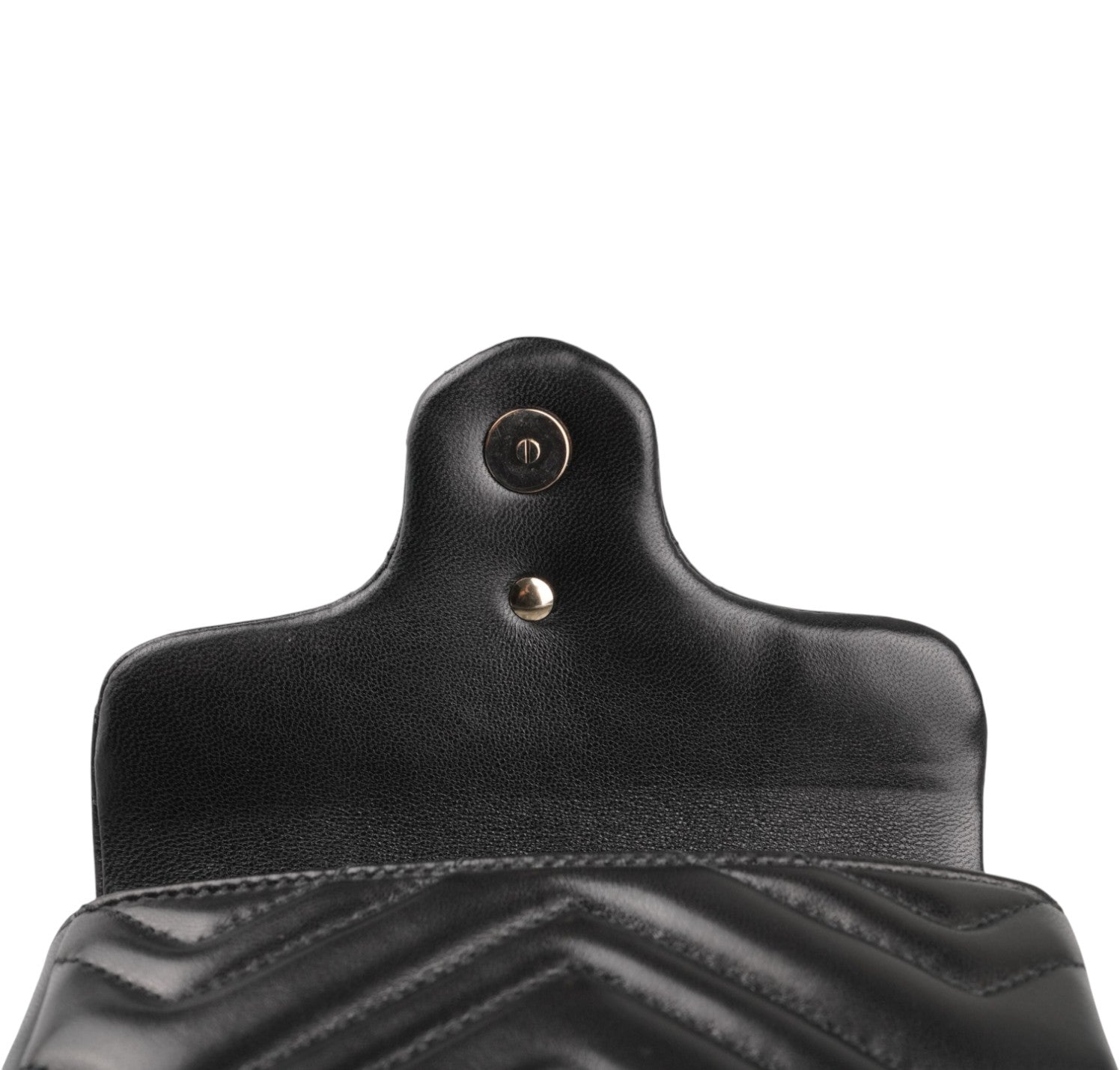 Borsa Gucci, modello Marmont, misura Mini, nuova collezione, realizzata in Pelle Nera. Finiture metalliche Oro chiaro. Chiusura magnetica automatica con pattina, impreziosita da logo GG. Munita di tracolla in catena amovibile per l'uso a spalla, crossbody o come pochette a mano. Interno foderato in tessuto Borgogna. Piccola ma capiente, riesce a contenere anche un cellulare (es. iPhone Pro), e altri piccoli oggetti necessari. Condizioni pari al nuovo, inutilizzata ma potrebbero essere presenti micro segni di stoccaggio.
