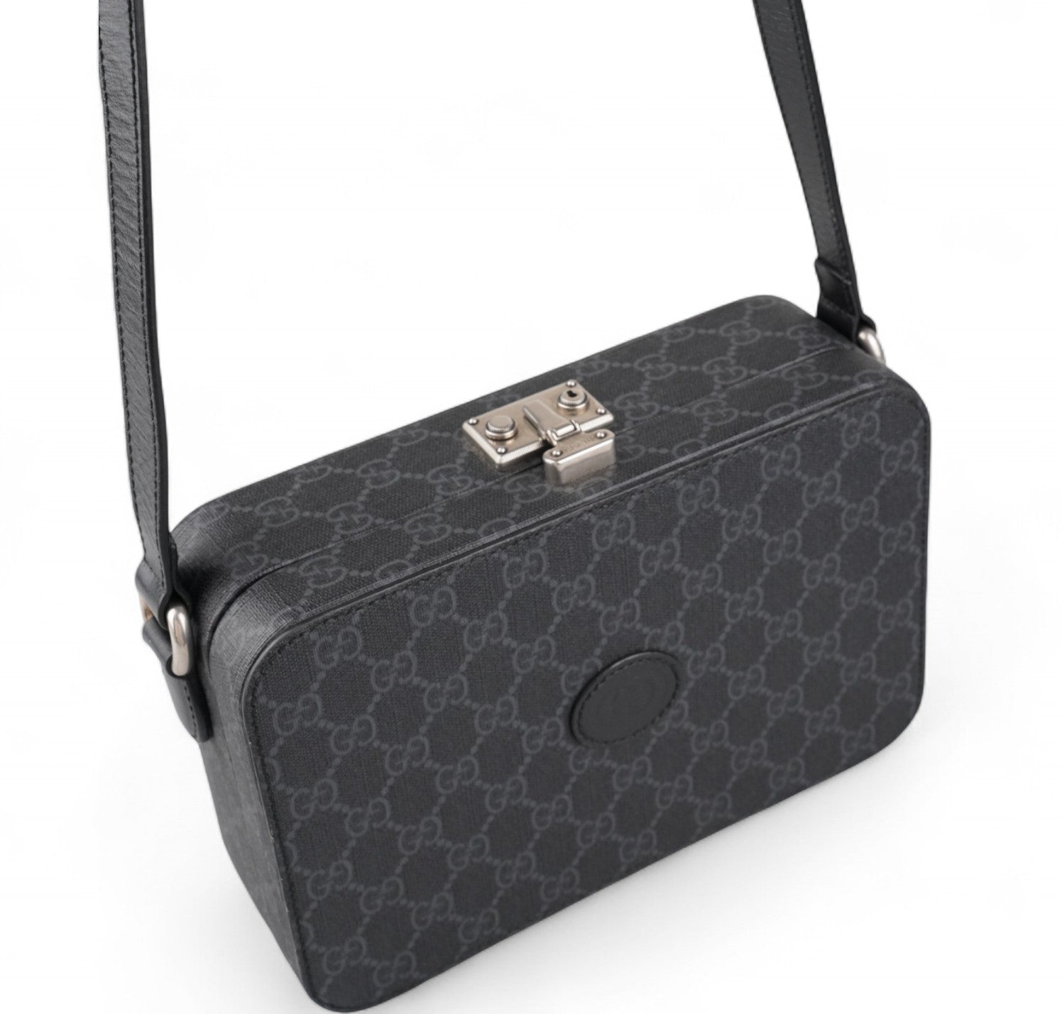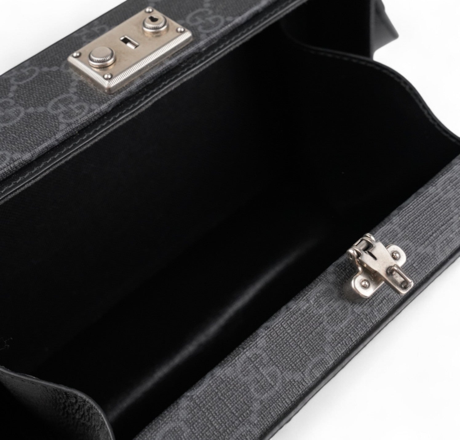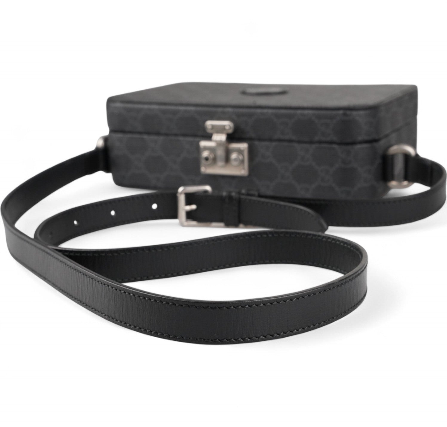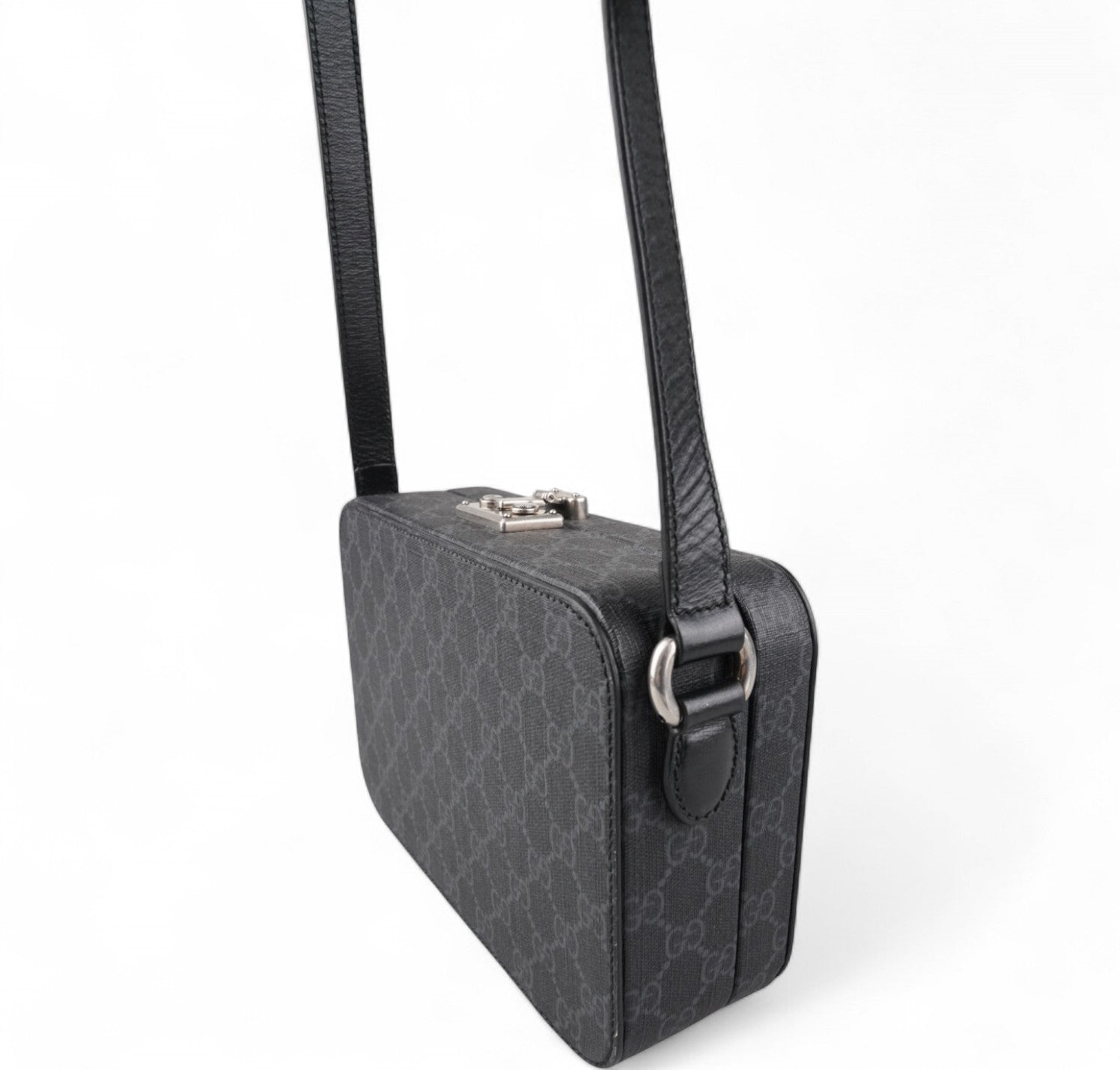Borsa Gucci, modello Hard Trunk, realizzata in tela GG Supreme Grigia/Nera rigida e strutturata con dettagli in Pelle. Caratterizzata da chiusura metallica a incastro con finiture argento effetto anticato. Tracolla regolabile, per una portabilità a spalla o crossbody. Interno foderato in tessuto con tasca piatta. Condizioni pari al nuovo, potrebbe presentare micro segni di stoccaggio.