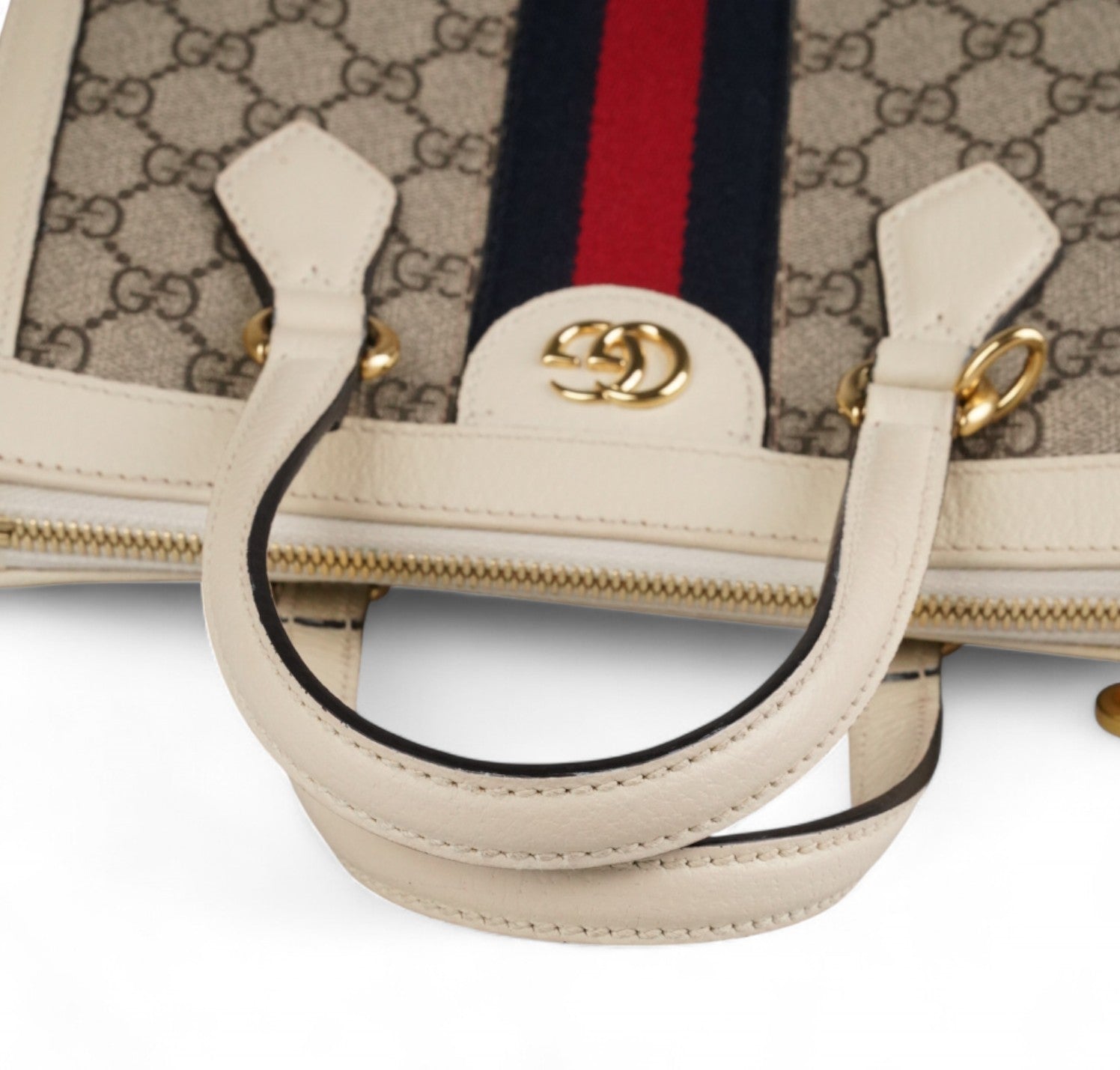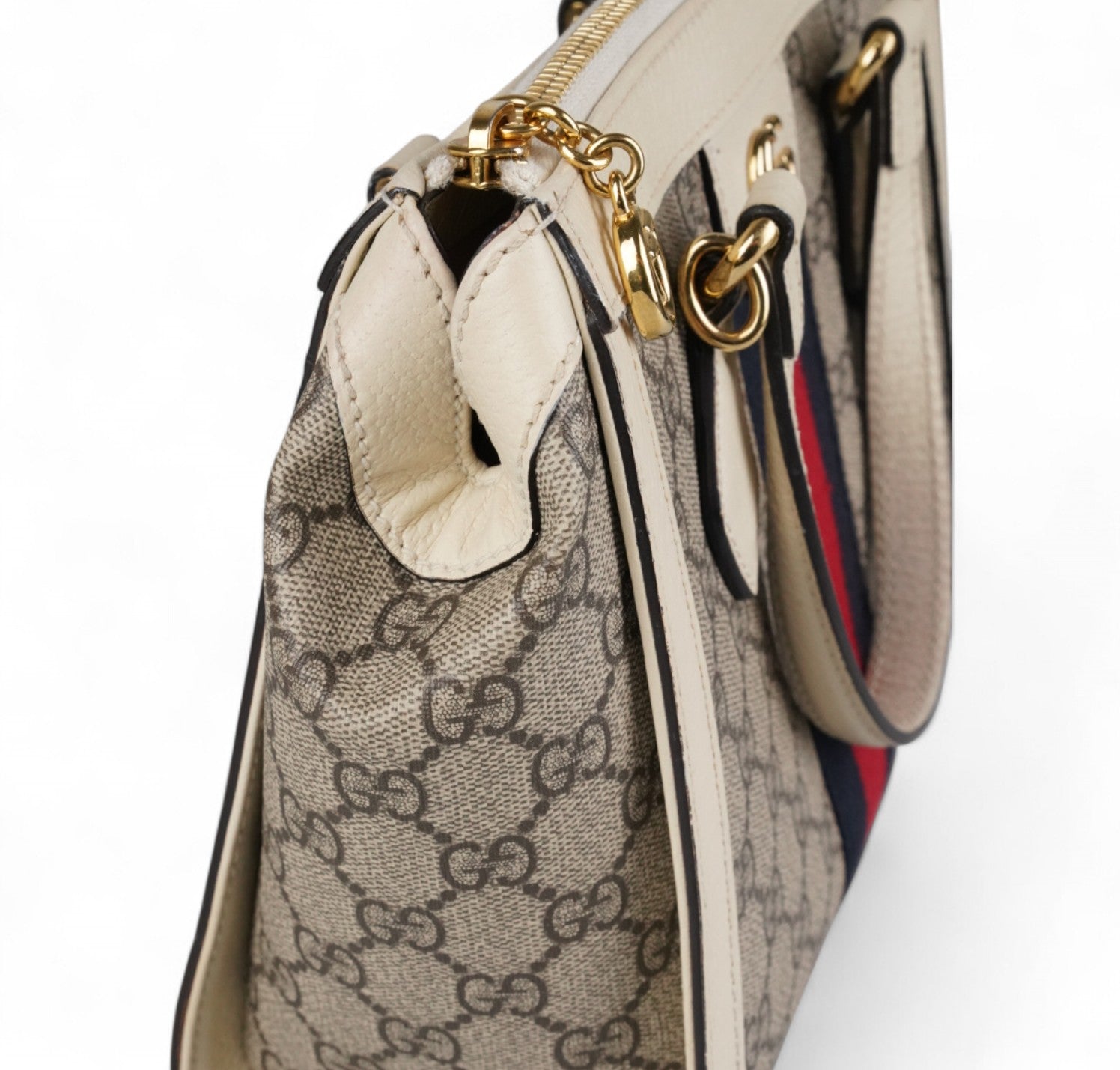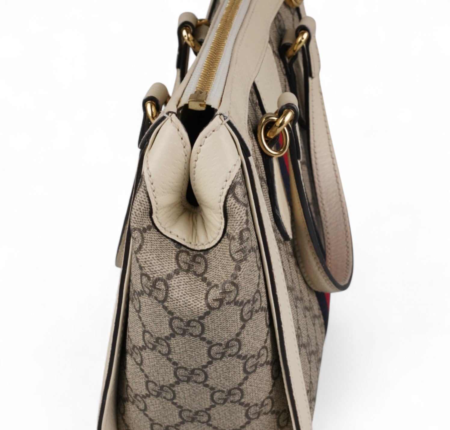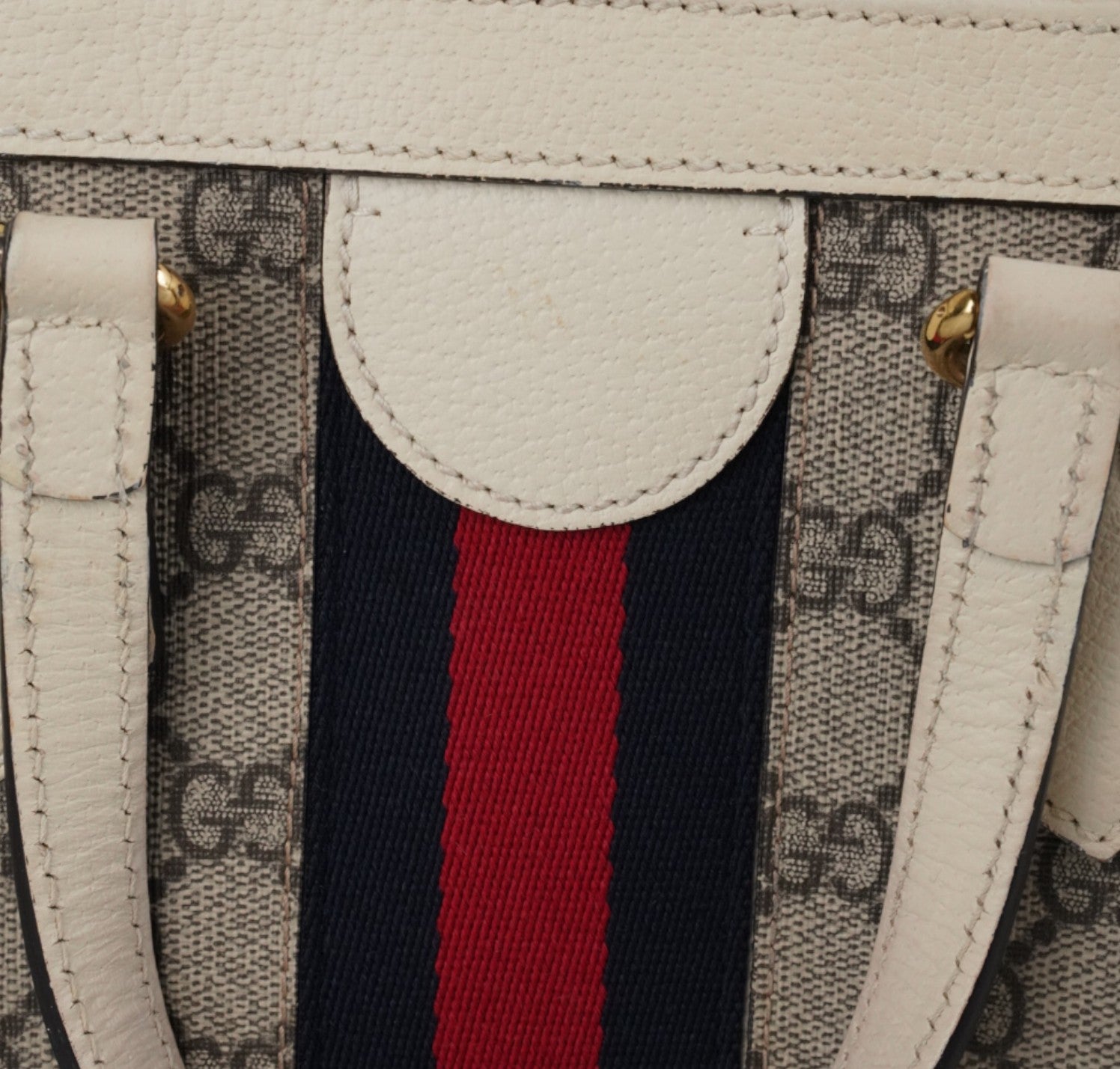 Gucci bag, Ophidia Shopping model, Small size, made of GG Supreme Canvas, embellished with Web Ribbon in shades of red and blue. Gold-colored metal finishes. Ivory leather details. Internally lined in suede-effect microfiber with single compartment, applied pocket. Top zip closure. Equipped with top handles for carrying by hand. Detachable and adjustable shoulder strap for shoulder or crossbody carry. Shows light general wear on leather. Light interior wear.