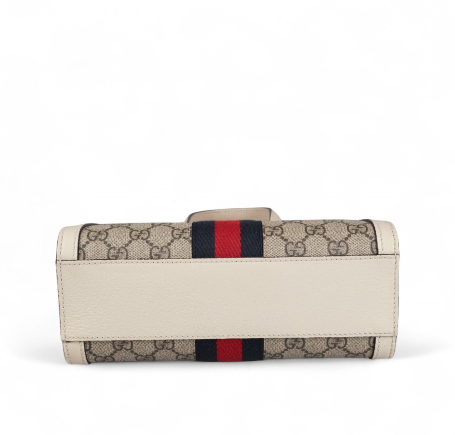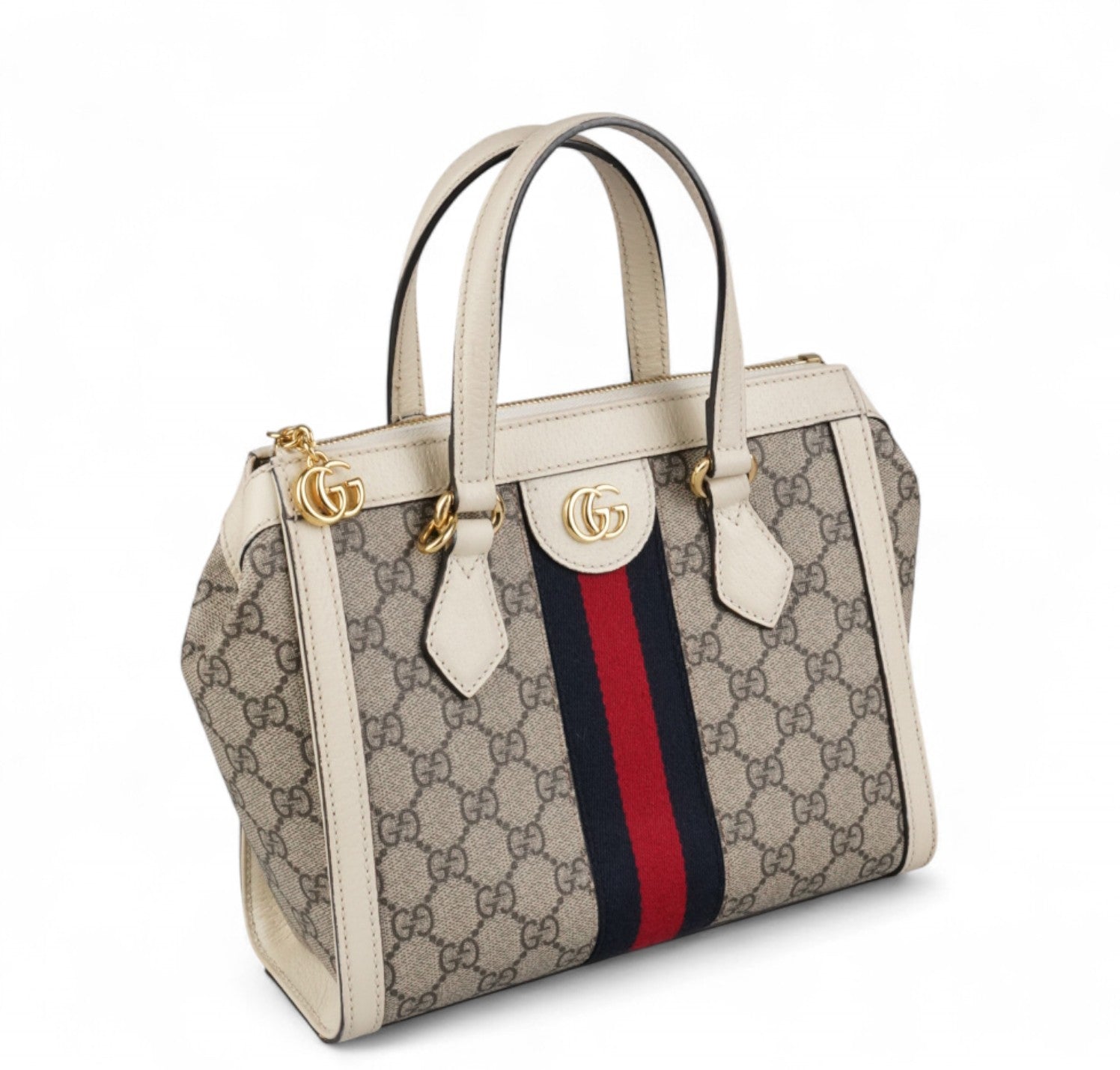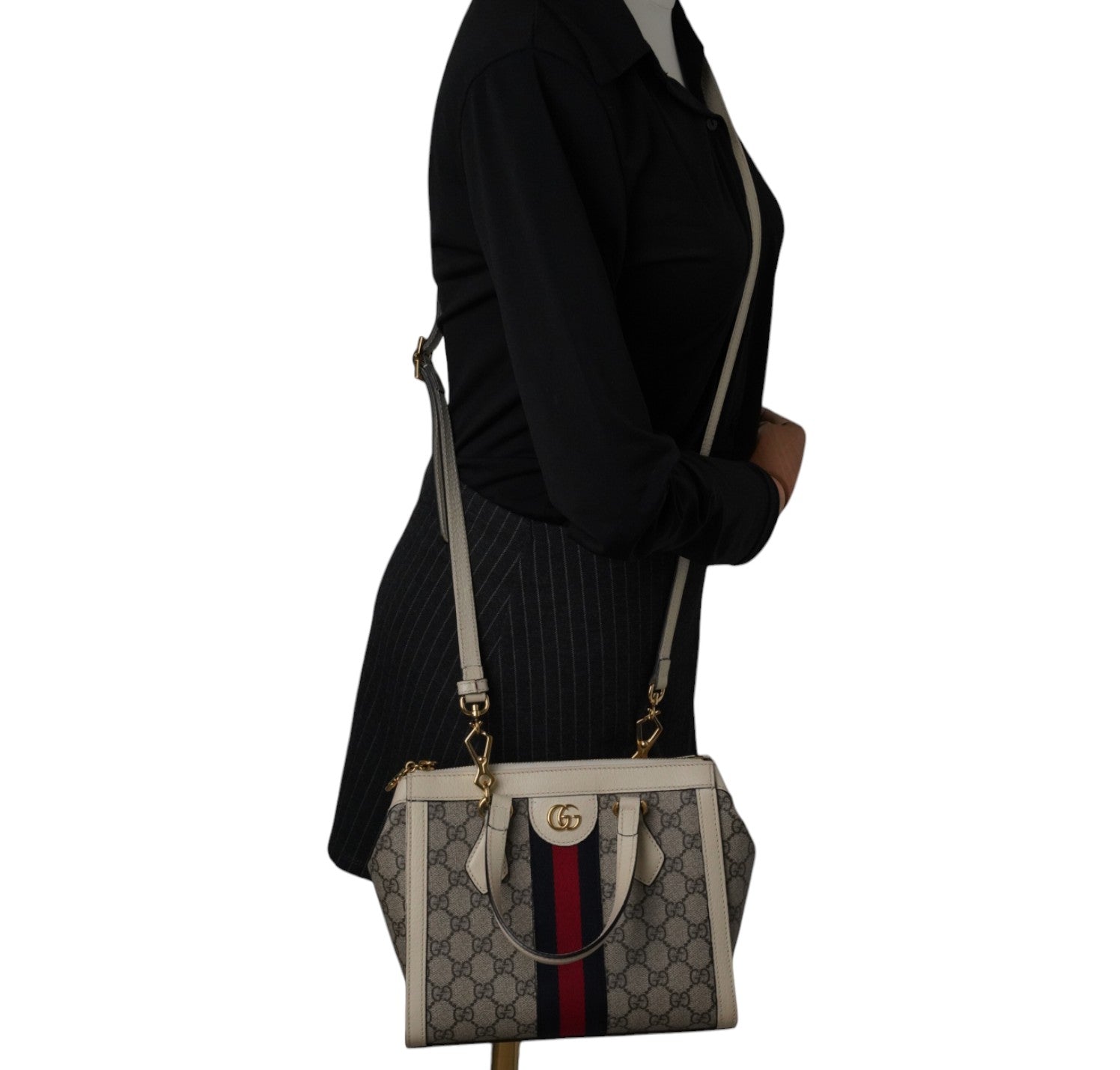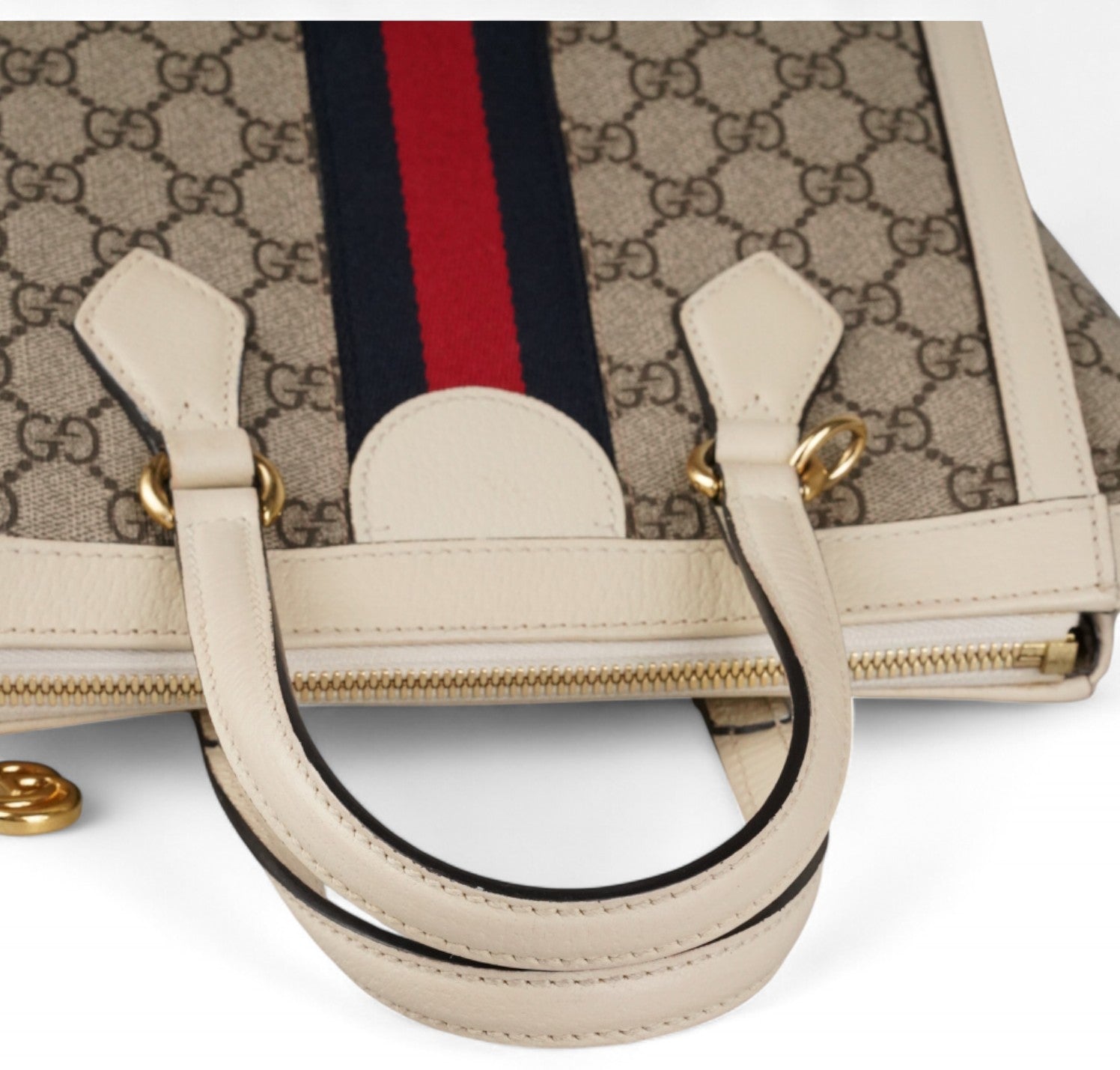 Gucci bag, Ophidia Shopping model, Small size, made of GG Supreme Canvas, embellished with Web Ribbon in shades of red and blue. Gold-colored metal finishes. Ivory leather details. Internally lined in suede-effect microfiber with single compartment, applied pocket. Top zip closure. Equipped with top handles for carrying by hand. Detachable and adjustable shoulder strap for shoulder or crossbody carry. Shows light general wear on leather. Light interior wear.