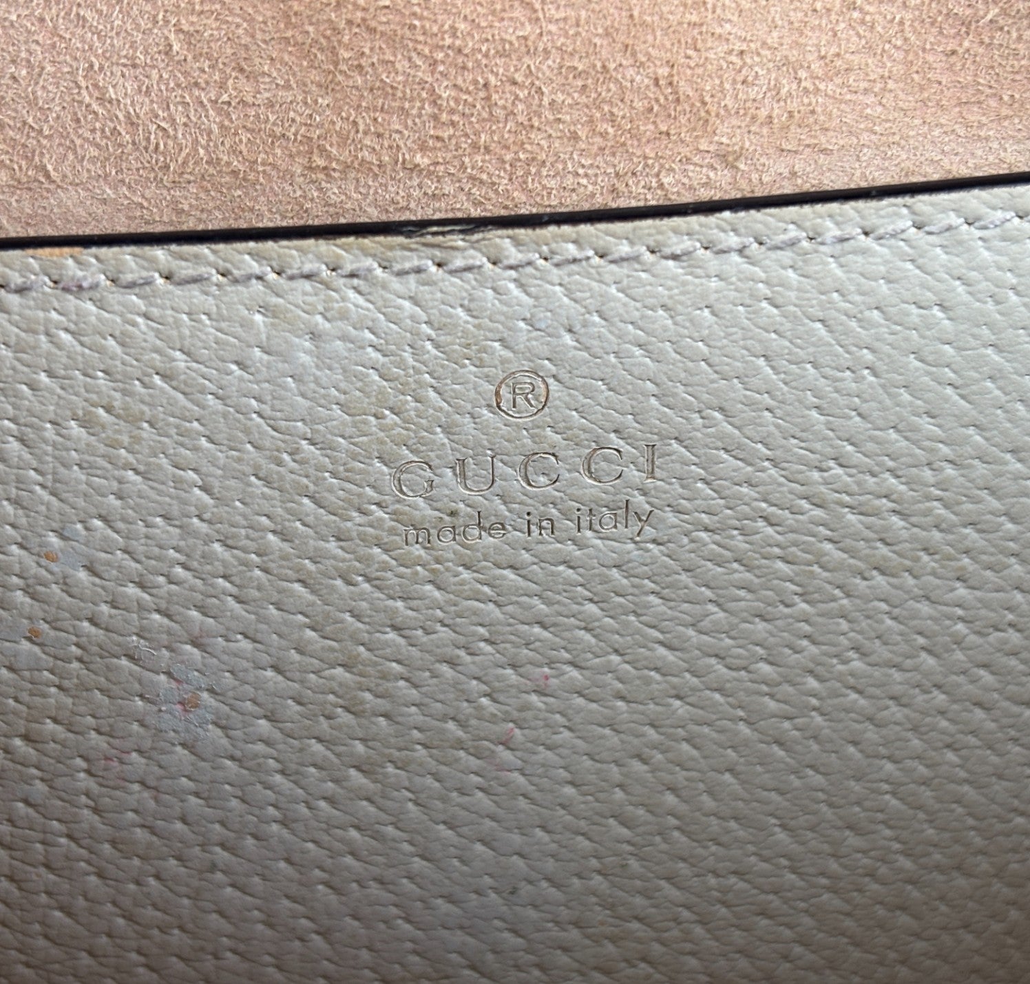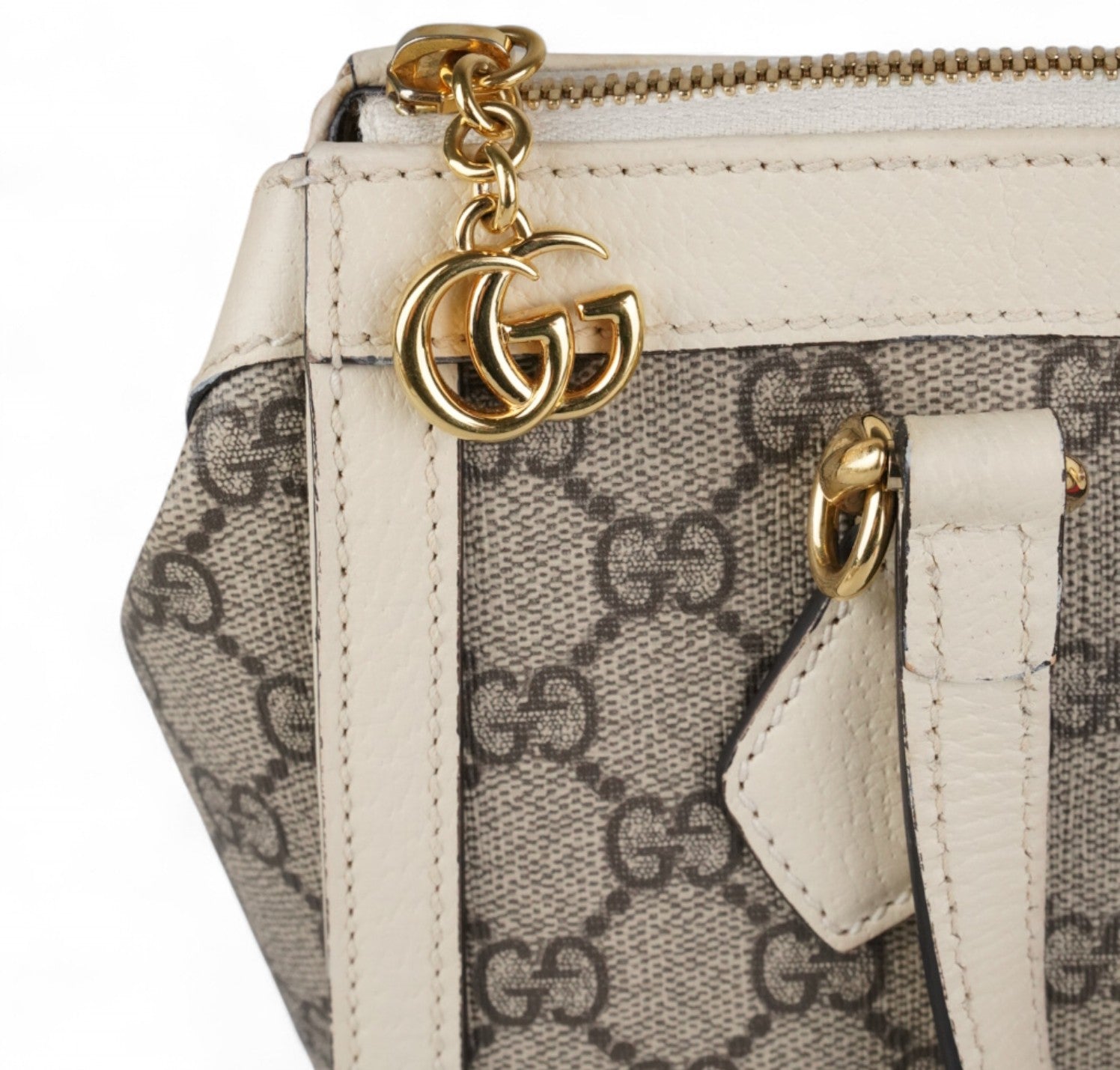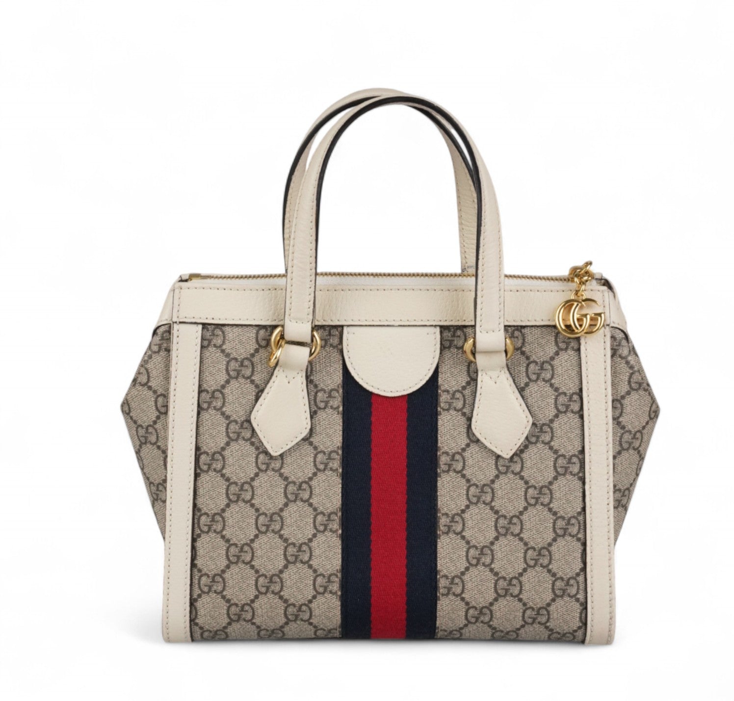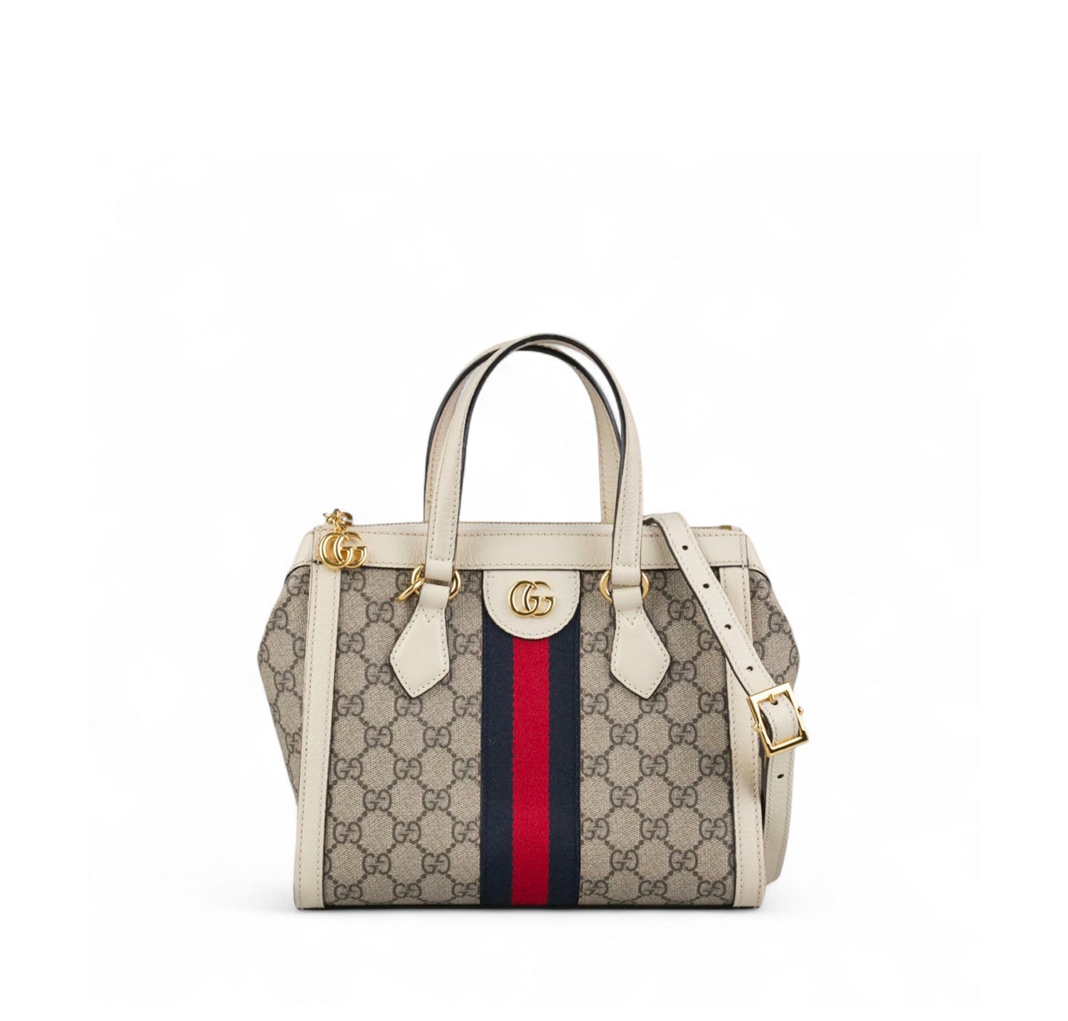 Gucci bag, Ophidia Shopping model, Small size, made of GG Supreme Canvas, embellished with Web Ribbon in shades of red and blue. Gold-colored metal finishes. Ivory leather details. Internally lined in suede-effect microfiber with single compartment, applied pocket. Top zip closure. Equipped with top handles for carrying by hand. Detachable and adjustable shoulder strap for shoulder or crossbody carry. Shows light general wear on leather. Light interior wear.