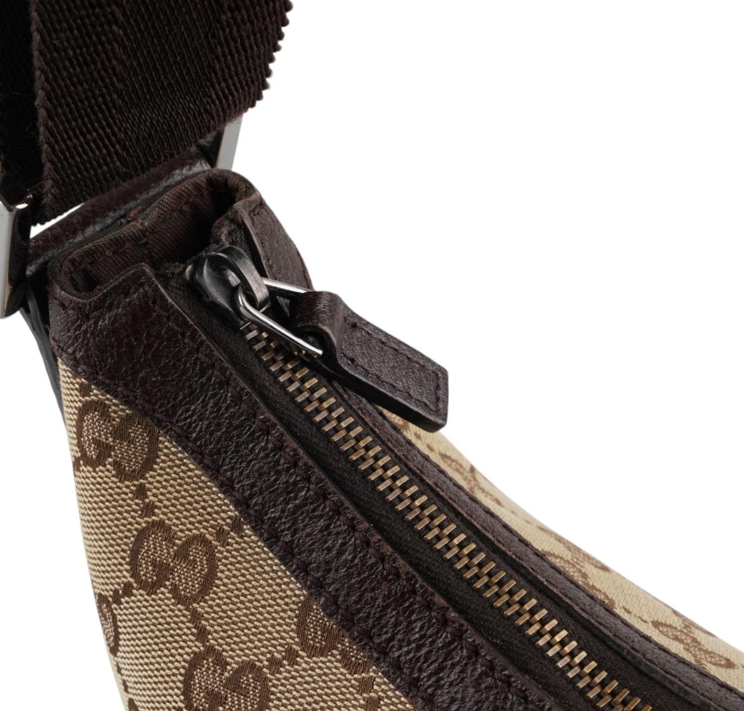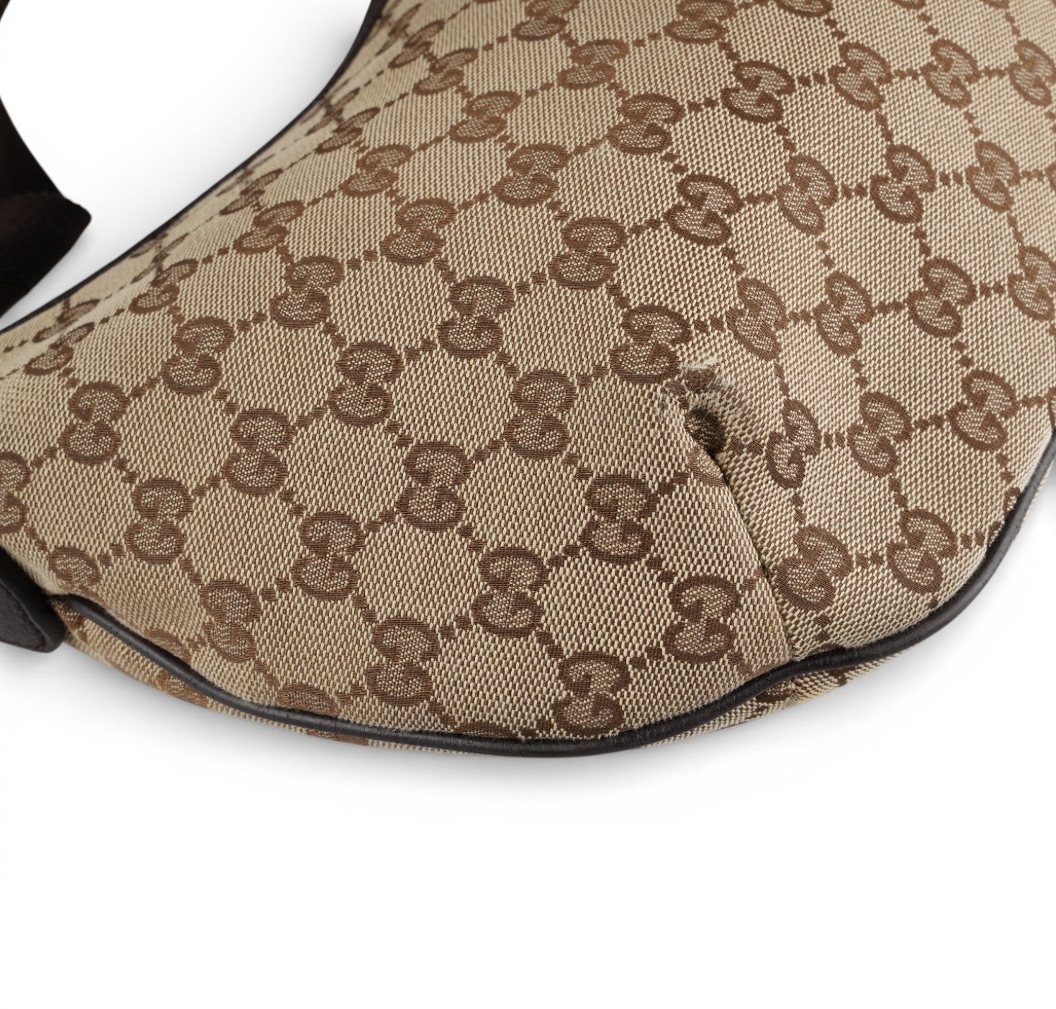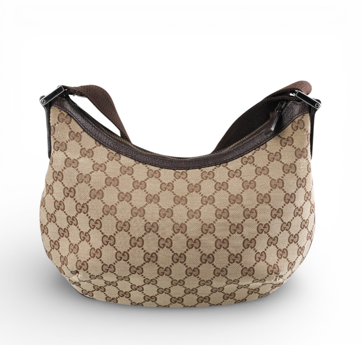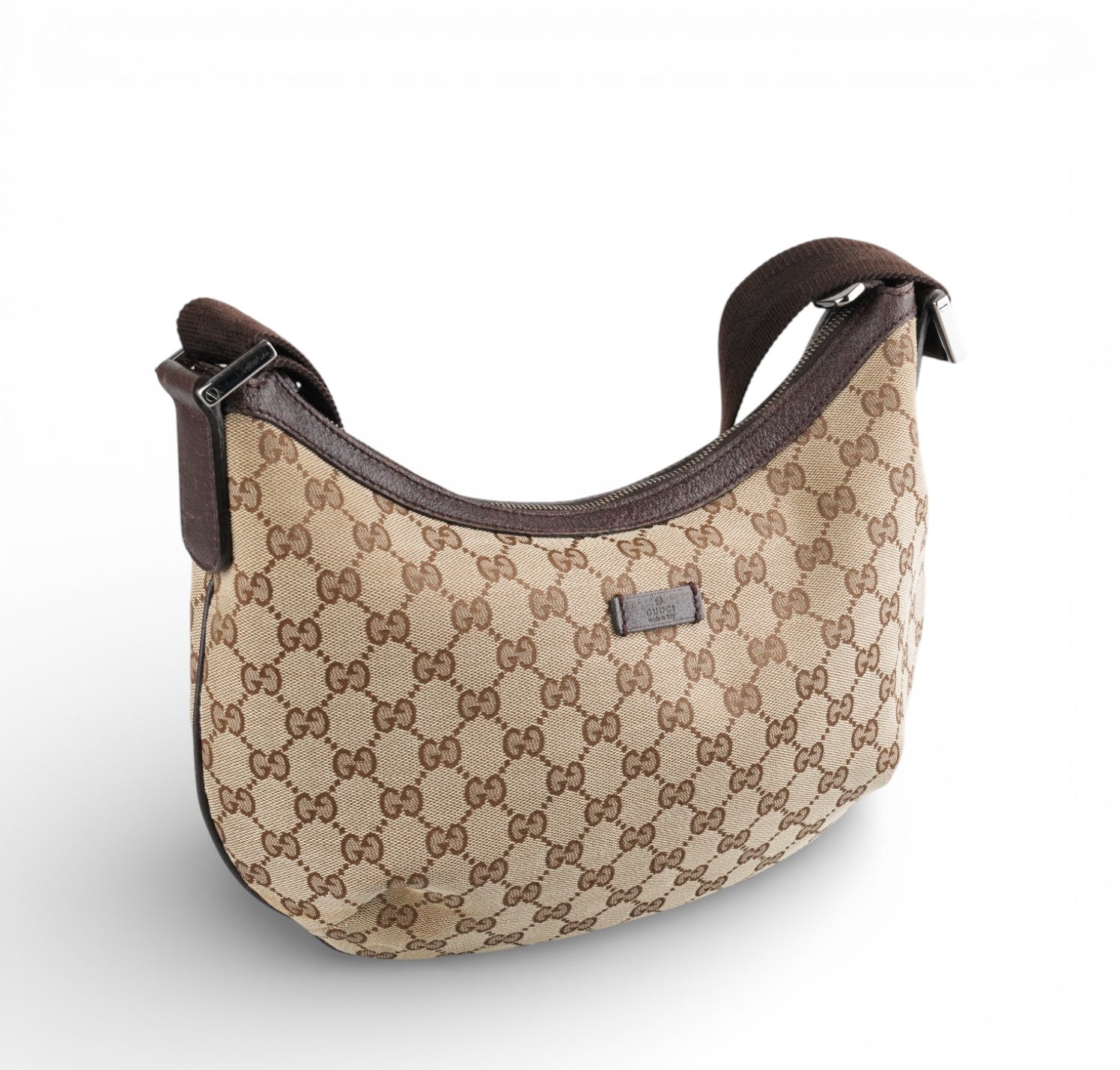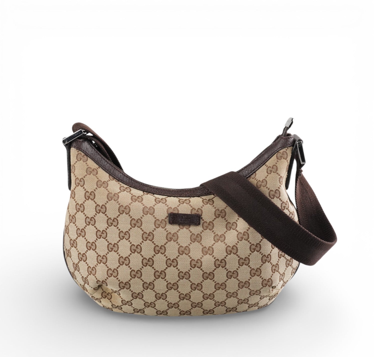 Borsa Gucci, modello Half Moon, realizzata in Tela GG Beige. Finiture in Pelle Marrone. Metalleria Argentata. Pratica forma a mezzaluna con chiusura superiore con zip. Interno foderato in tessuto, taschino piatto. Munita di tracolla regolabile in tessuto tecnico. Segni generali, graffi metalleria, segni di sfregamento agli angoli.