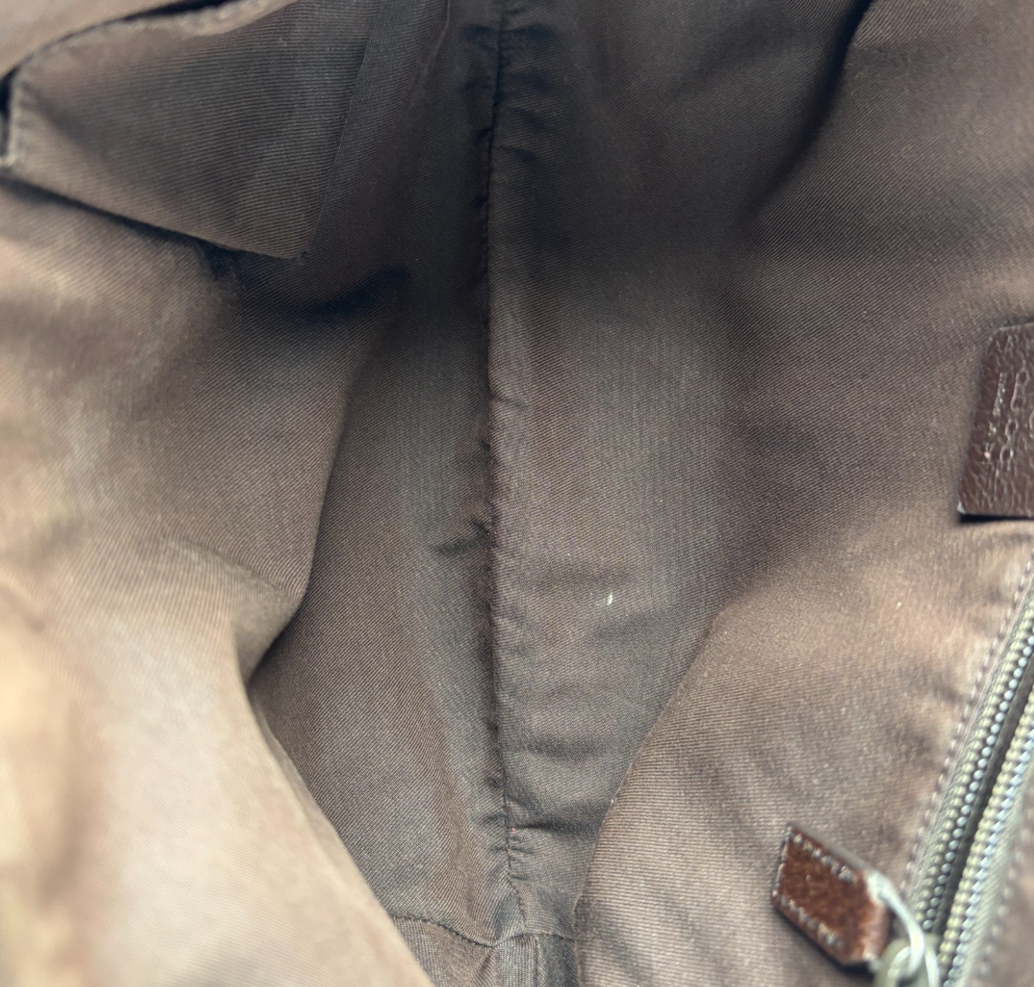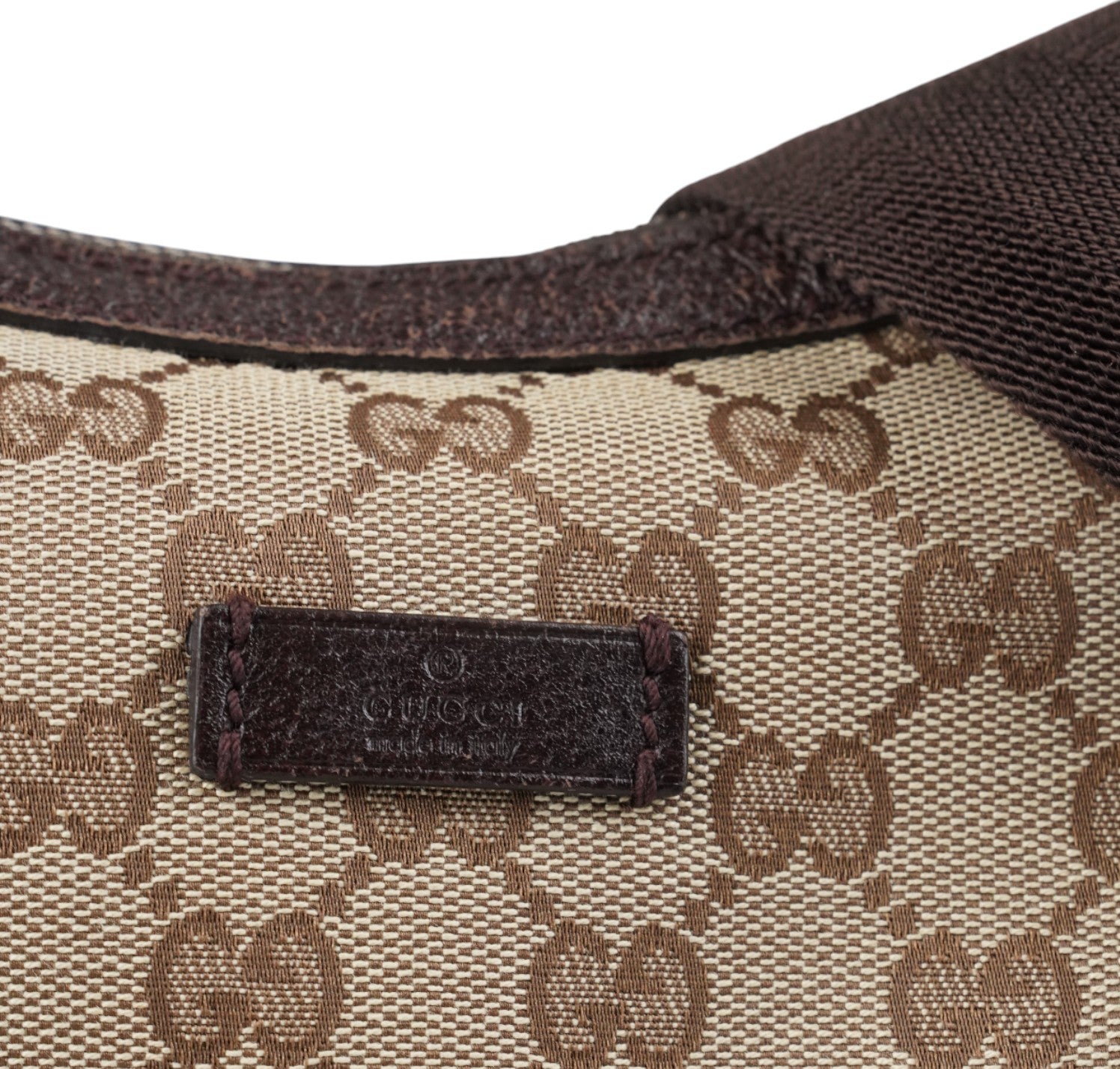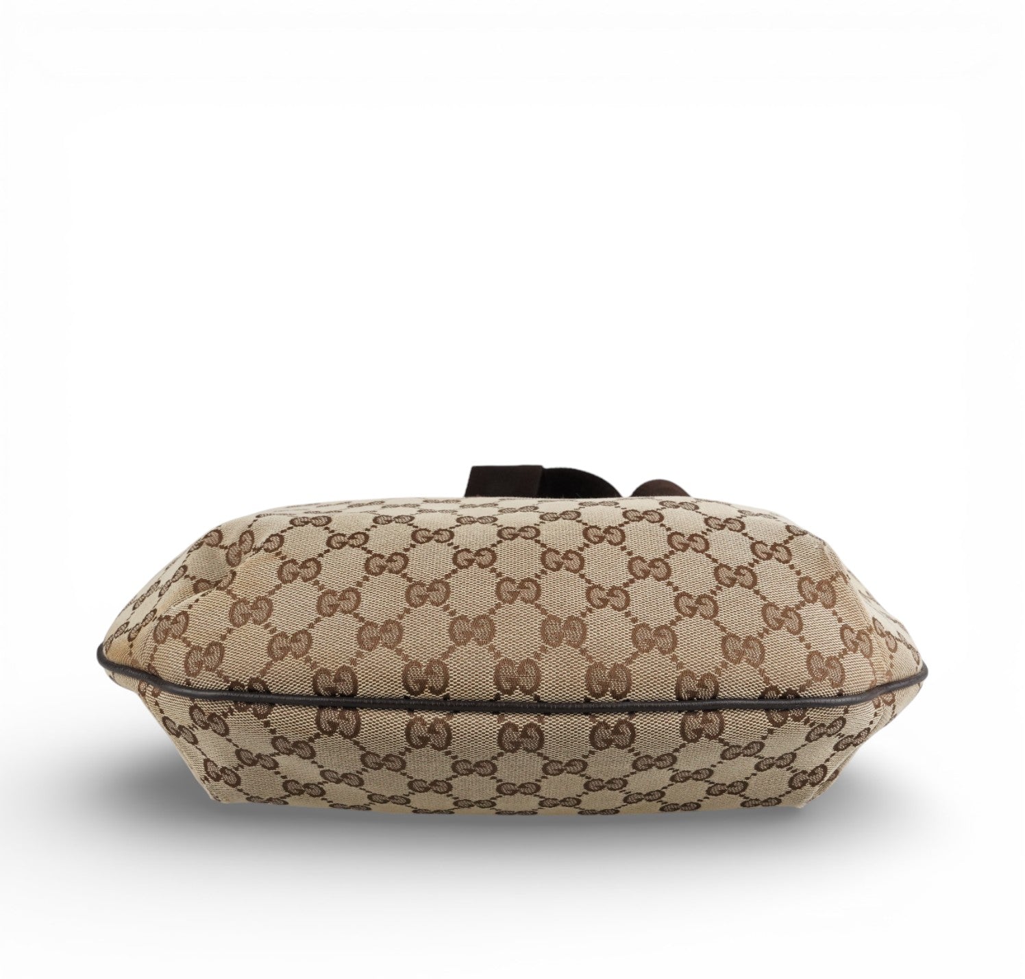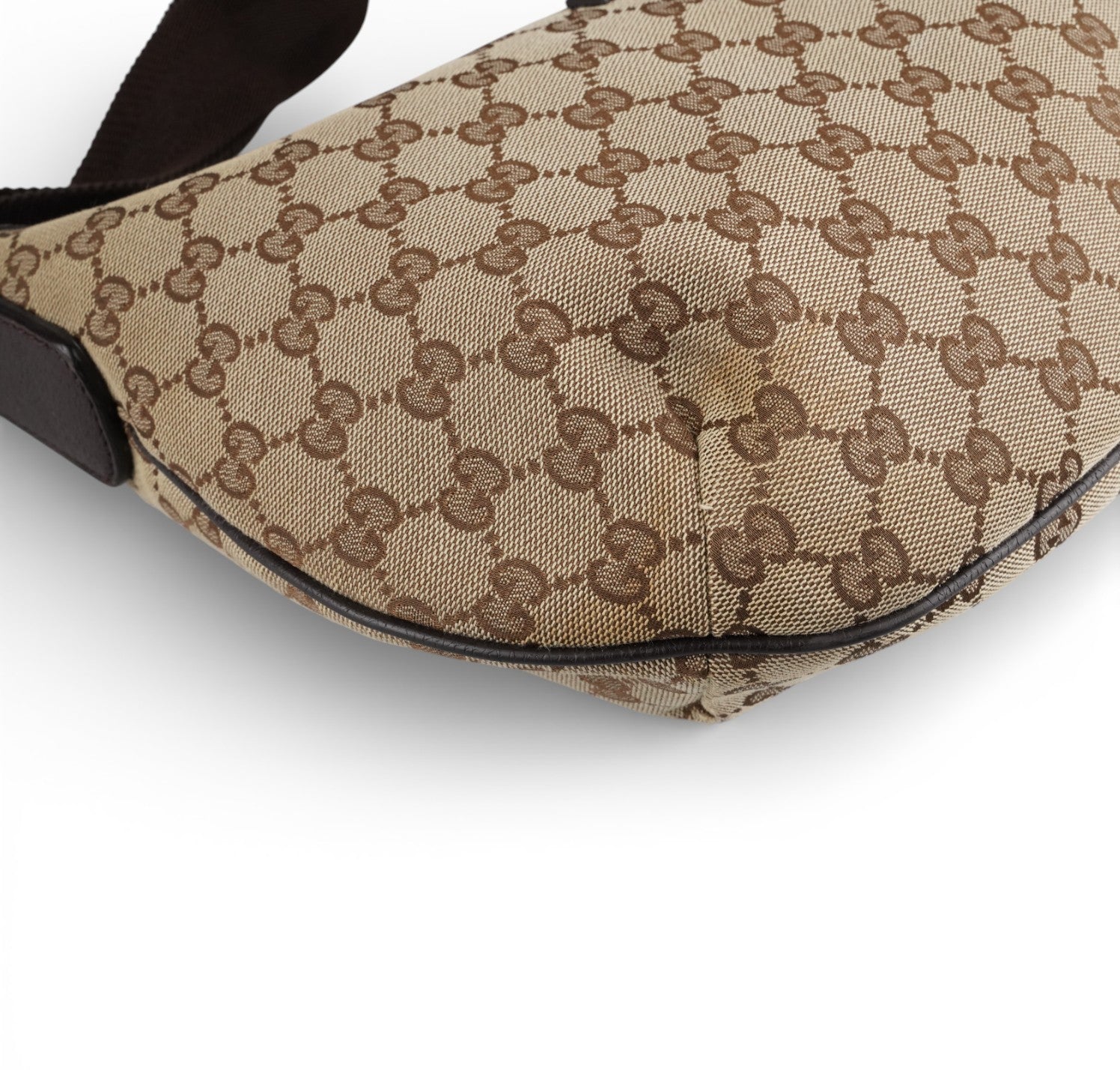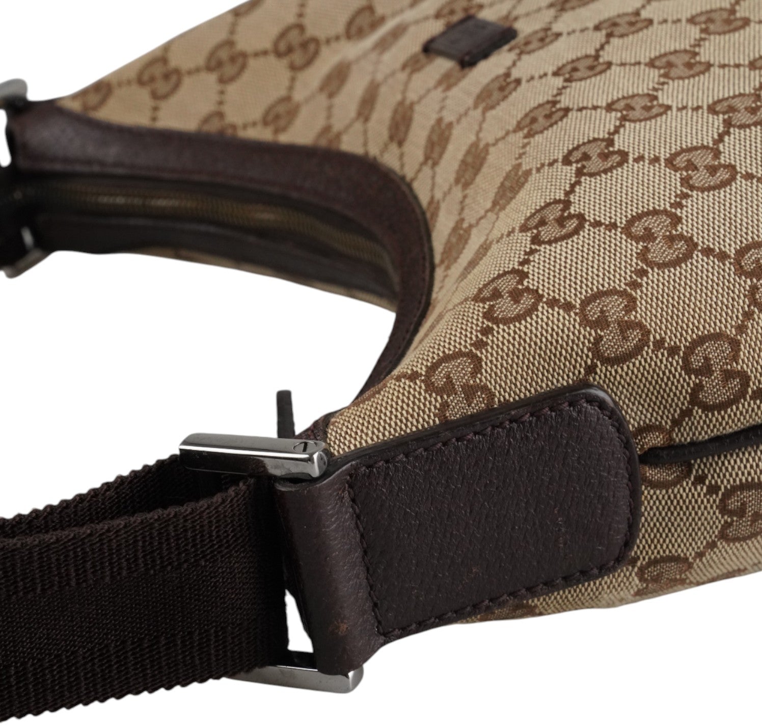 Borsa Gucci, modello Half Moon, realizzata in Tela GG Beige. Finiture in Pelle Marrone. Metalleria Argentata. Pratica forma a mezzaluna con chiusura superiore con zip. Interno foderato in tessuto, taschino piatto. Munita di tracolla regolabile in tessuto tecnico. Segni generali, graffi metalleria, segni di sfregamento agli angoli.