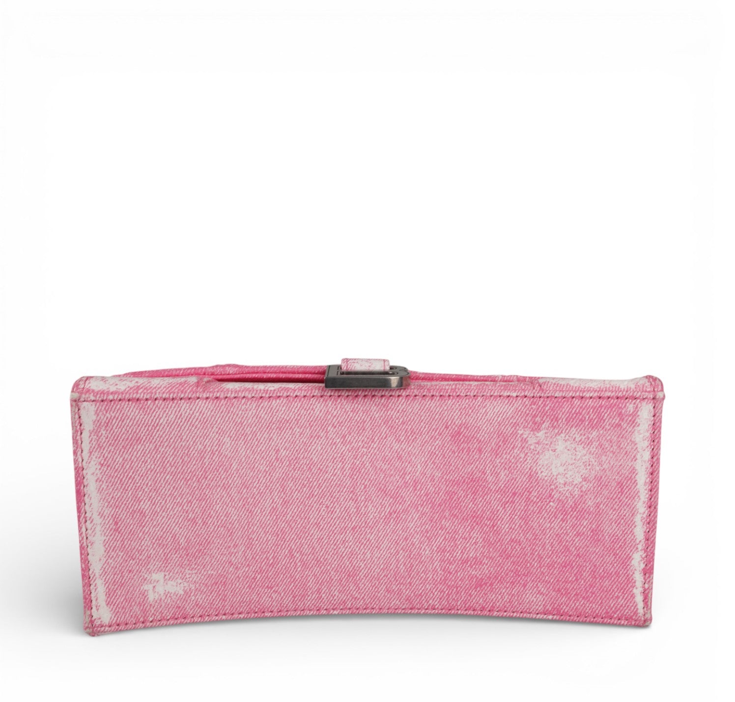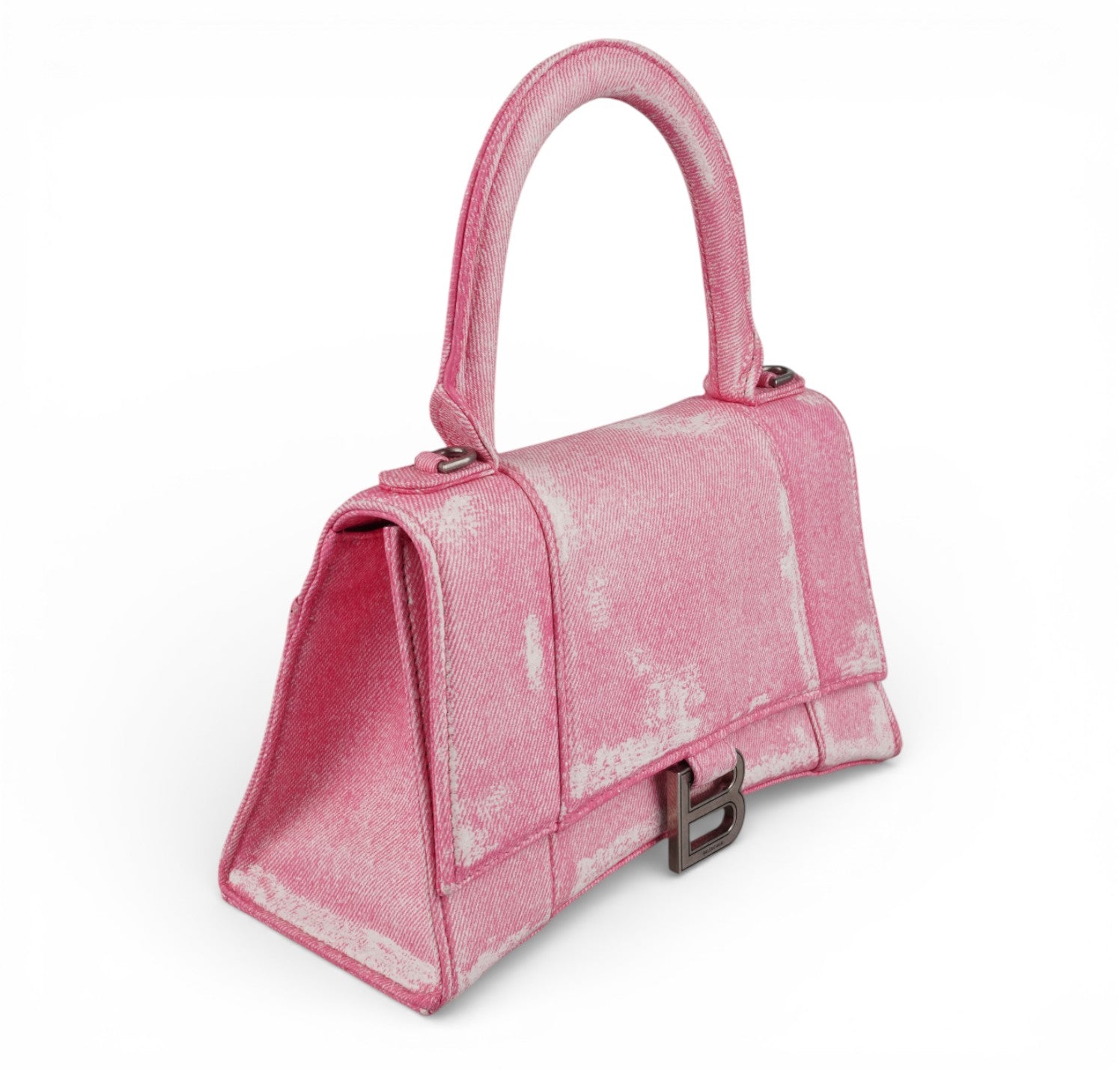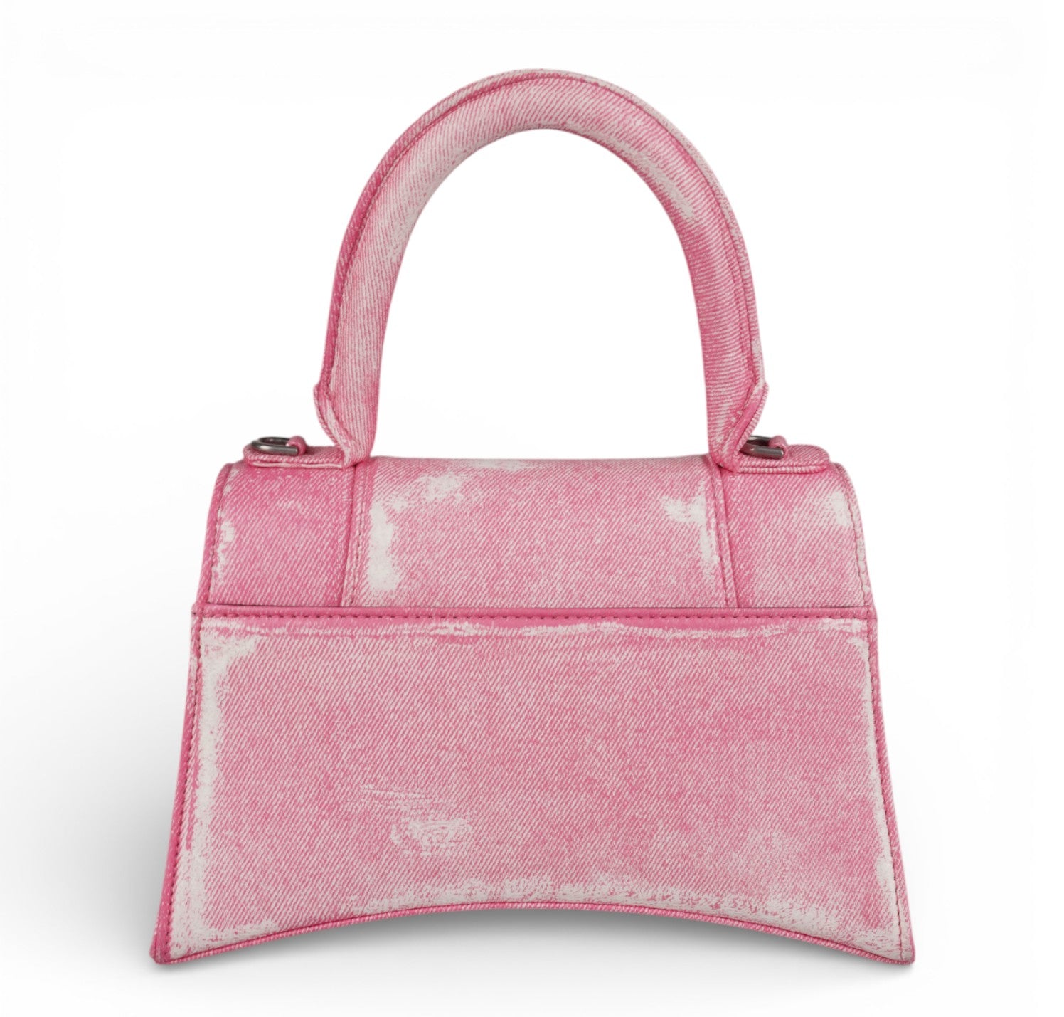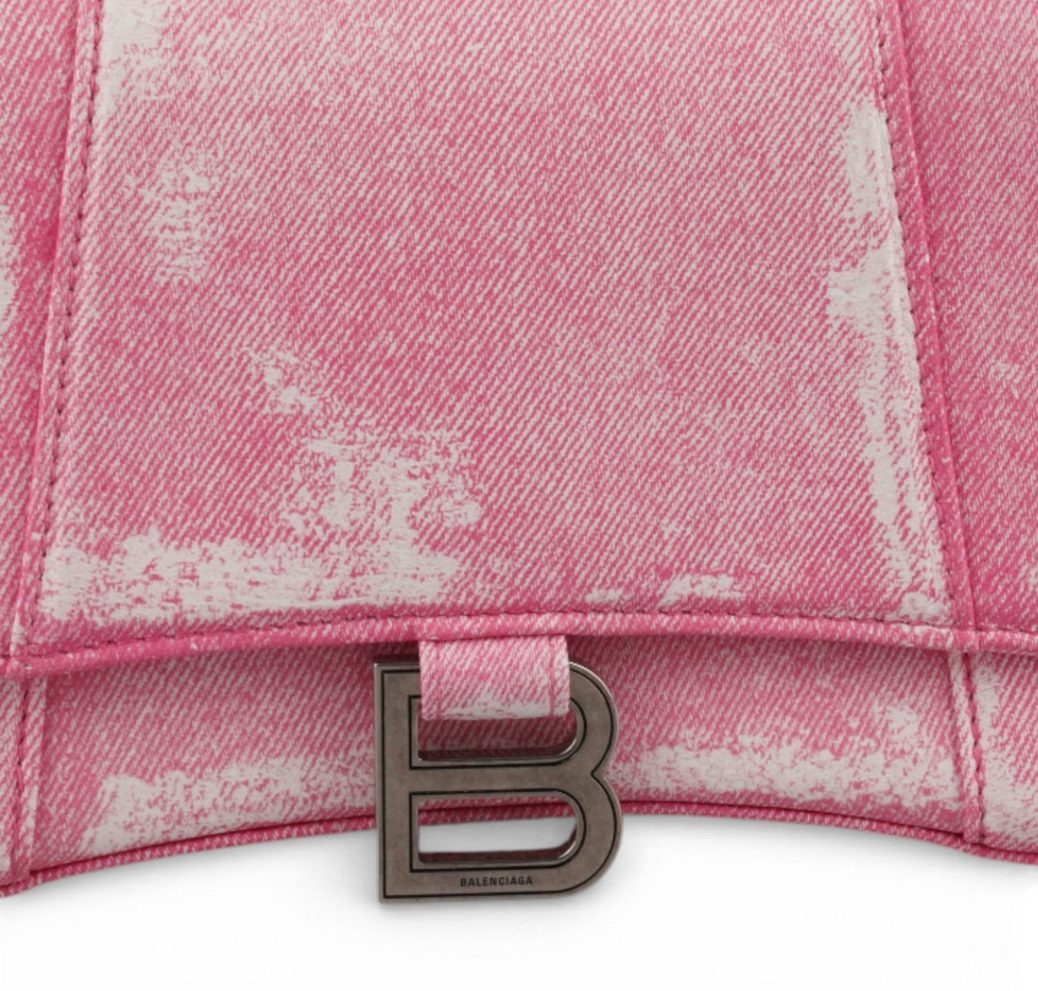Borsa Balenciaga, modello Hourglass, in Denim Rosa effetto Washed, dal design iconico con silhouette strutturata e curvilinea. Chiusura frontale con logo B in metallo, manico superiore e tracolla regolabile e rimovibile per un utilizzo a mano o crossbody. Interno in pelle con tasca zip. Moderna e di carattere, perfetta per valorizzare ogni look. Pari al nuovo, condizioni eccellenti. Potrebbe presentare micro segni di stoccaggio.