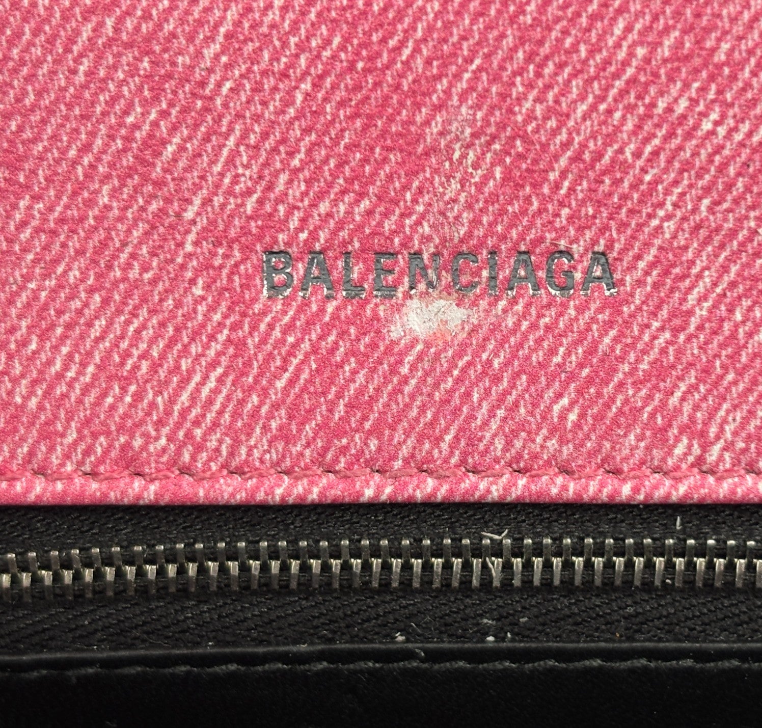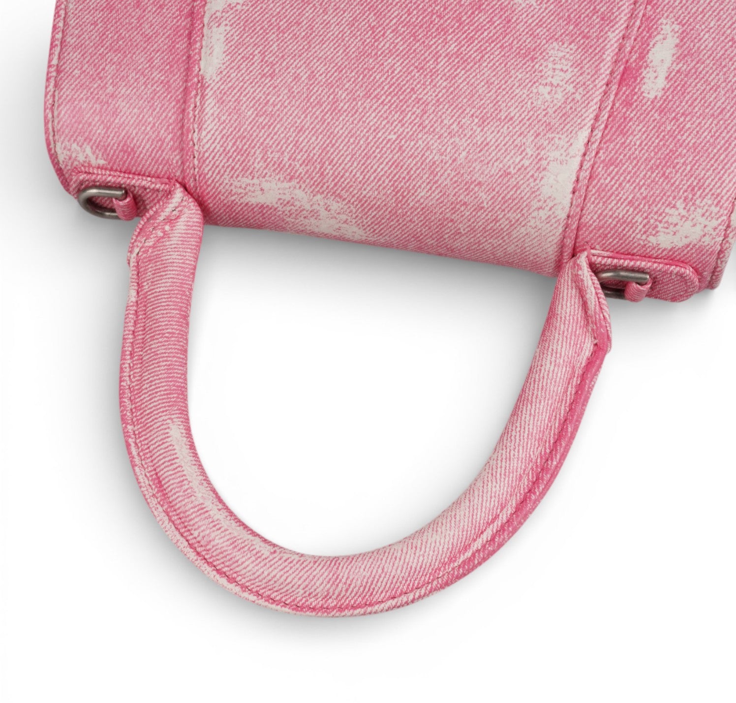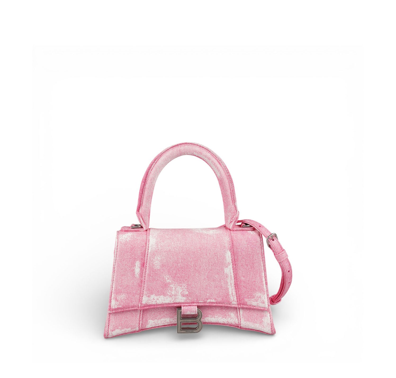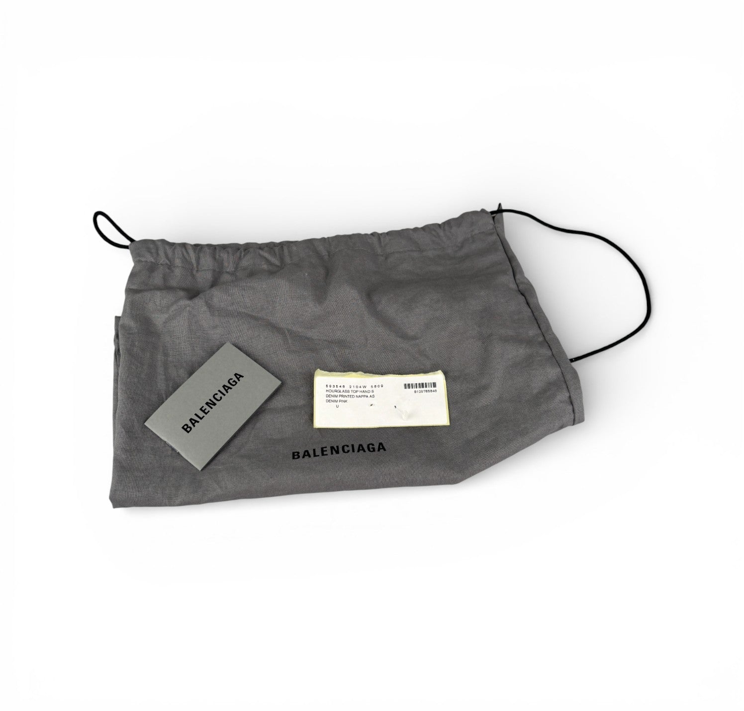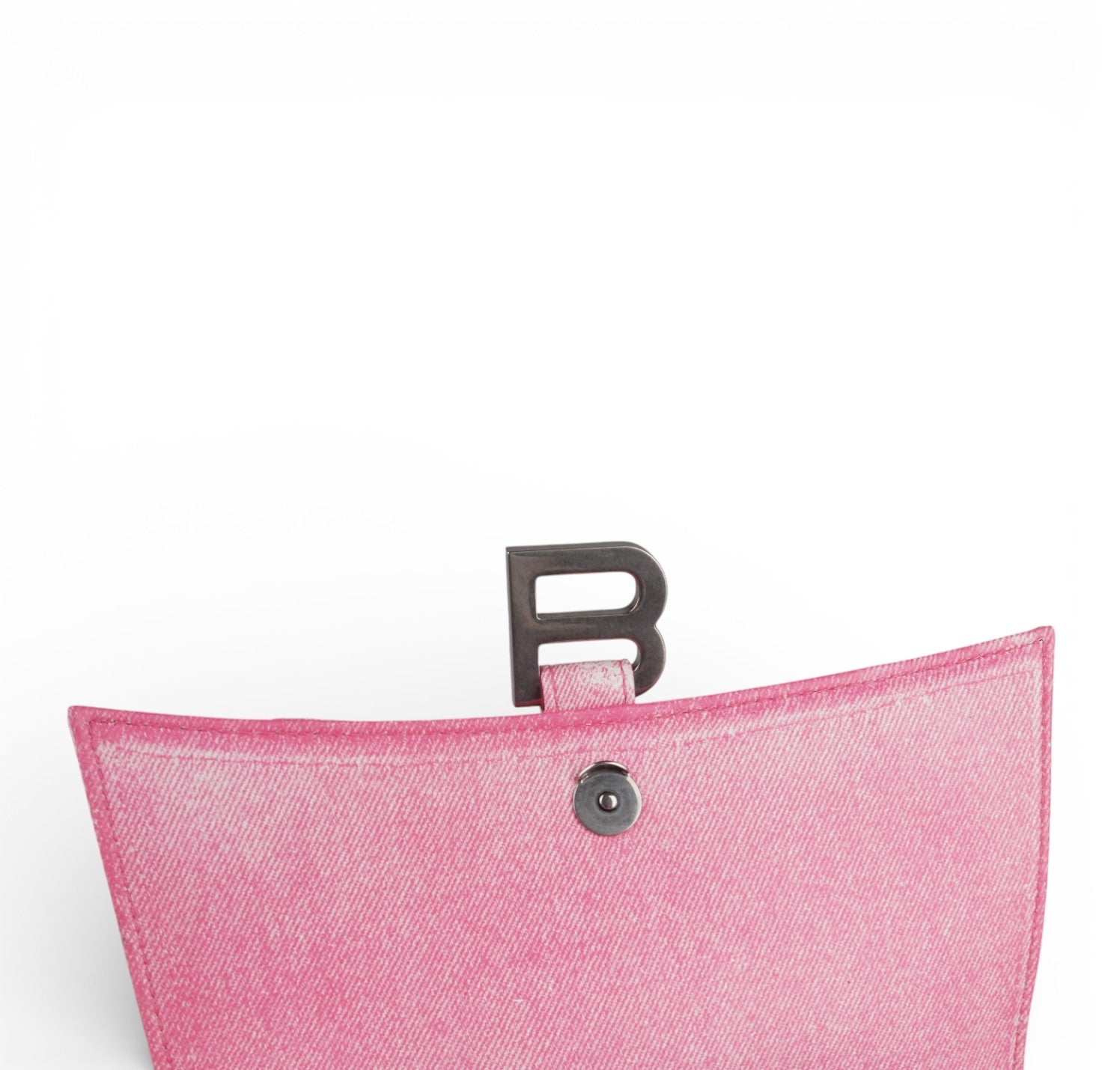 Borsa Balenciaga, modello Hourglass, in Denim Rosa effetto Washed, dal design iconico con silhouette strutturata e curvilinea. Chiusura frontale con logo B in metallo, manico superiore e tracolla regolabile e rimovibile per un utilizzo a mano o crossbody. Interno in pelle con tasca zip. Moderna e di carattere, perfetta per valorizzare ogni look. Pari al nuovo, condizioni eccellenti. Potrebbe presentare micro segni di stoccaggio.