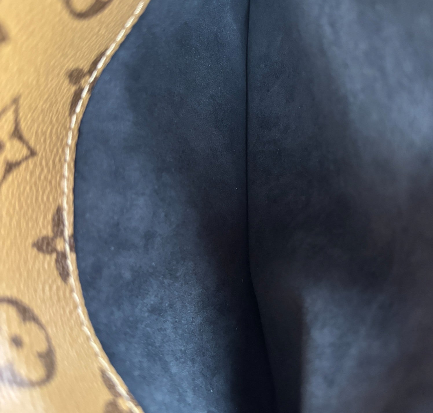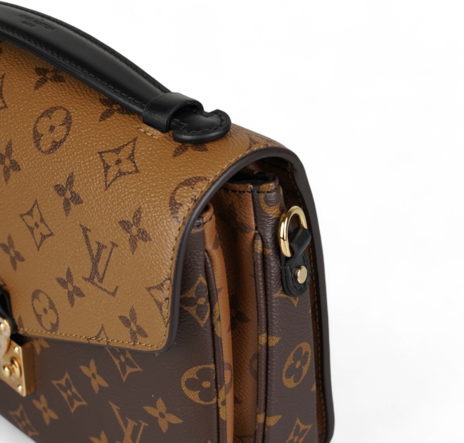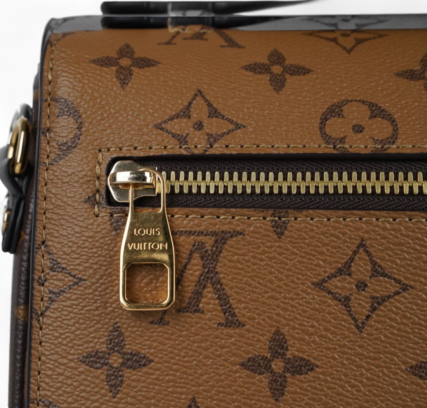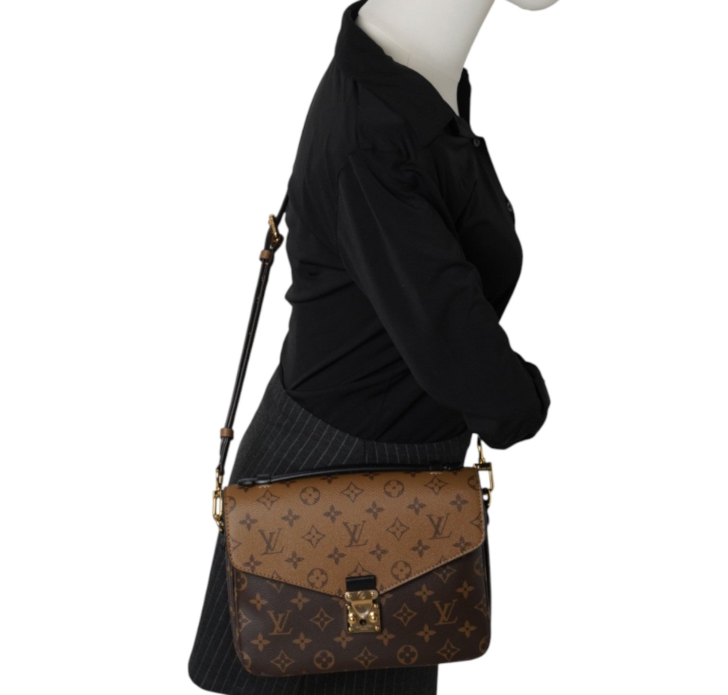 Louis Vuitton bag, Pochette Métis model, made of Monogram Reverse Canvas. Black cowhide finishing. Gold metal parts. Closure on front flap with s-locking system. External zip pocket applied on the back. Interior lined in black fabric, divided into practical compartments. Equipped with adjustable upper shoulder strap for personalized transport. Light general signs of use. Signs of use on metal parts. Light internal odor.