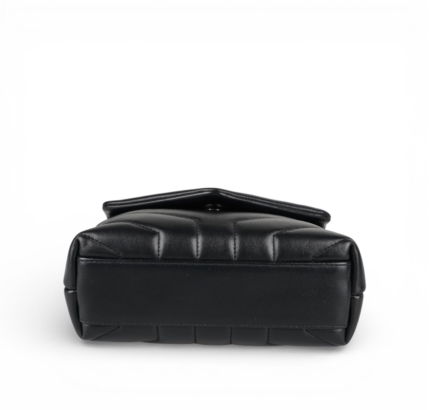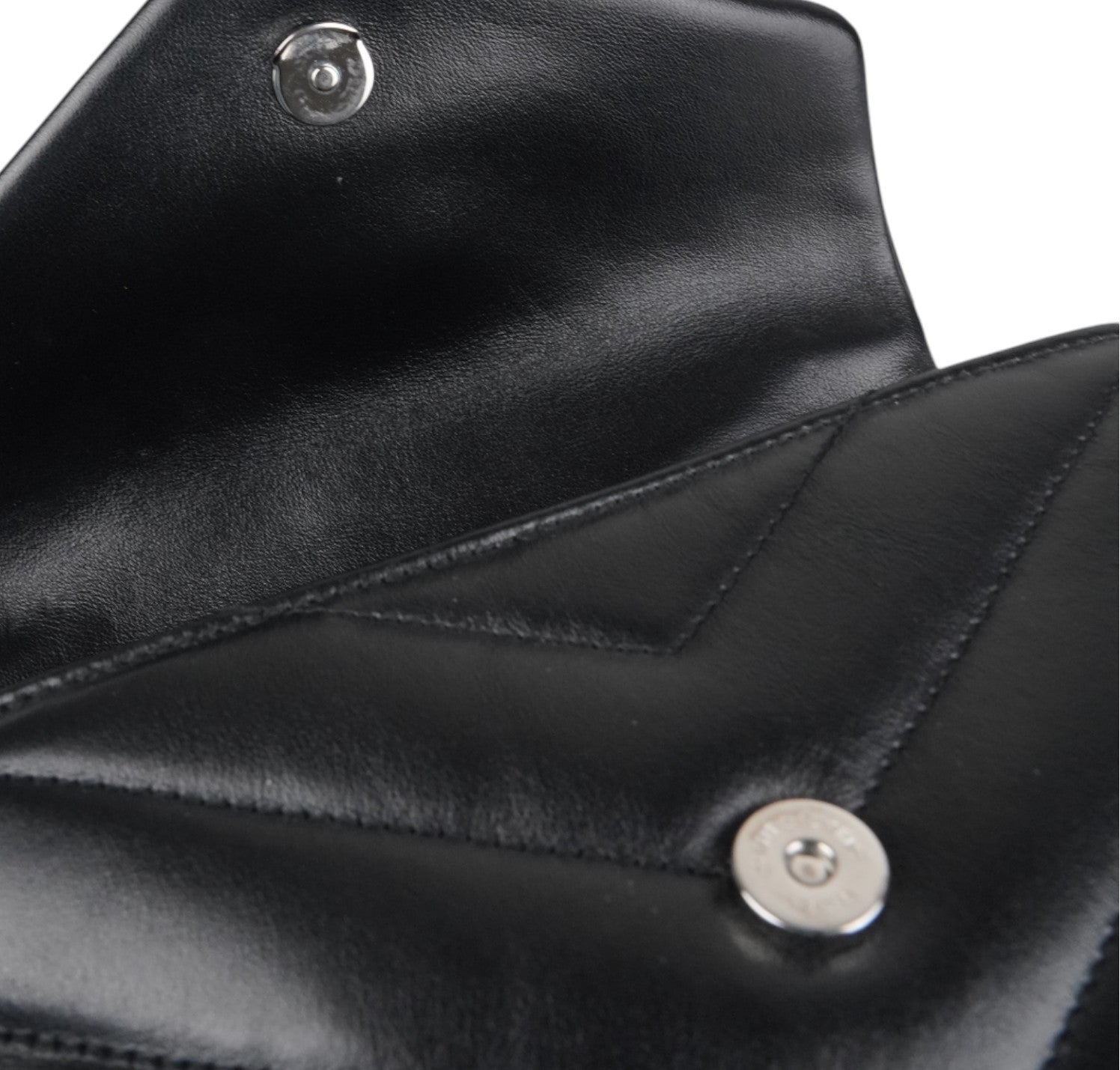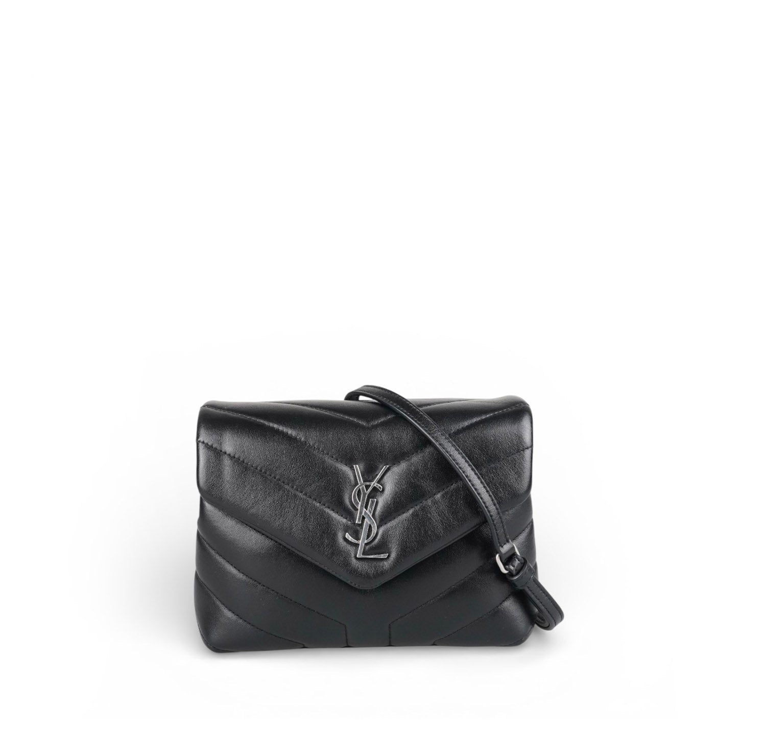 Saint Laurent bag, Loulou model, Toy size, made of Black Leather. Silver-colored hardware. Practical and functional, ideal for both day and night use. Equipped with a removable and adjustable shoulder strap. Wearable on the shoulder, crossbody bag, or even as a Pouch by hand. Front snap closure embellished with YSL logo. Fabric-lined interior with two compartments, zip pocket. Very light signs of general use.