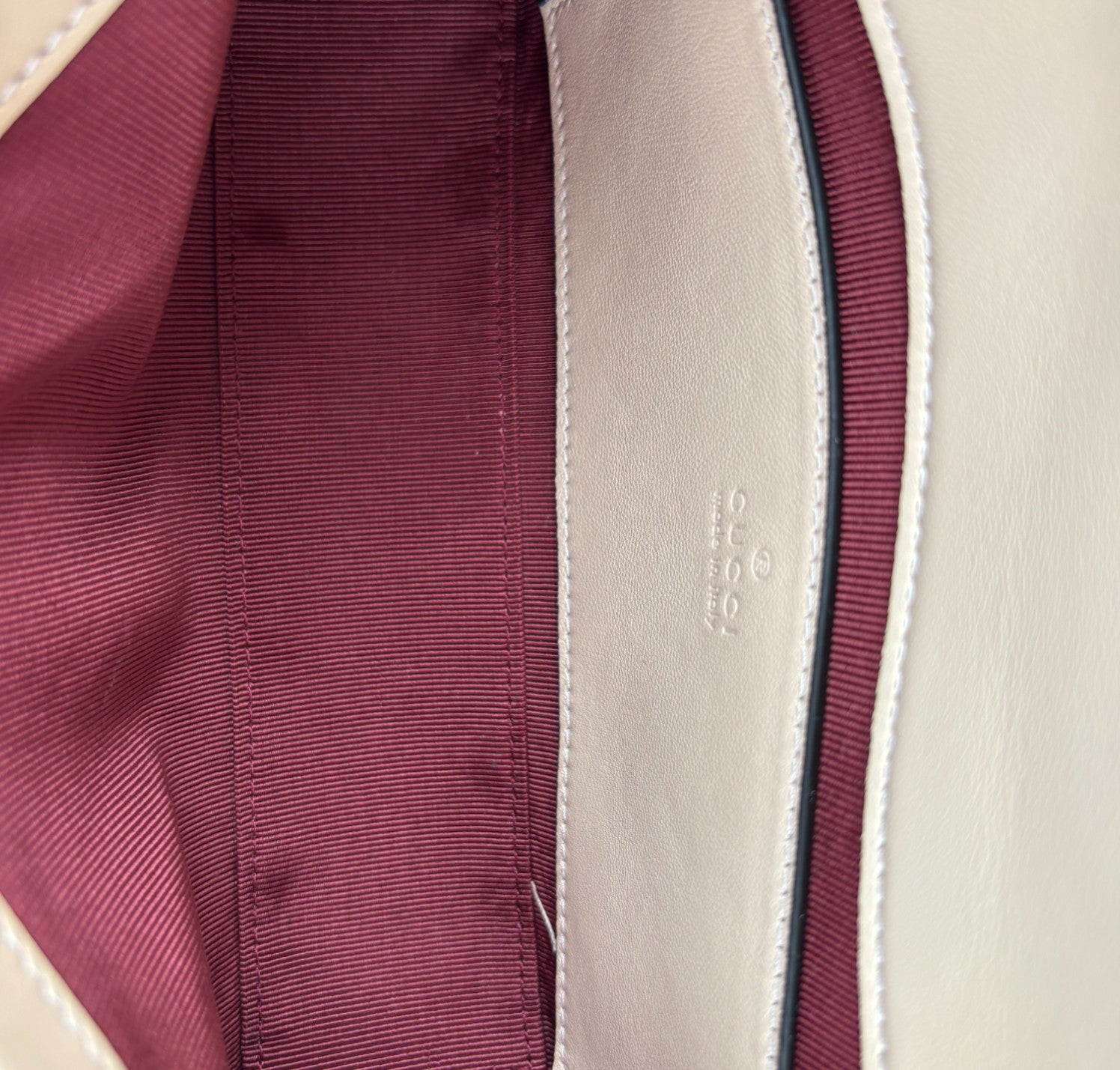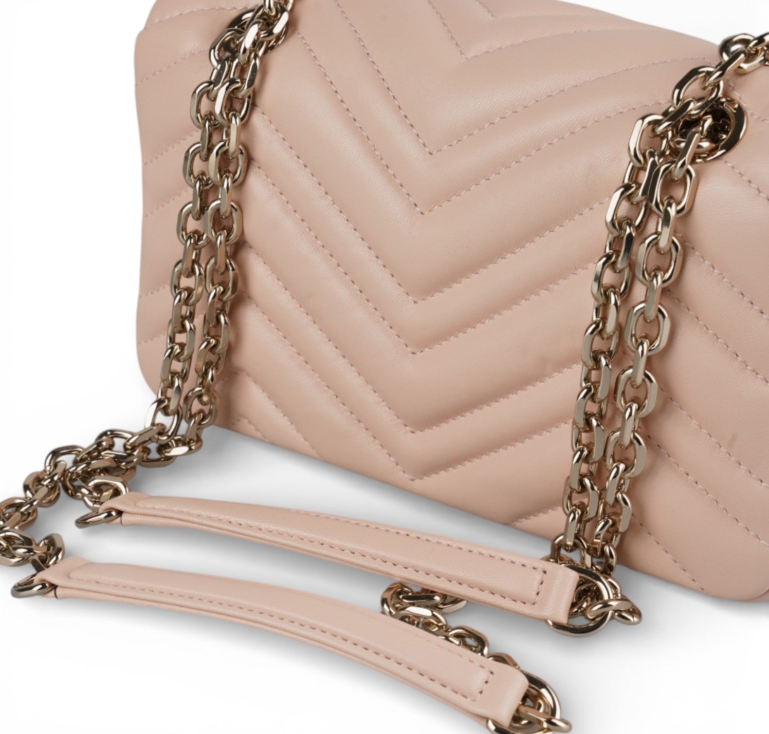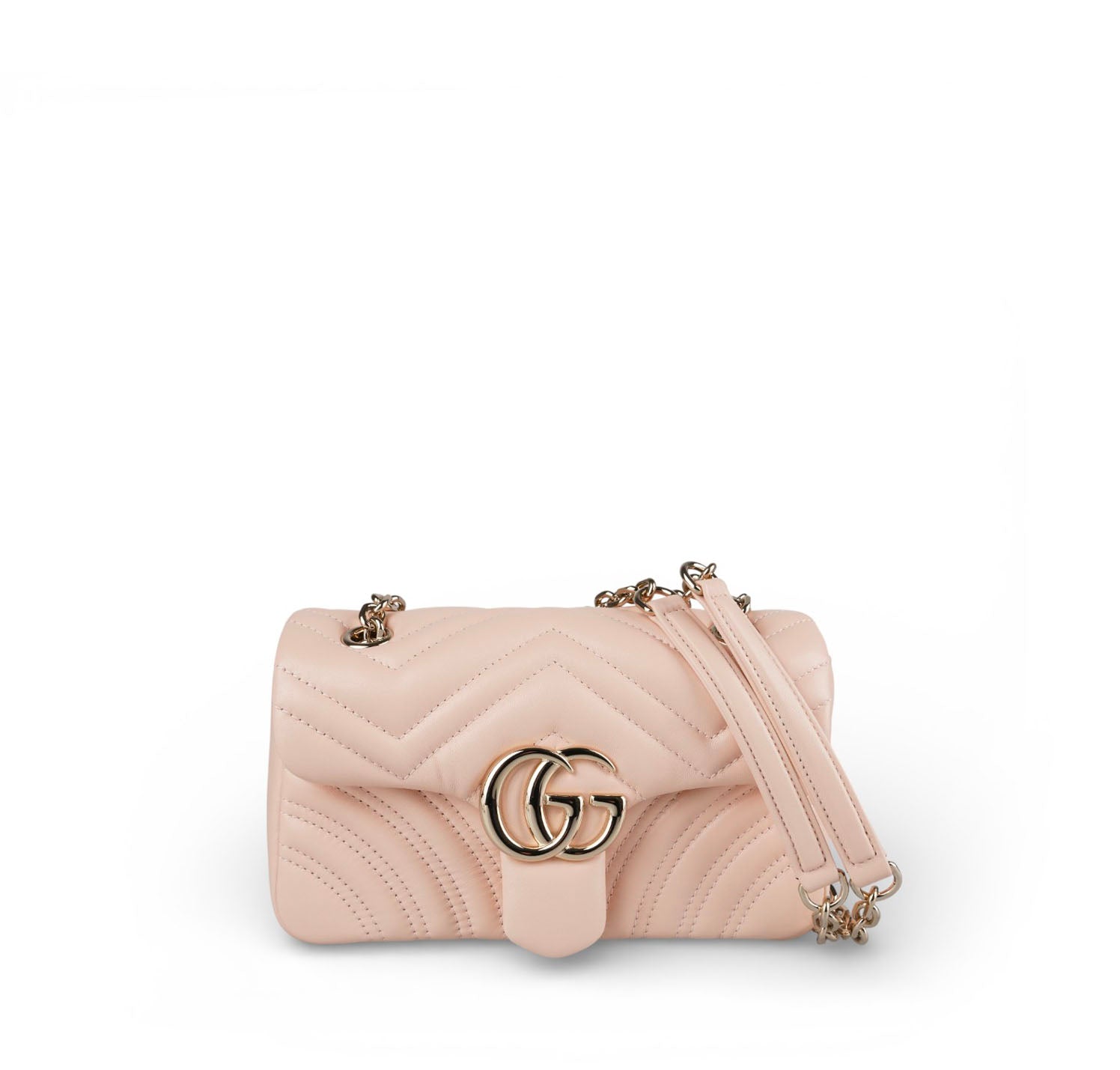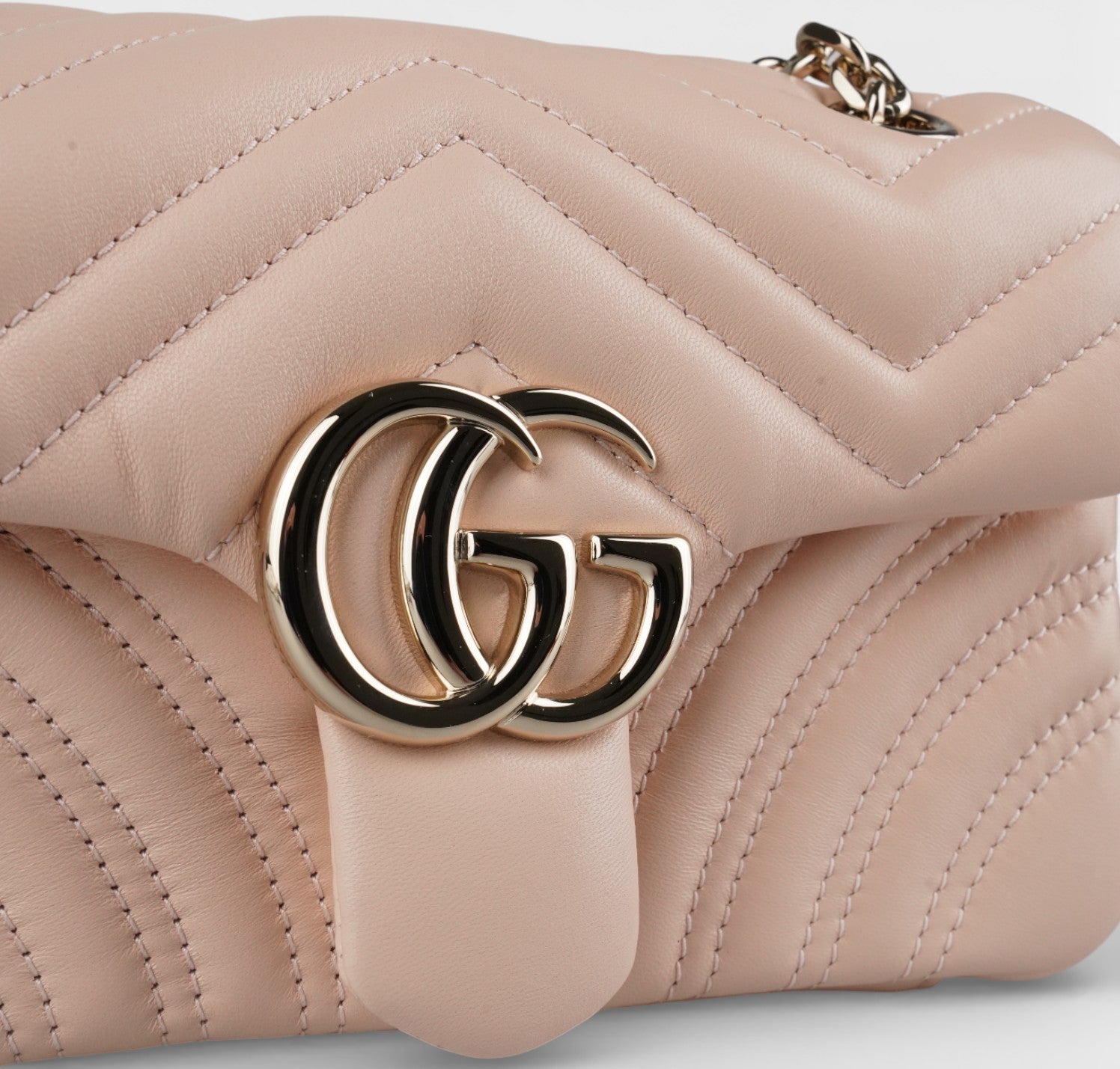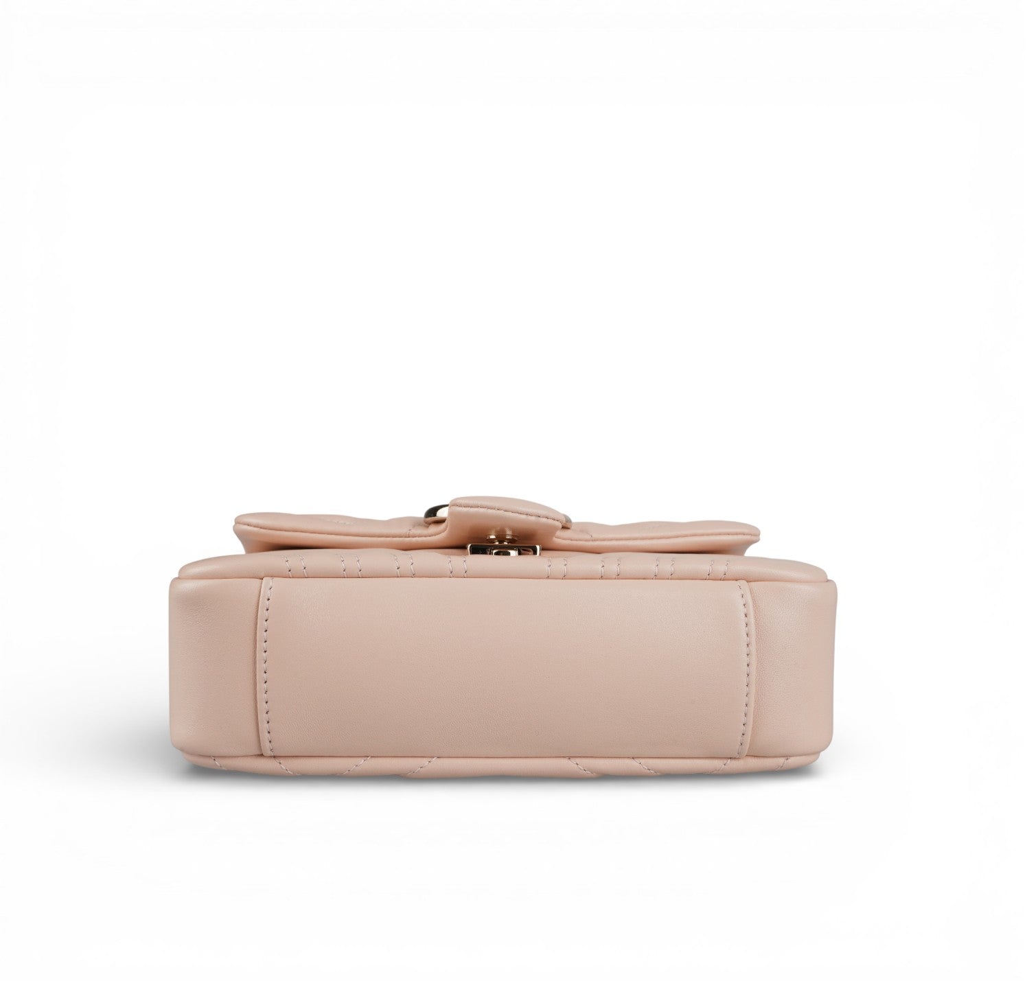 Borsa Gucci, modello GG Marmont, misura Small, nuova collezione. Realizzata in pelle matelassé color Beige Rosato. Caratterizzata dalla finitura metallica oro chiaro. Sul retro non è più presente il cuore ricamato, elemento distintivo della prima linea Marmont. Pattina con logo Double G e tracolla scorrevole in catena con doppio inserto in pelle. Interno nei toni del bordeaux, con tasca piatta. Mai indossata, pari al nuovo, potrebbe presentare micro segni di stoccaggio. Questa versione presenta la misura Small da 22 cm, più compatta, rispetto alla Small precedente da 26 cm.