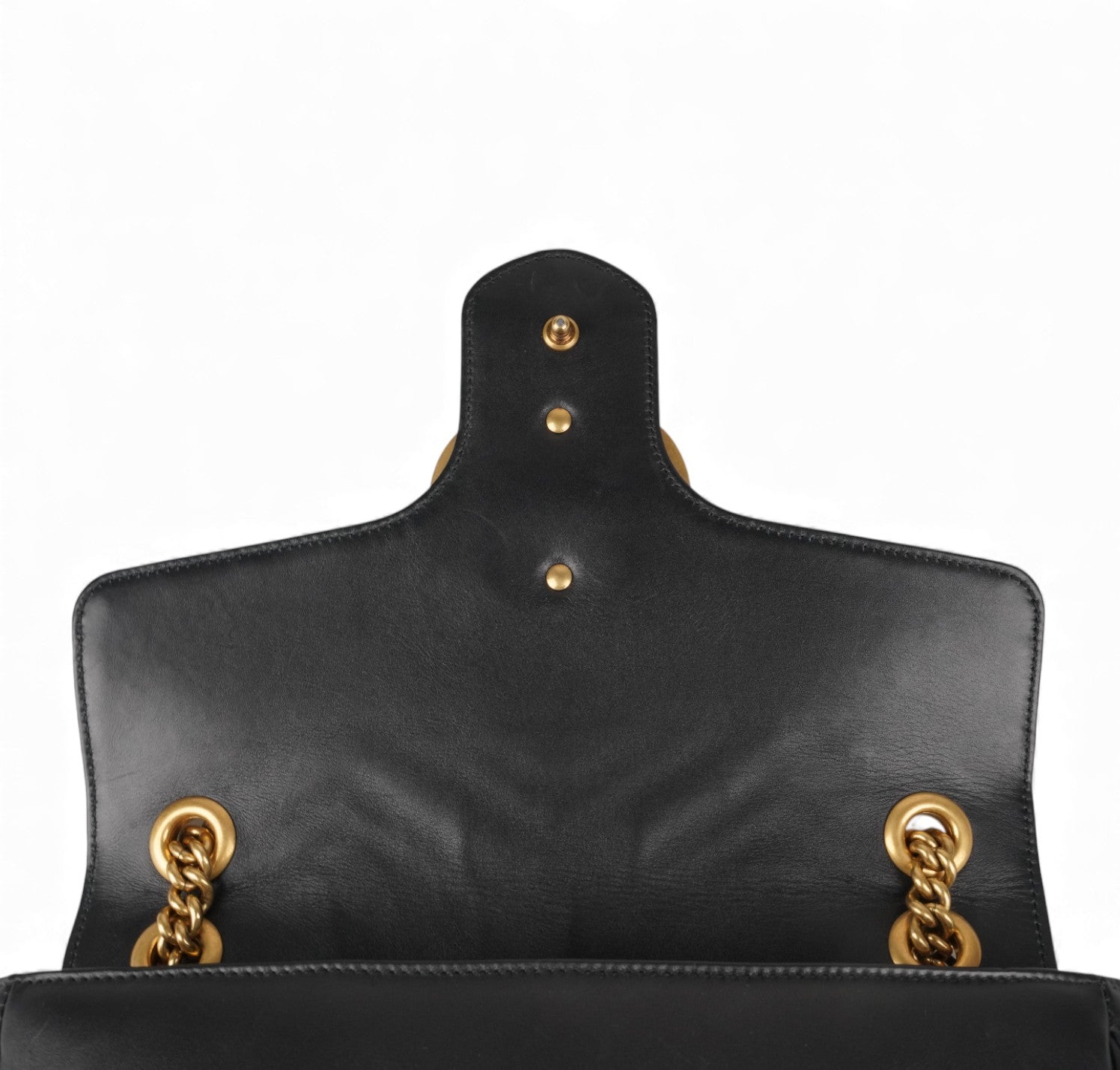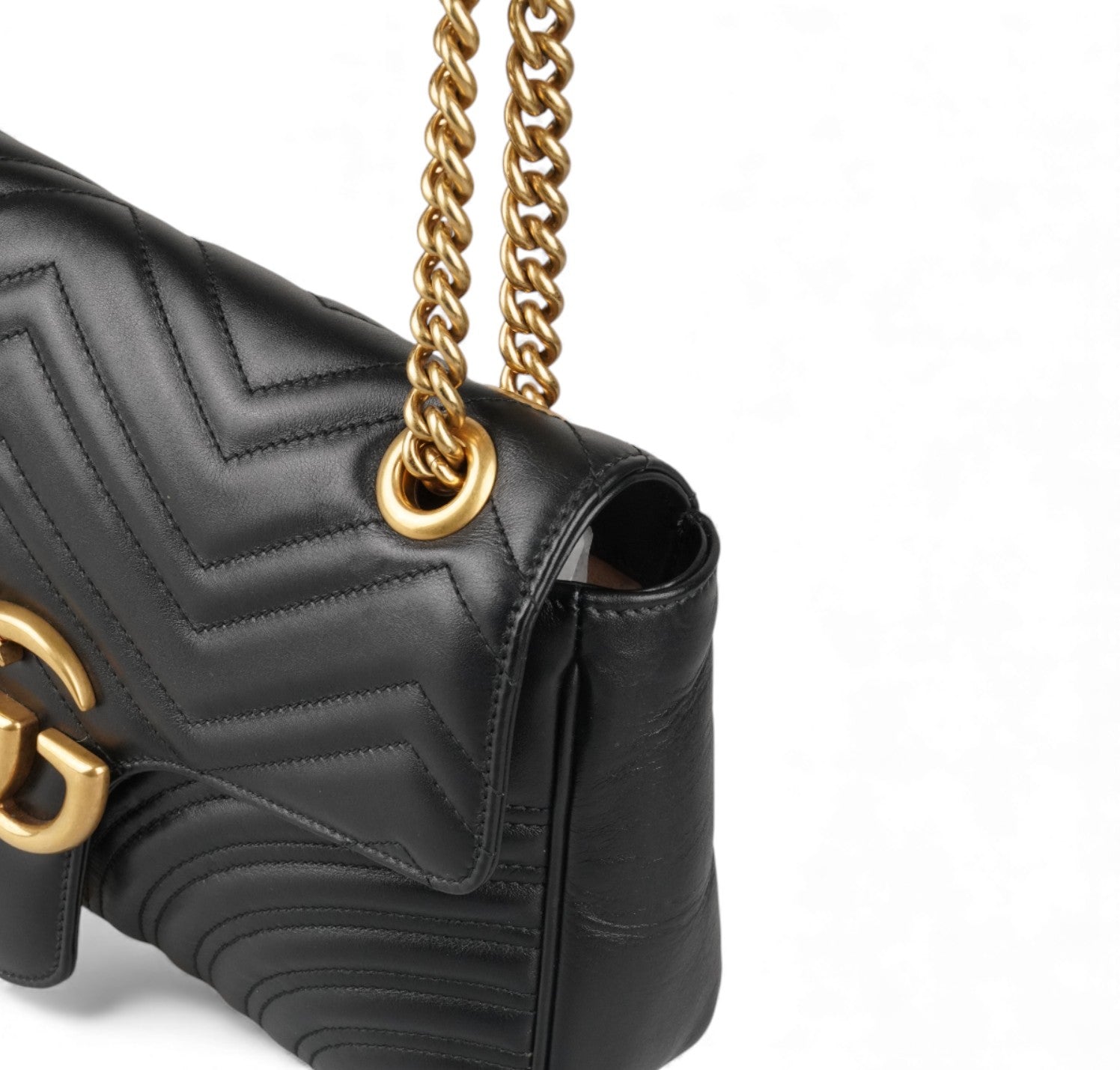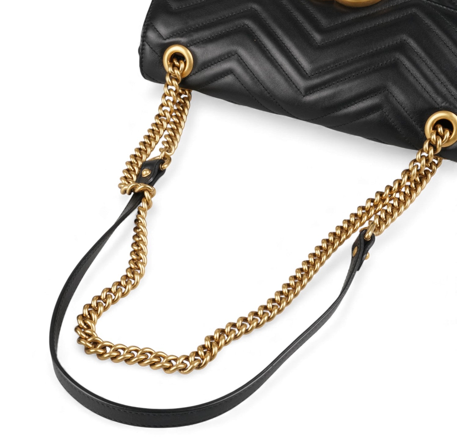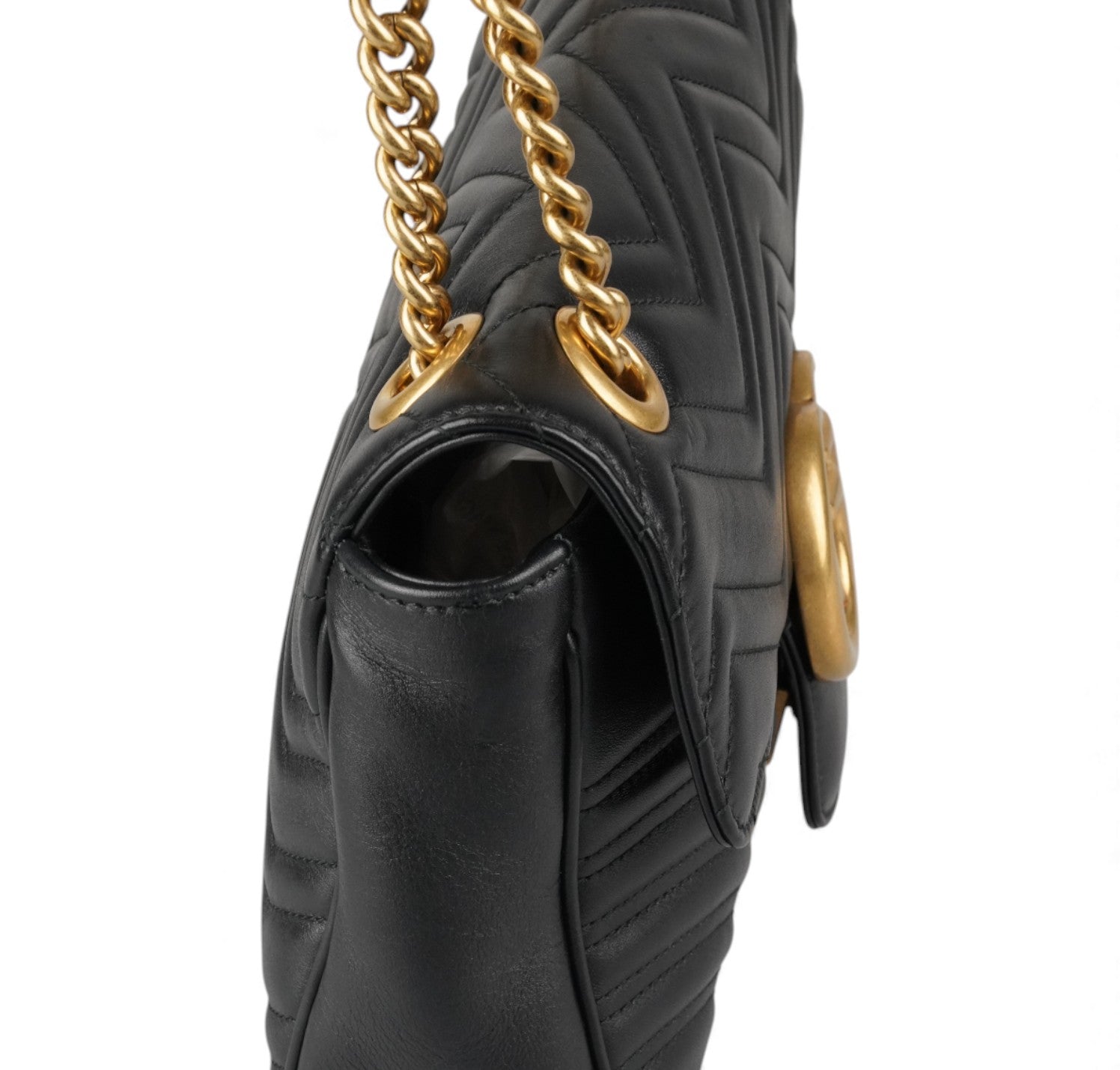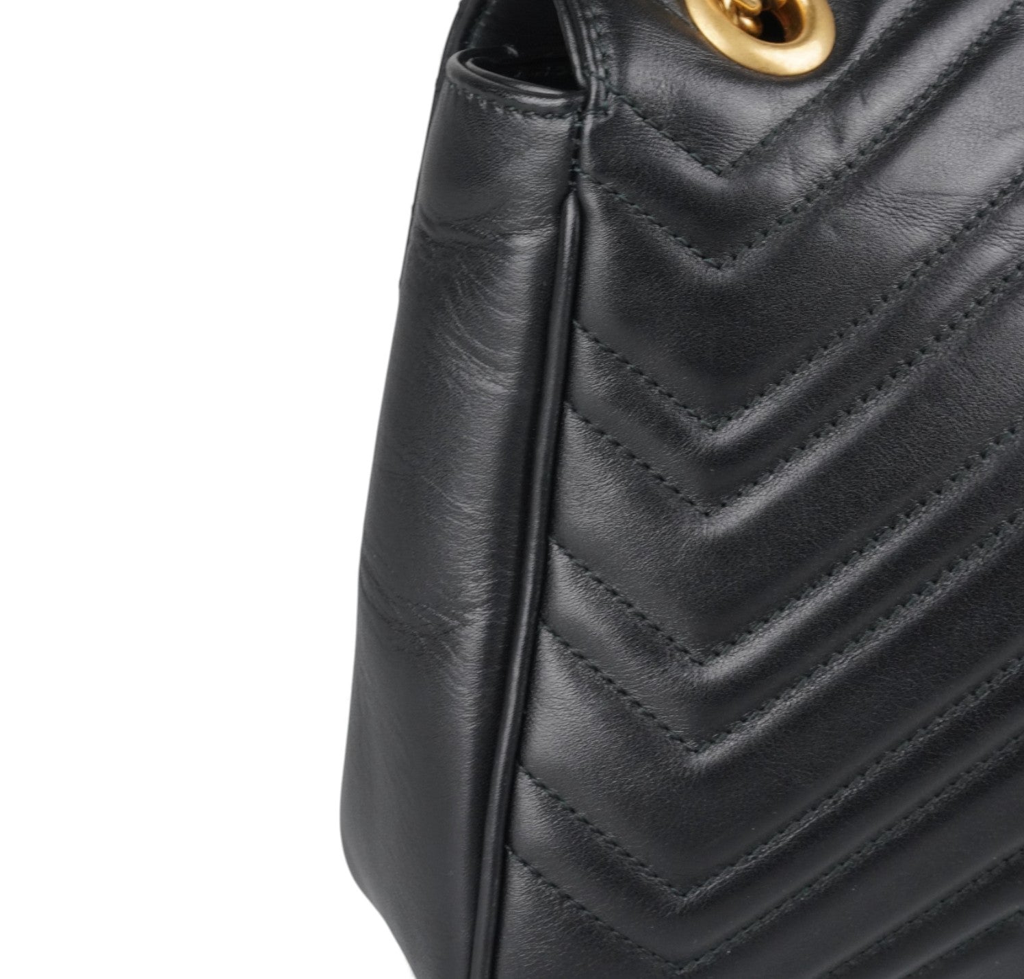 Gucci bag, Marmont model, made of leather Black matelassé embellished with a chevron motif. Antique Gold-colored metal hardware. Equipped with a sliding chain shoulder strap with leather shoulder pad. Front flap with spring closure and GG logo. Interior lined in suede-effect Microfiber Fabric. Wearable on the shoulder or as a crossbody bag. Minimal general signs of aging on the leather and hardware.