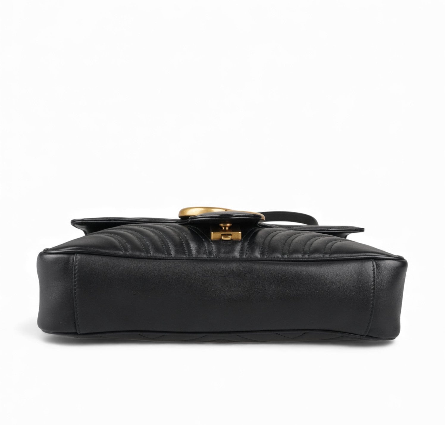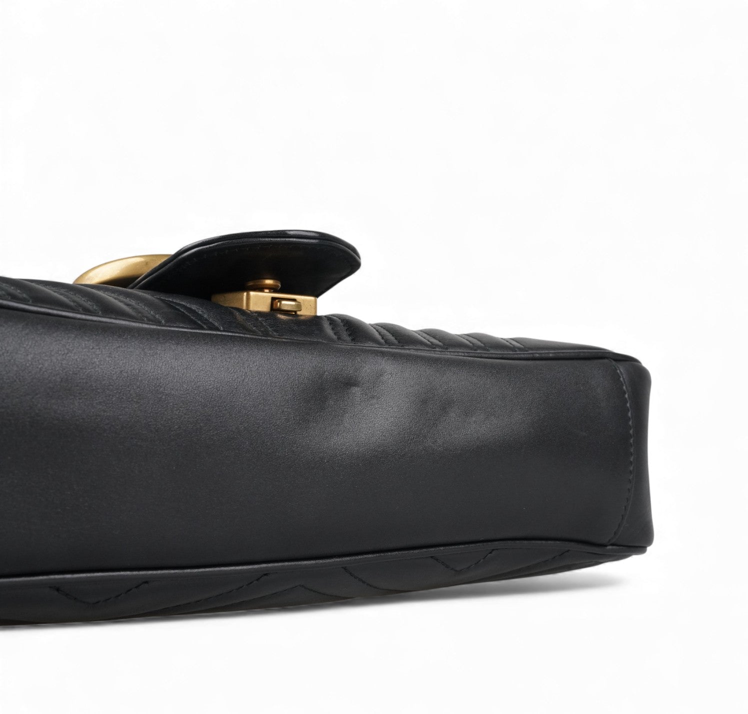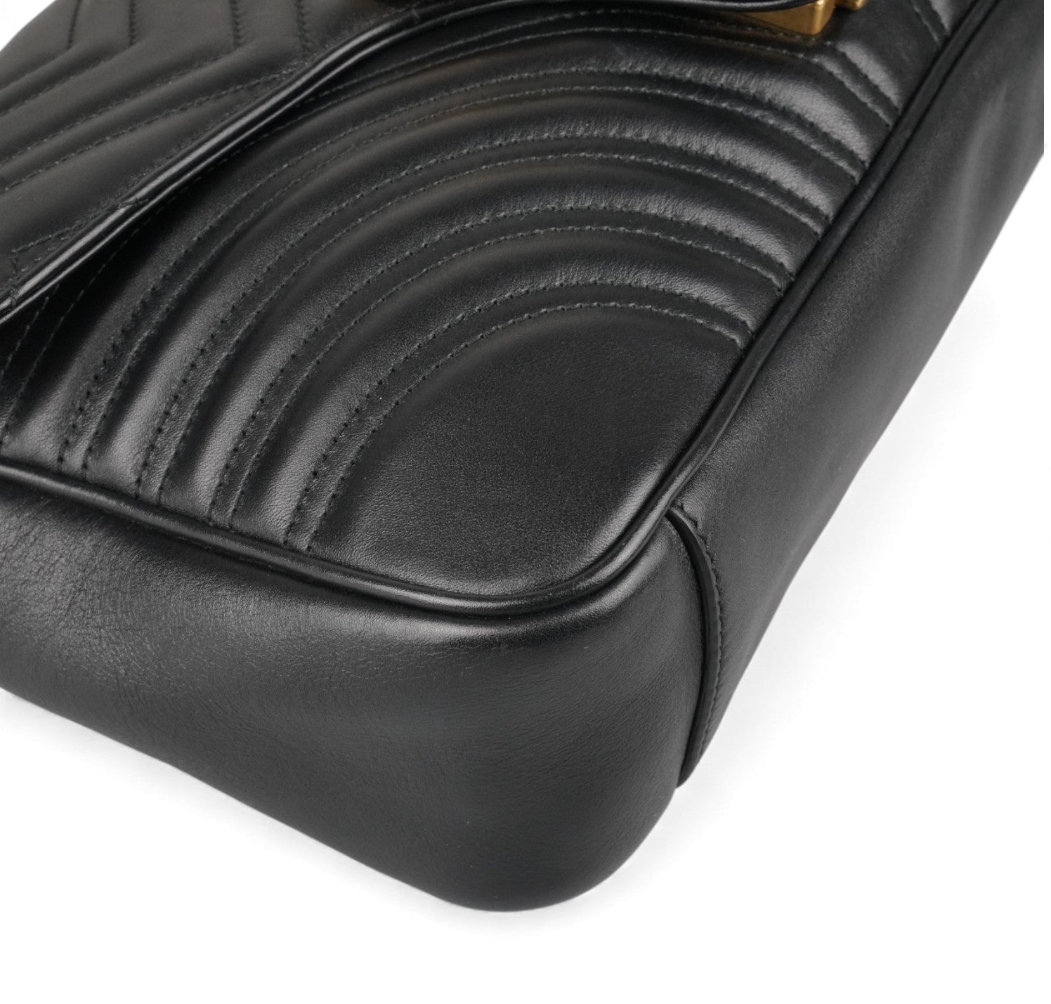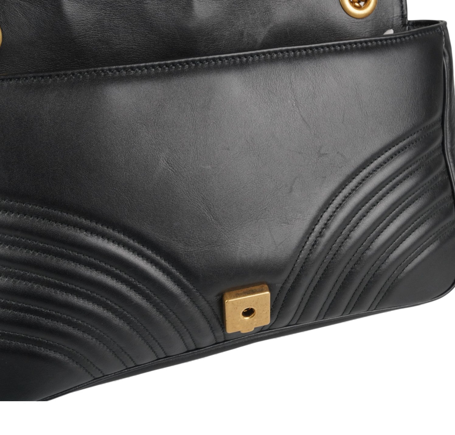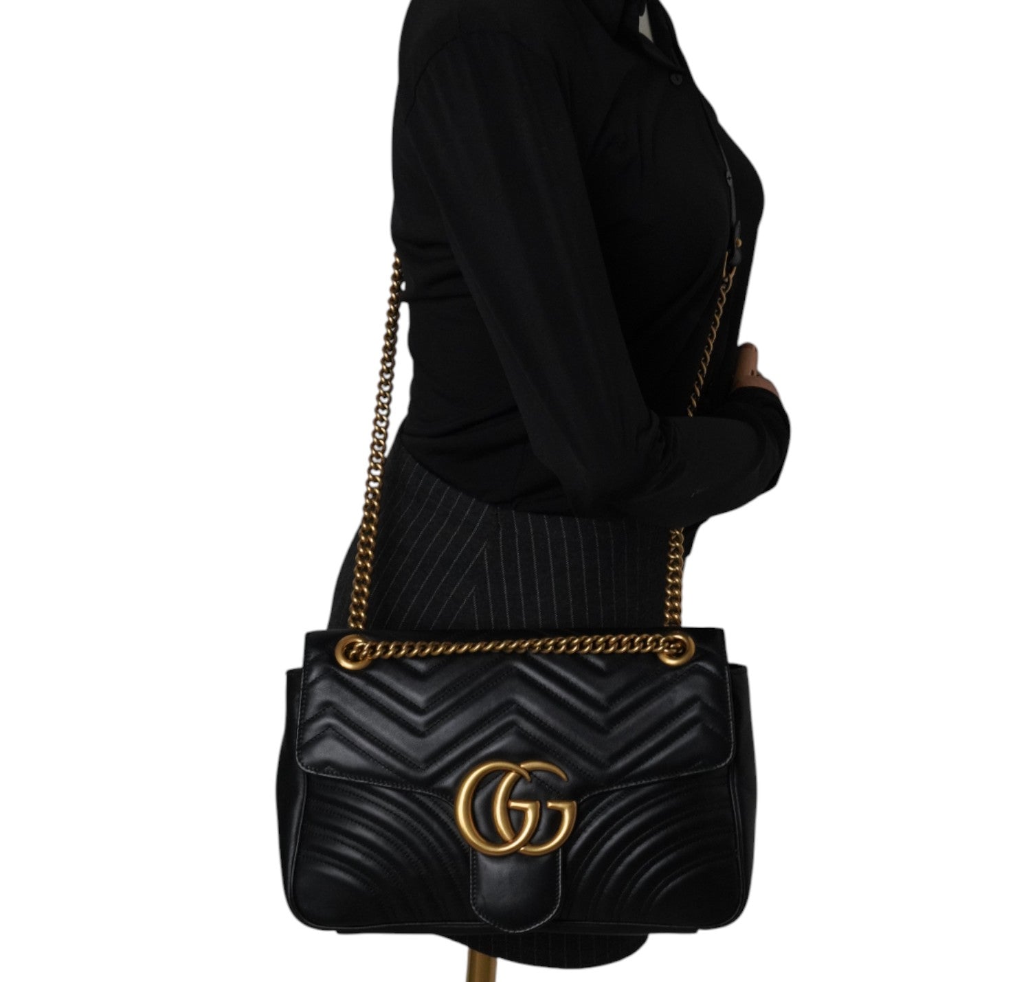 Gucci bag, Marmont model, made of leather Black matelassé embellished with a chevron motif. Antique Gold-colored metal hardware. Equipped with a sliding chain shoulder strap with leather shoulder pad. Front flap with spring closure and GG logo. Interior lined in suede-effect Microfiber Fabric. Wearable on the shoulder or as a crossbody bag. Minimal general signs of aging on the leather and hardware.