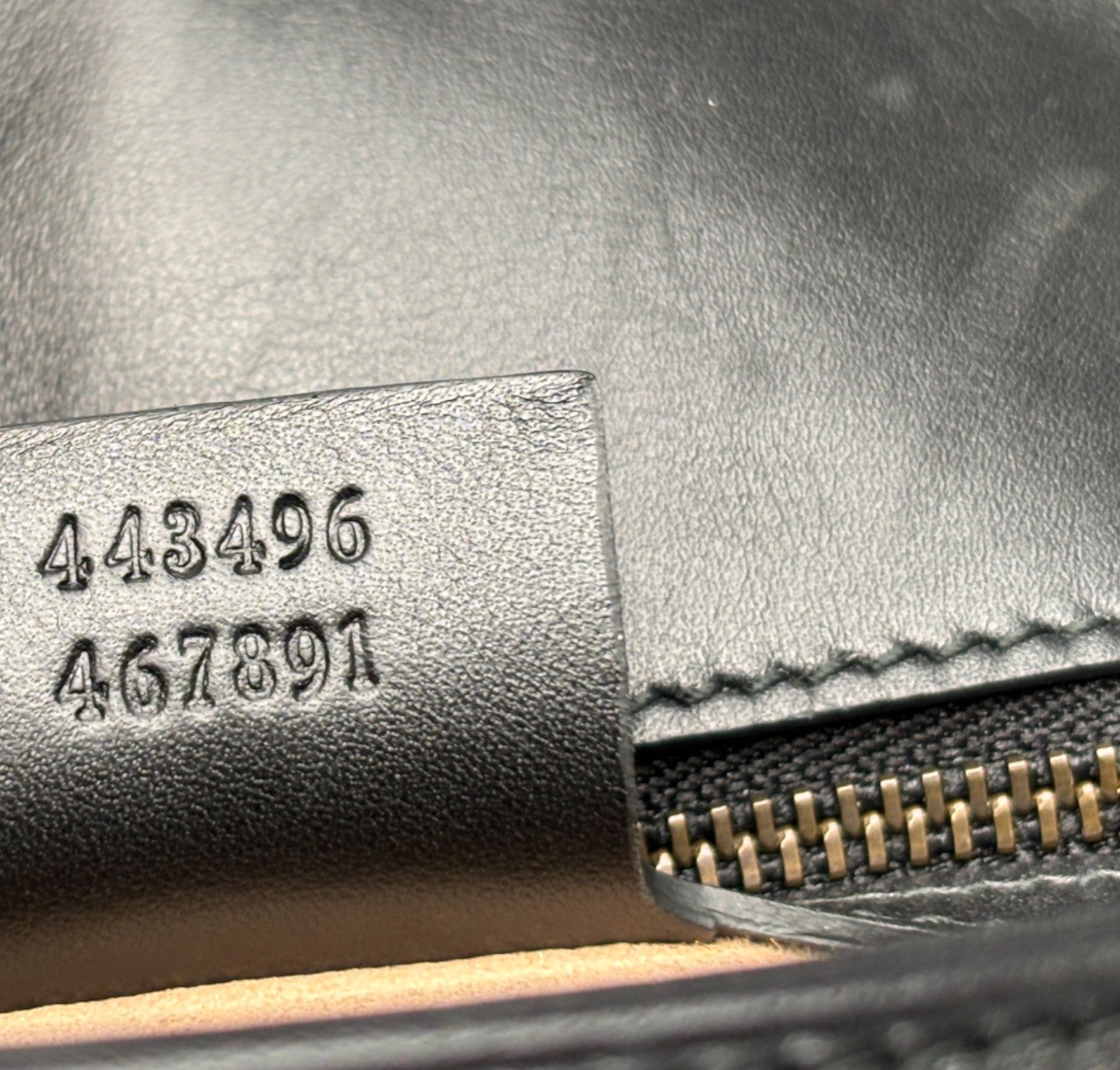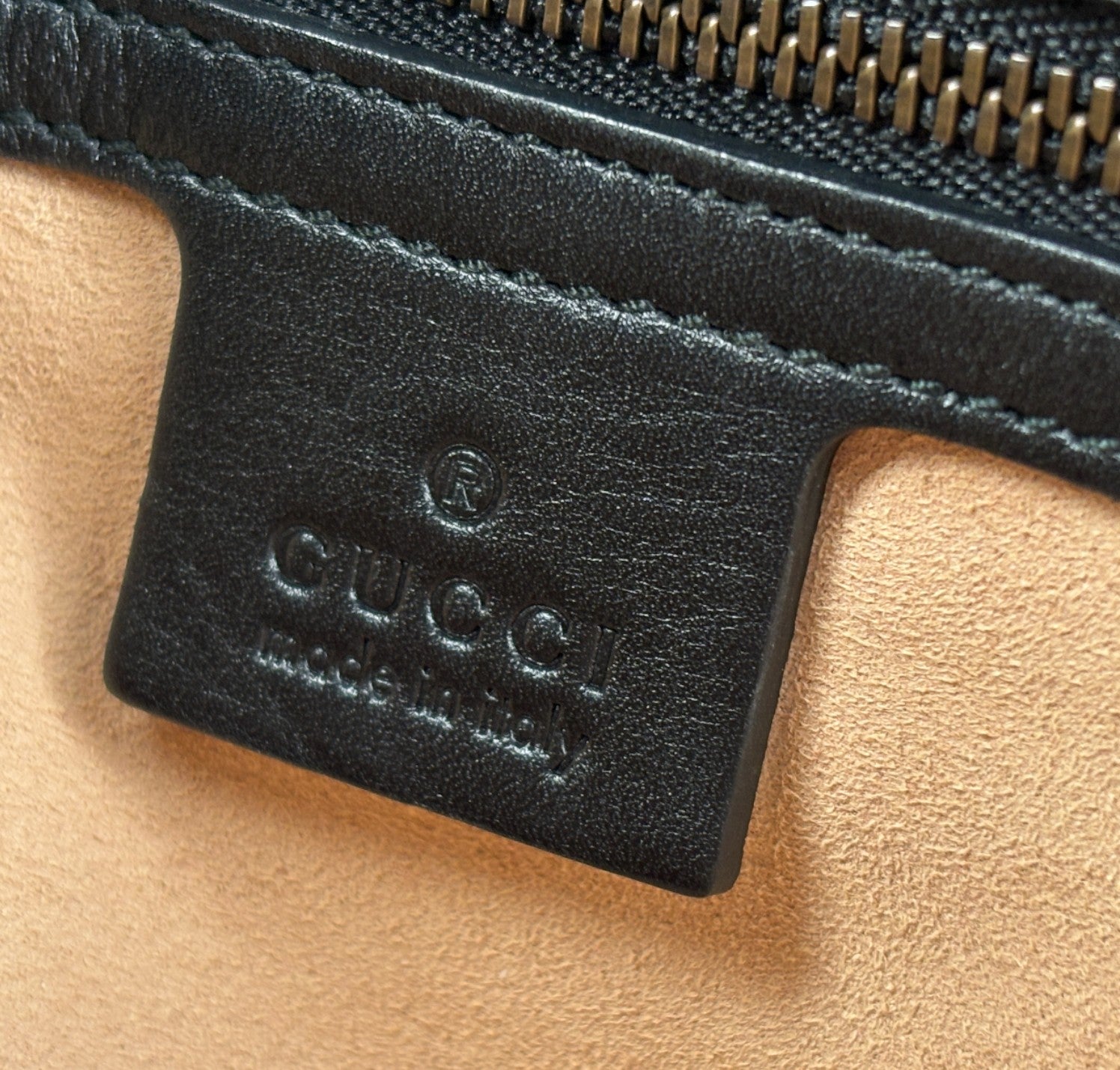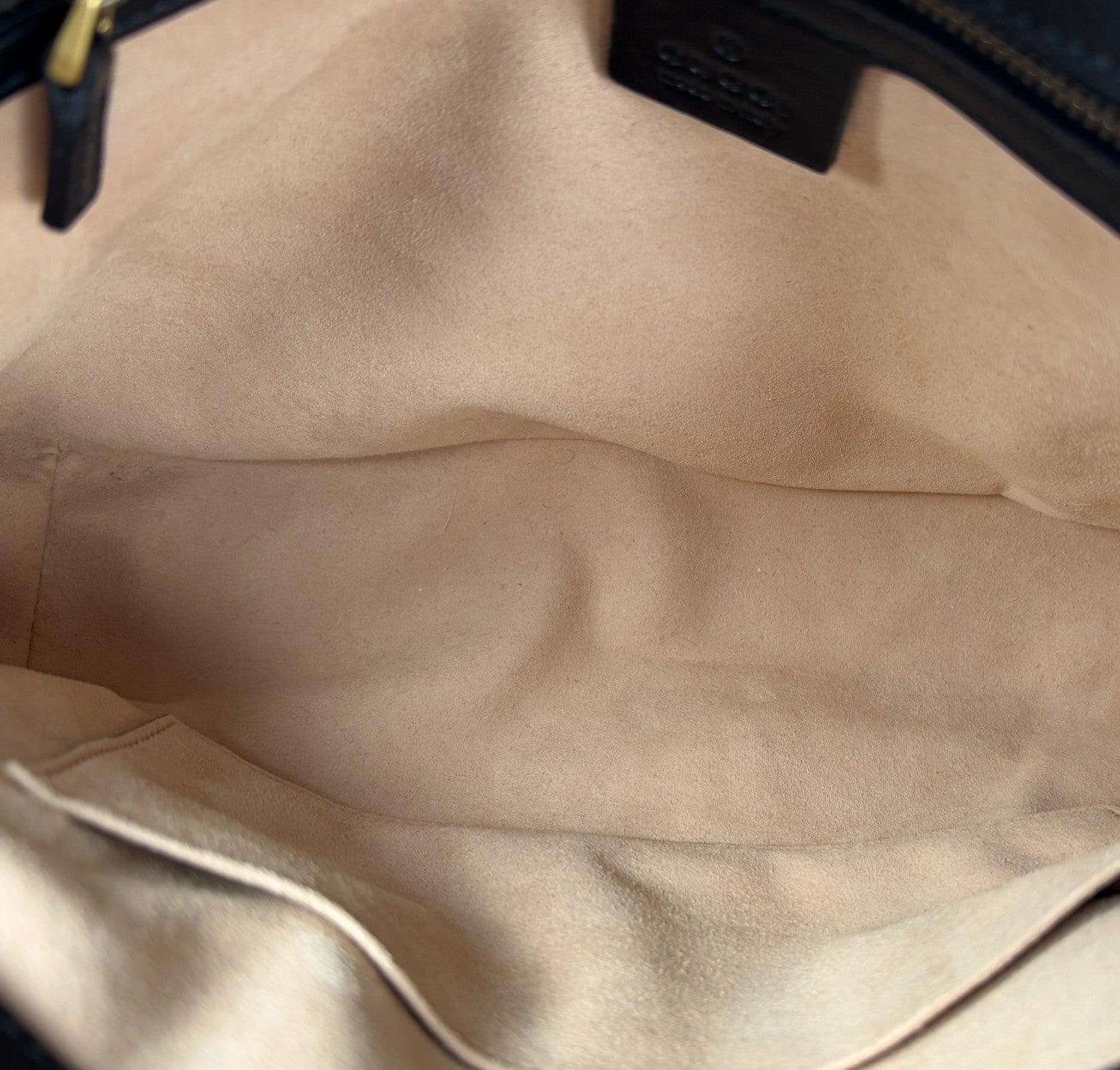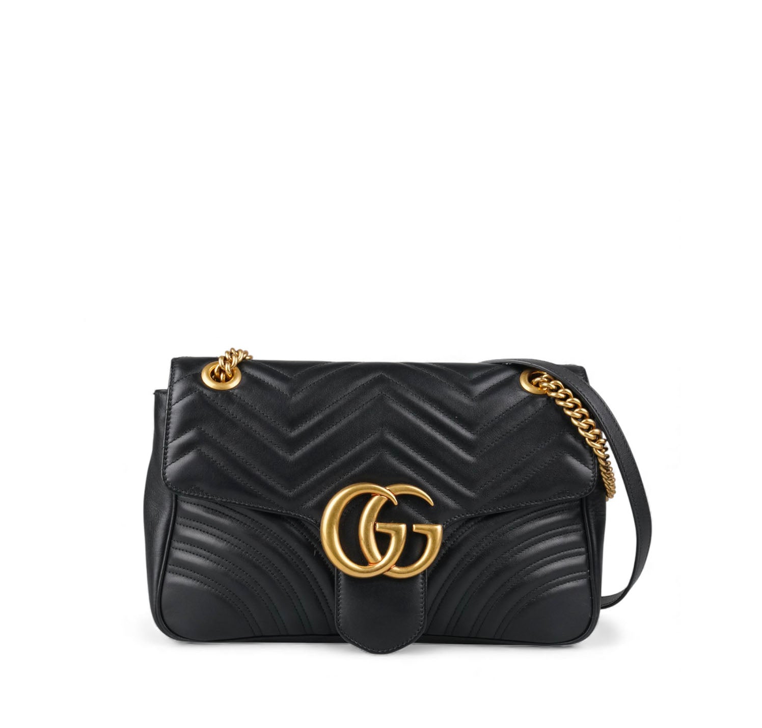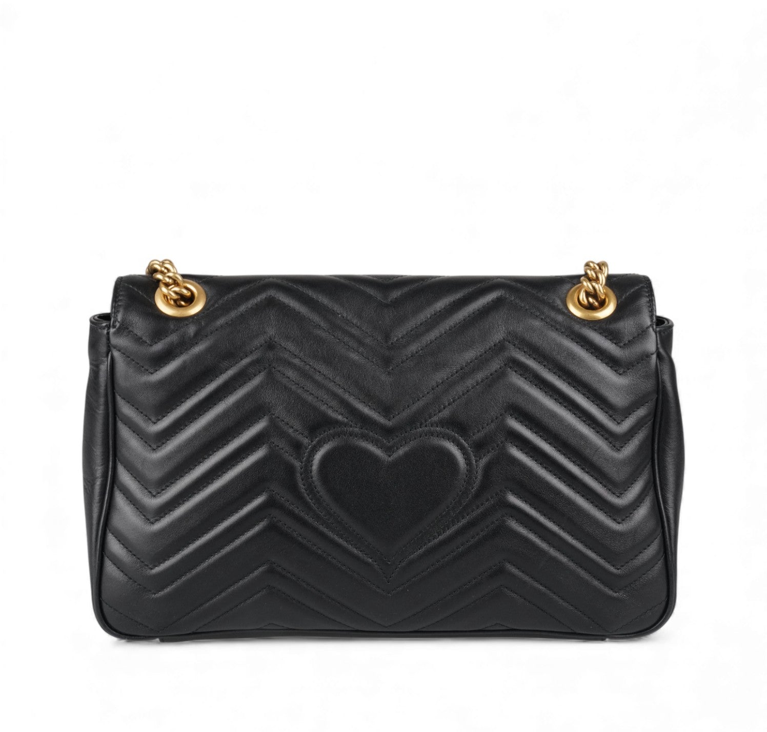 Gucci bag, Marmont model, made of leather Black matelassé embellished with a chevron motif. Antique Gold-colored metal hardware. Equipped with a sliding chain shoulder strap with leather shoulder pad. Front flap with spring closure and GG logo. Interior lined in suede-effect Microfiber Fabric. Wearable on the shoulder or as a crossbody bag. Minimal general signs of aging on the leather and hardware.