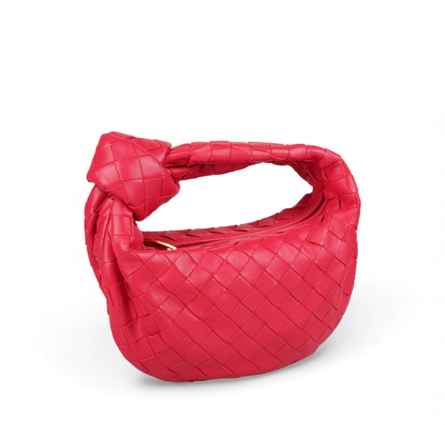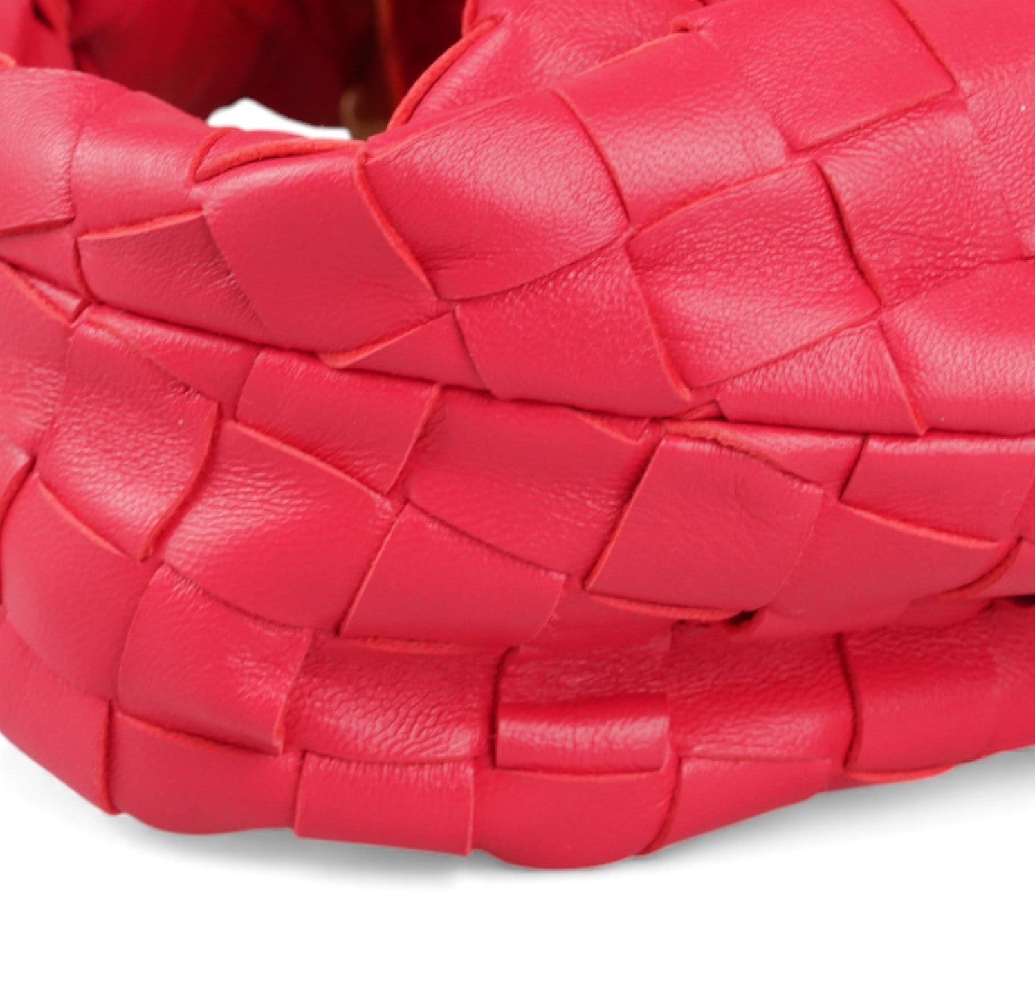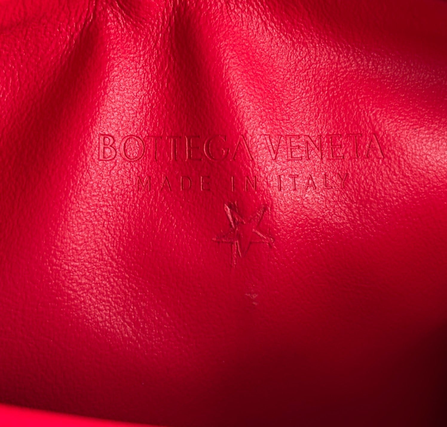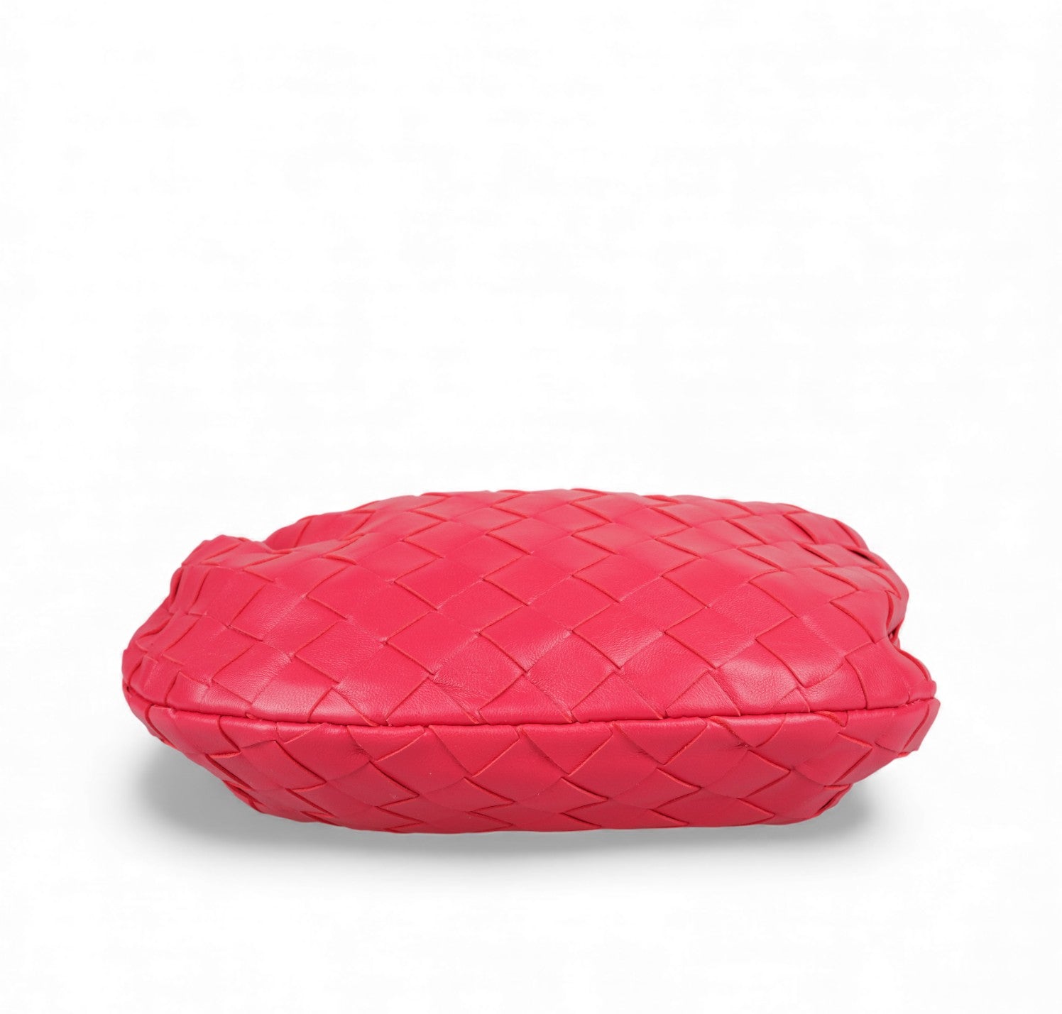 Borsa Bottega Veneta, modello Mini Jodie, in Pelle Nappa intrecciata Lampone. Parti metalliche dorate. Dotata di manico singolo superiore con nodo laterale per il trasporto a mano o avambraccio. Chiusura superiore con zip. Interno foderato in Pelle, unico scomparto. Struttura morbida che la rende perfetta per un utilizzo quotidiano. Pari al nuovo. Potrebbe presentare micro segni di stoccaggio.