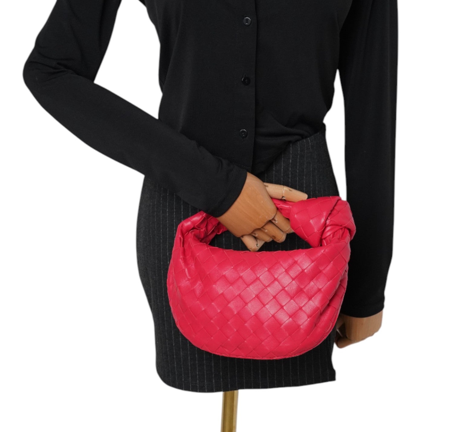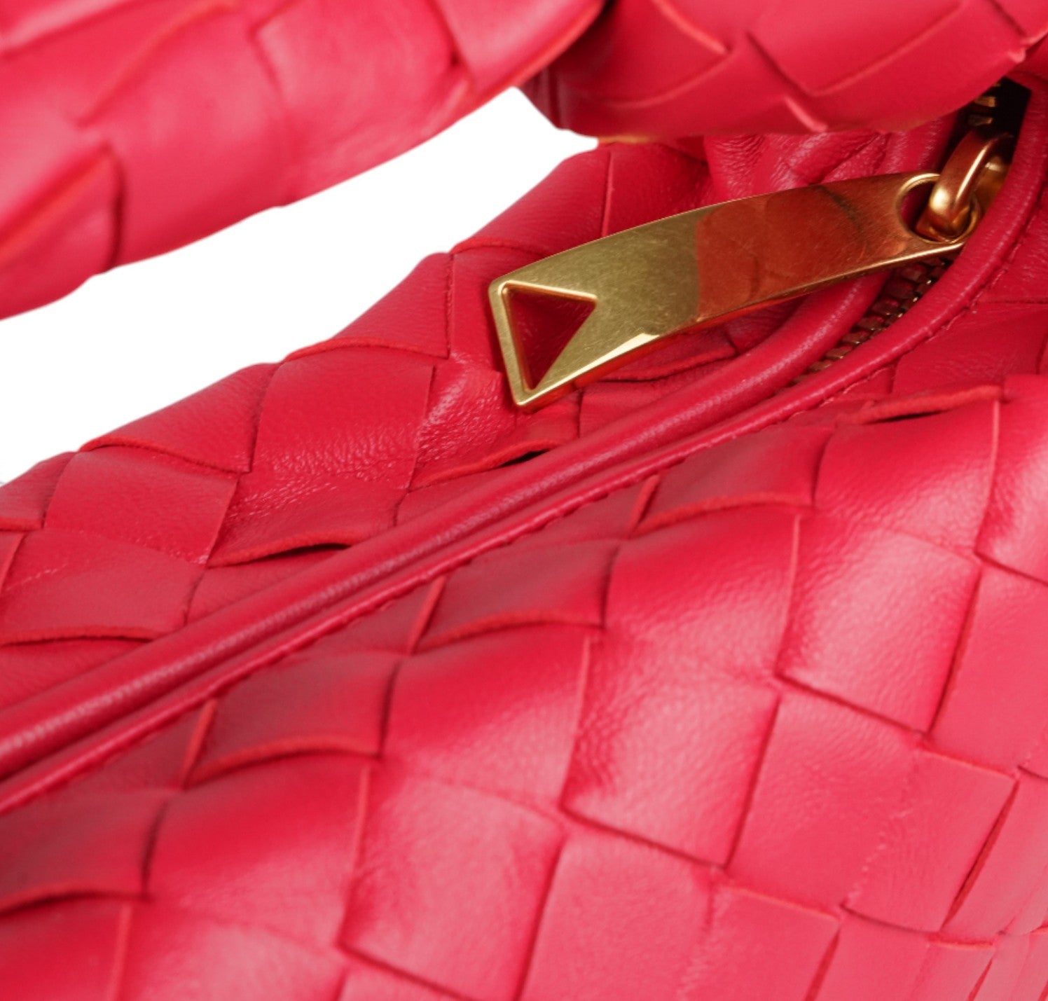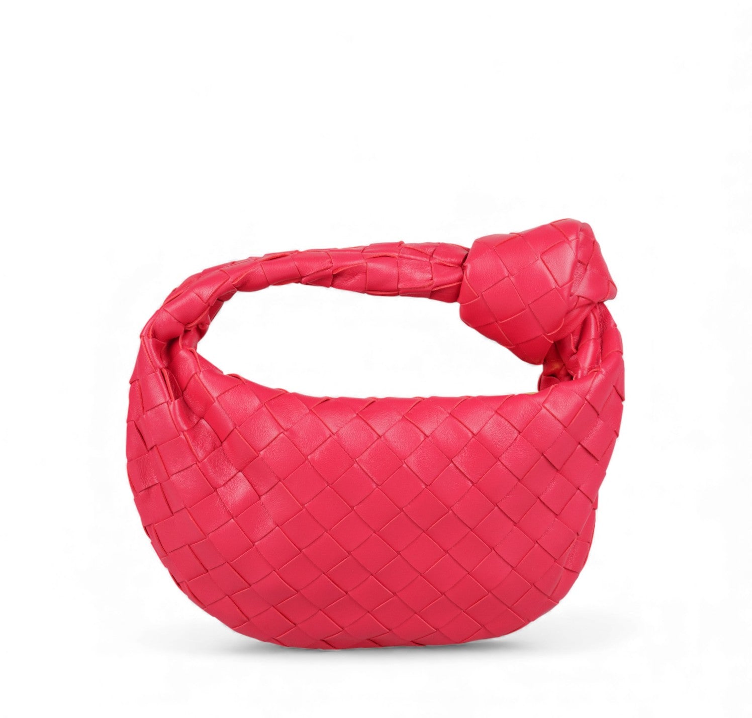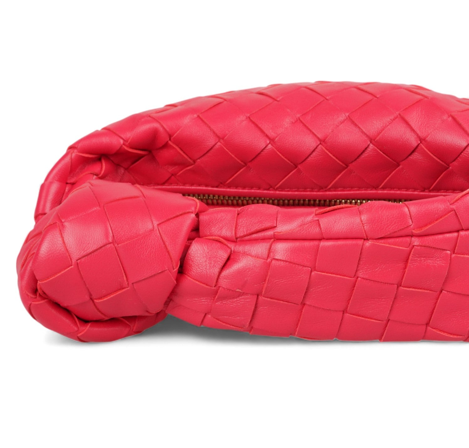 Borsa Bottega Veneta, modello Mini Jodie, in Pelle Nappa intrecciata Lampone. Parti metalliche dorate. Dotata di manico singolo superiore con nodo laterale per il trasporto a mano o avambraccio. Chiusura superiore con zip. Interno foderato in Pelle, unico scomparto. Struttura morbida che la rende perfetta per un utilizzo quotidiano. Pari al nuovo. Potrebbe presentare micro segni di stoccaggio.