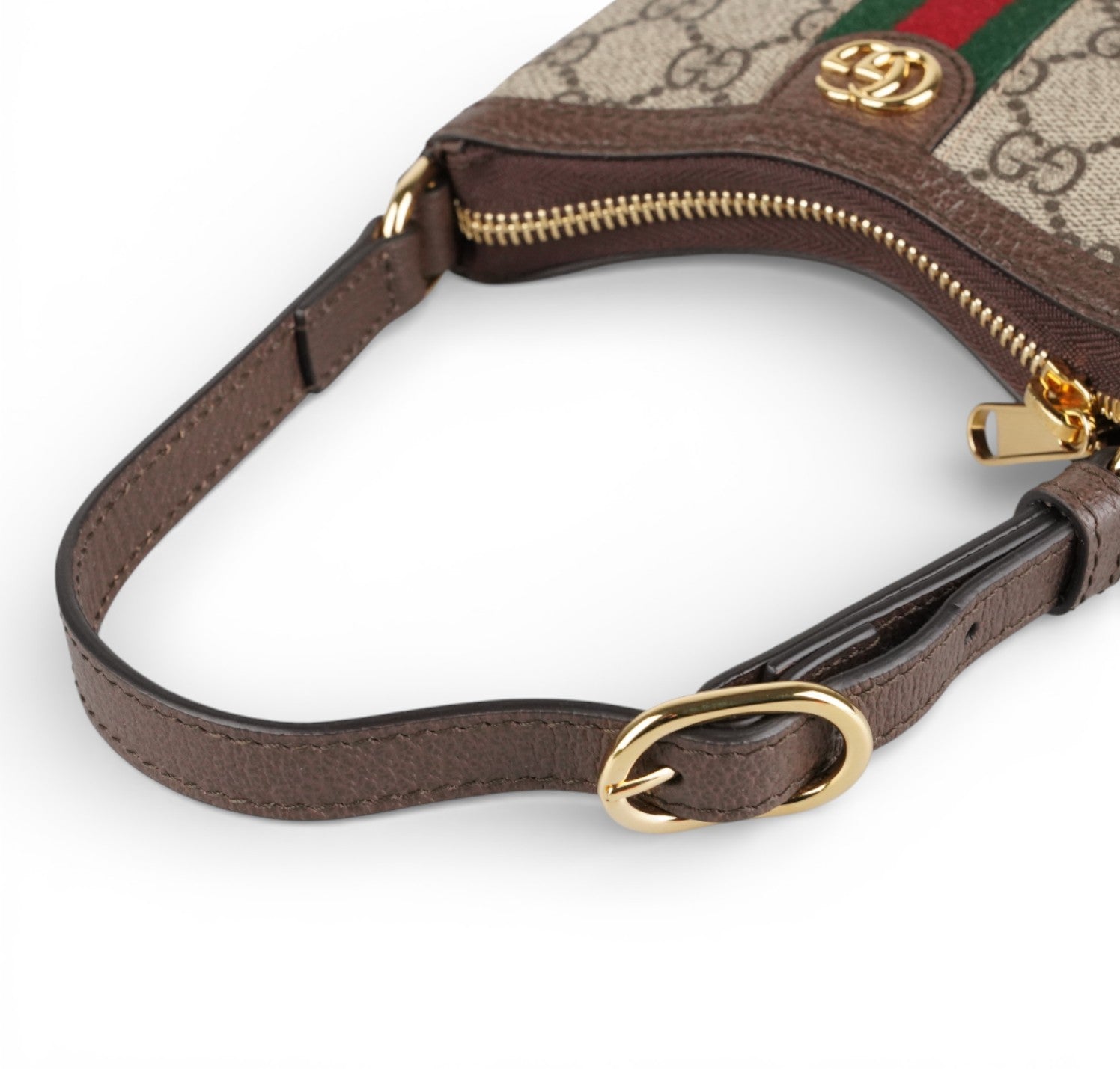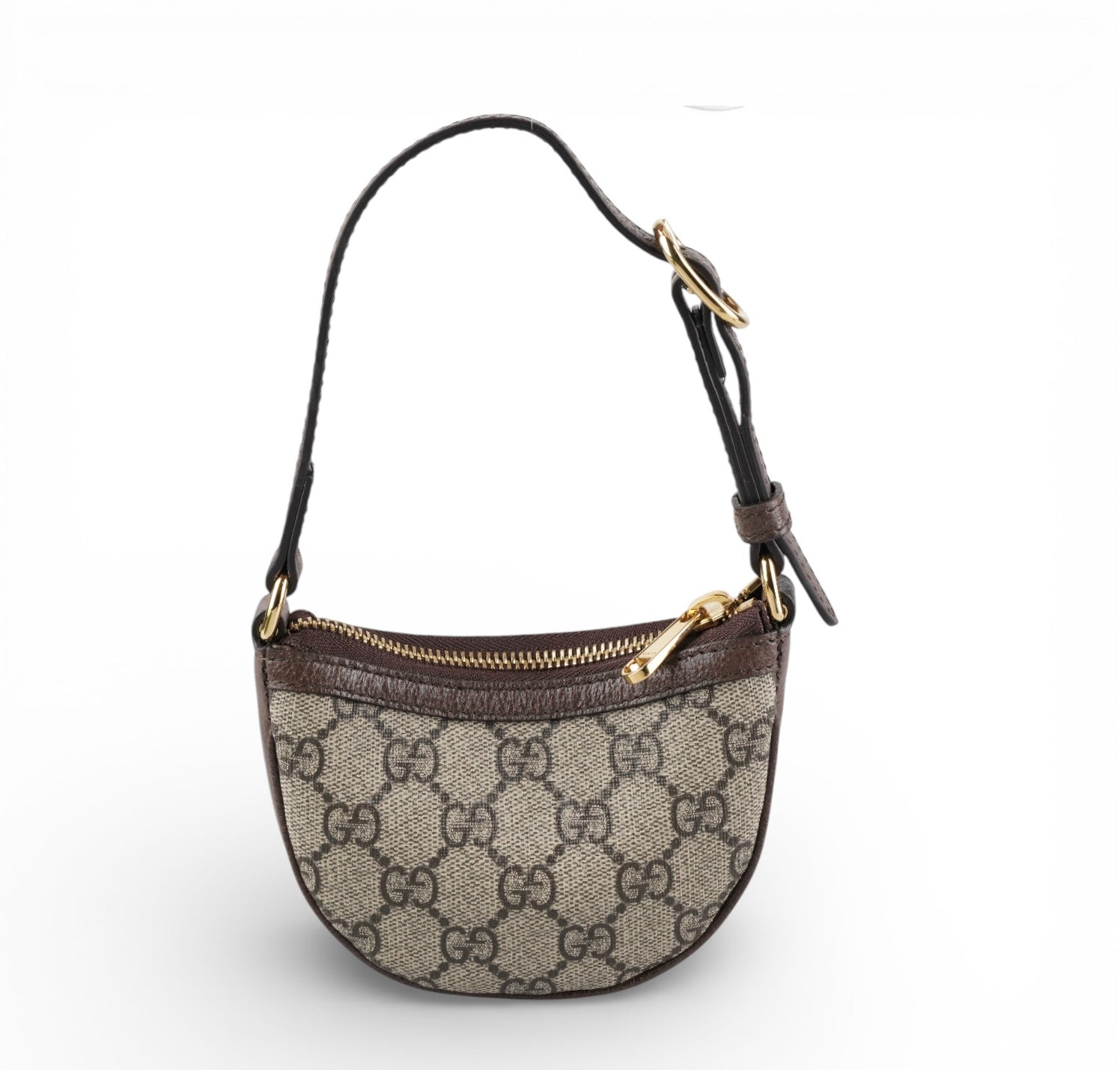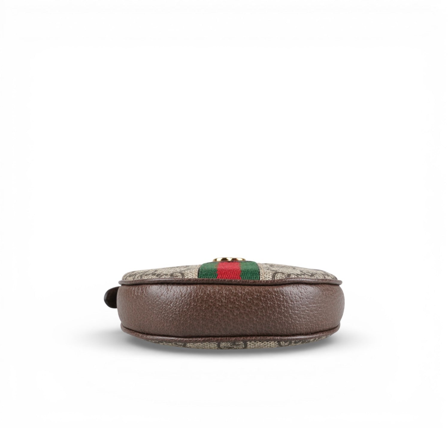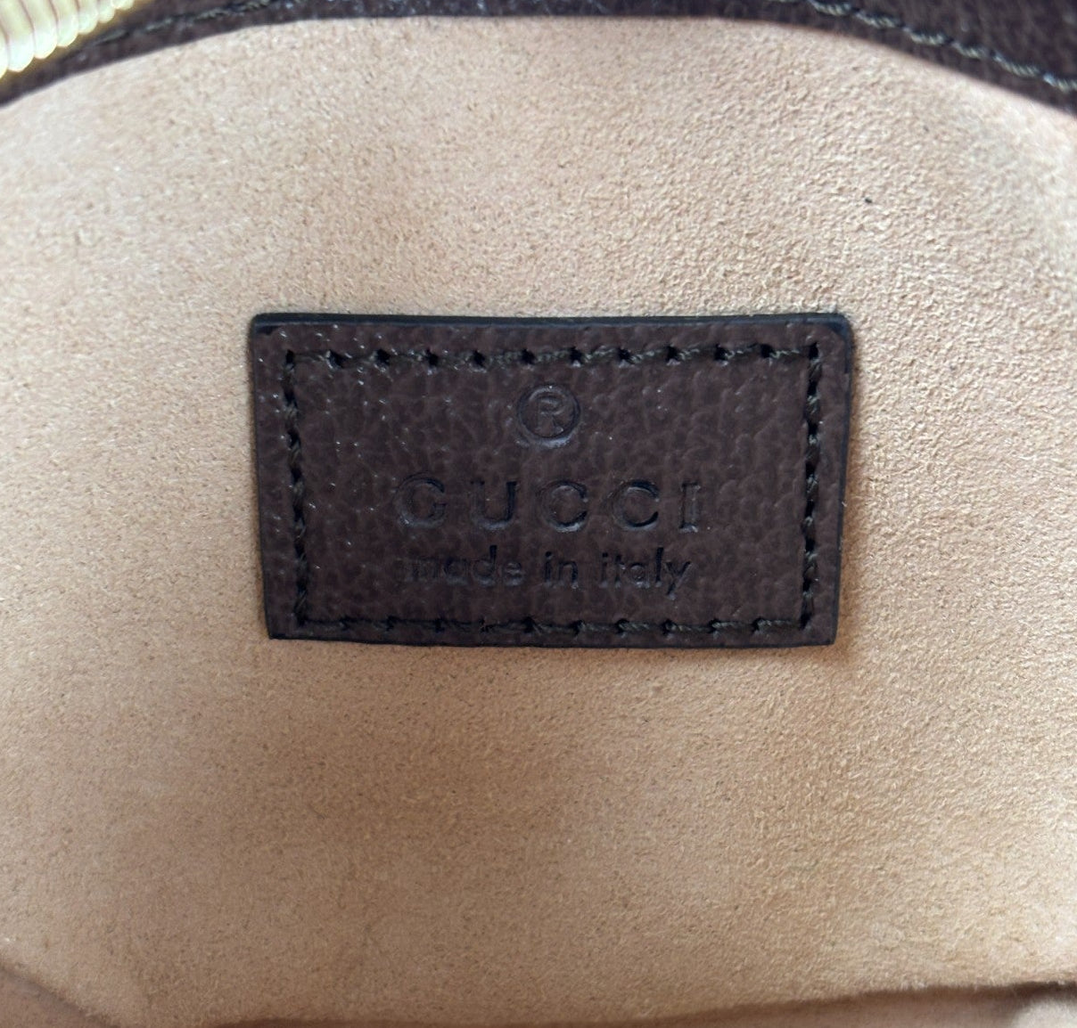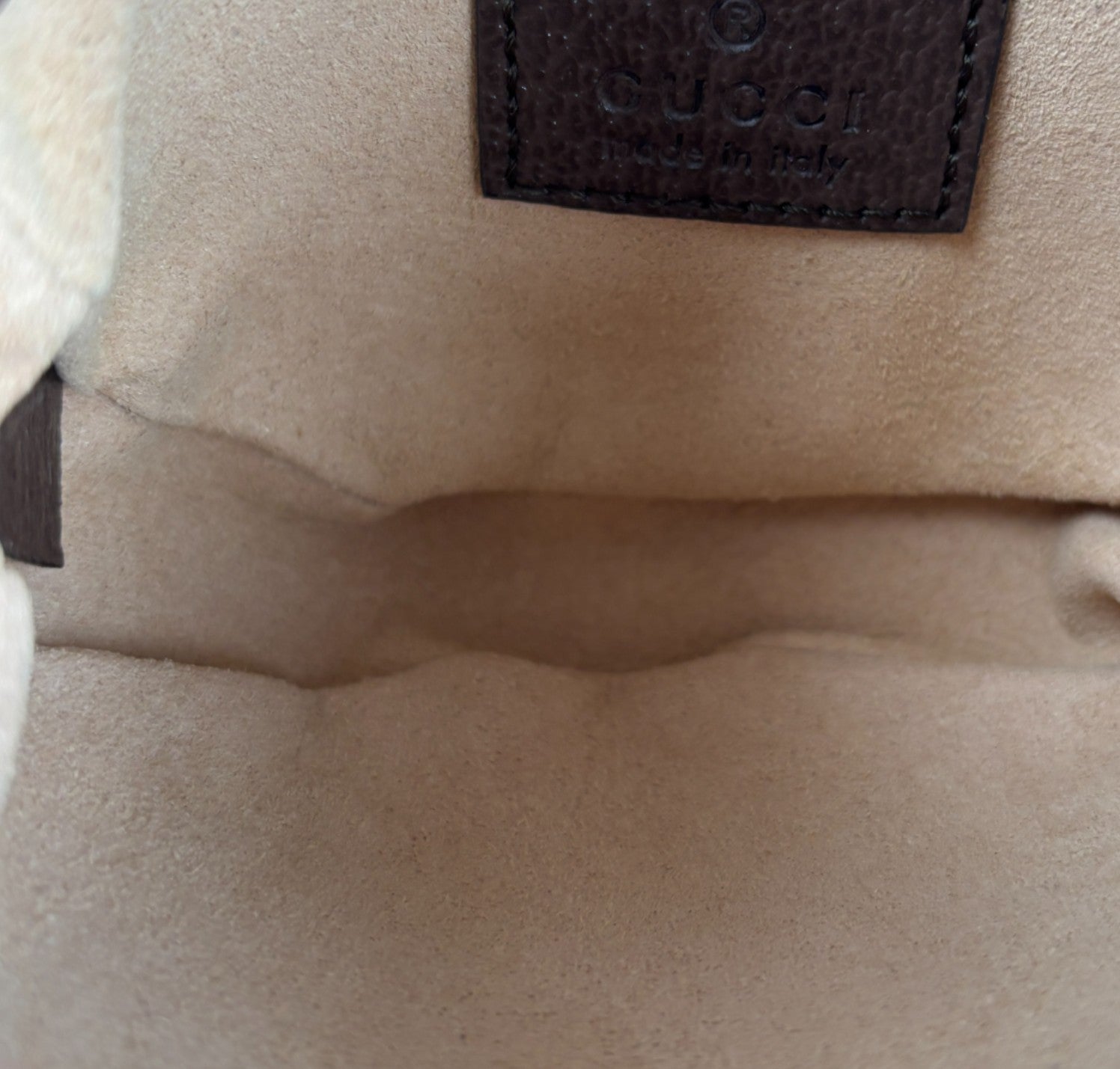 Borsa Gucci, modello Ophidia Micro, realizzata in tela GG Supreme beige ed ebano, arricchita dall’iconica fascia Web verde e rossa e dal logo GG in metallo color oro sul davanti. Profili in pelle marrone e finiture in metallo dorato. Chiusura superiore con zip, manico corto regolabile per portabilità a mano. Interno foderato in microfibra effetto suede. Pari al nuovo, condizioni eccellenti.